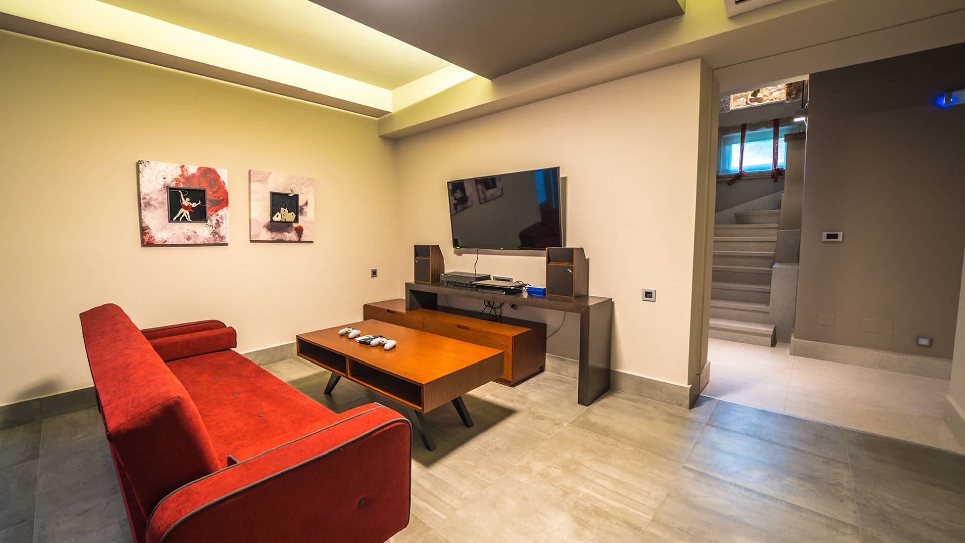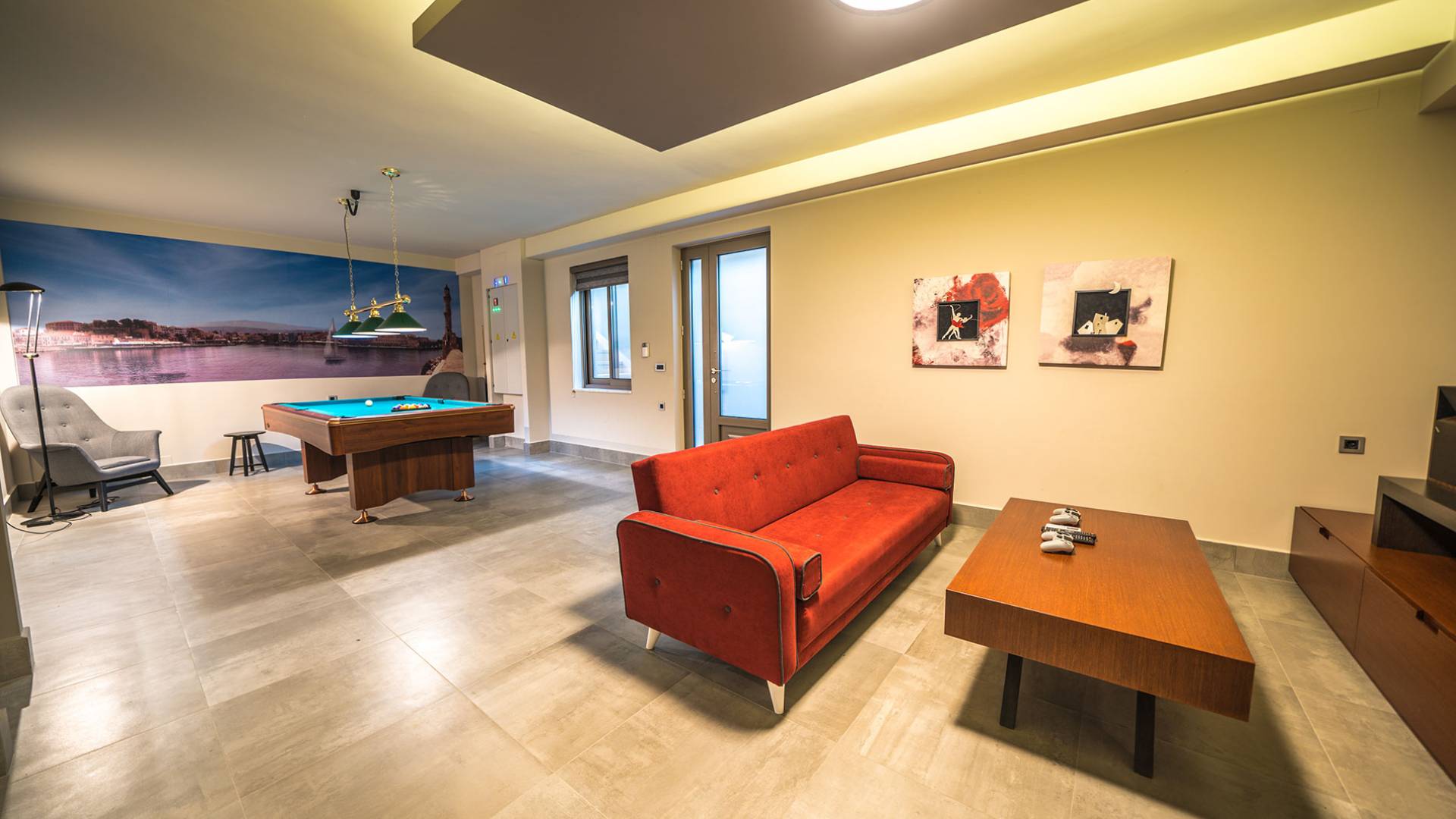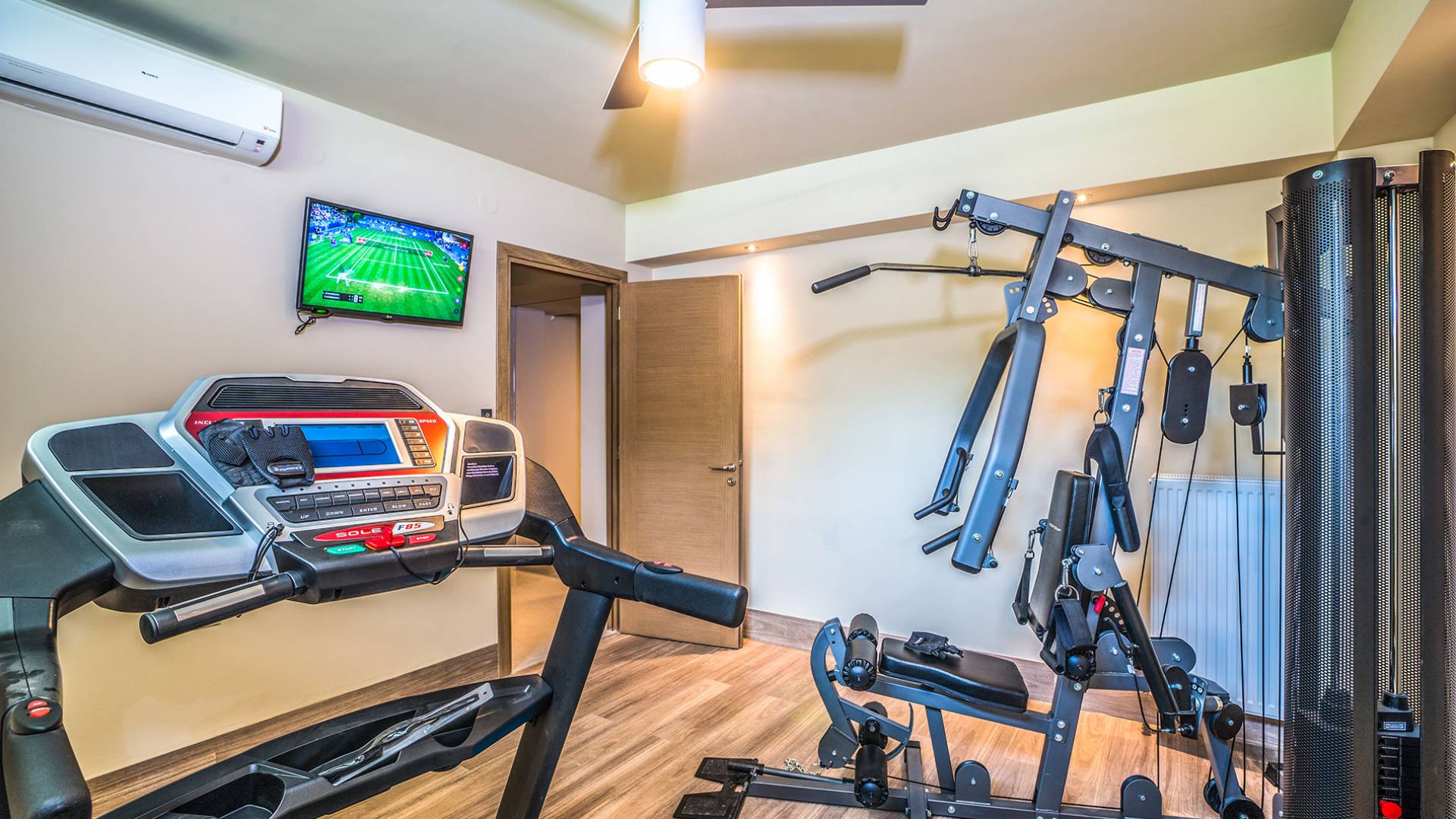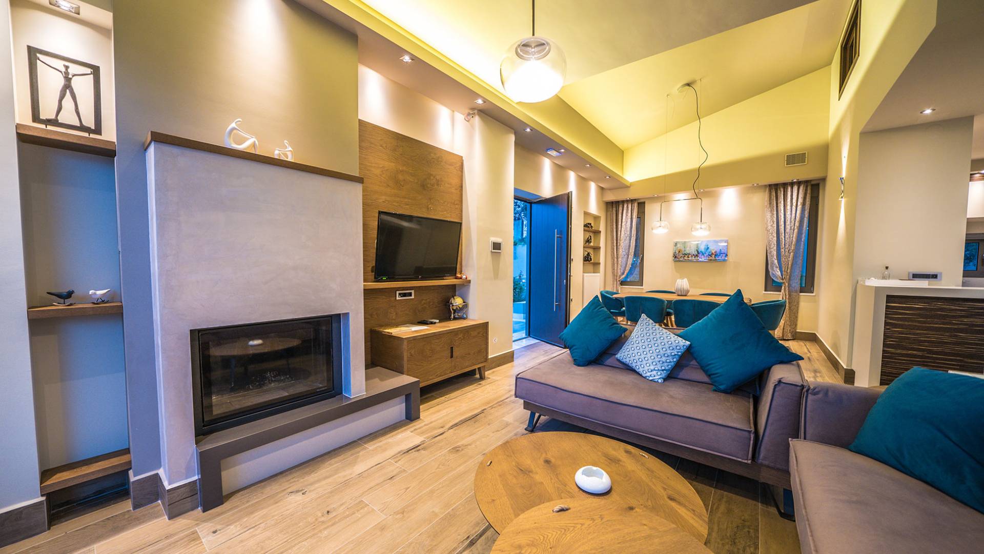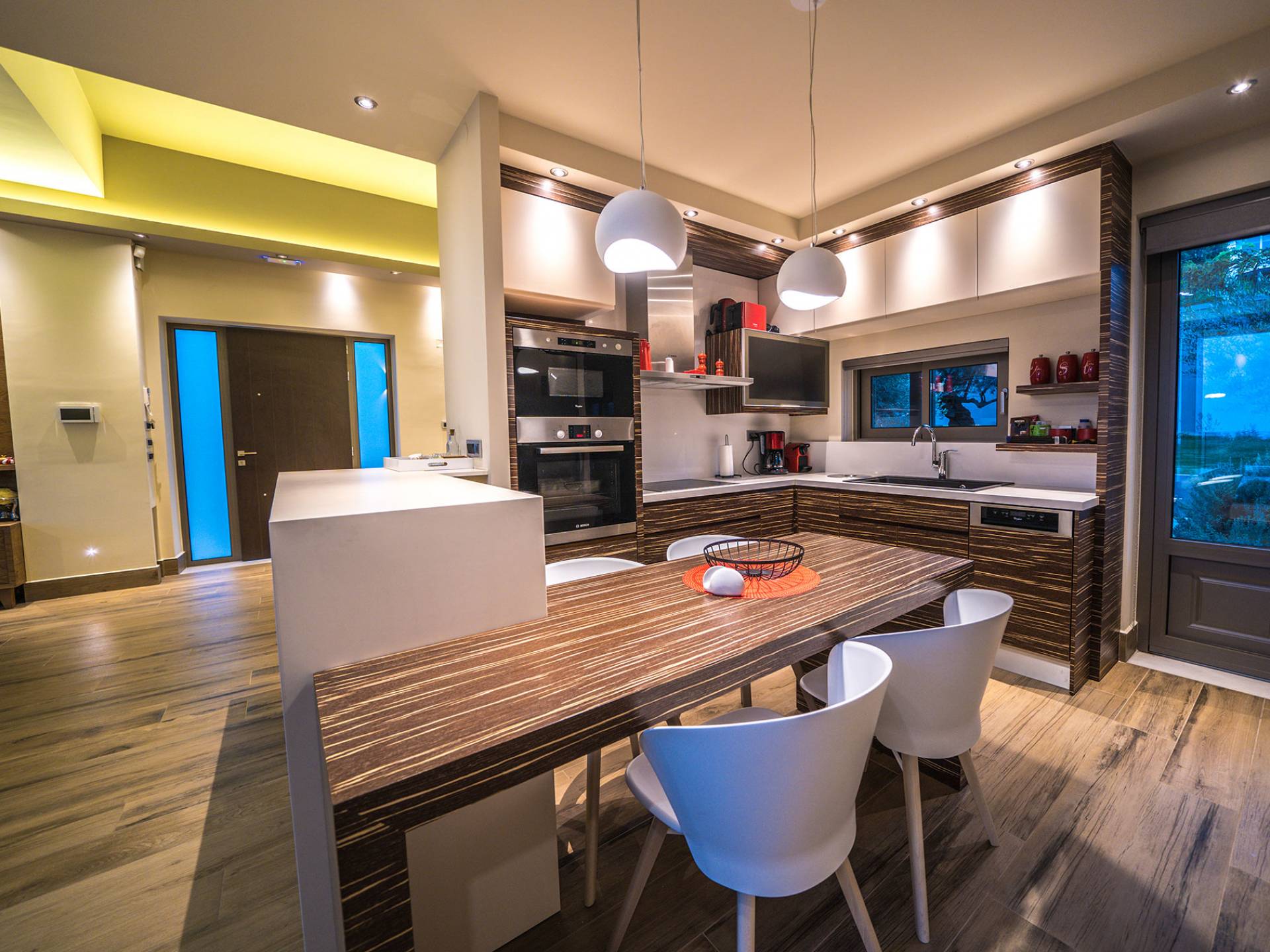 Ariadne Villa Chania se compose de 3 niveaux et peut accueillir jusqu'à 8 adultes + 1 enfant. Au rez-de-chaussée, il y a le salon principal avec de grands et confortables canapés, un coin repas et une cuisine entièrement équipée. Il y a aussi 2 chambres avec lits doubles qui partagent une salle de bain avec douche. Au premier étage, il y a une autre chambre avec un grand lit double et une salle de bain avec douche. À l'étage inférieur, il y a un autre salon, une chambre avec une salle de bain en suite et une salle de jeux avec une salle de gym et une table de billard.