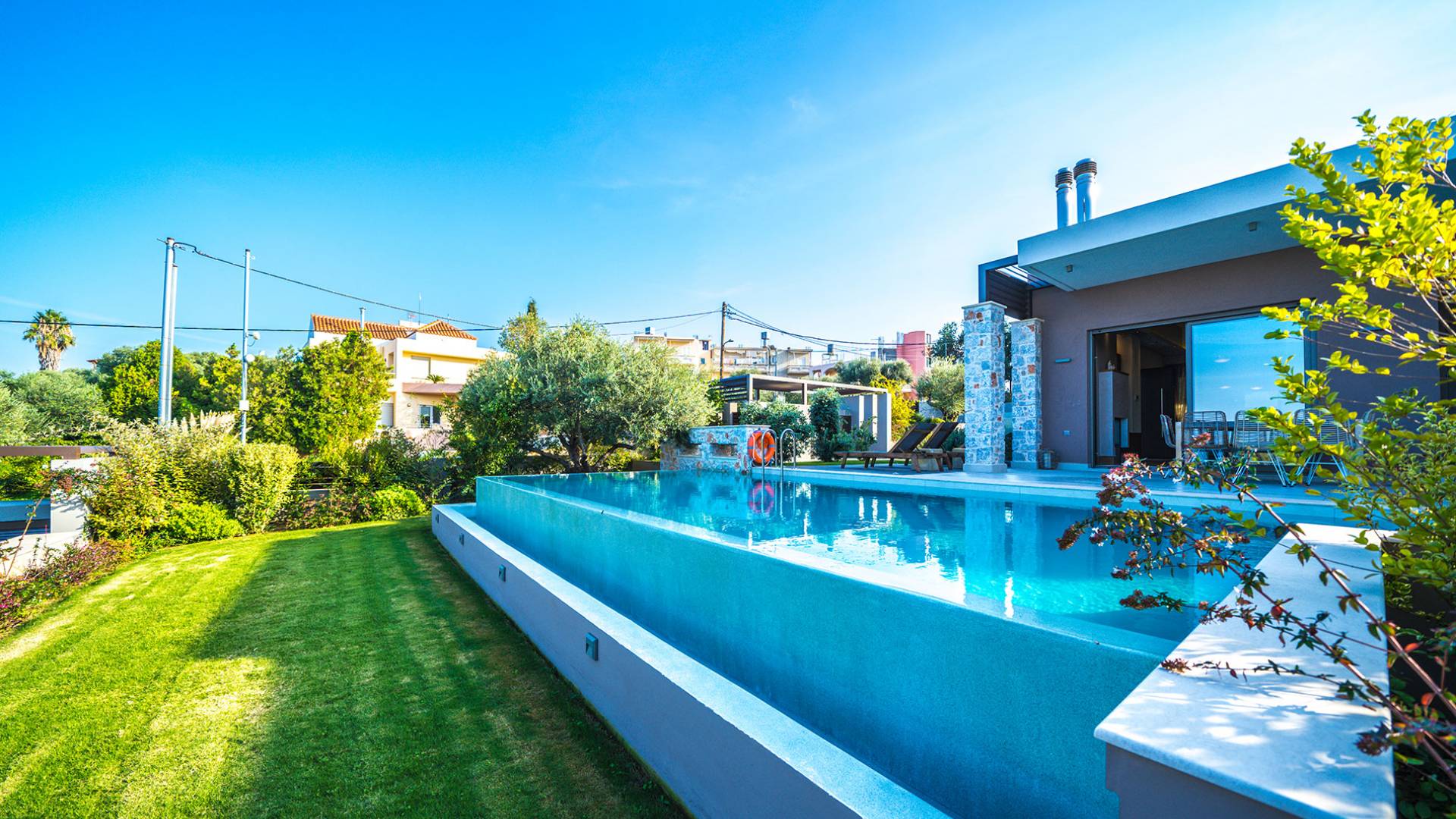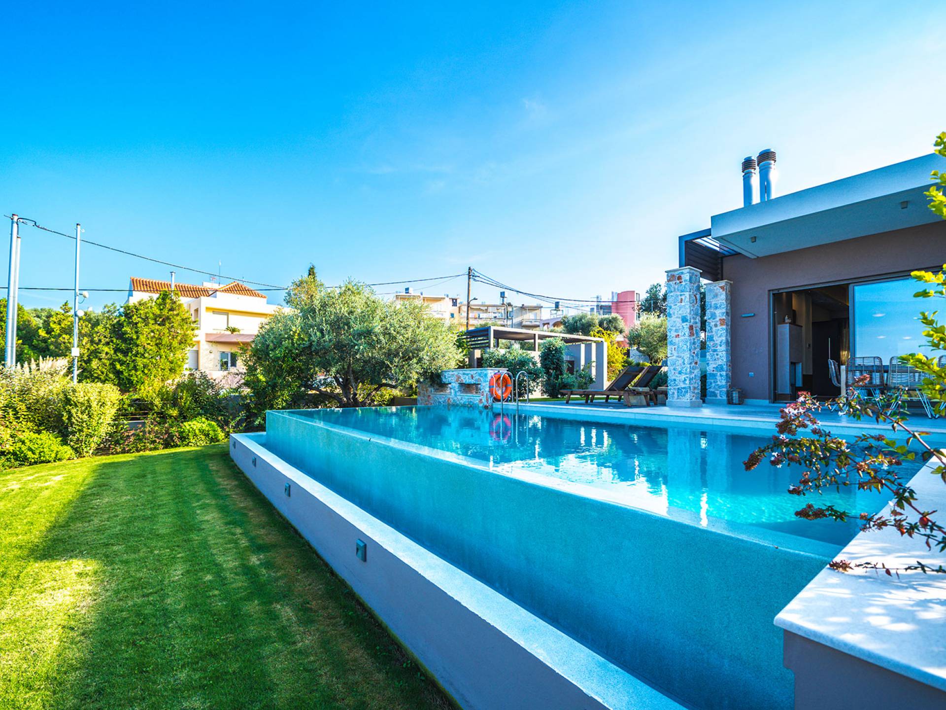 En sortant, vous profiterez du grand jardin et de la piscine à débordement idéal pour se détendre sous le soleil crétois. Il y a aussi un barbecue et une table à manger ainsi qu'un coin salon où vous pouvez écouter de la musique ou même lire un livre accompagné des divers sons naturels de la campagne crétoise. Le soir, vous pouvez soit profiter du magnifique coucher de soleil romantique qui peint avec les plus belles couleurs le ciel méditerranéen bleu clair ou vous pouvez conduire à une distance d'environ 3-4 minutes jusqu'aux restaurants les plus proches et goûter la cuisine crétoise. À seulement 2 km se trouve la magnifique plage de sable d'Agioi Apostoloi, adaptée aux enfants. il y a aussi un parc idéal pour courir.
