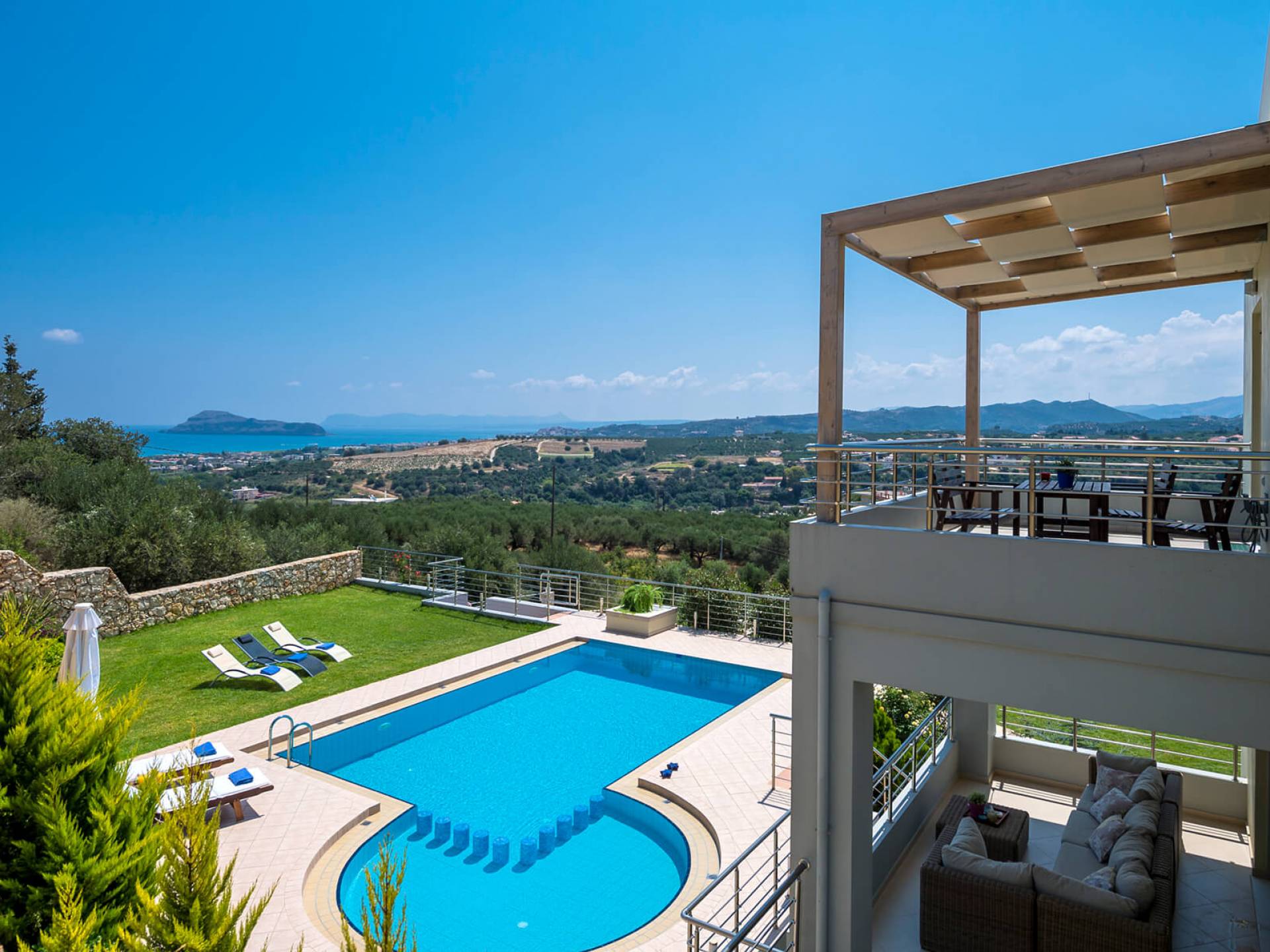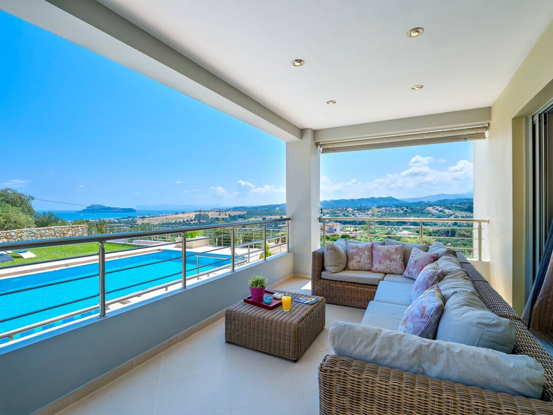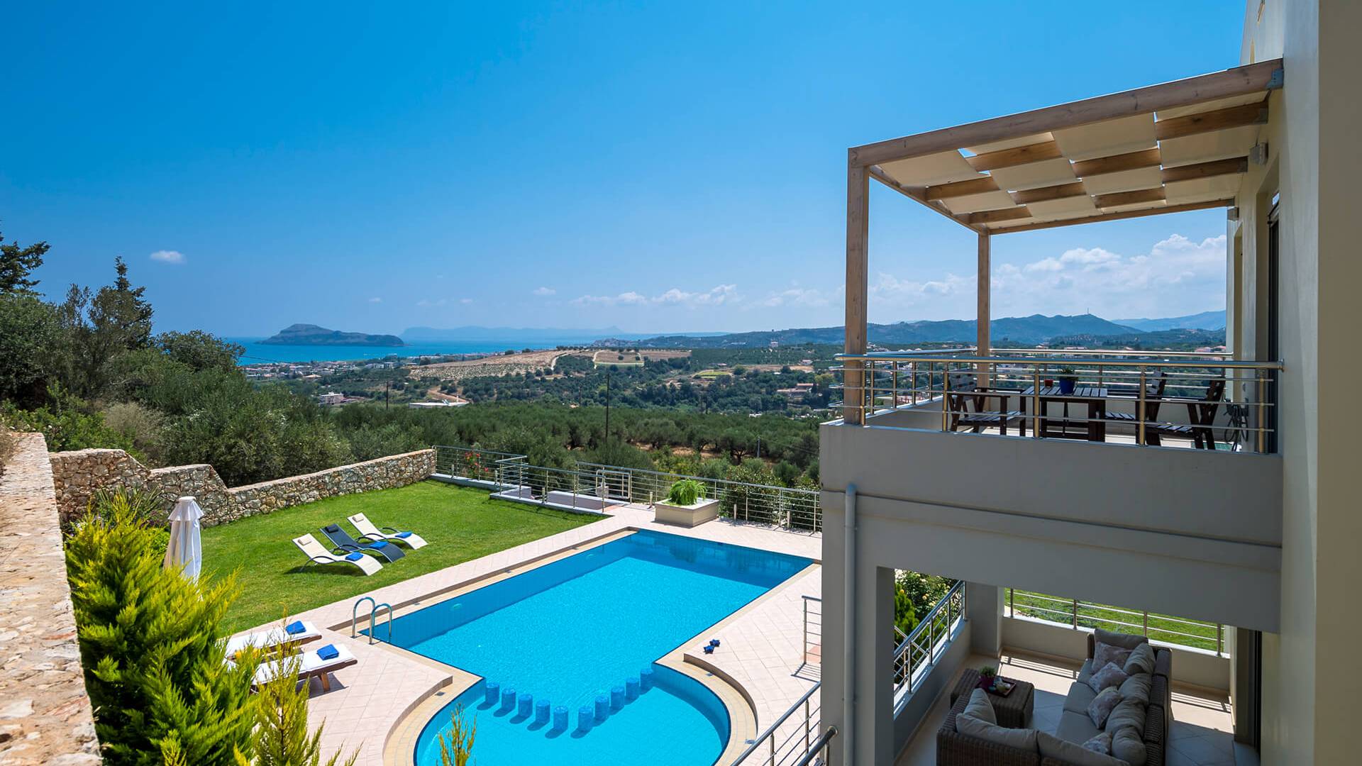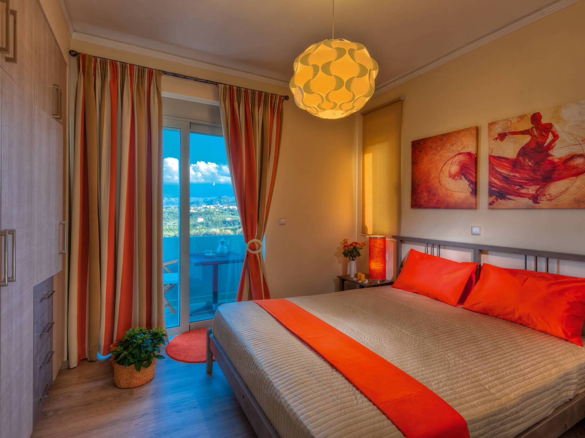 Au deuxième étage, il y a trois chambres climatisées avec salles de bains privatives, tissus et meubles tous décorés dans des tons colorés, doux et romantiques, des peintures modernes. Une chambre principale avec un lit king-size et une chambre avec un lit double partagent un grand balcon ombragé commun avec des meubles, offrant une vue panoramique incroyable sur la mer de Crète et les montagnes de Lefka Ori. La troisième chambre est décorée de couleurs vives orange et beige et dispose également d'un lit double et d'une salle de bains privative. Il bénéficie de sa propre véranda privée avec une vue unique. Toutes les chambres disposent de grands balcons donnant sur la mer et les jardins paradisiaques qui sont illuminés la nuit créant une atmosphère spéciale et romantique.