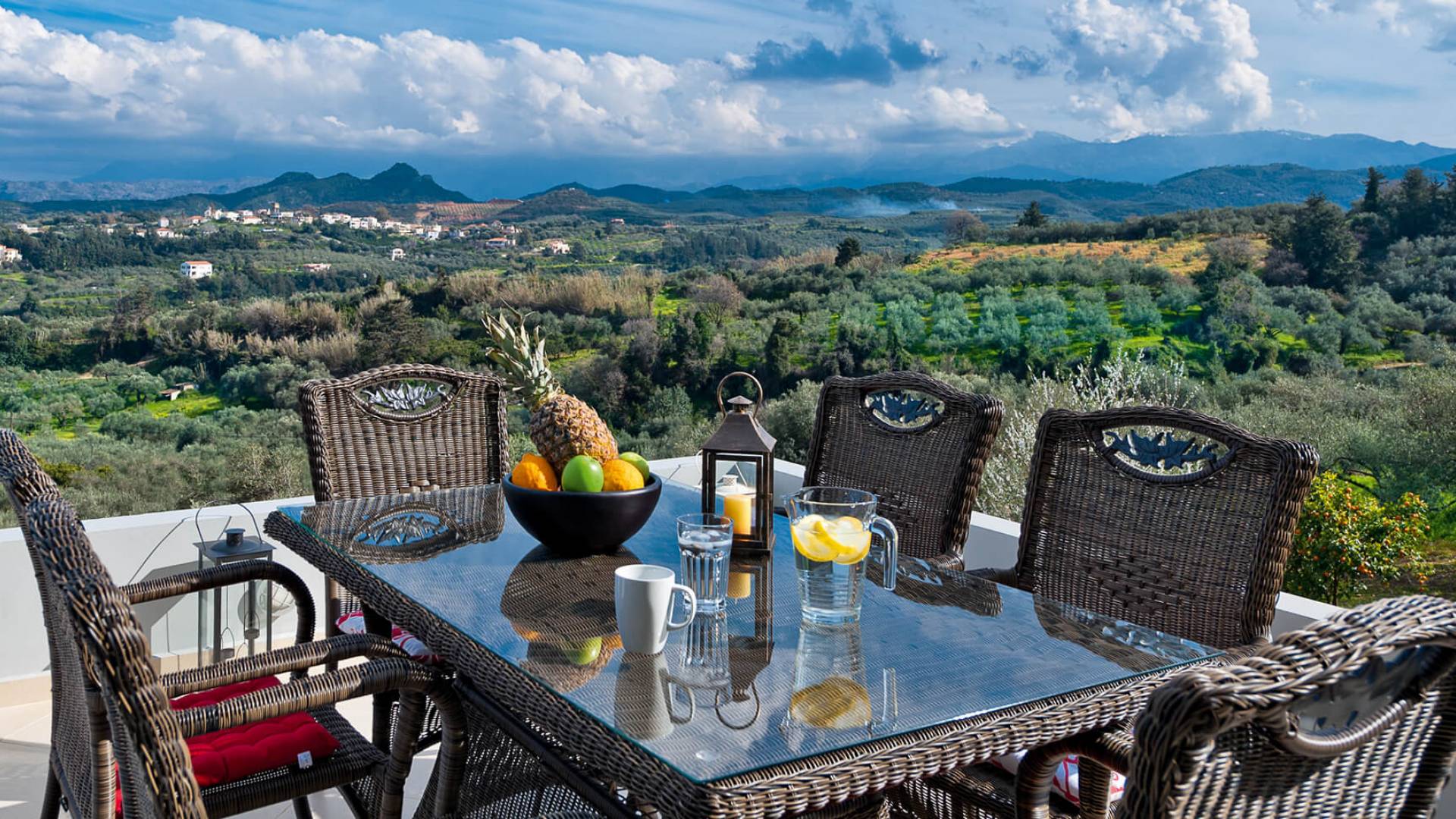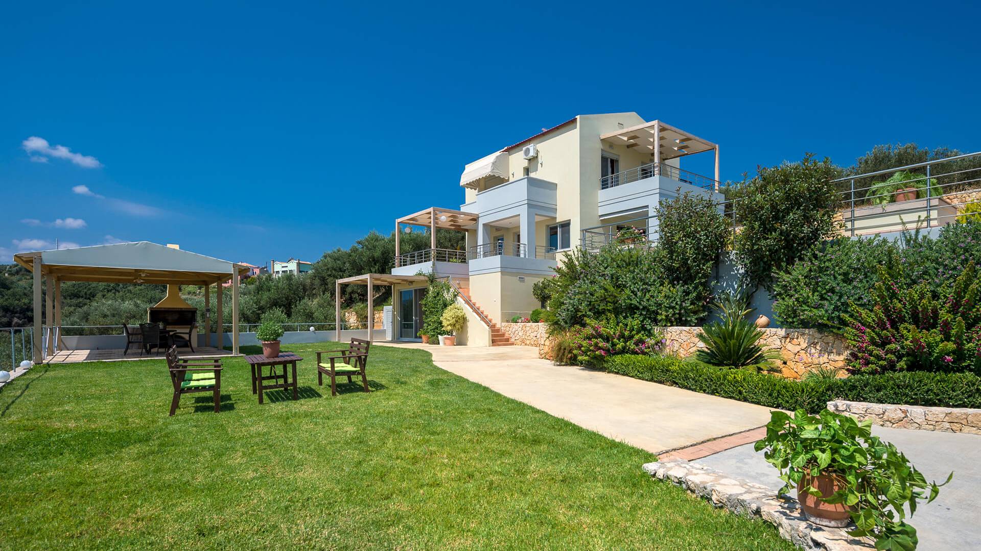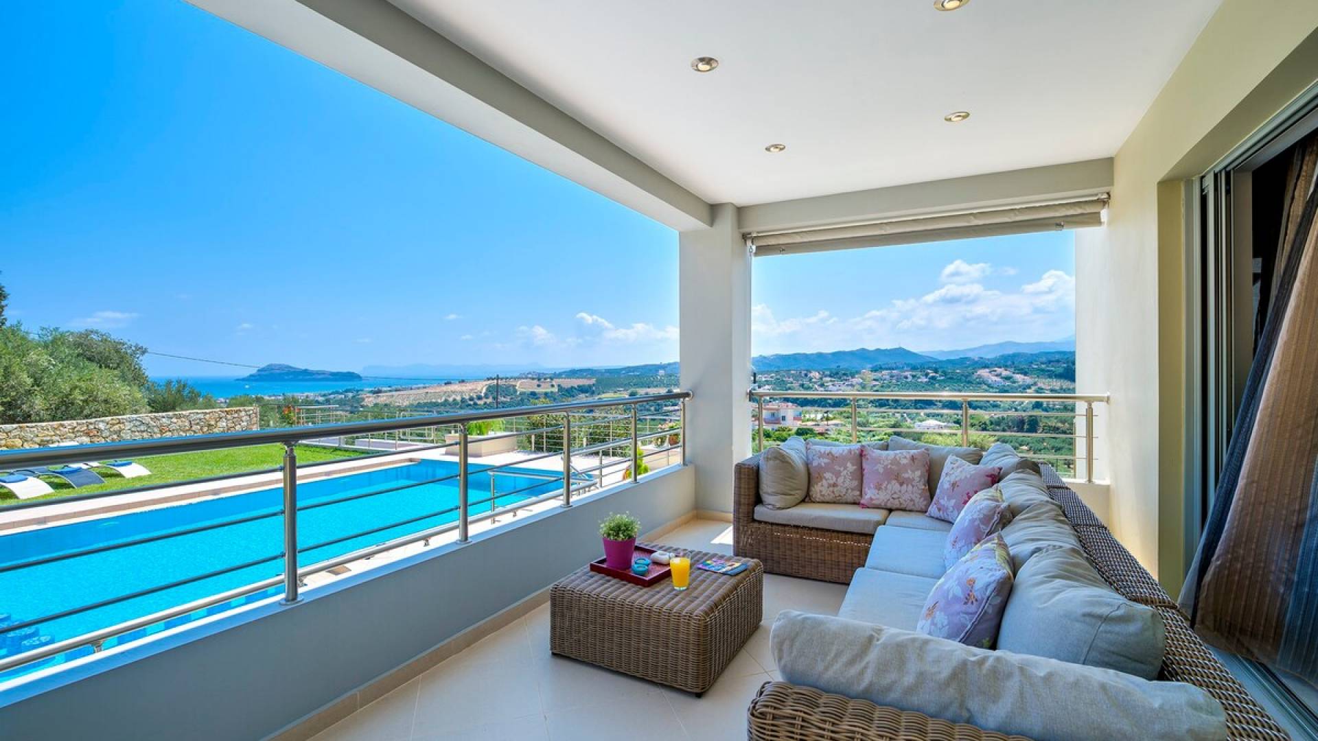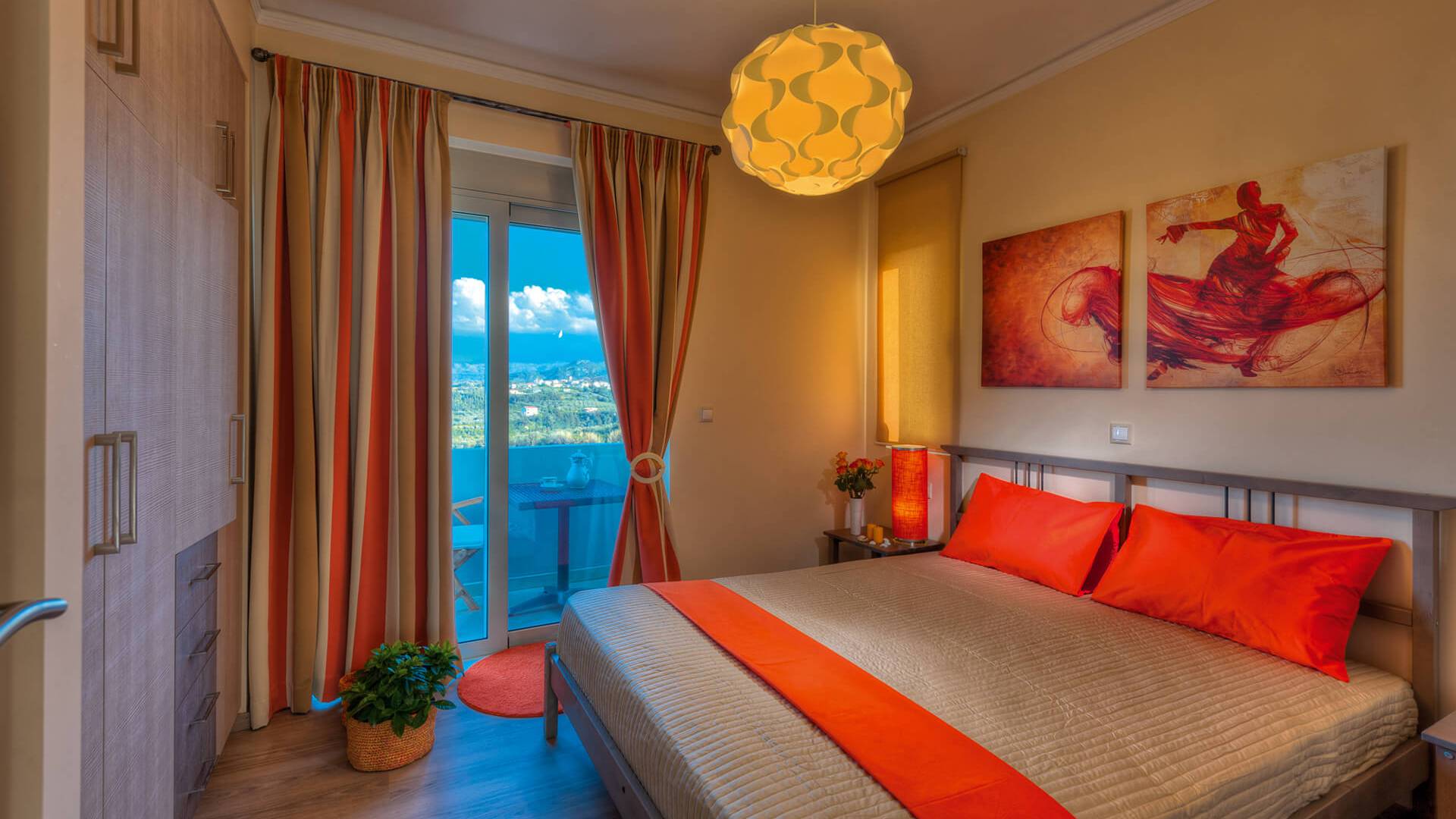 Au deuxième étage, il y a trois chambres climatisées avec salles de bains privatives, tissus et meubles tous décorés dans des tons colorés, doux et romantiques, des peintures modernes. Une chambre principale avec un lit king-size et une chambre avec un lit double partagent un grand balcon ombragé commun avec des meubles, offrant une vue panoramique incroyable sur la mer de Crète et les montagnes de Lefka Ori. La troisième chambre est décorée de couleurs vives orange et beige et dispose également d'un lit double et d'une salle de bains privative. Il bénéficie de sa propre véranda privée avec une vue unique. Toutes les chambres disposent de grands balcons donnant sur la mer et les jardins paradisiaques qui sont illuminés la nuit créant une atmosphère spéciale et romantique.