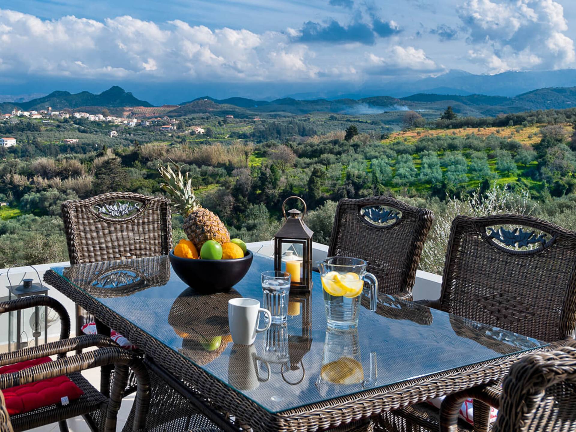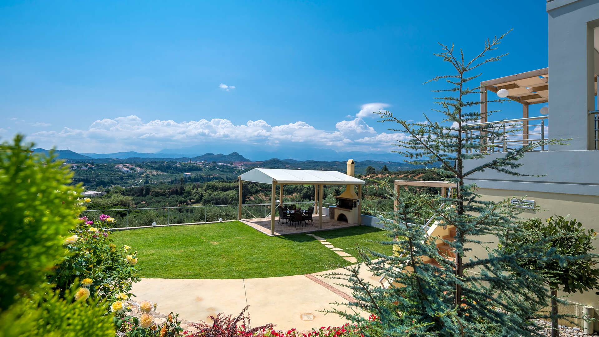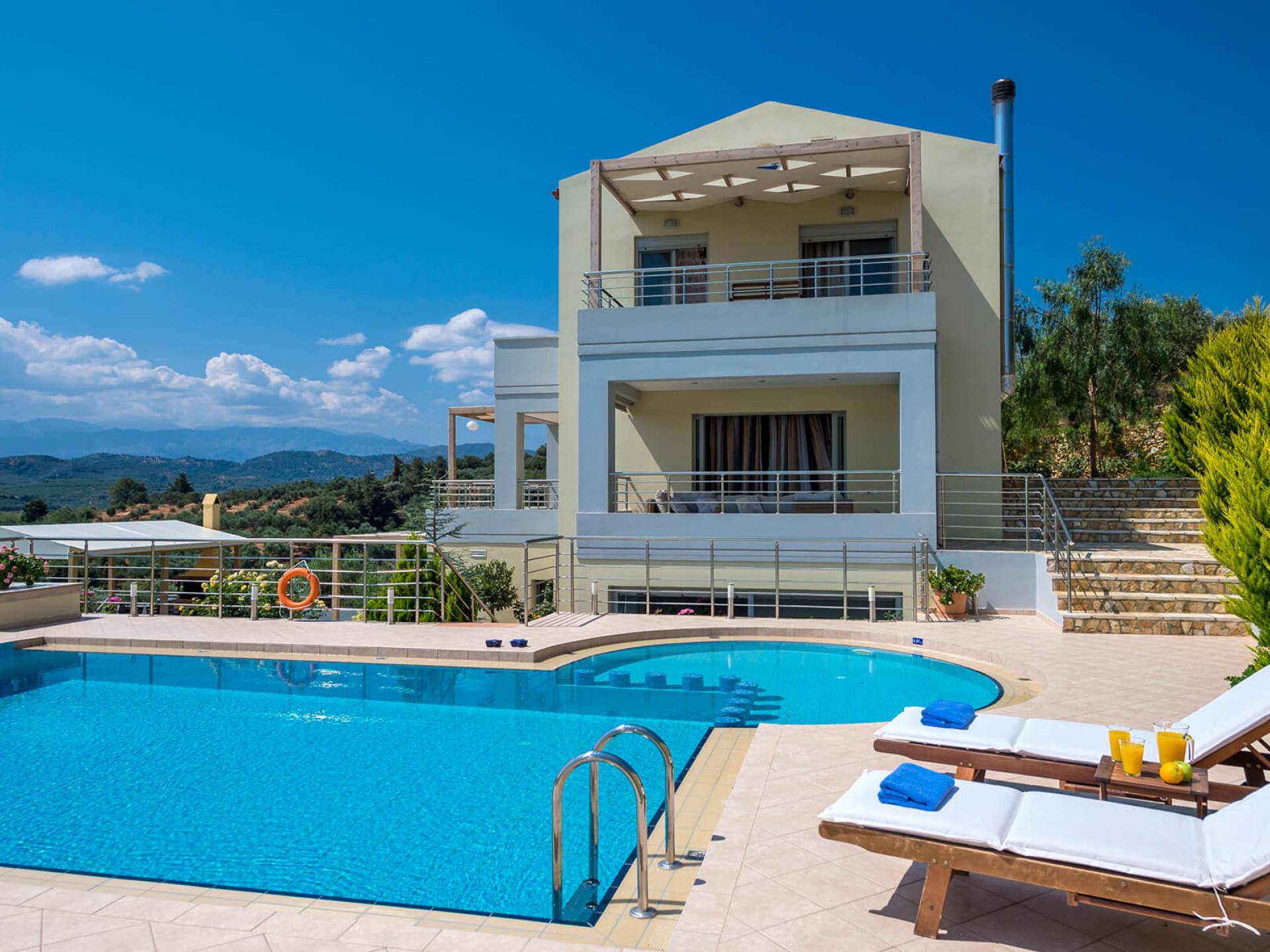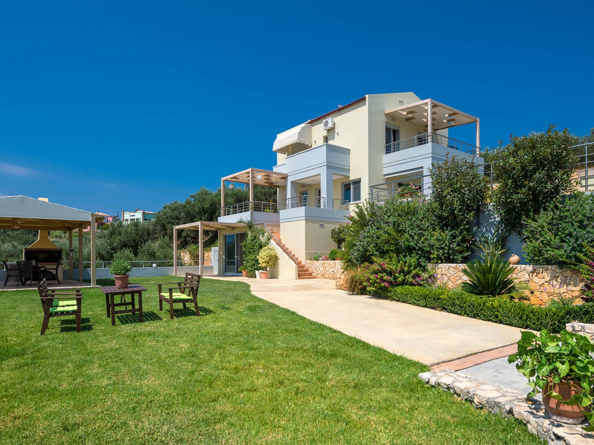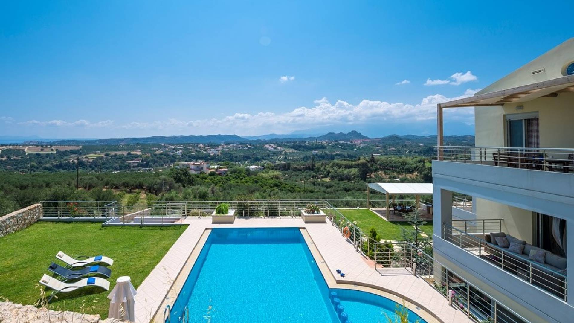 Au deuxième étage, il y a trois chambres climatisées avec salles de bains privatives, tissus et meubles tous décorés dans des tons colorés, doux et romantiques, des peintures modernes. Une chambre principale avec un lit king-size et une chambre avec un lit double partagent un grand balcon ombragé commun avec des meubles, offrant une vue panoramique incroyable sur la mer de Crète et les montagnes de Lefka Ori. La troisième chambre est décorée de couleurs vives orange et beige et dispose également d'un lit double et d'une salle de bains privative. Il bénéficie de sa propre véranda privée avec une vue unique. Toutes les chambres disposent de grands balcons donnant sur la mer et les jardins paradisiaques qui sont illuminés la nuit créant une atmosphère spéciale et romantique.