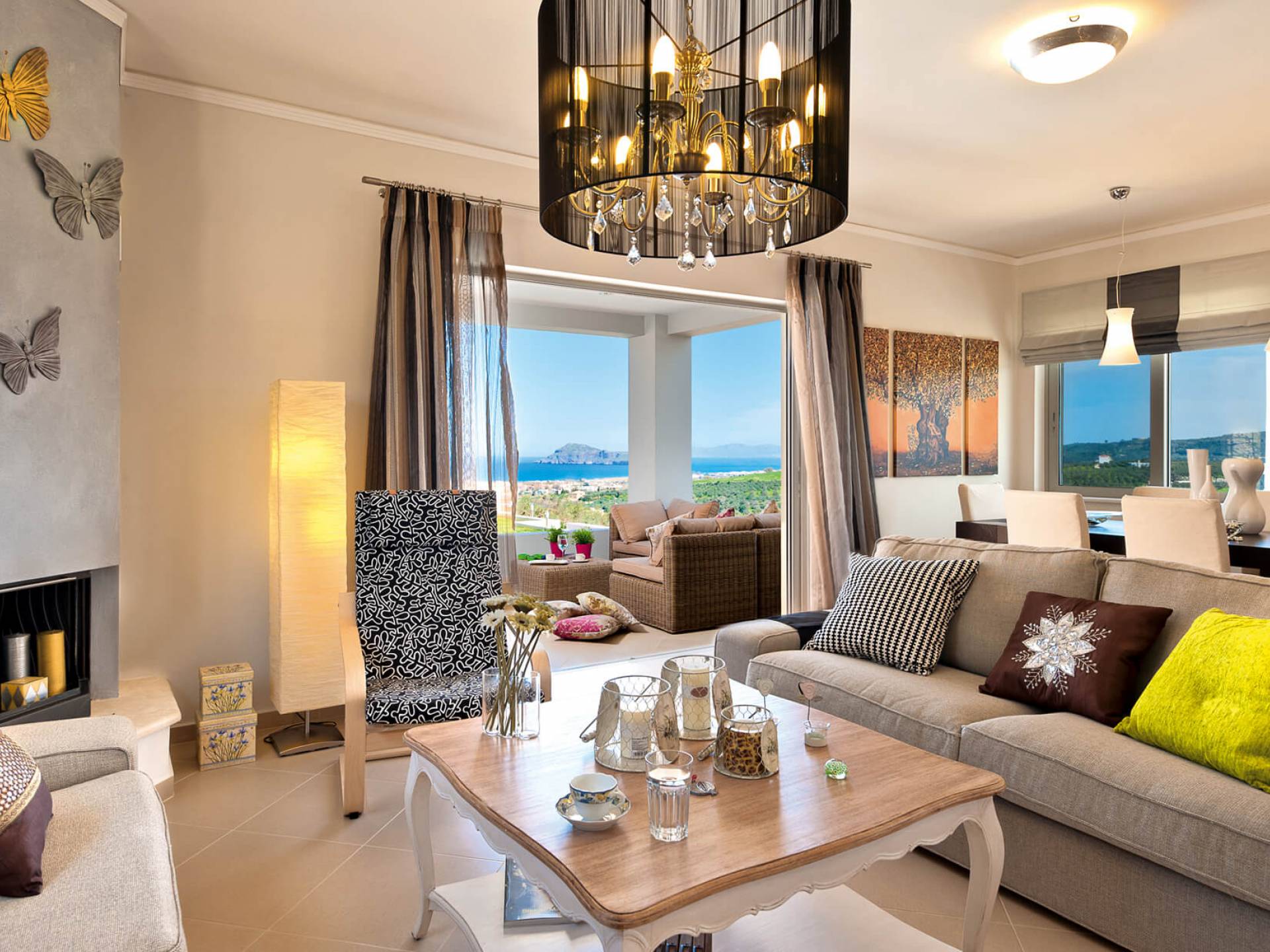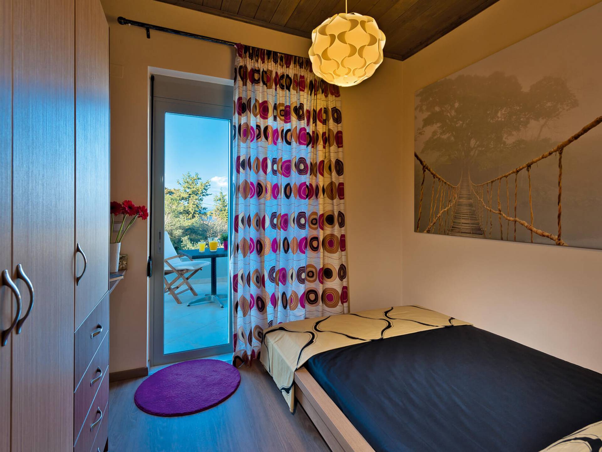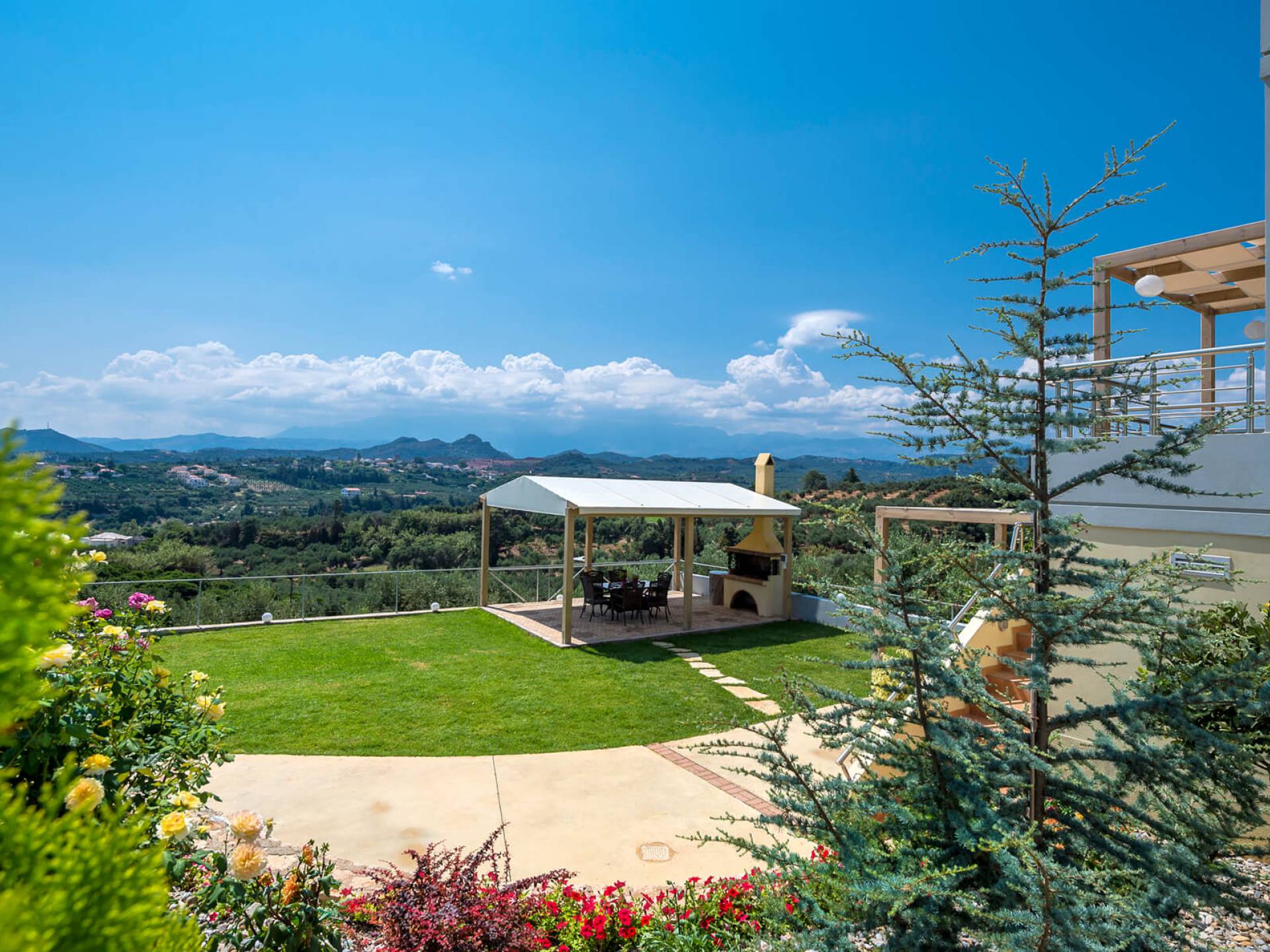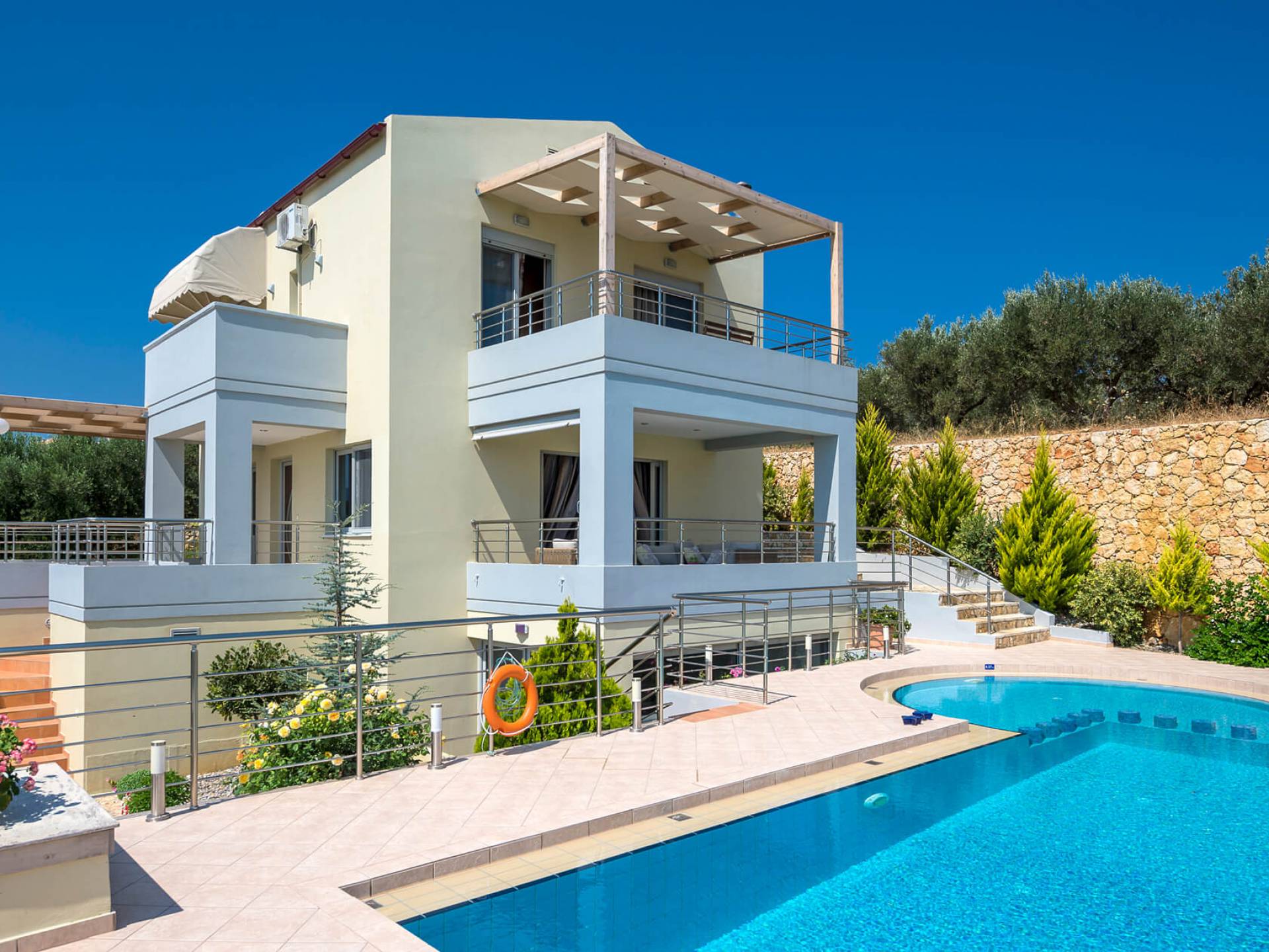 Au deuxième étage, il y a trois chambres climatisées avec salles de bains privatives, tissus et meubles tous décorés dans des tons colorés, doux et romantiques, des peintures modernes. Une chambre principale avec un lit king-size et une chambre avec un lit double partagent un grand balcon ombragé commun avec des meubles, offrant une vue panoramique incroyable sur la mer de Crète et les montagnes de Lefka Ori. La troisième chambre est décorée de couleurs vives orange et beige et dispose également d'un lit double et d'une salle de bains privative. Il bénéficie de sa propre véranda privée avec une vue unique. Toutes les chambres disposent de grands balcons donnant sur la mer et les jardins paradisiaques qui sont illuminés la nuit créant une atmosphère spéciale et romantique.
