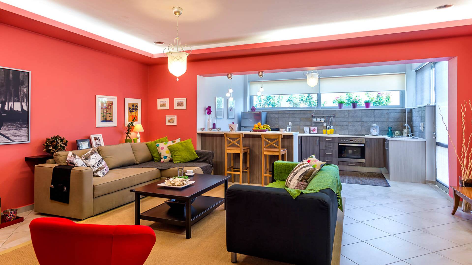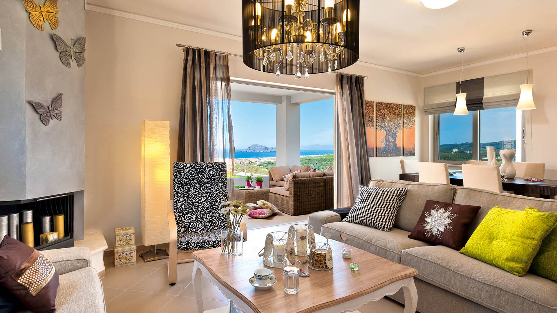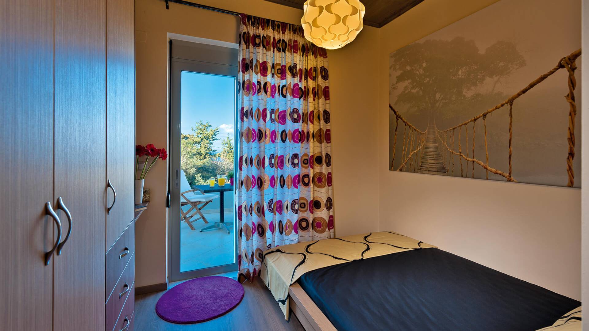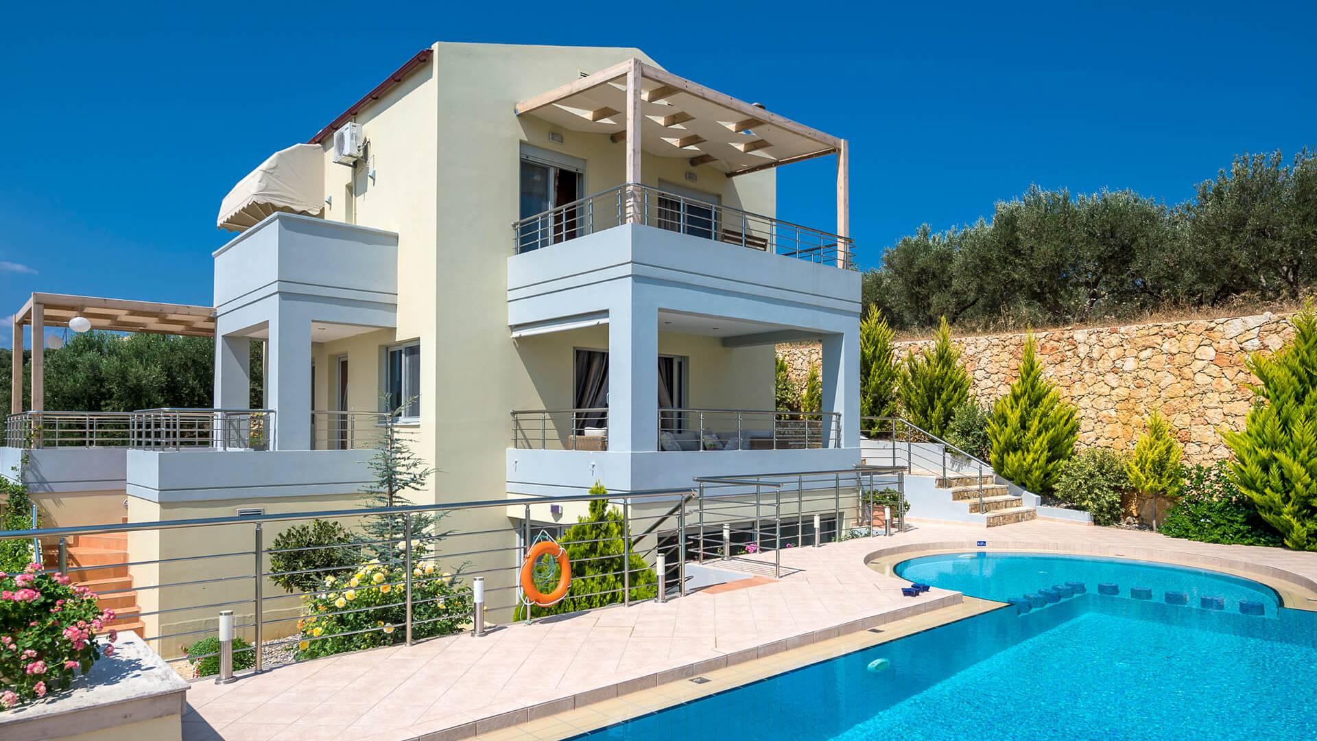 Au deuxième étage, il y a trois chambres climatisées avec salles de bains privatives, tissus et meubles tous décorés dans des tons colorés, doux et romantiques, des peintures modernes. Une chambre principale avec un lit king-size et une chambre avec un lit double partagent un grand balcon ombragé commun avec des meubles, offrant une vue panoramique incroyable sur la mer de Crète et les montagnes de Lefka Ori. La troisième chambre est décorée de couleurs vives orange et beige et dispose également d'un lit double et d'une salle de bains privative. Il bénéficie de sa propre véranda privée avec une vue unique. Toutes les chambres disposent de grands balcons donnant sur la mer et les jardins paradisiaques qui sont illuminés la nuit créant une atmosphère spéciale et romantique.