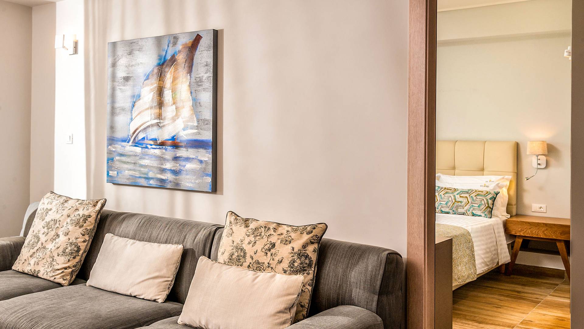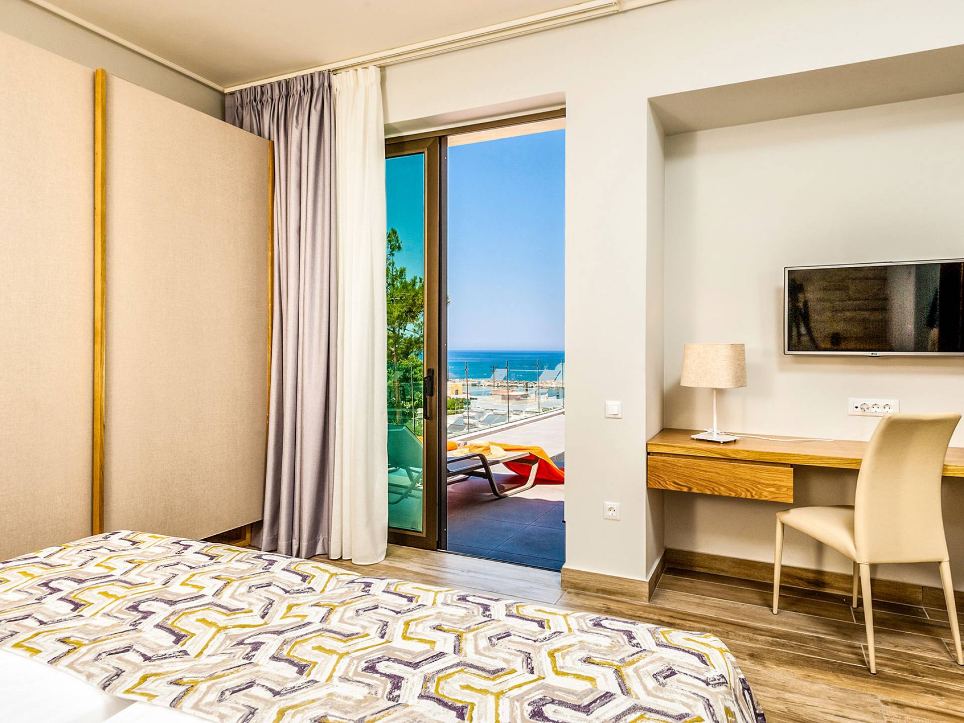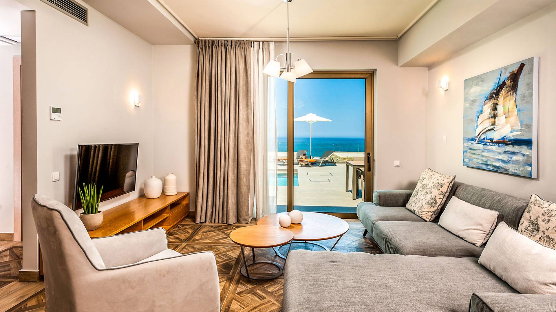Le rez-de-chaussée se compose d'un spacieux salon et d'une cuisine décloisonnés qui sont équipés d'appareils électriques modernes et d'ustensiles de cuisine d'excellente qualité. Au même niveau se trouvent 3 chambres toutes avec salle de bains privative et vue sur la mer. Au premier étage, il y a une autre chambre avec une salle de bain en suite. Cette chambre bénéficie de la plus grande véranda de la villa avec une vue imprenable sur la mer. Une chambre supplémentaire est située sous la villa bénéficiant de la lumière naturelle et d'une salle de bains privative. Il dispose également d'un petit coin salon. À côté de la chambre se trouve une salle familiale climatisée. La climatisation automatique couvre toutes les chambres, ainsi que la télévision par satellite en clair et le Wi-Fi gratuit.