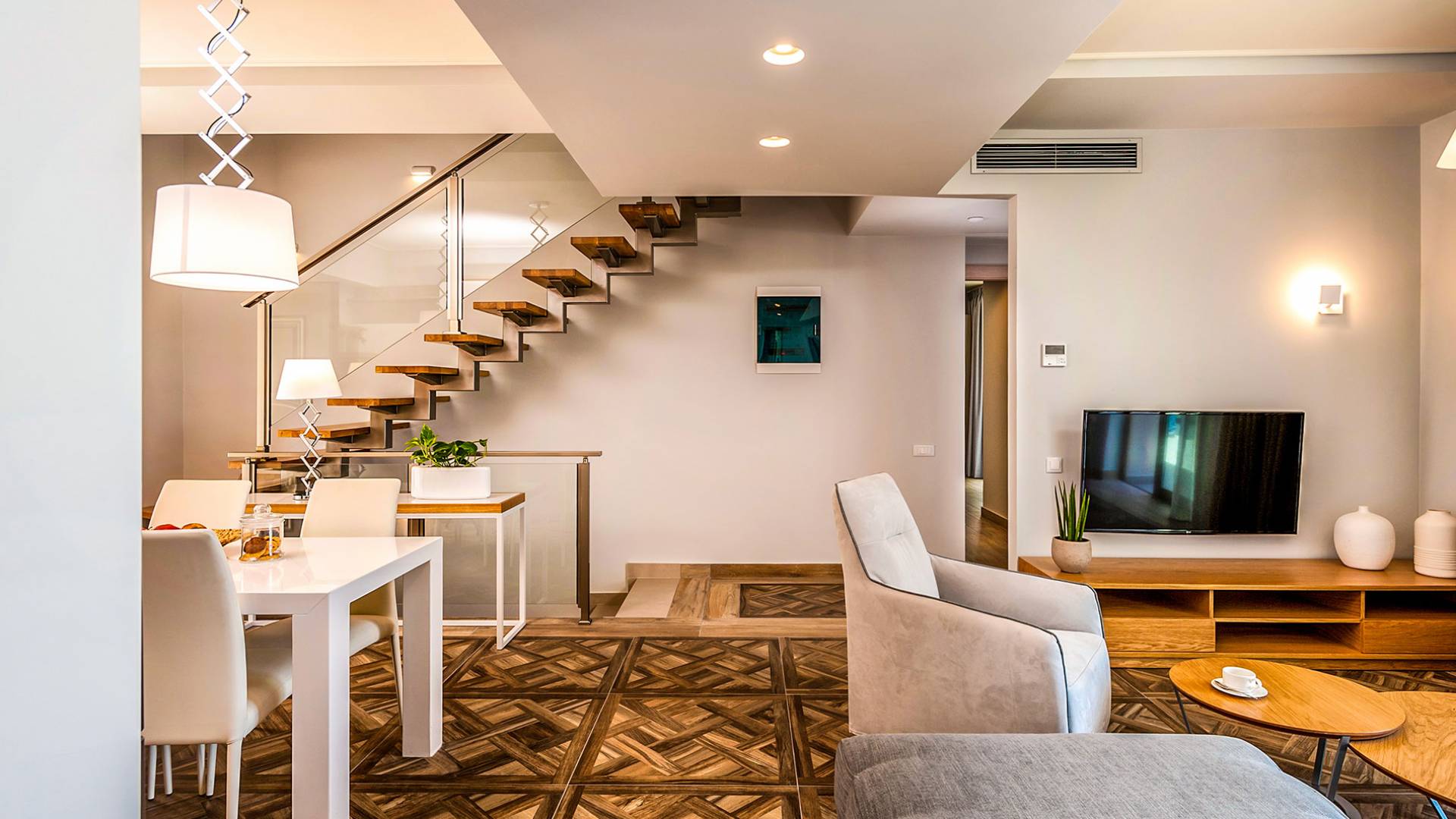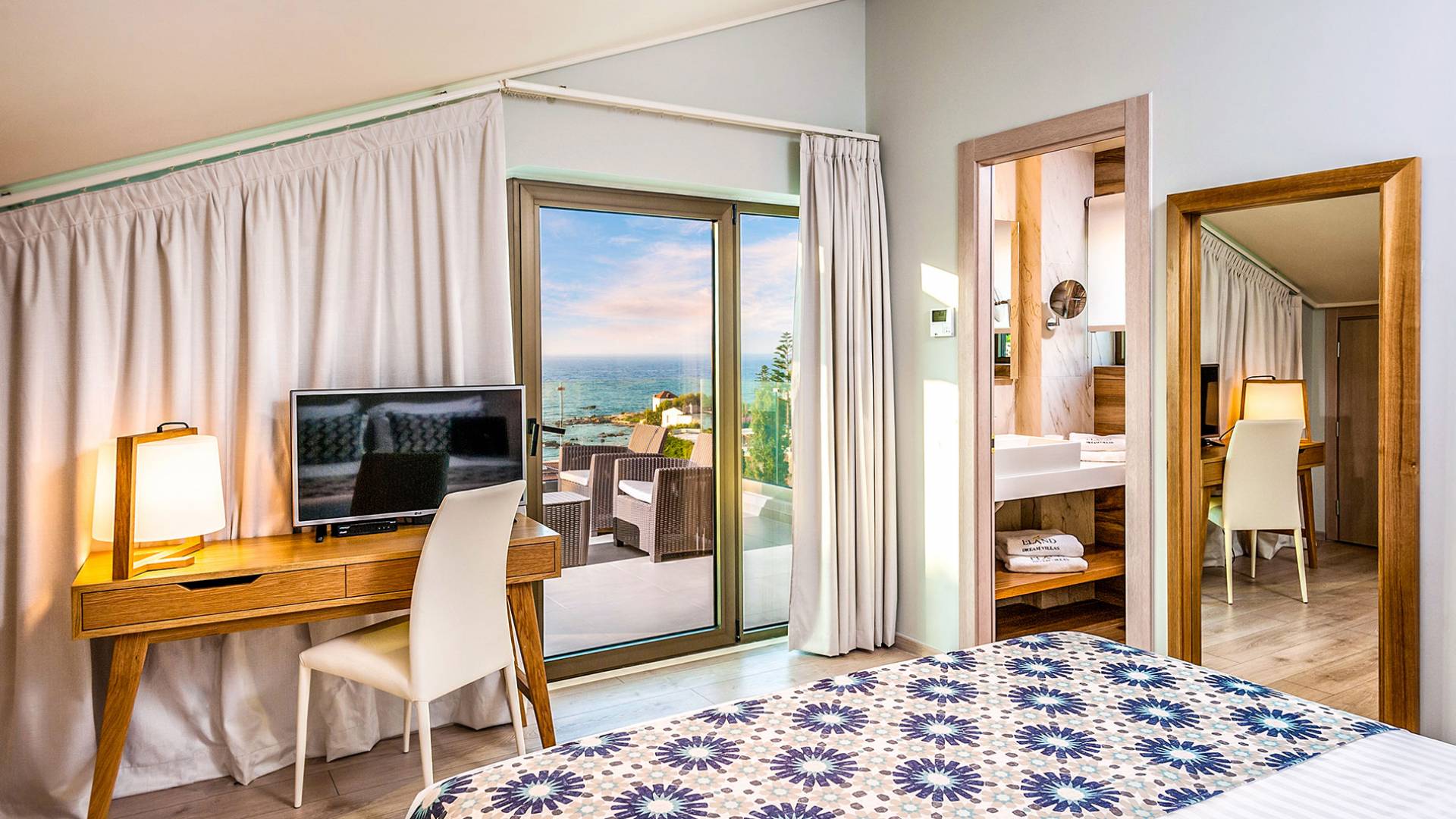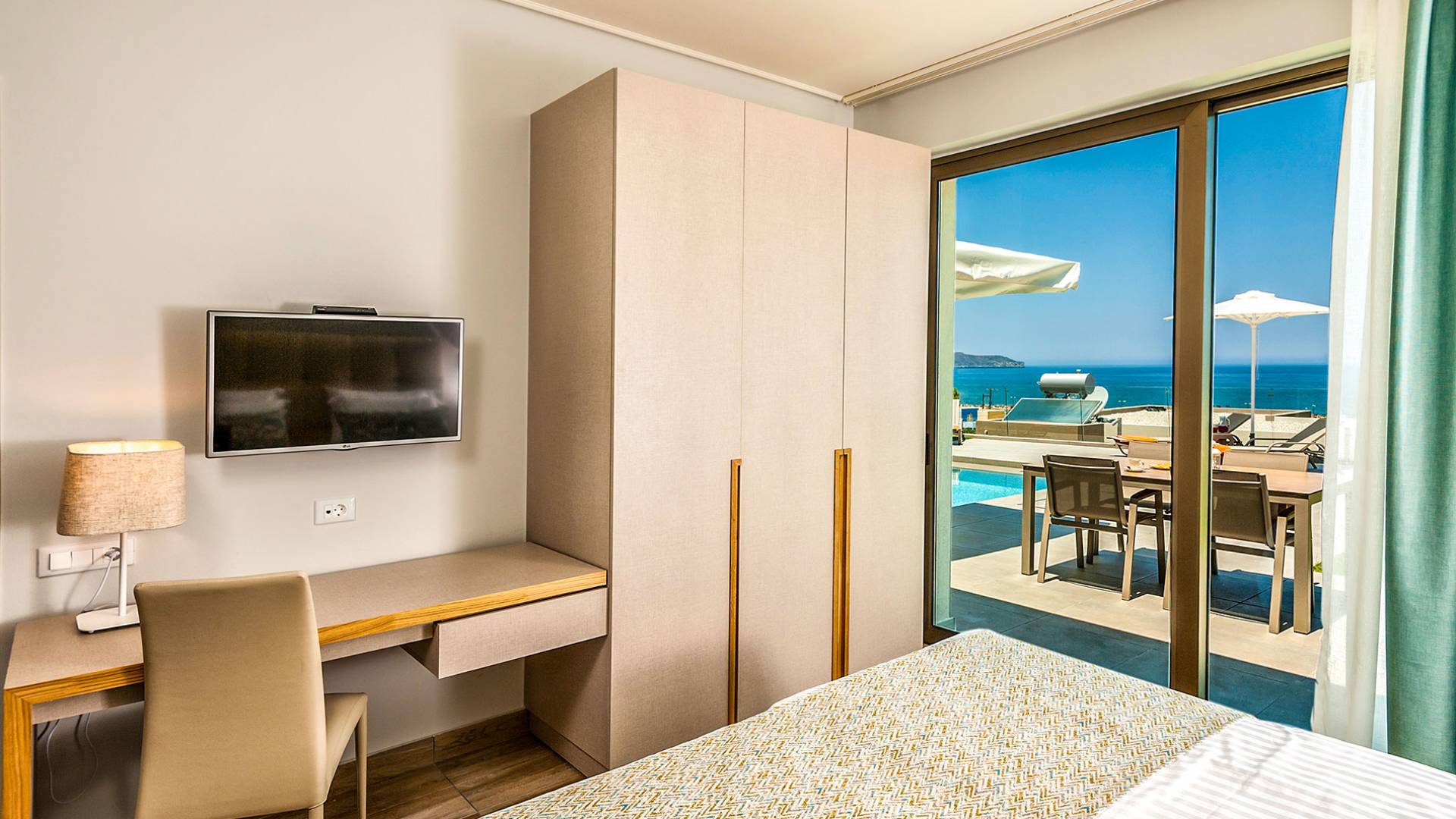 Le rez-de-chaussée se compose d'un spacieux salon et d'une cuisine décloisonnés qui sont équipés d'appareils électriques modernes et d'ustensiles de cuisine d'excellente qualité. Au même niveau se trouvent 3 chambres toutes avec salle de bains privative et vue sur la mer. Au premier étage, il y a une autre chambre avec une salle de bain en suite. Cette chambre bénéficie de la plus grande véranda de la villa avec une vue imprenable sur la mer. Une chambre supplémentaire est située sous la villa bénéficiant de la lumière naturelle et d'une salle de bains privative. Il dispose également d'un petit coin salon. À côté de la chambre se trouve une salle familiale climatisée. La climatisation automatique couvre toutes les chambres, ainsi que la télévision par satellite en clair et le Wi-Fi gratuit.