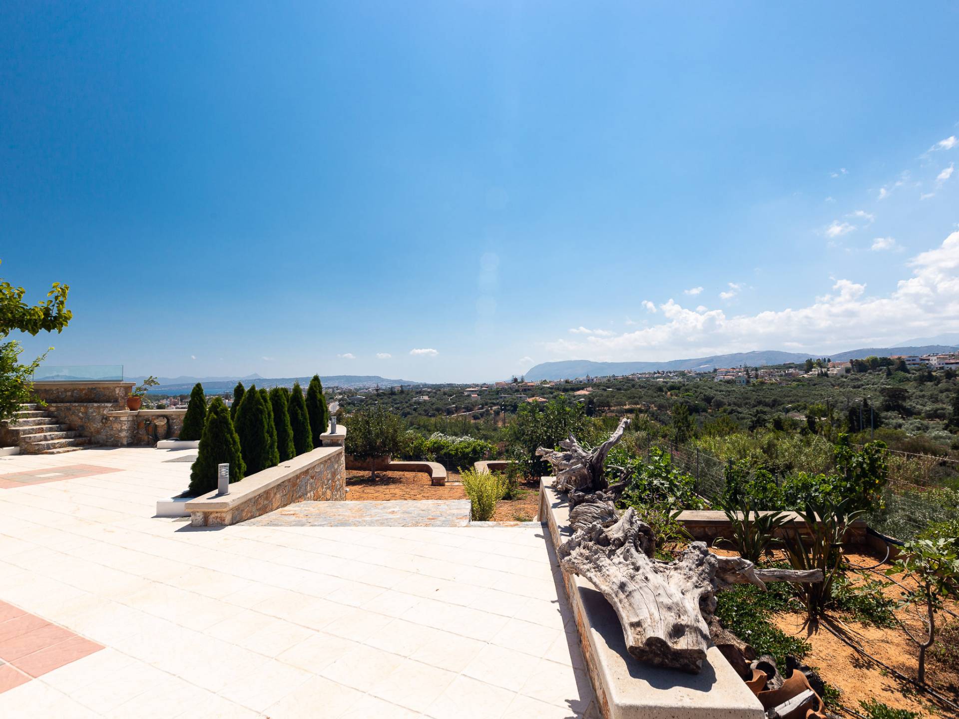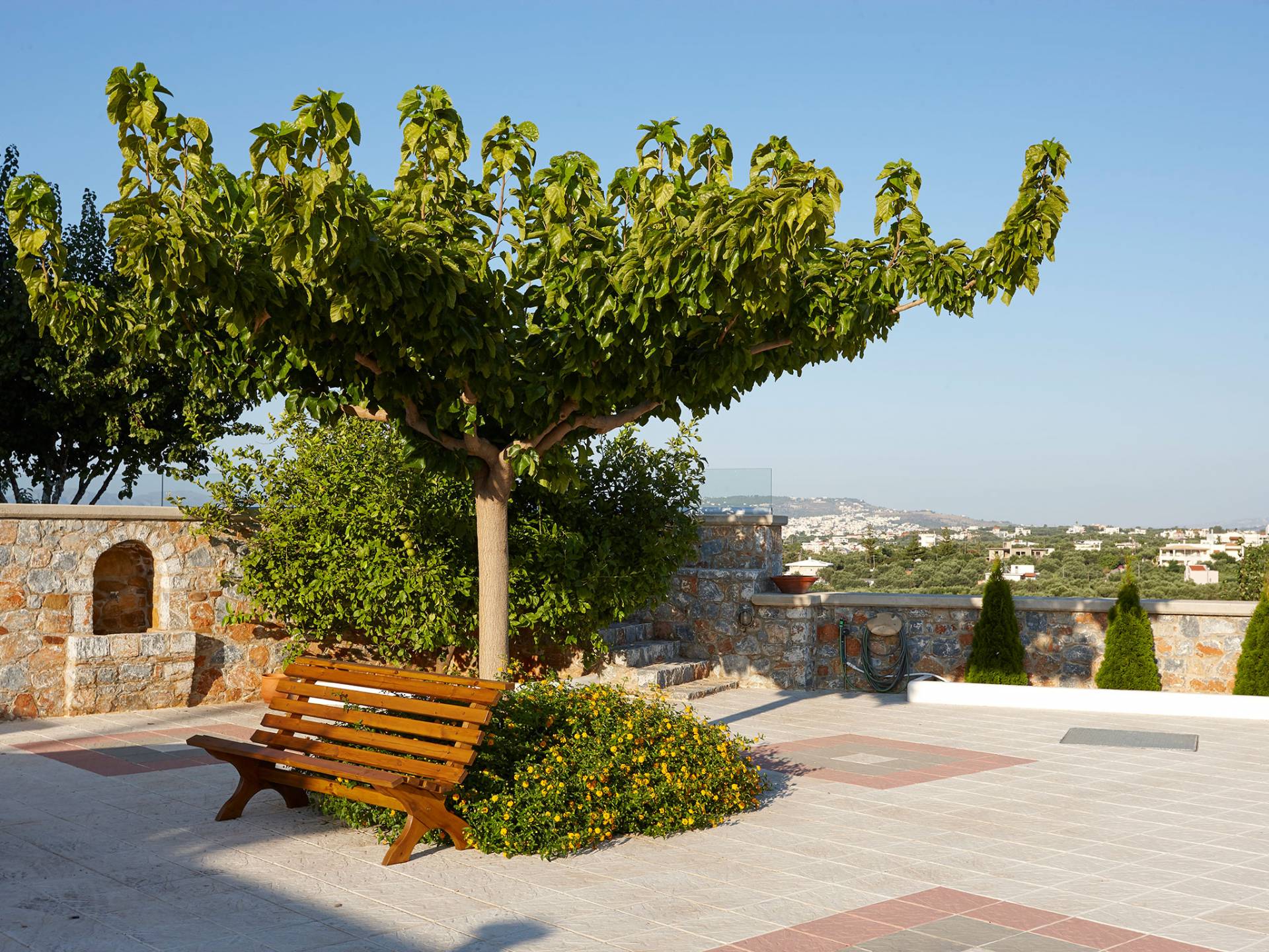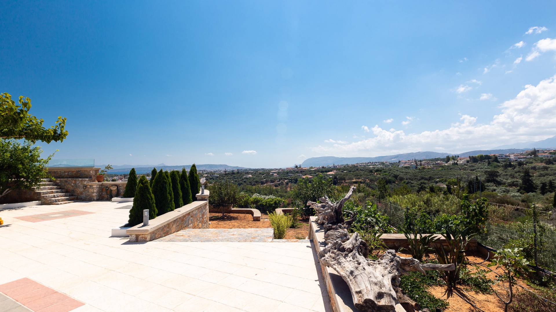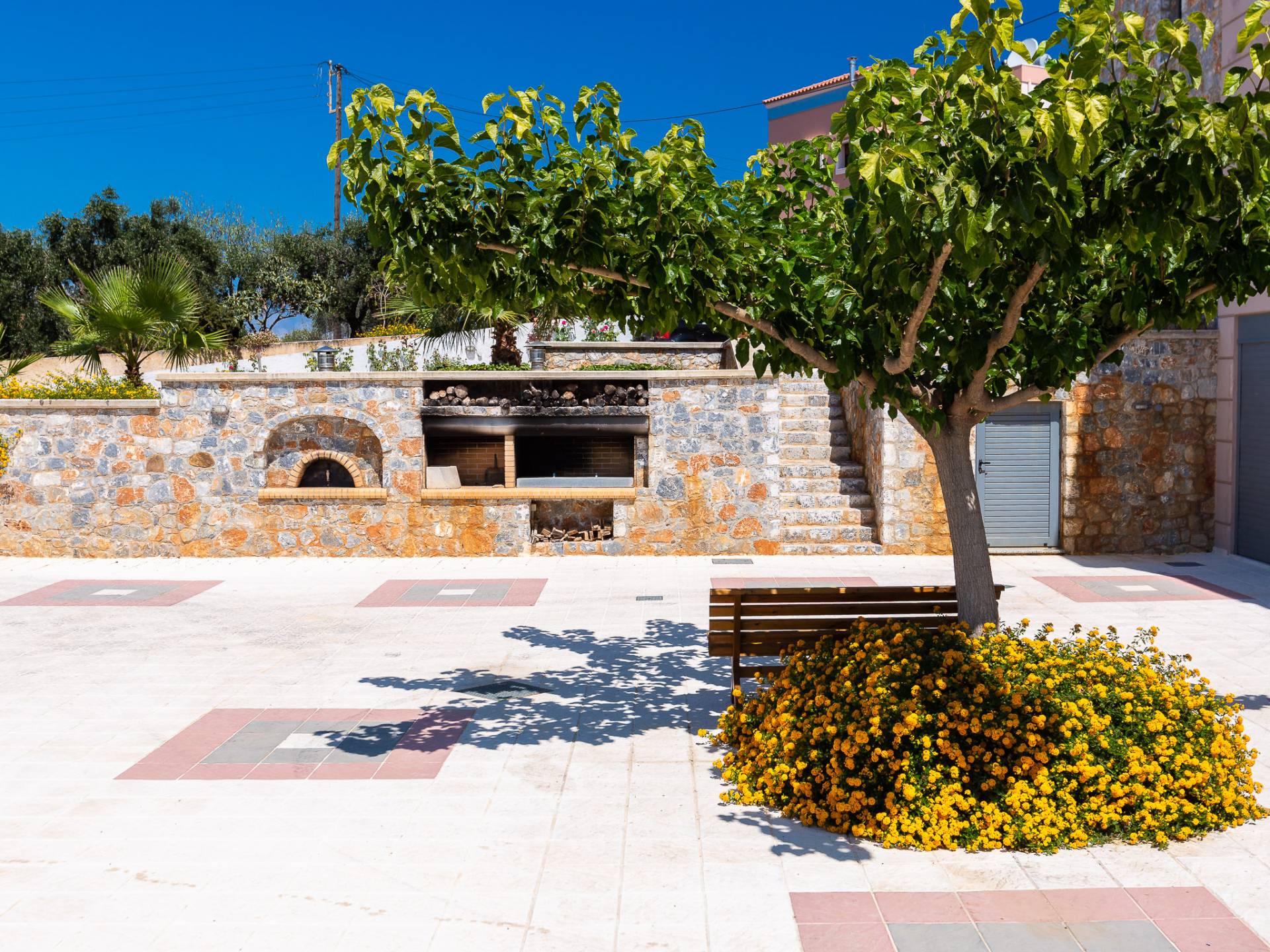 Le bleu de la mer Égée et le paysage montagneux sauvage de la Crète, le tout dans une image enchanteresse qui pourrait plaire à toutes sortes de goûts. Vous serez charmé par les magnifiques couleurs qui inondent le ciel et plus tard même par le lever de lune rougeoyant illuminant la mer en contrebas. L'extérieur est dominé par de riches jardins de pelouse où des arbres fruitiers locaux, tels que des orangers, des mandariniers, des pomelos, des citronniers, un arbre joyeux, des grenadiers, des pommiers, des raisins et même des fraises et des bananes prêts à les manger arbre, à condition de venir à la bonne saison !