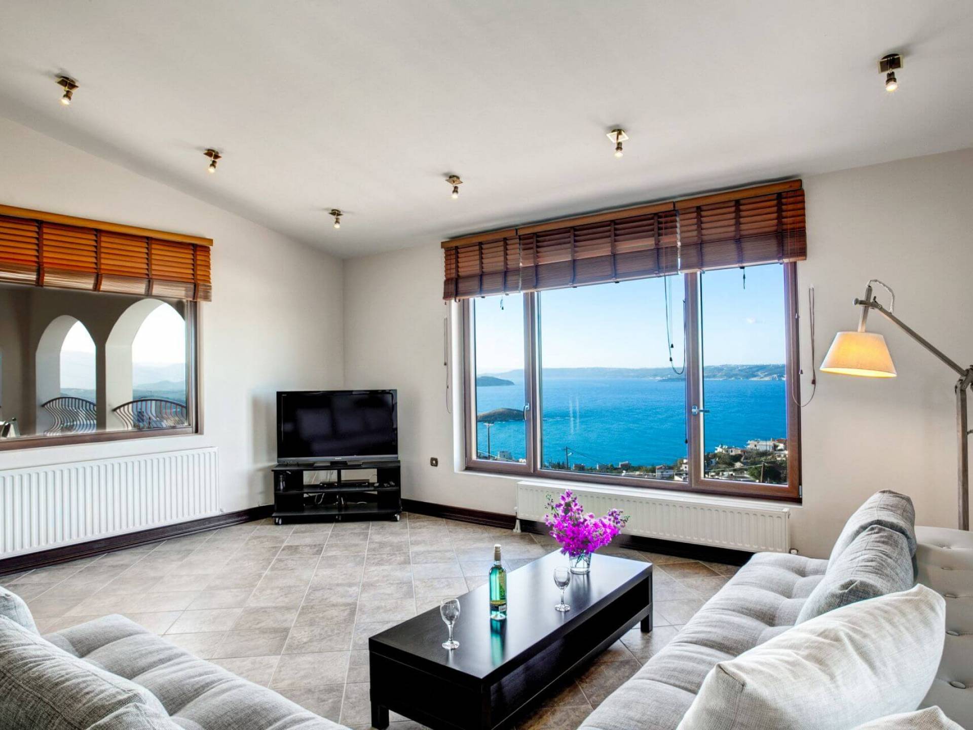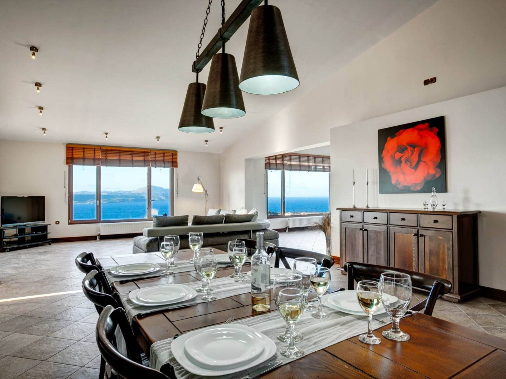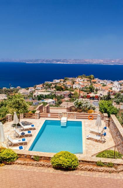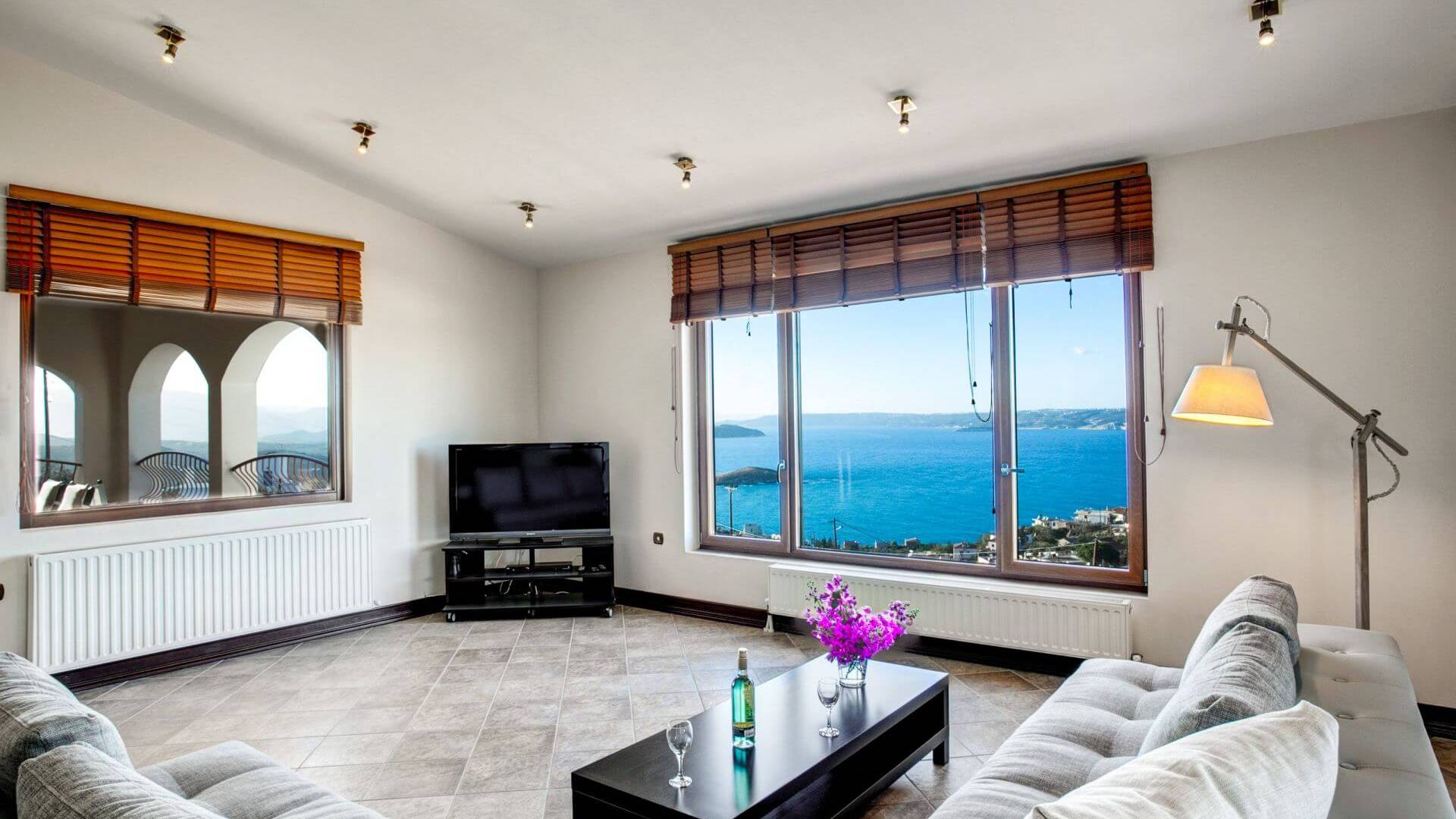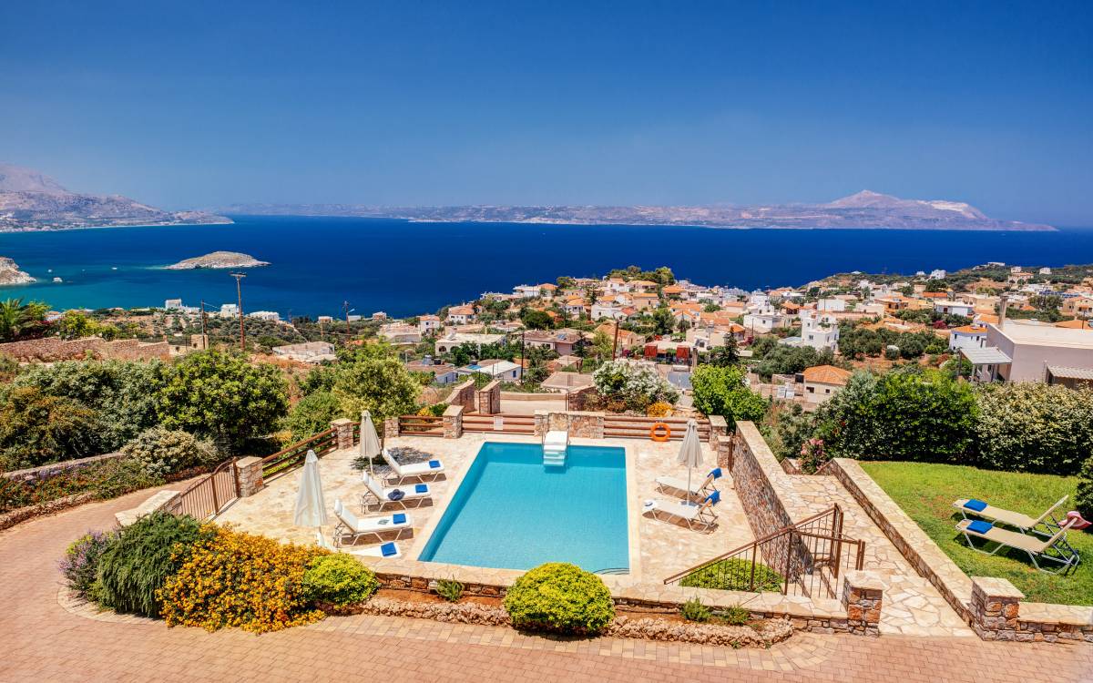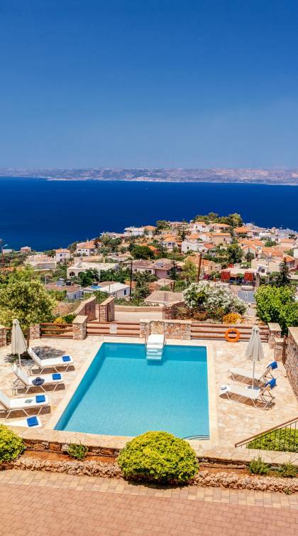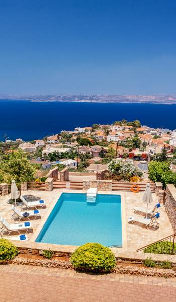 Disposition d'Eros Villa Chania : La Villa dispose de cinq chambres - trois avec lits doubles et deux avec deux lits simples - quatre salles de bains, une cuisine entièrement équipée, un salon avec vue sur la mer et une grande piscine. Au rez-de-chaussée, il y a un appartement indépendant avec deux chambres et une salle de bain, une cuisine entièrement équipée et un salon avec une télévision. Au premier étage, il y a trois autres chambres, trois salles de bains, une deuxième cuisine entièrement équipée, une salle à manger et un grand salon. A ce niveau spécifique et à l'intérieur du salon, il y a deux canapés-lits pouvant accueillir jusqu'à trois personnes supplémentaires. Votre séjour à Eros Villa Chania sera inoubliable !