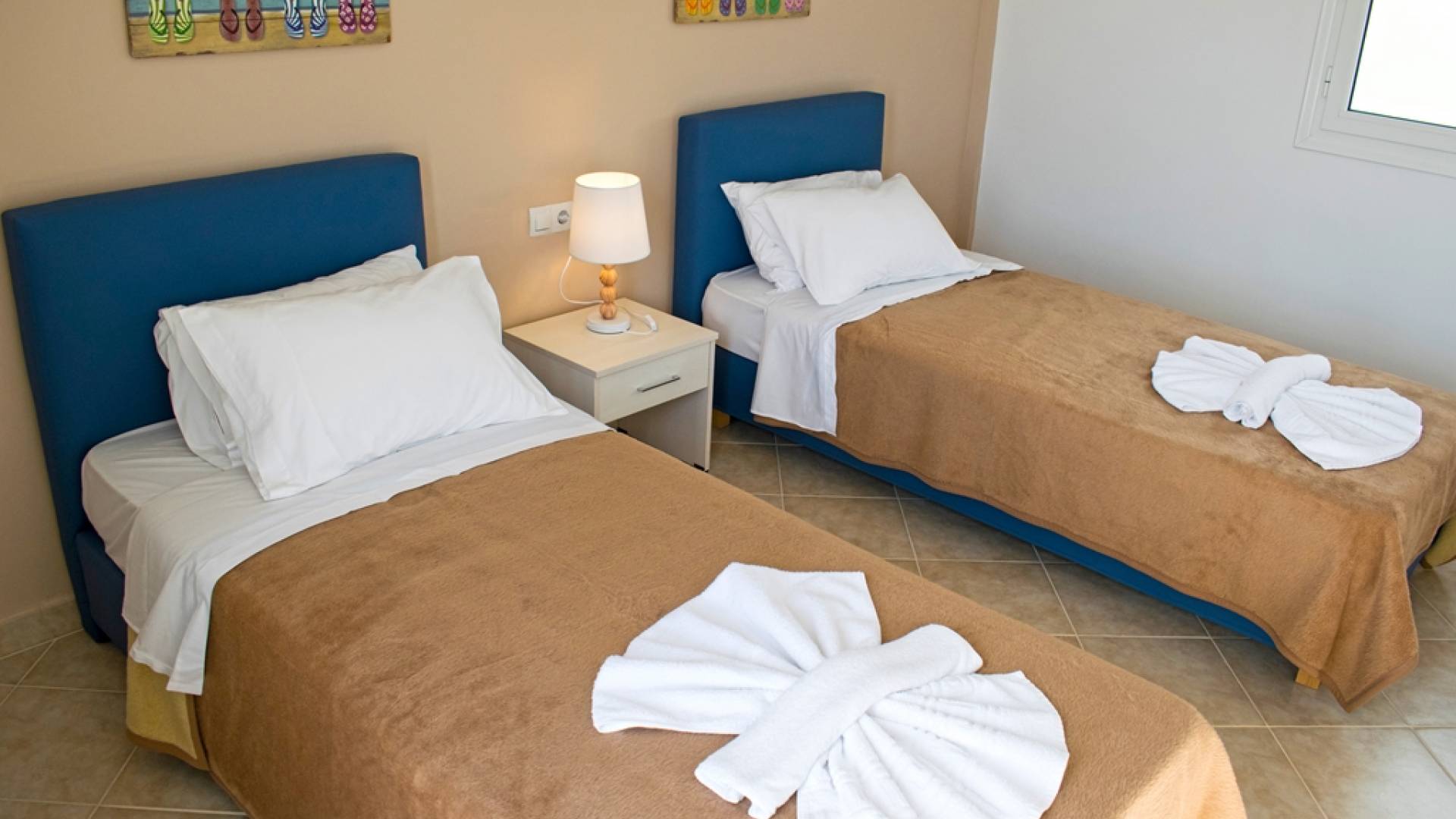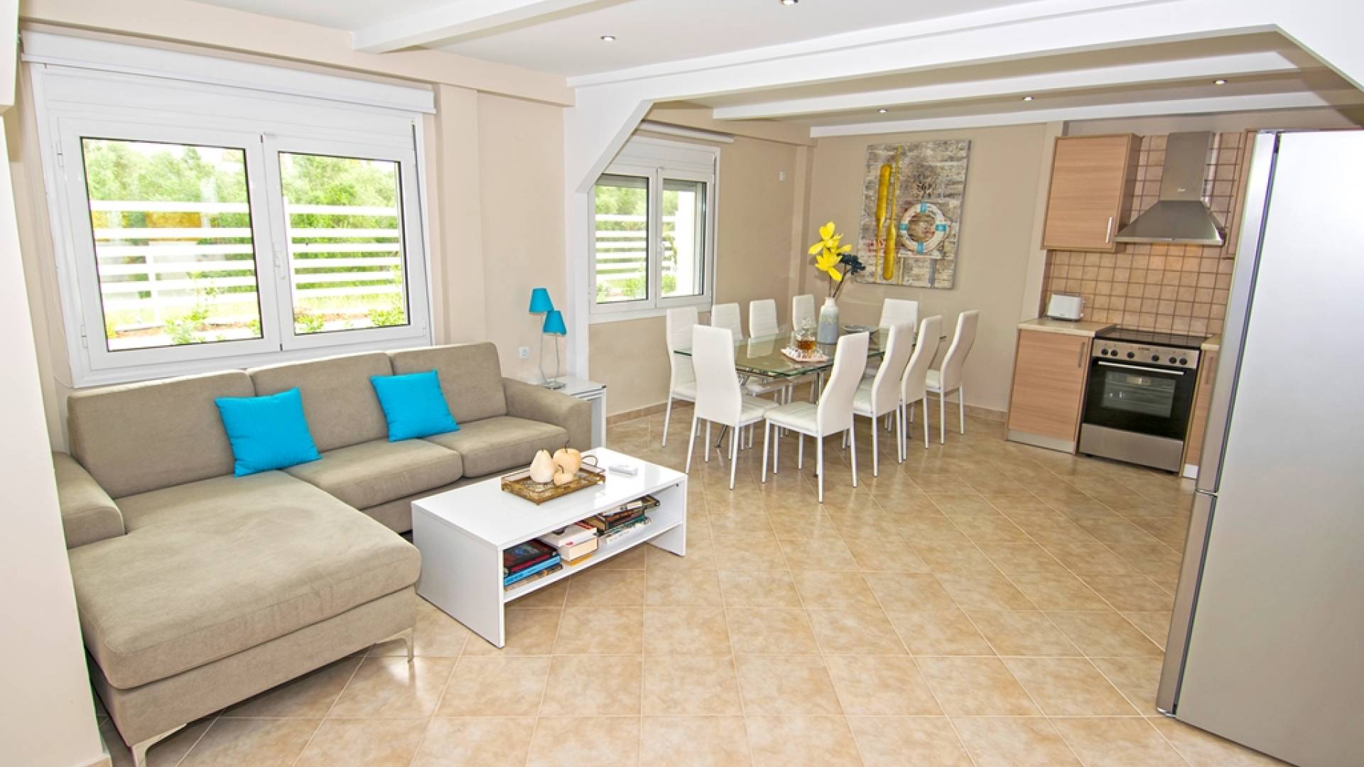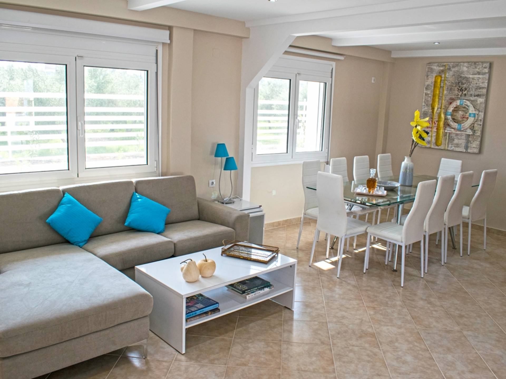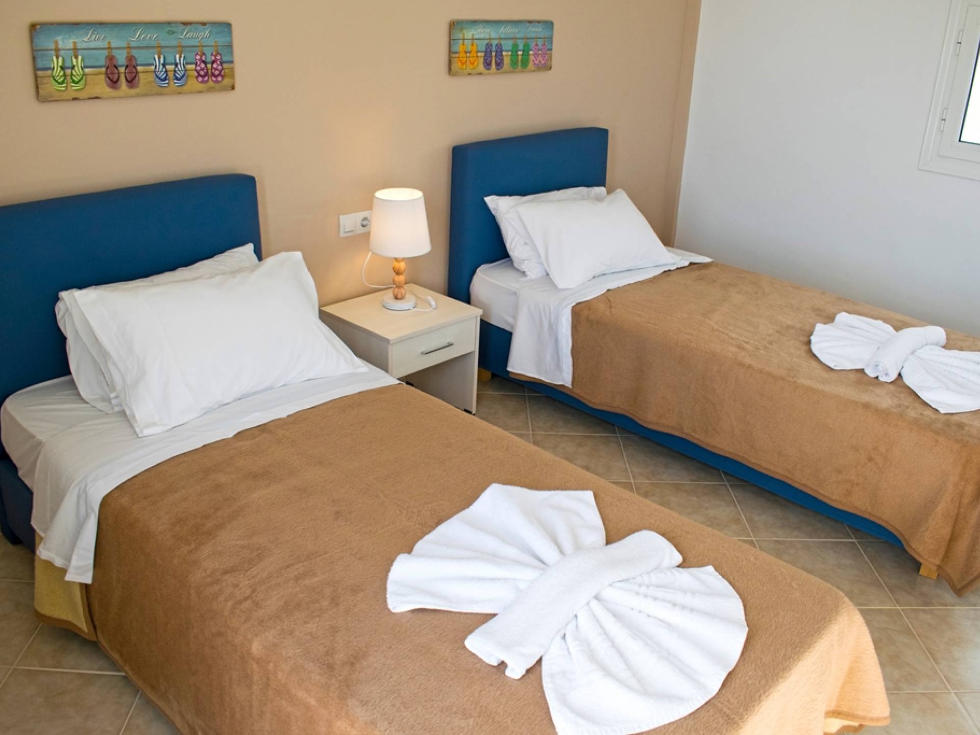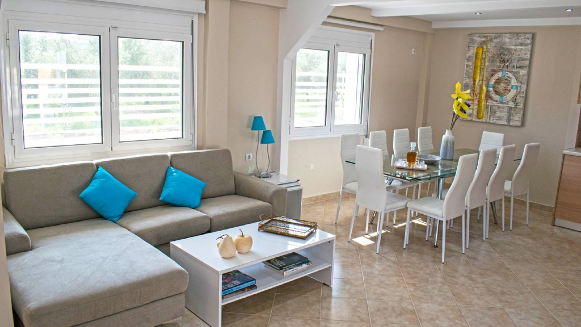 La porte s'ouvre sur une villa ensoleillée et joliment décorée. Au rez-de-chaussée, on trouve le coin salon, le coin repas, la cuisine entièrement équipée, une chambre avec 3 lits simples, et une salle de bain attenante. Il y a trois autres chambres, deux doubles et une twin, toutes avec un balcon avec vue sur la mer, au premier étage et deux salles de bains. Une des chambres a une salle de bain attenante.