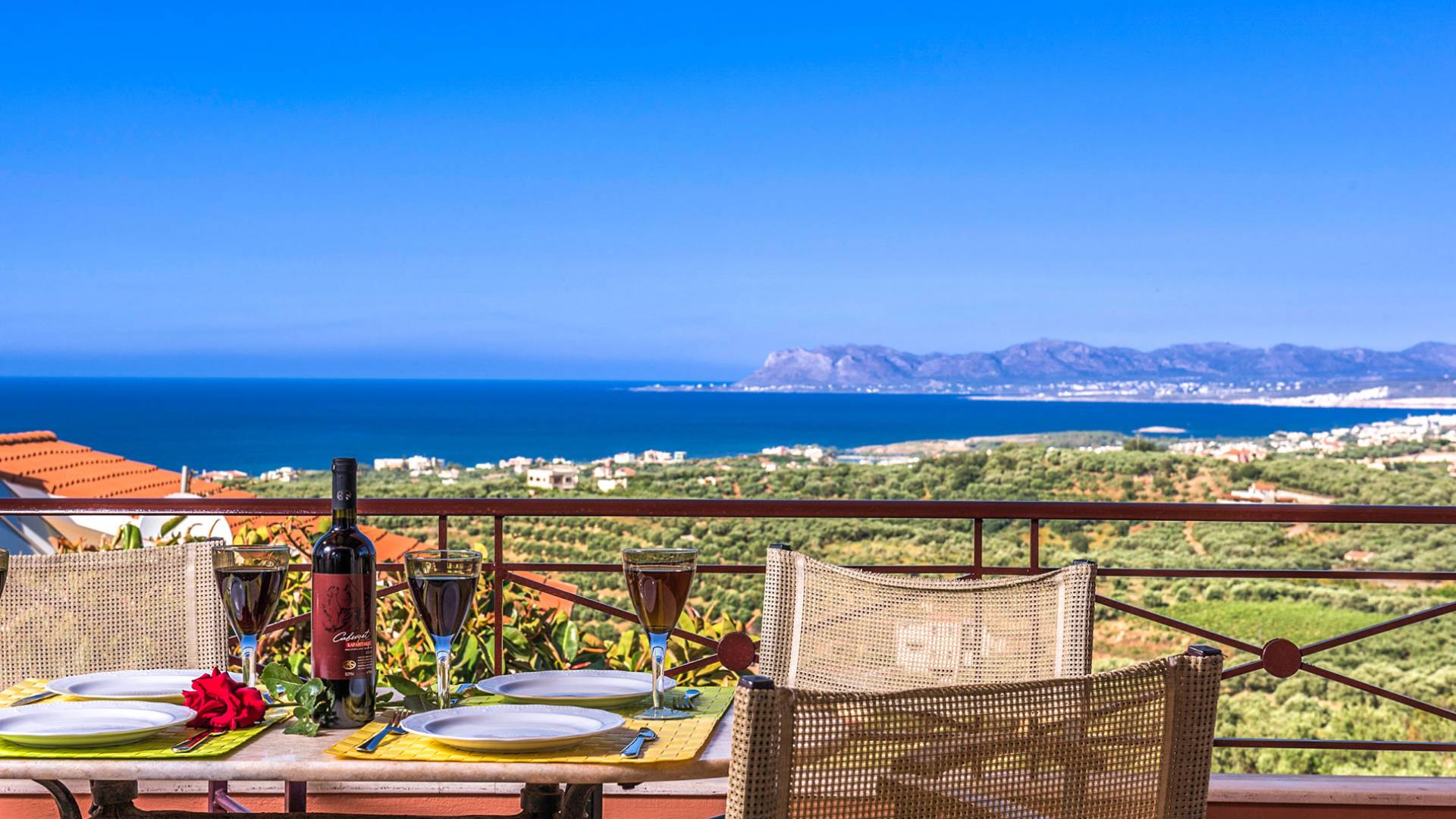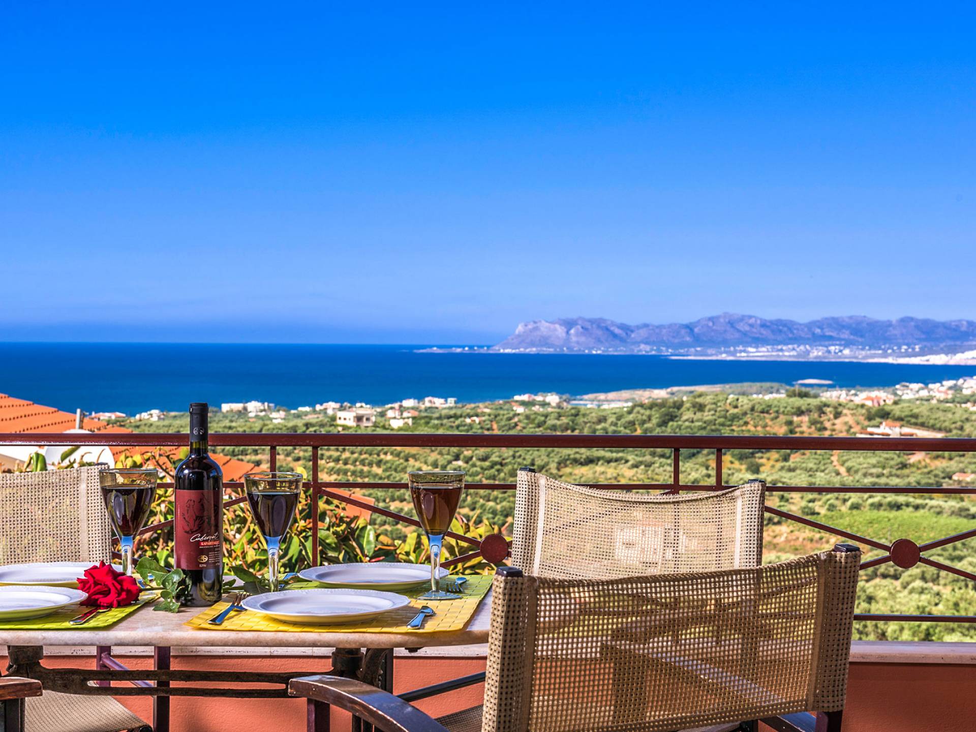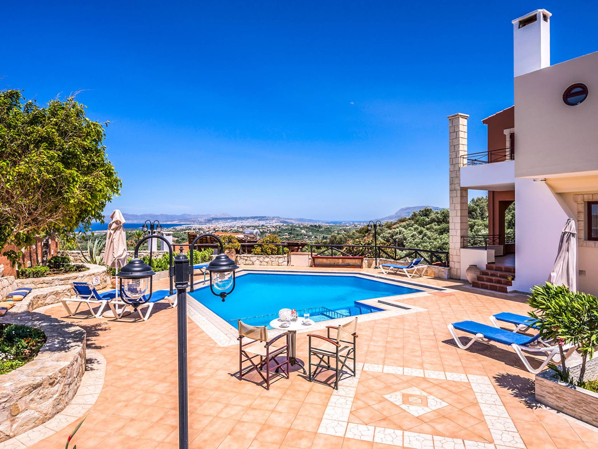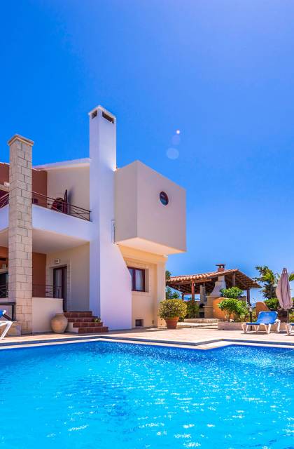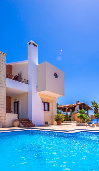 John A Villa Chania à Stalos, région d'Agia Marina, Chania Crète. John A Villa Chania est niché sur une colline à Pano Stalos à Chania Crète Grèce, avec une vue imprenable sur le golfe de La Canée. Il est construit selon des normes de qualité maximales et il est dominé par la forte présence d'éléments locaux et une vue magnifique.