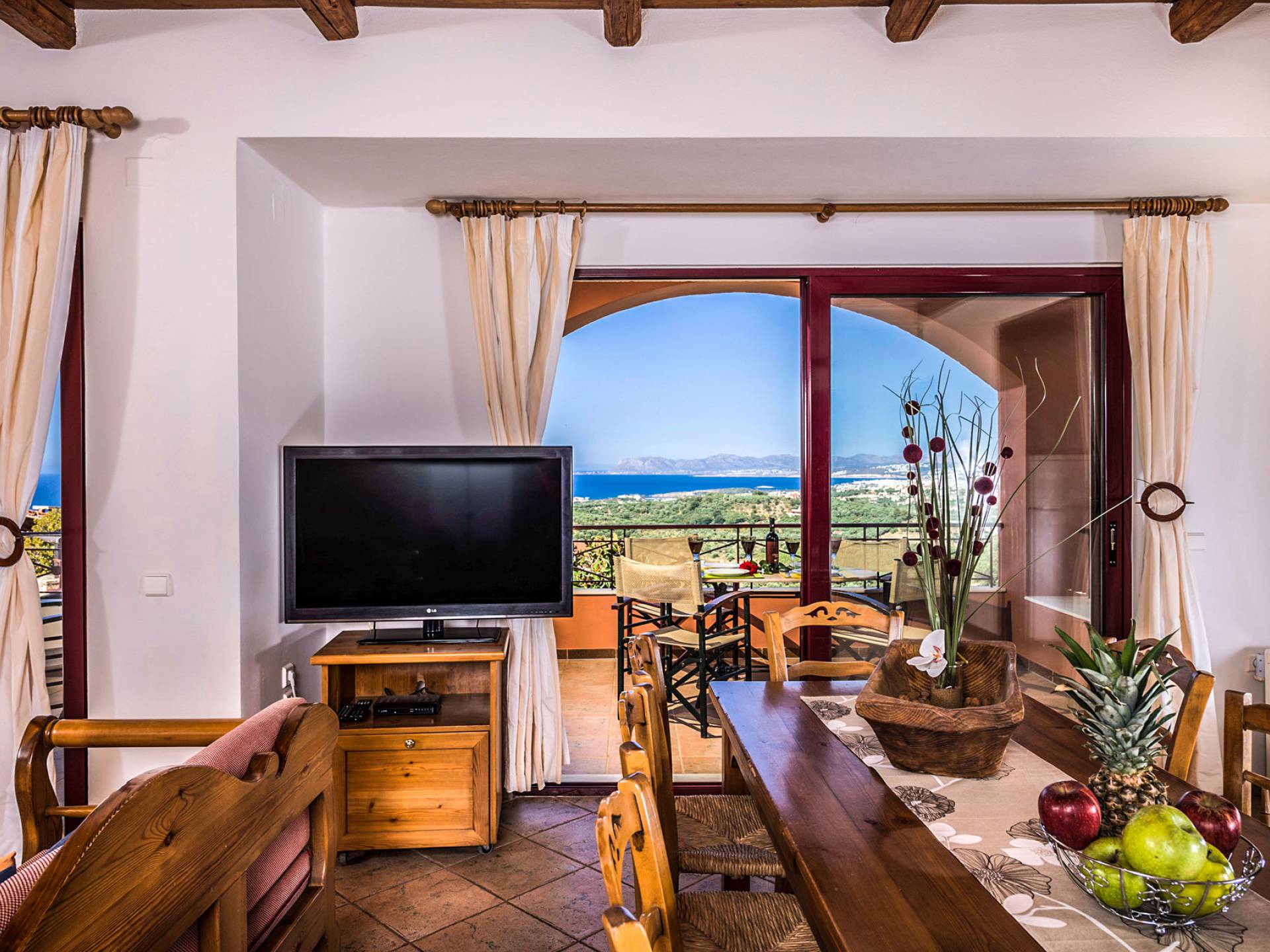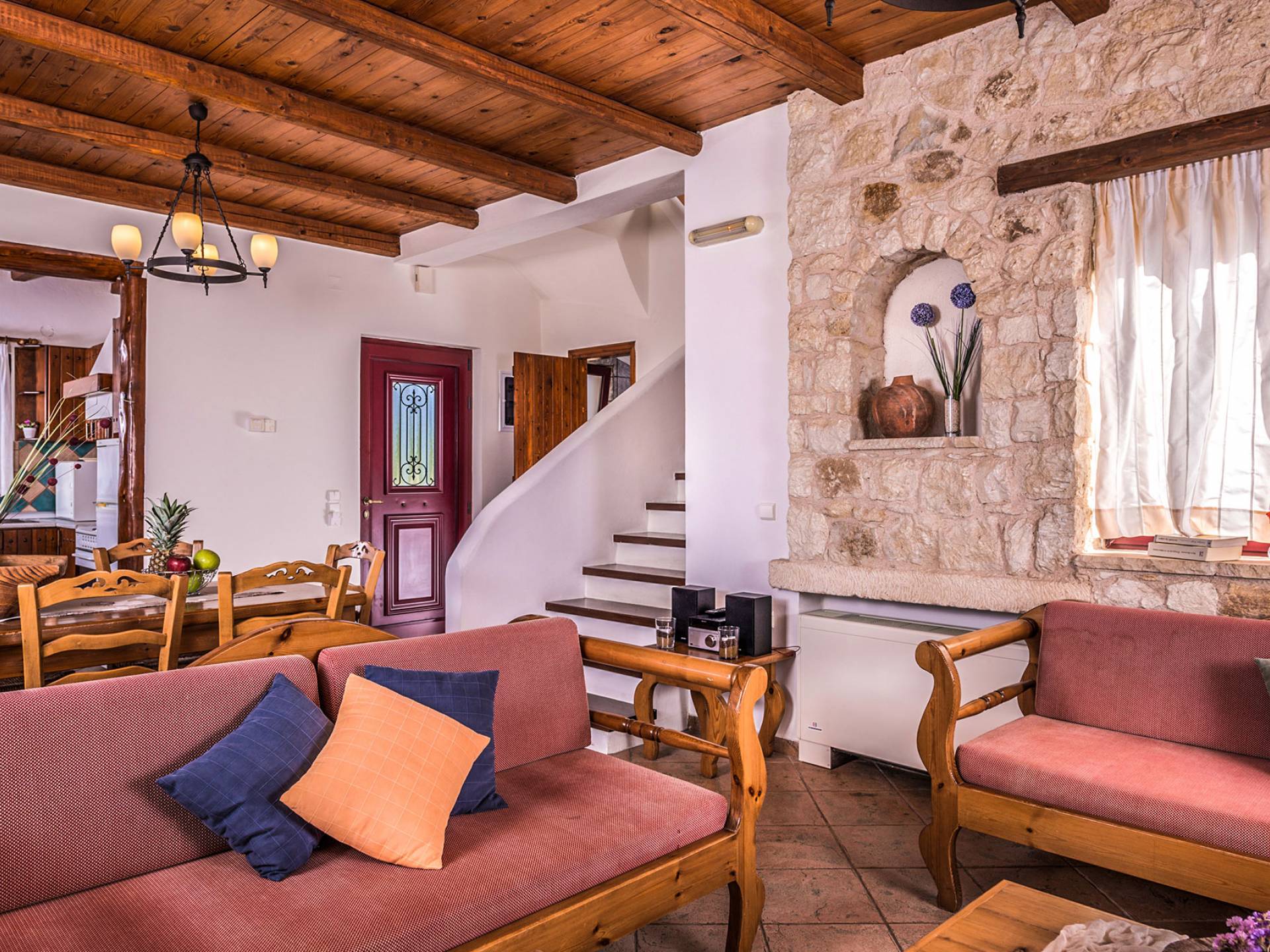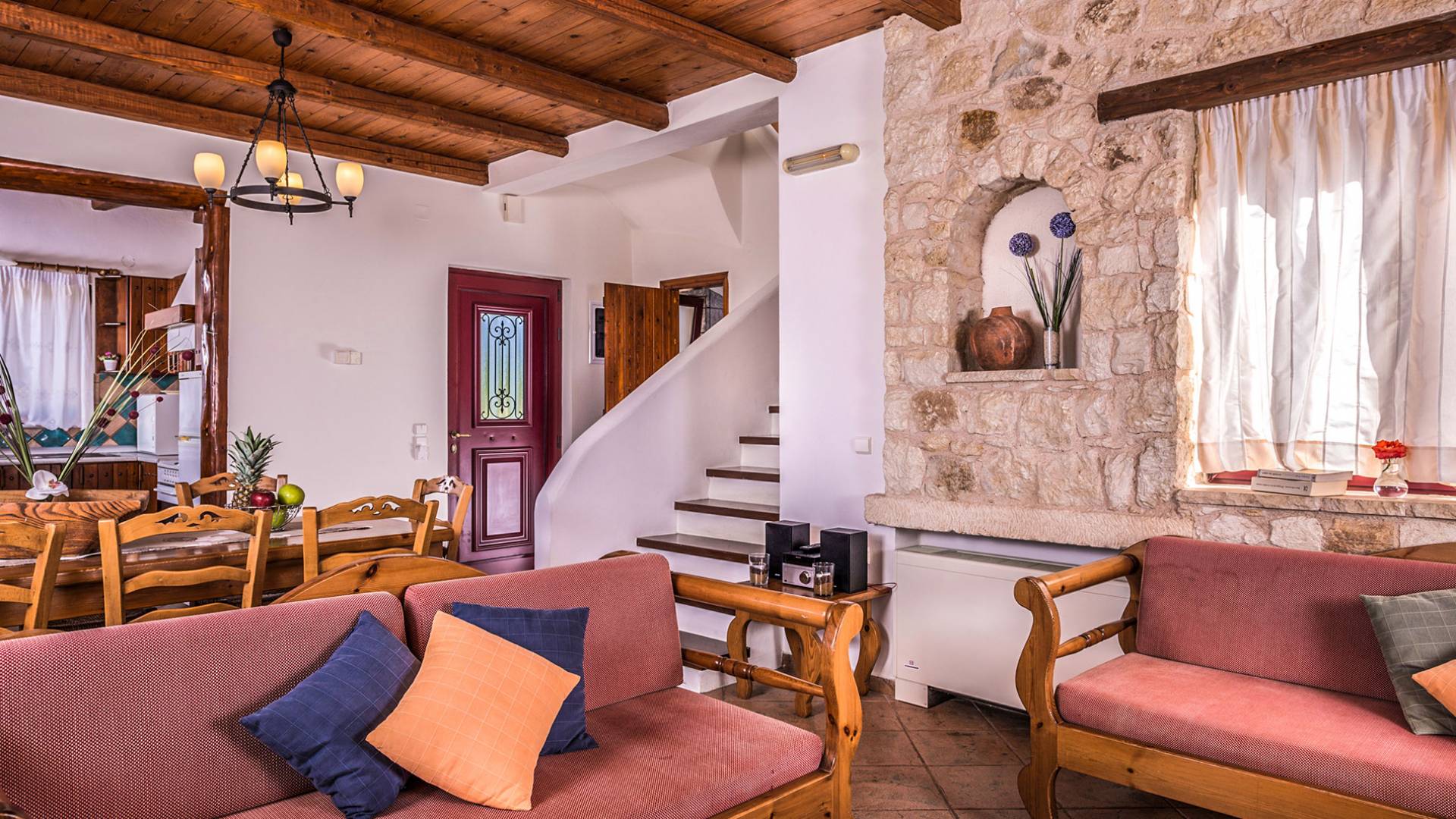 John A Villa Chania à Stalos, région d'Agia Marina, Chania Crète. John A Villa Chania est niché sur une colline à Pano Stalos à Chania Crète Grèce, avec une vue imprenable sur le golfe de La Canée. Il est construit selon des normes de qualité maximales et il est dominé par la forte présence d'éléments locaux et une vue magnifique.