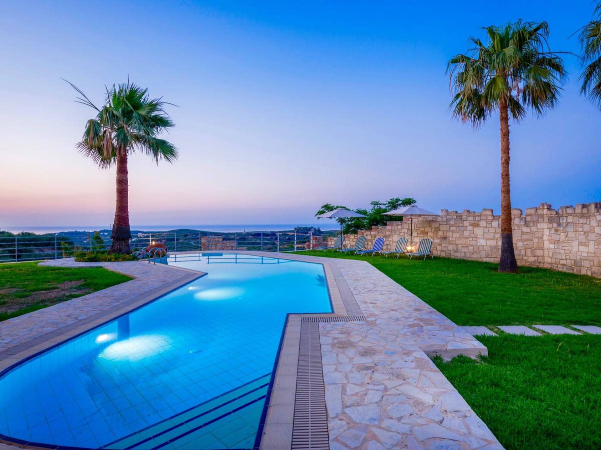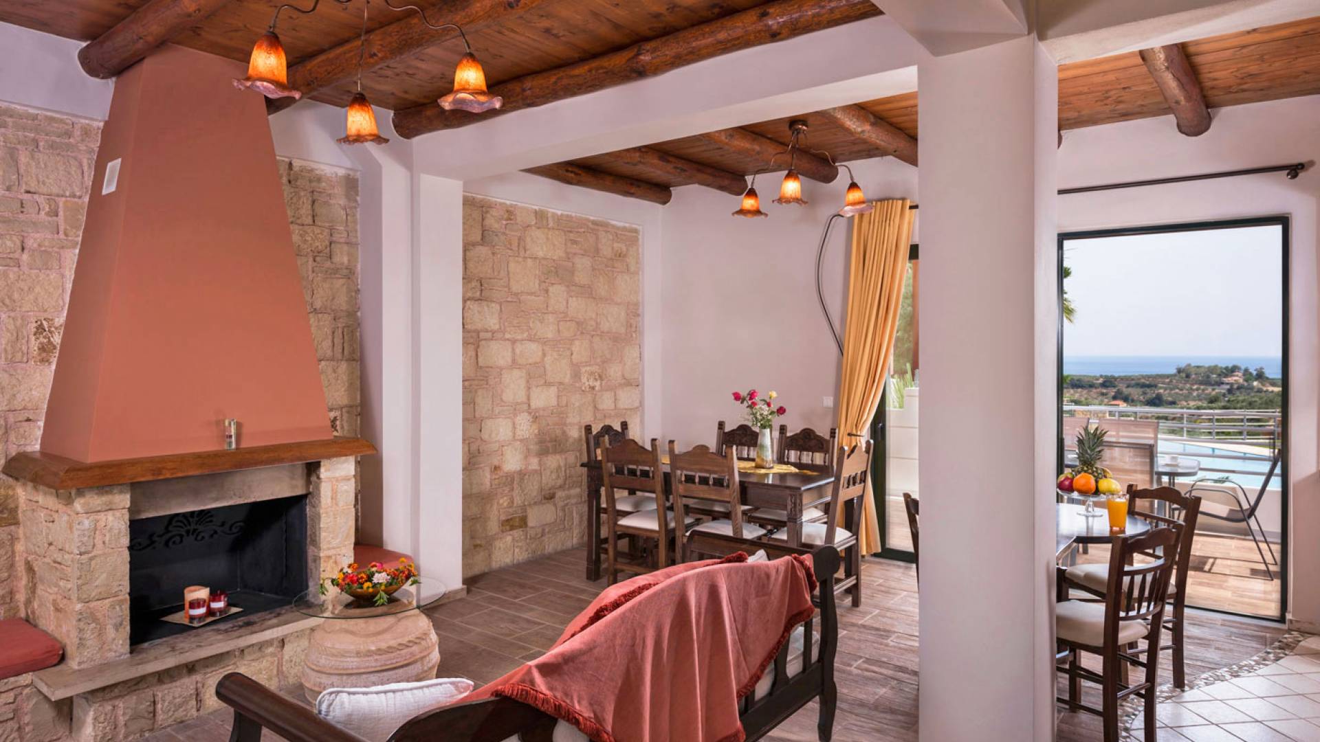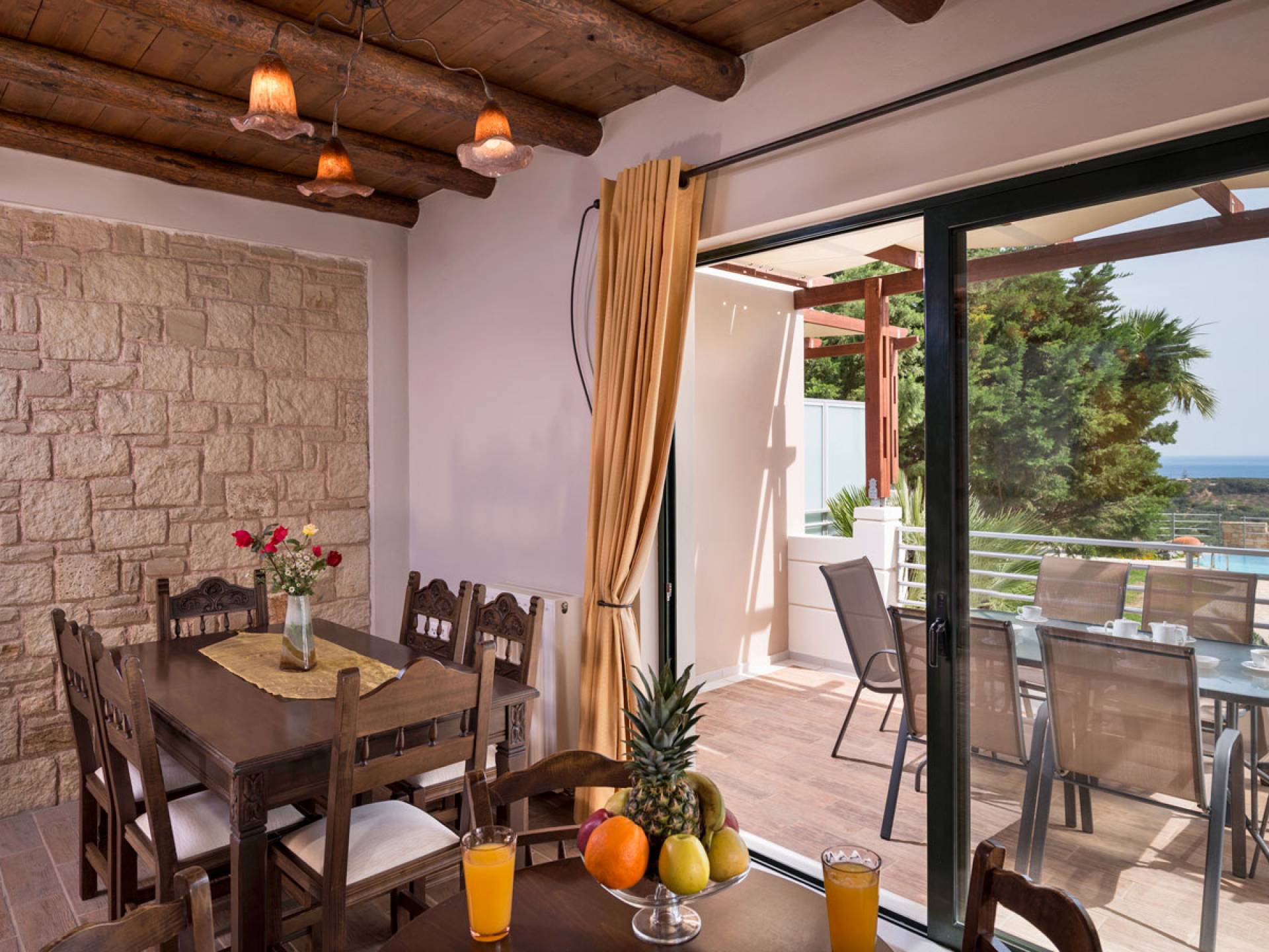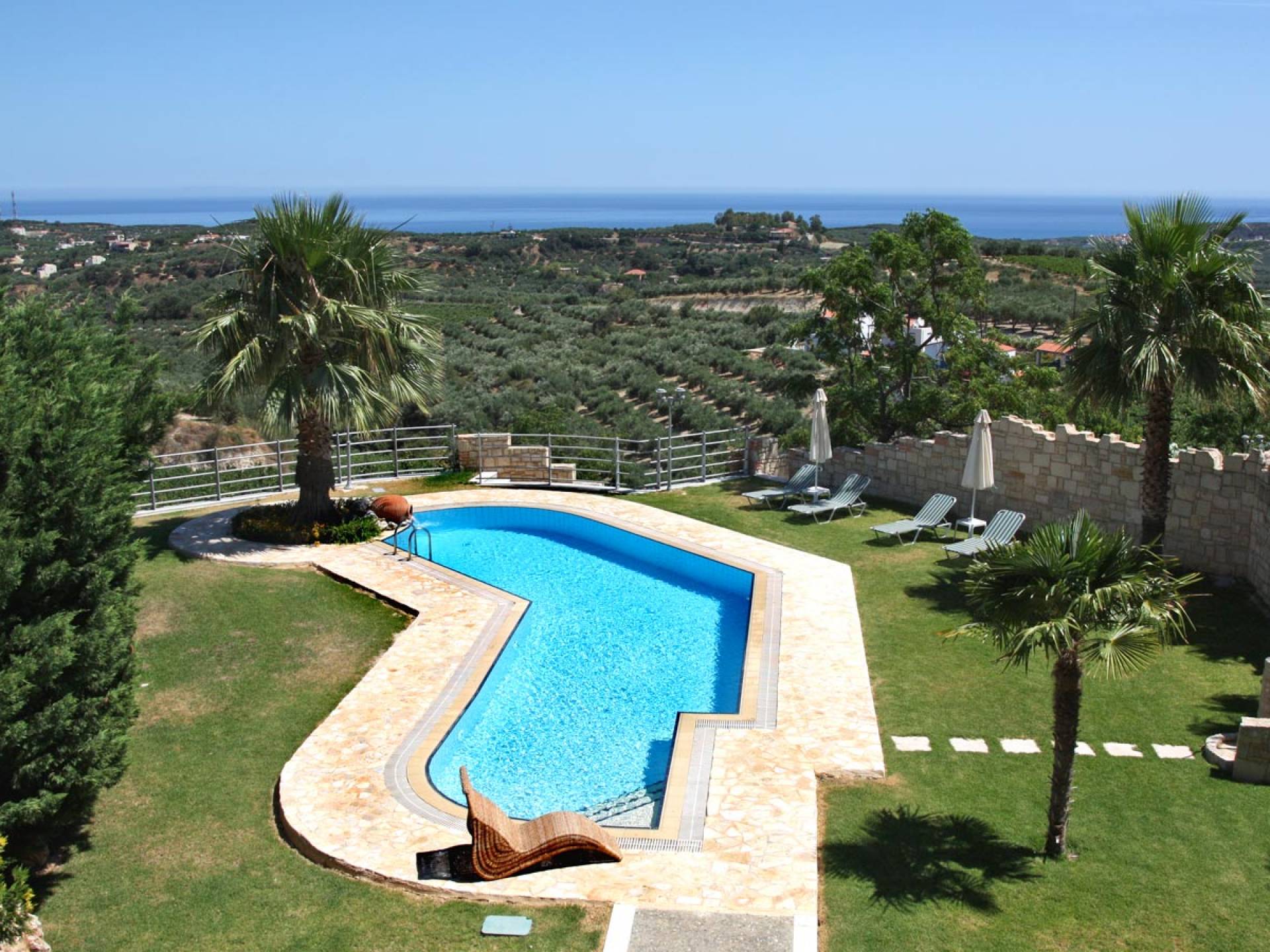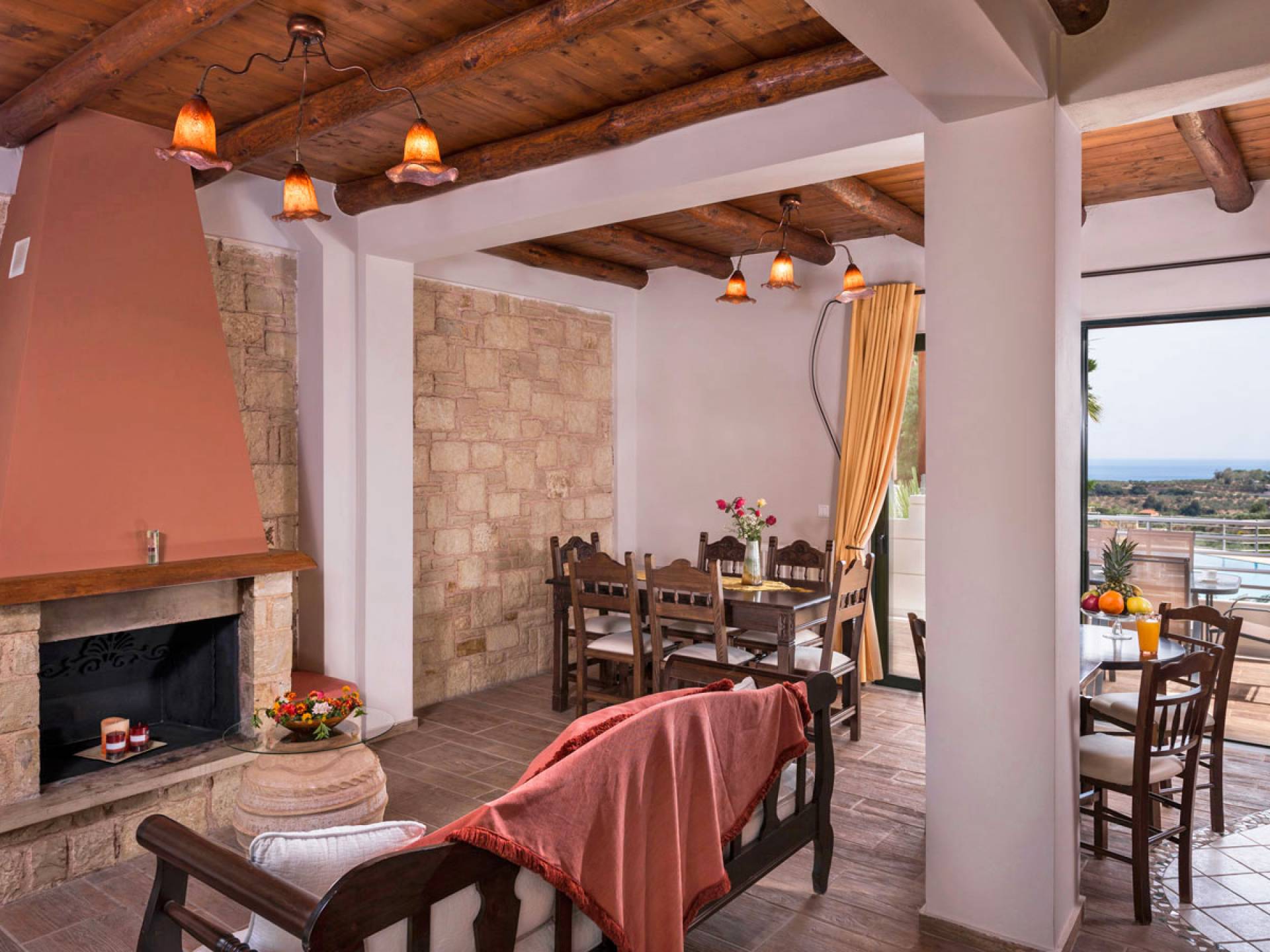 L'impressionnante salle de bain avec jacuzzi est bleue pour que votre esprit puisse se détendre en compagnie d'une musique lente et sous la douce lumière des bougies captivant vos sens. Le salon dispose d'une grande table pour six personnes afin de profiter de votre dîner dans un environnement unique. Il y a un canapé confortable et de grands coussins devant la cheminée pour que vous puissiez vous allonger en regardant la télévision ou en écoutant le lecteur CD. Il y a aussi une petite planche à côté de la cuisine où vous pourrez prendre votre café tout en admirant la vue. Sur votre véranda, le salon en bambou vous permettra de vous détendre et de profiter de votre sieste. Posez votre serviette sur l'un des transats au bord de la piscine et détendez-vous sous le chaud soleil crétois. Nous nous occupons du reste.