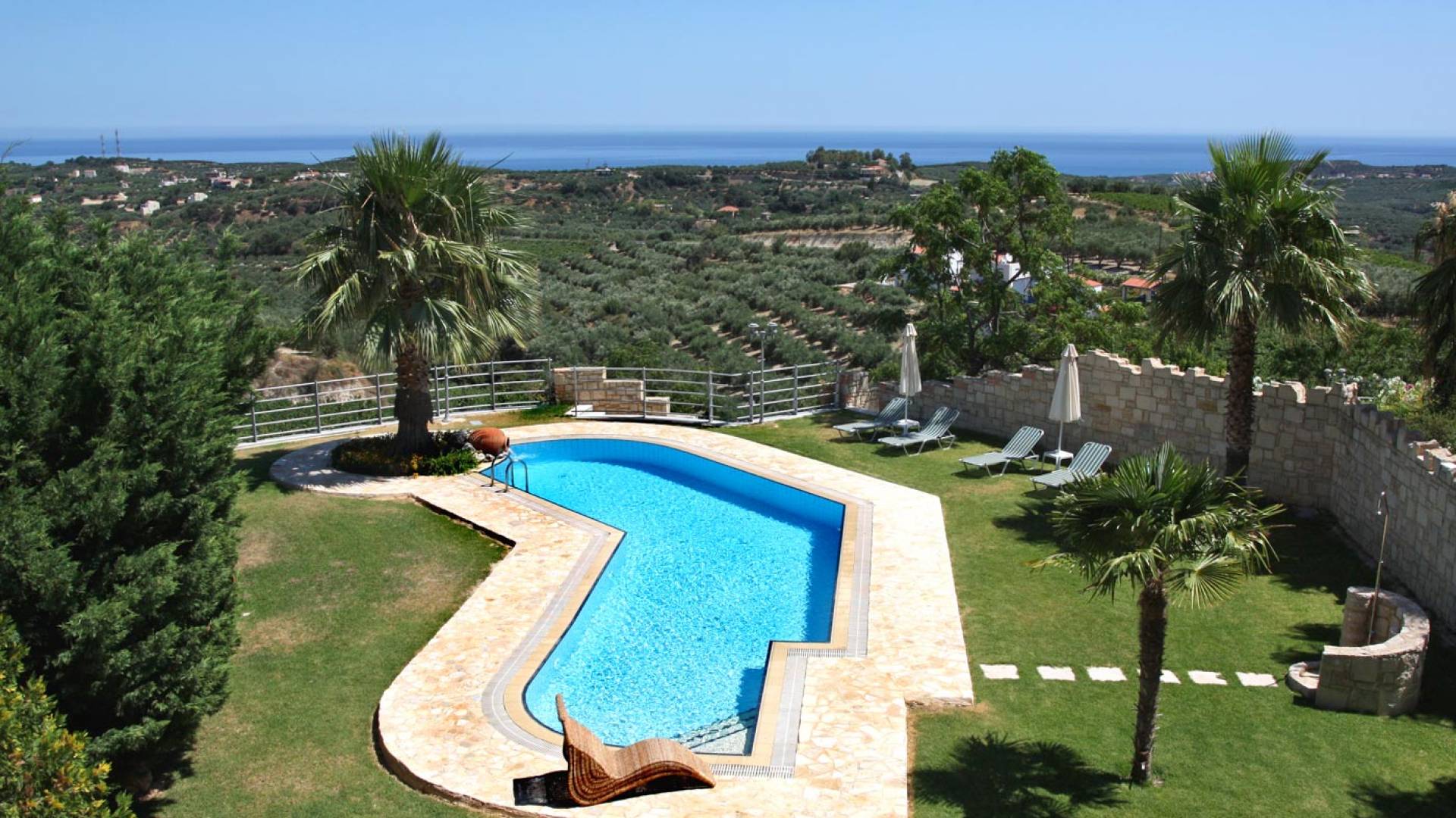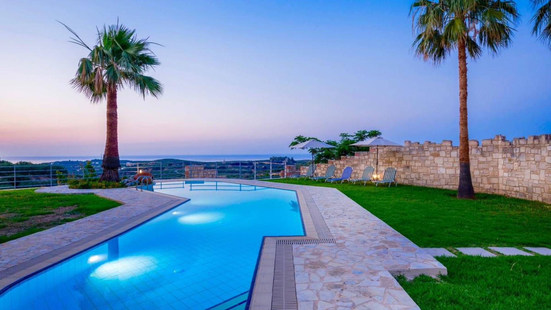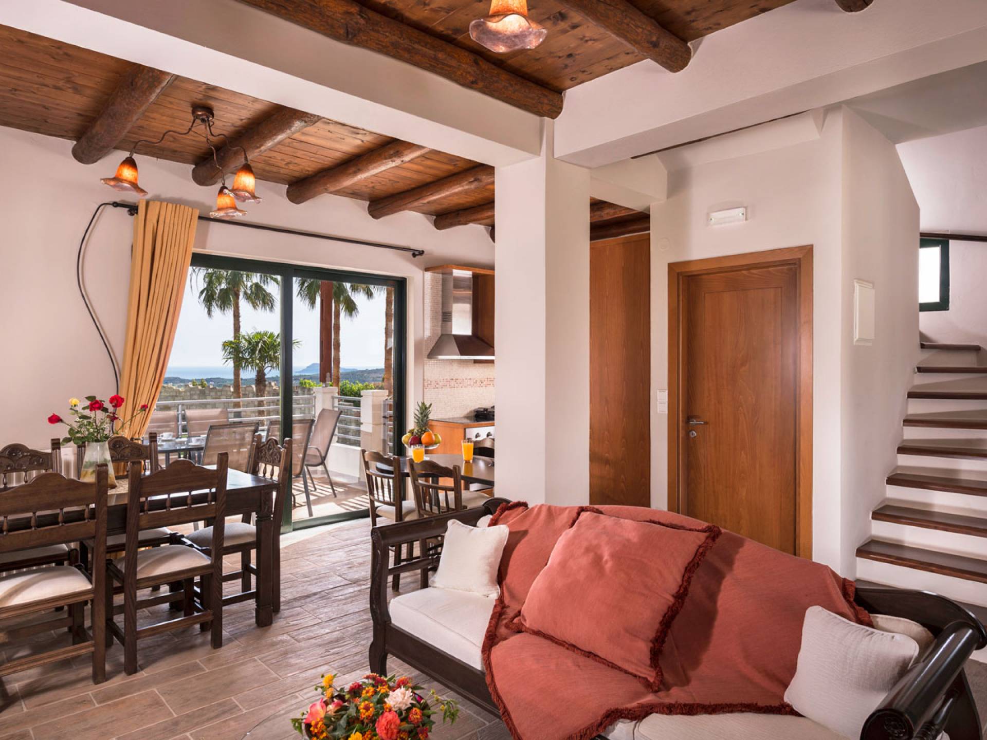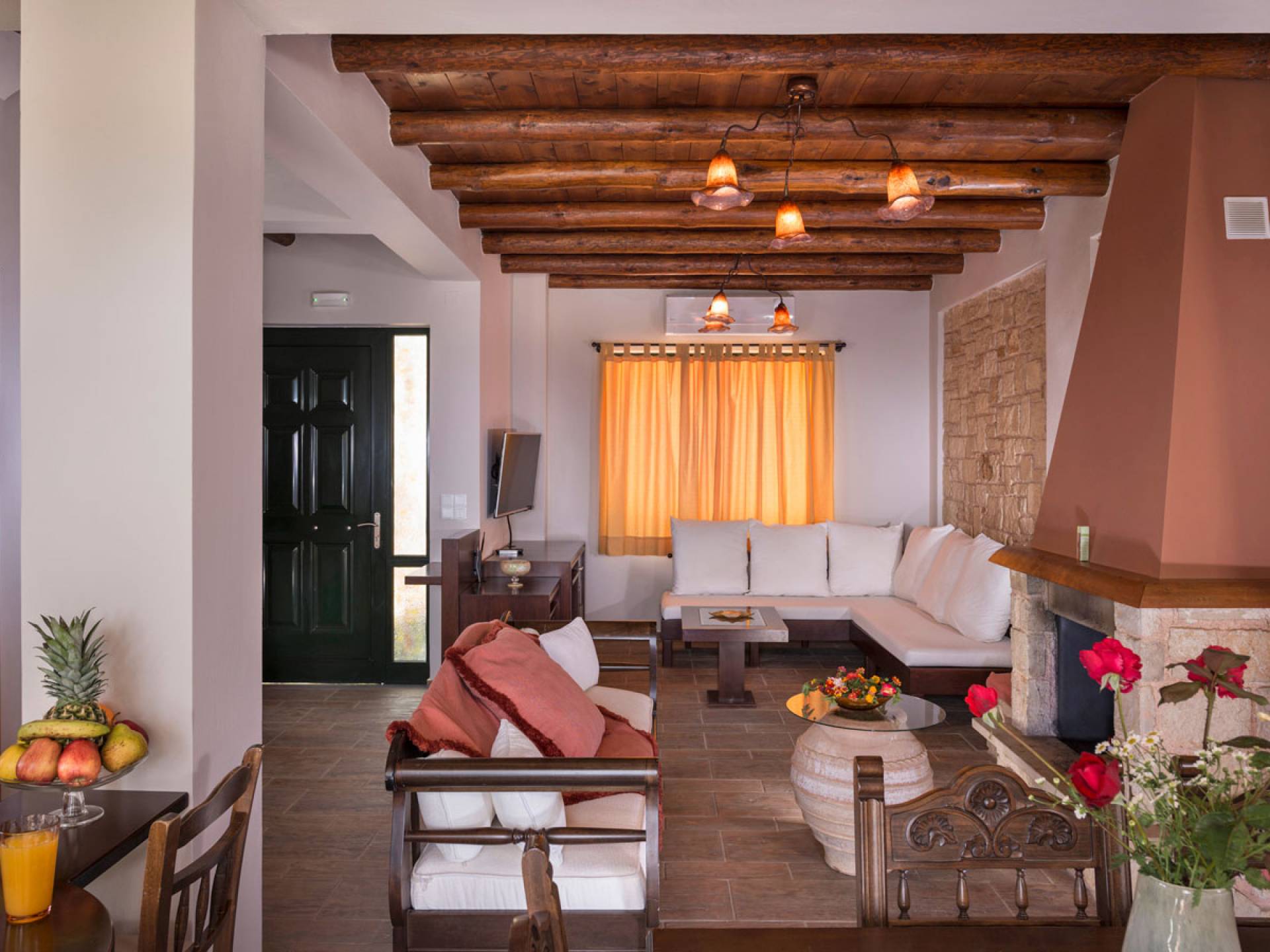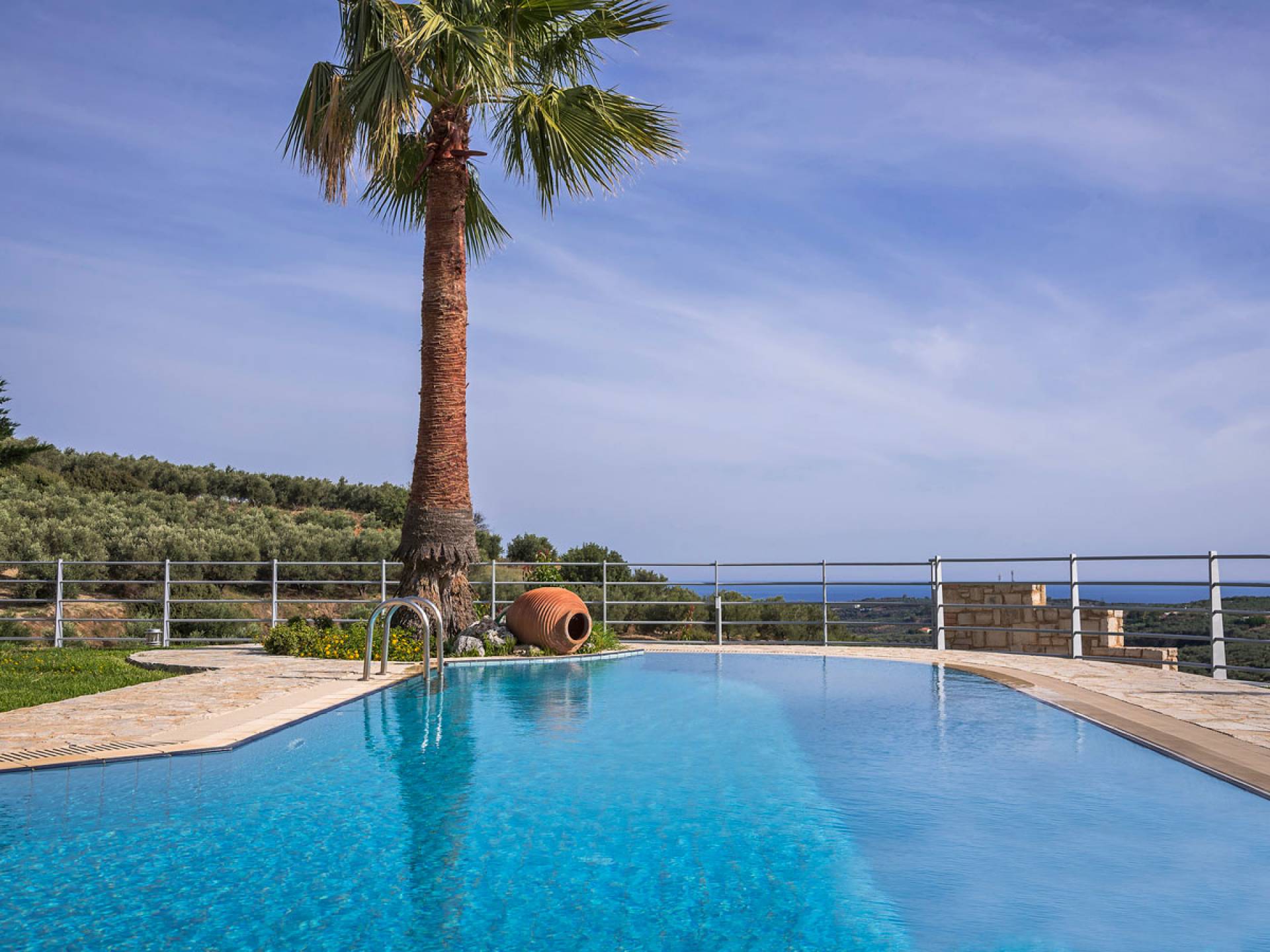 L'impressionnante salle de bain avec jacuzzi est bleue pour que votre esprit puisse se détendre en compagnie d'une musique lente et sous la douce lumière des bougies captivant vos sens. Le salon dispose d'une grande table pour six personnes afin de profiter de votre dîner dans un environnement unique. Il y a un canapé confortable et de grands coussins devant la cheminée pour que vous puissiez vous allonger en regardant la télévision ou en écoutant le lecteur CD. Il y a aussi une petite planche à côté de la cuisine où vous pourrez prendre votre café tout en admirant la vue. Sur votre véranda, le salon en bambou vous permettra de vous détendre et de profiter de votre sieste. Posez votre serviette sur l'un des transats au bord de la piscine et détendez-vous sous le chaud soleil crétois. Nous nous occupons du reste.