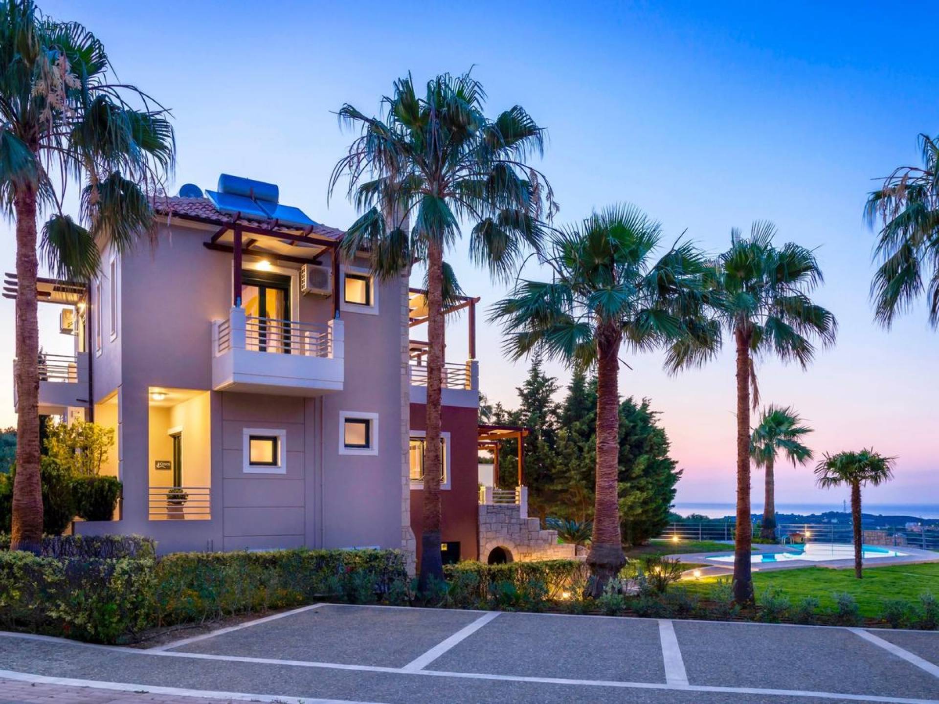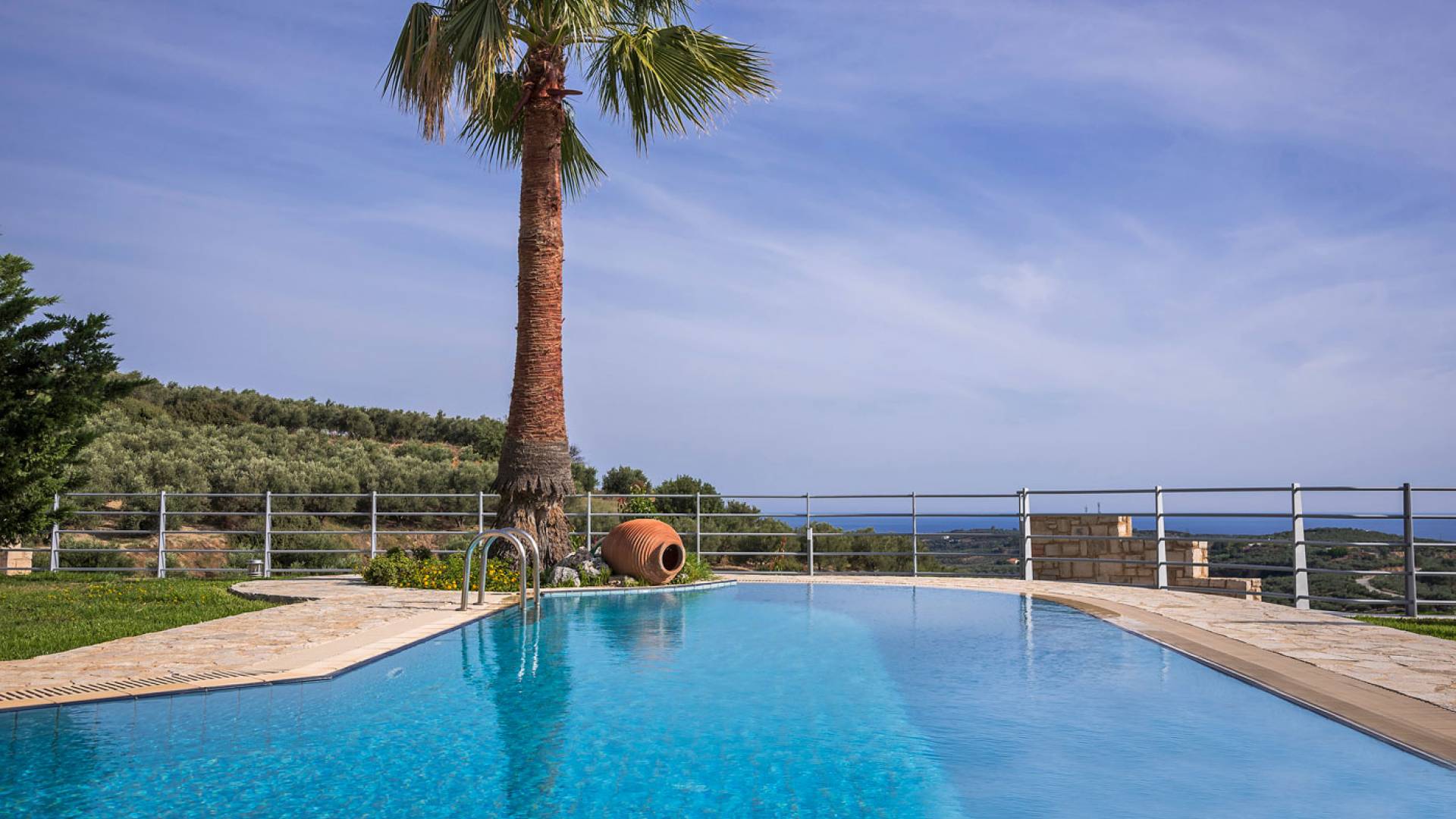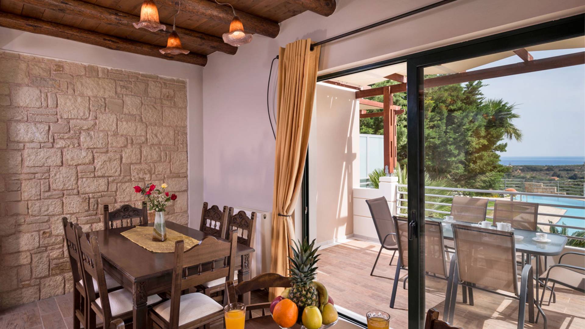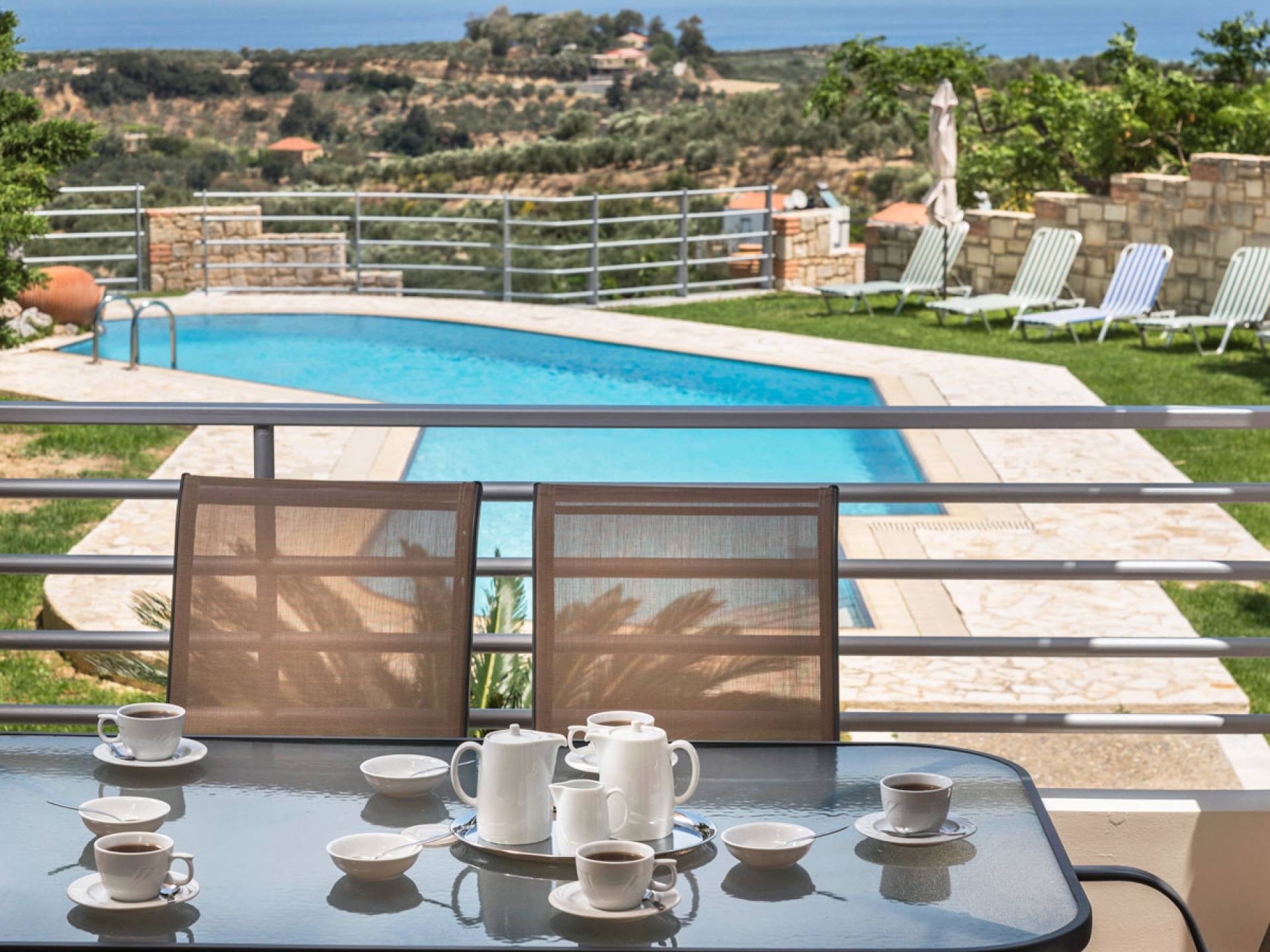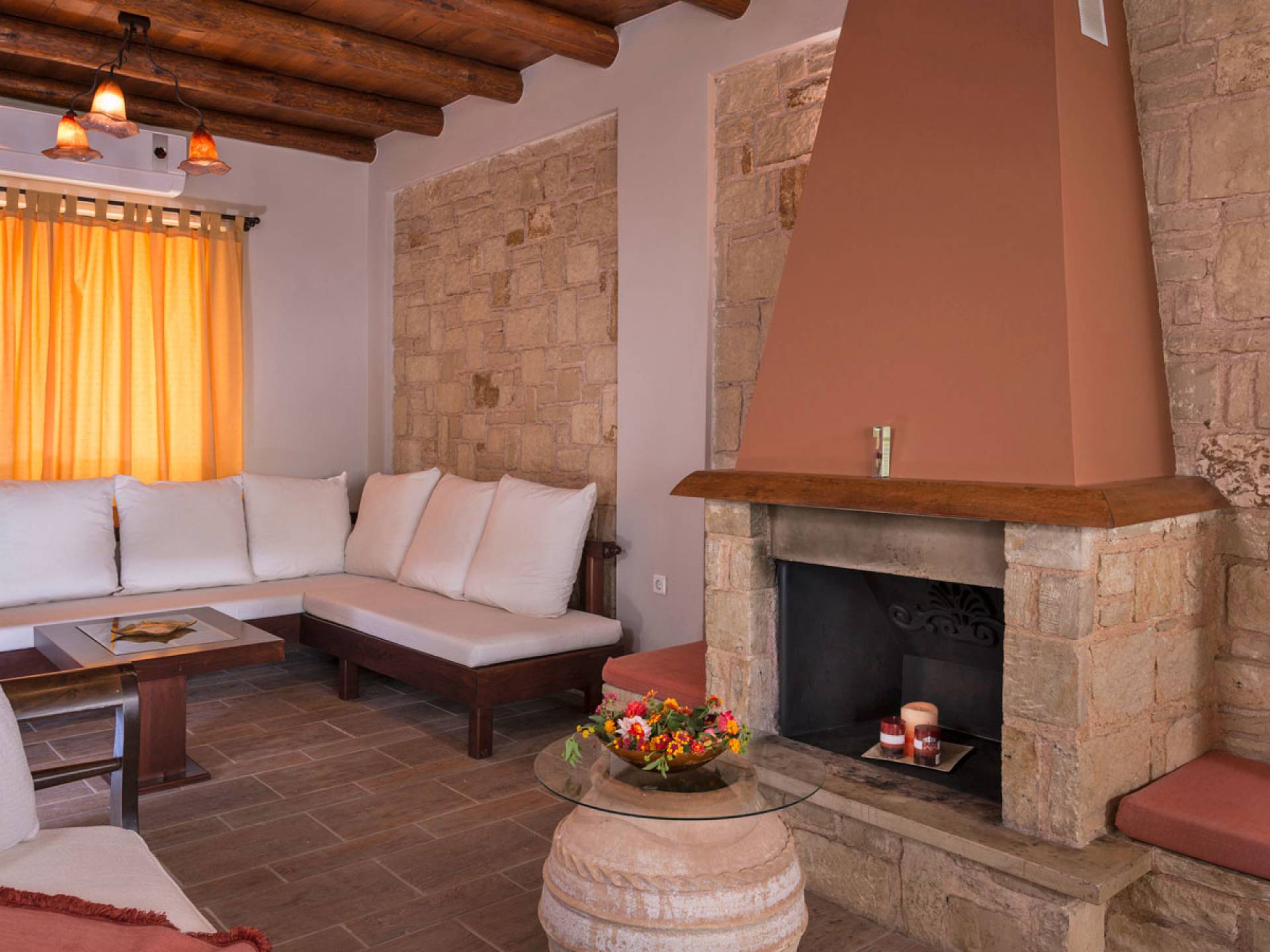 L'impressionnante salle de bain avec jacuzzi est bleue pour que votre esprit puisse se détendre en compagnie d'une musique lente et sous la douce lumière des bougies captivant vos sens. Le salon dispose d'une grande table pour six personnes afin de profiter de votre dîner dans un environnement unique. Il y a un canapé confortable et de grands coussins devant la cheminée pour que vous puissiez vous allonger en regardant la télévision ou en écoutant le lecteur CD. Il y a aussi une petite planche à côté de la cuisine où vous pourrez prendre votre café tout en admirant la vue. Sur votre véranda, le salon en bambou vous permettra de vous détendre et de profiter de votre sieste. Posez votre serviette sur l'un des transats au bord de la piscine et détendez-vous sous le chaud soleil crétois. Nous nous occupons du reste.