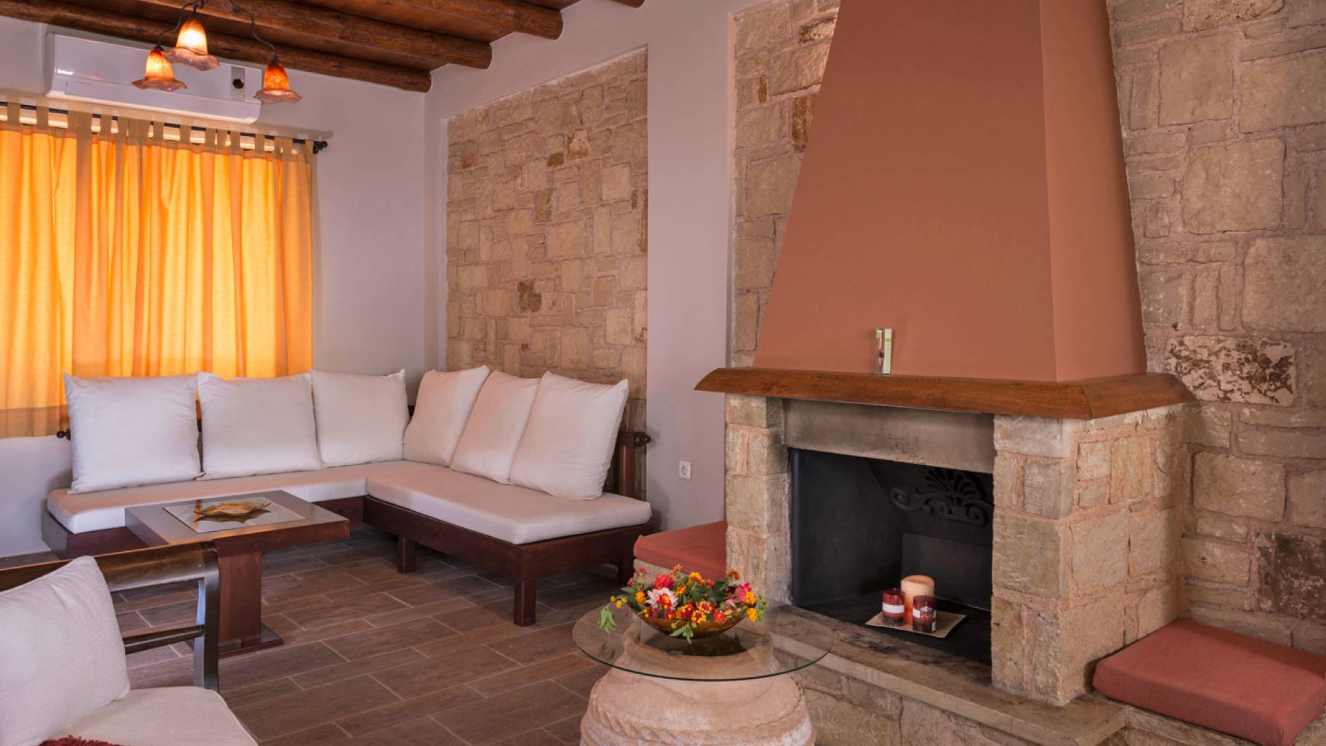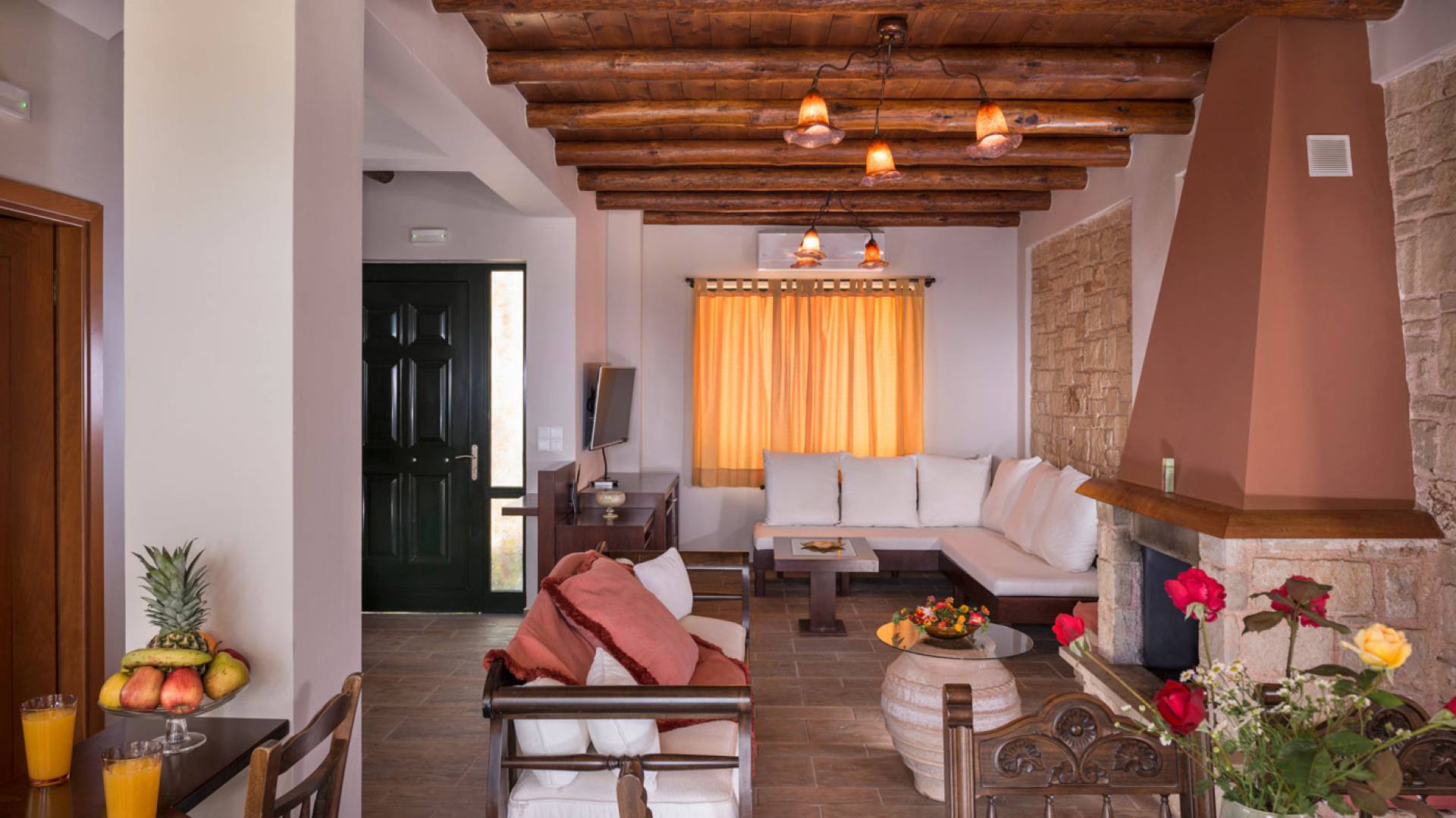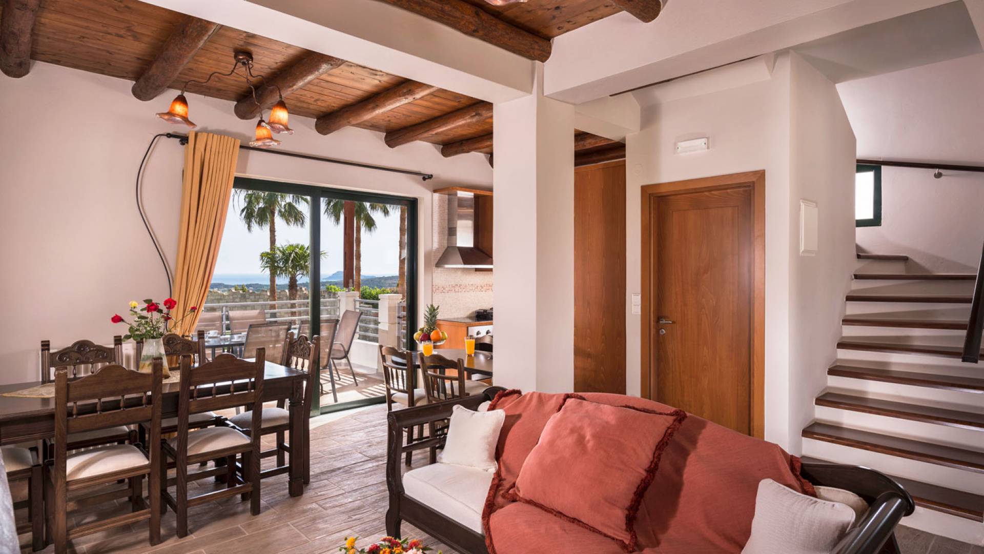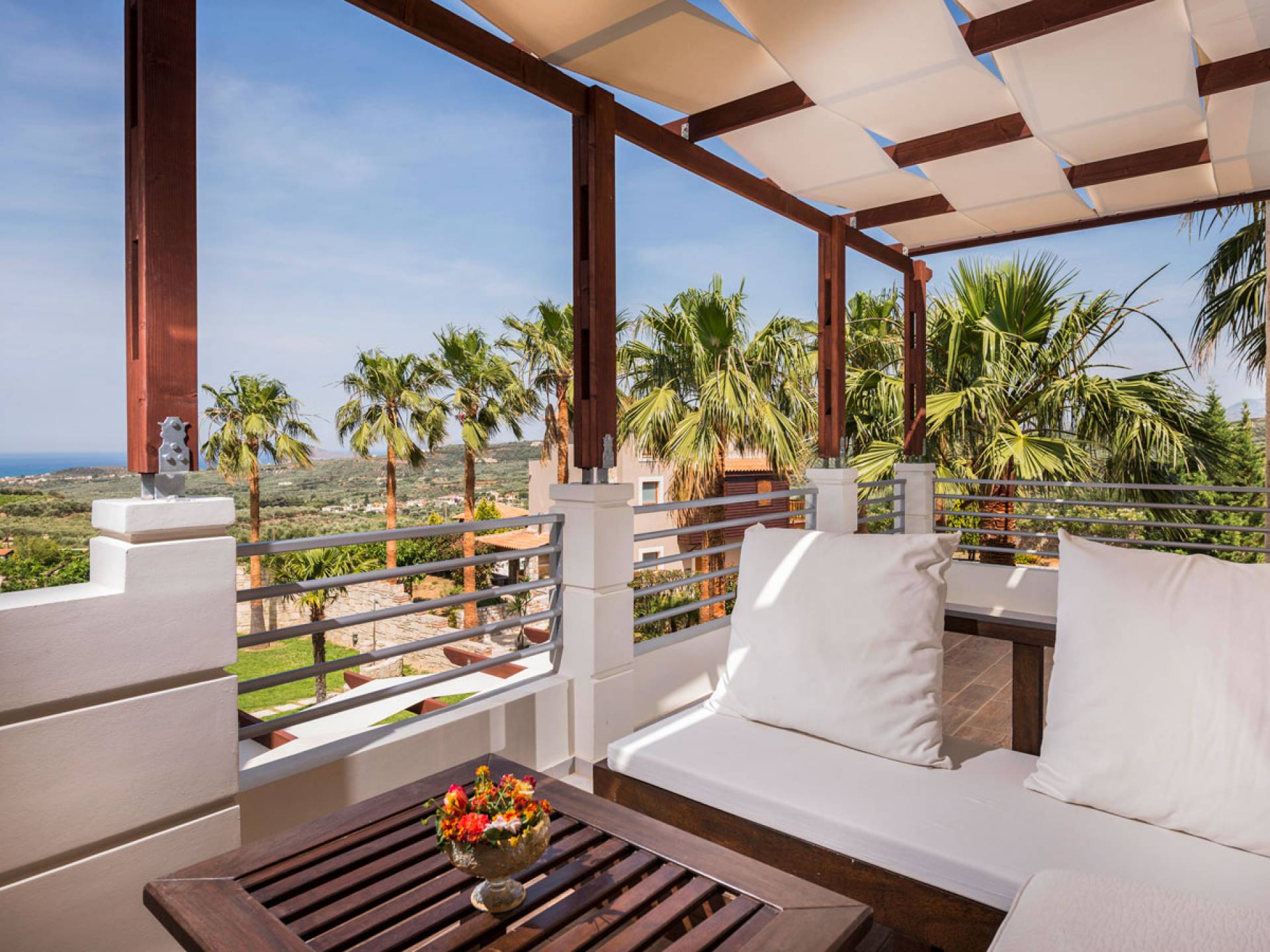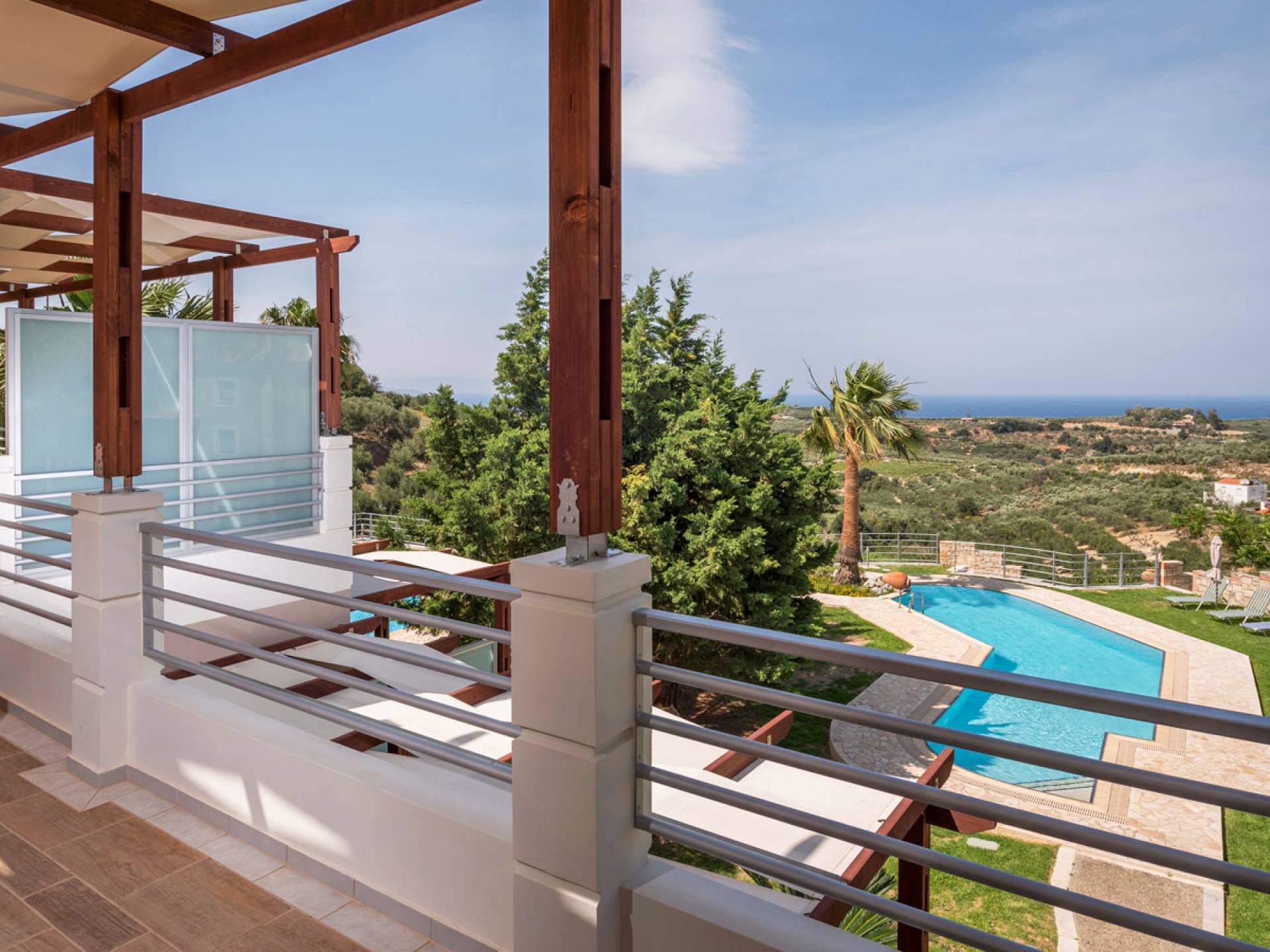 L'impressionnante salle de bain avec jacuzzi est bleue pour que votre esprit puisse se détendre en compagnie d'une musique lente et sous la douce lumière des bougies captivant vos sens. Le salon dispose d'une grande table pour six personnes afin de profiter de votre dîner dans un environnement unique. Il y a un canapé confortable et de grands coussins devant la cheminée pour que vous puissiez vous allonger en regardant la télévision ou en écoutant le lecteur CD. Il y a aussi une petite planche à côté de la cuisine où vous pourrez prendre votre café tout en admirant la vue. Sur votre véranda, le salon en bambou vous permettra de vous détendre et de profiter de votre sieste. Posez votre serviette sur l'un des transats au bord de la piscine et détendez-vous sous le chaud soleil crétois. Nous nous occupons du reste.