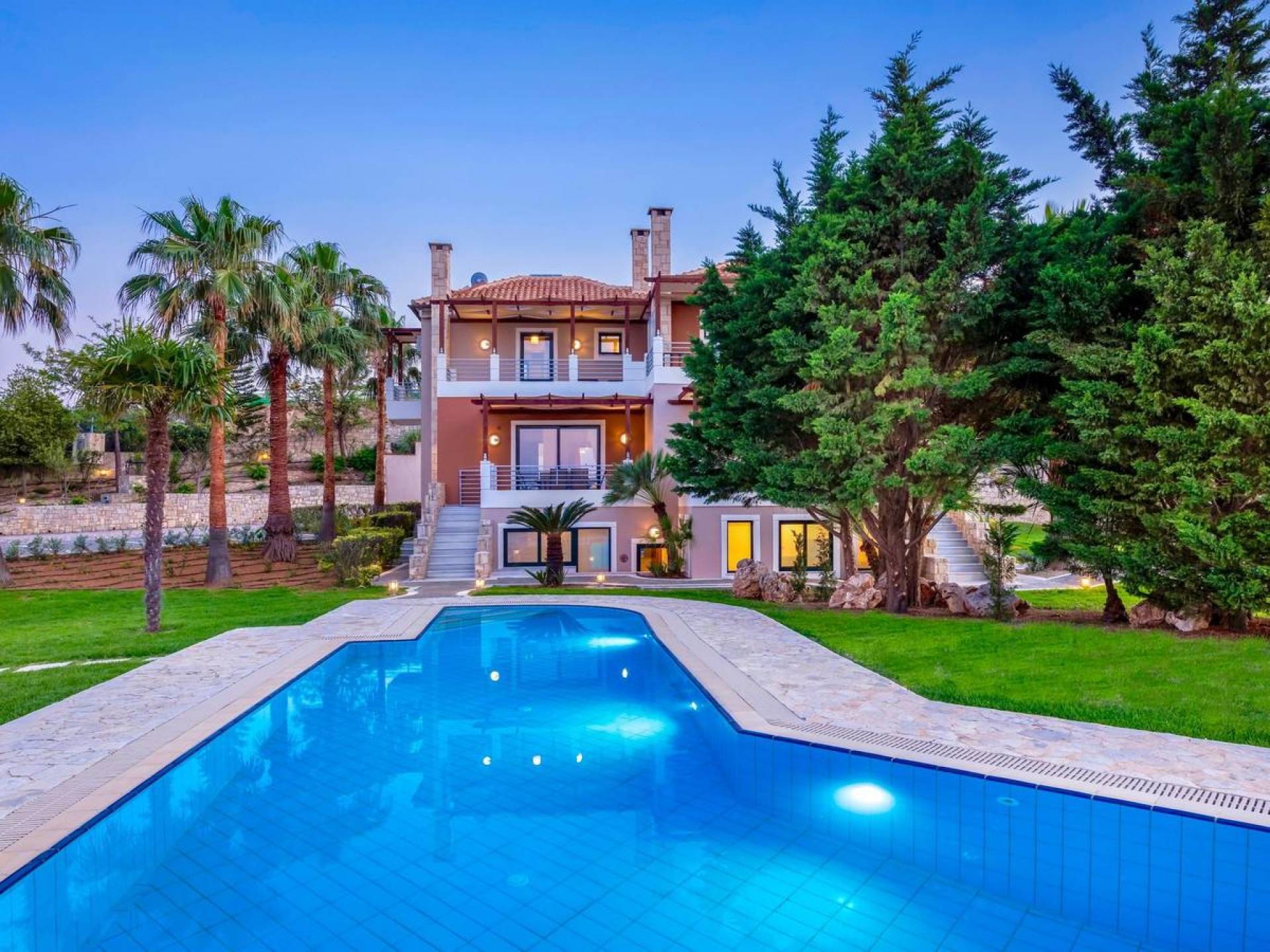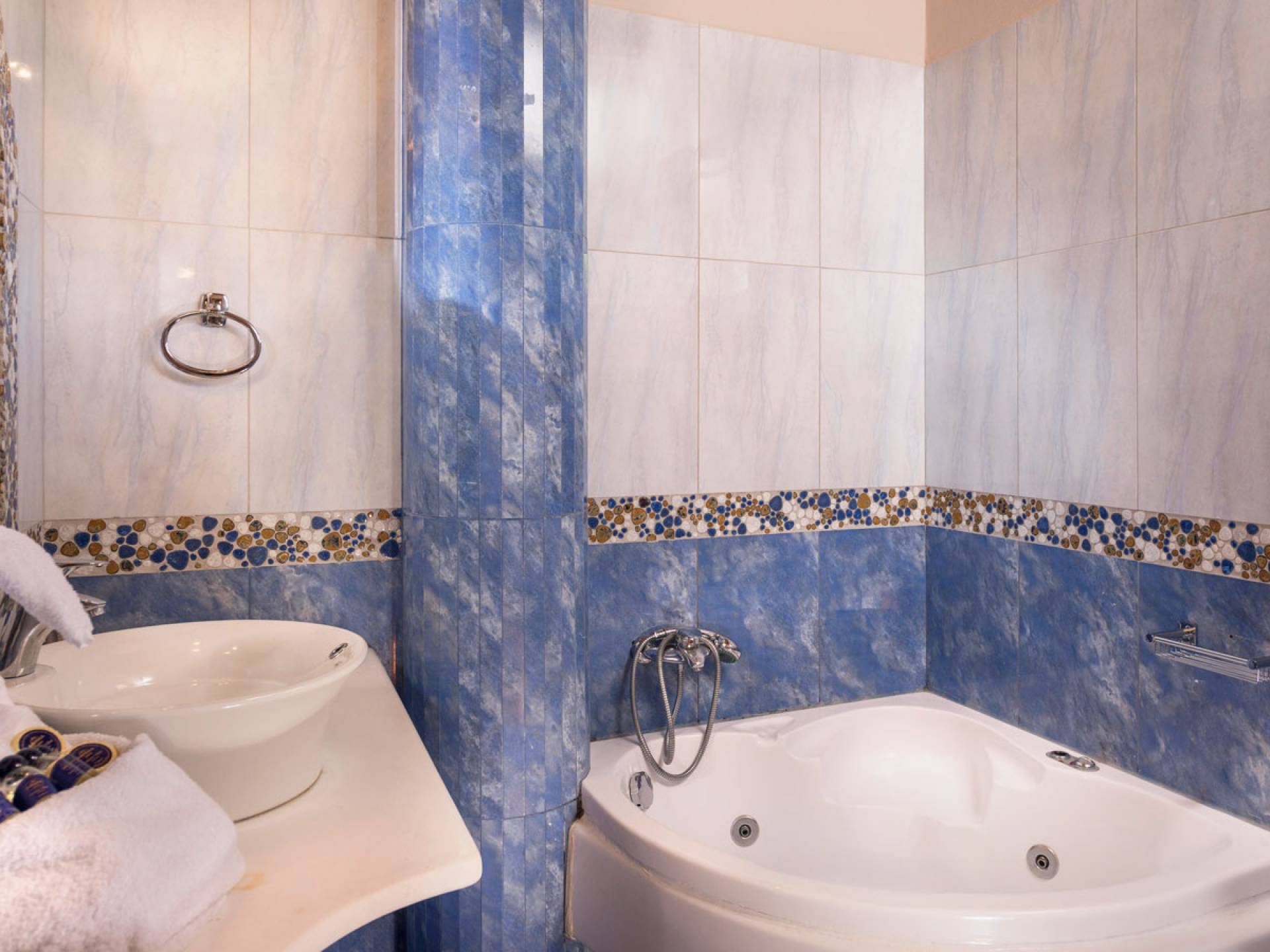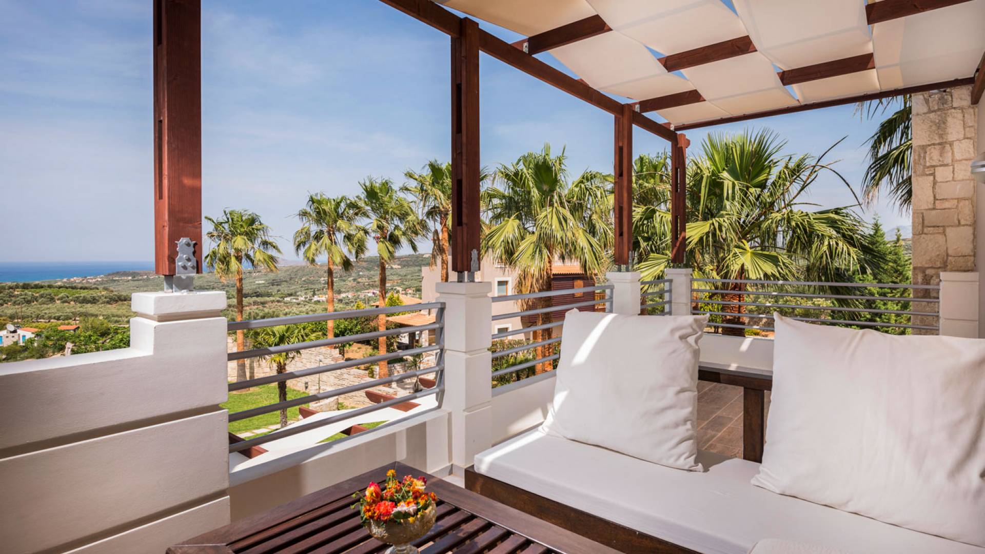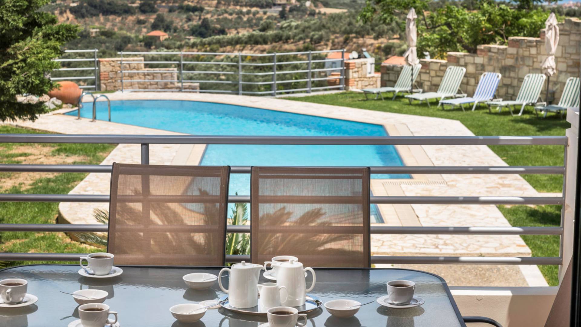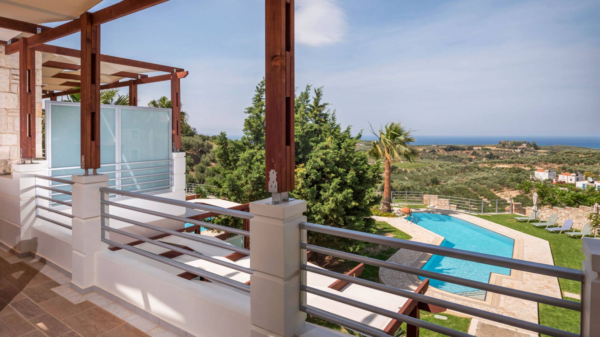 L'impressionnante salle de bain avec jacuzzi est bleue pour que votre esprit puisse se détendre en compagnie d'une musique lente et sous la douce lumière des bougies captivant vos sens. Le salon dispose d'une grande table pour six personnes afin de profiter de votre dîner dans un environnement unique. Il y a un canapé confortable et de grands coussins devant la cheminée pour que vous puissiez vous allonger en regardant la télévision ou en écoutant le lecteur CD. Il y a aussi une petite planche à côté de la cuisine où vous pourrez prendre votre café tout en admirant la vue. Sur votre véranda, le salon en bambou vous permettra de vous détendre et de profiter de votre sieste. Posez votre serviette sur l'un des transats au bord de la piscine et détendez-vous sous le chaud soleil crétois. Nous nous occupons du reste.