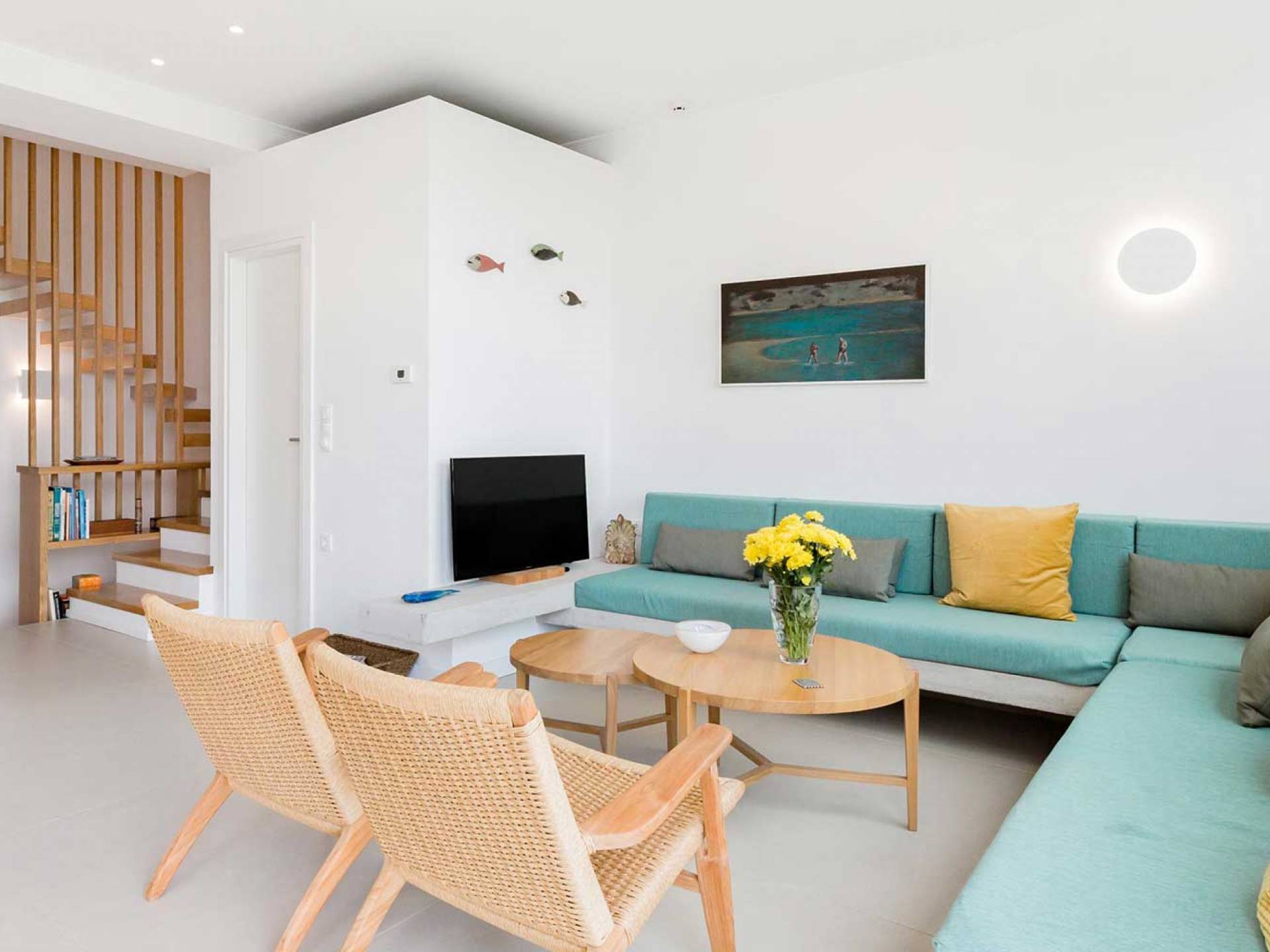 Au rez-de-chaussée, il y a un salon et une salle à manger, une cuisine (entièrement équipée avec tous les appareils électriques modernes), et un WC. Au premier étage, il y a deux chambres et une salle de bain. Chaque chambre dispose de deux lits simples qui, selon les demandes, se transforment en lits doubles. Les chambres ont un balcon avec une superbe vue sur la mer et l'Ag. L'île de Théodori. Au dernier étage, il y a aussi deux chambres et une salle de bain. La grande chambre a deux lits simples qui sont convertis en lits doubles et un lit simple. L'autre a un lit simple et un canapé-lit.