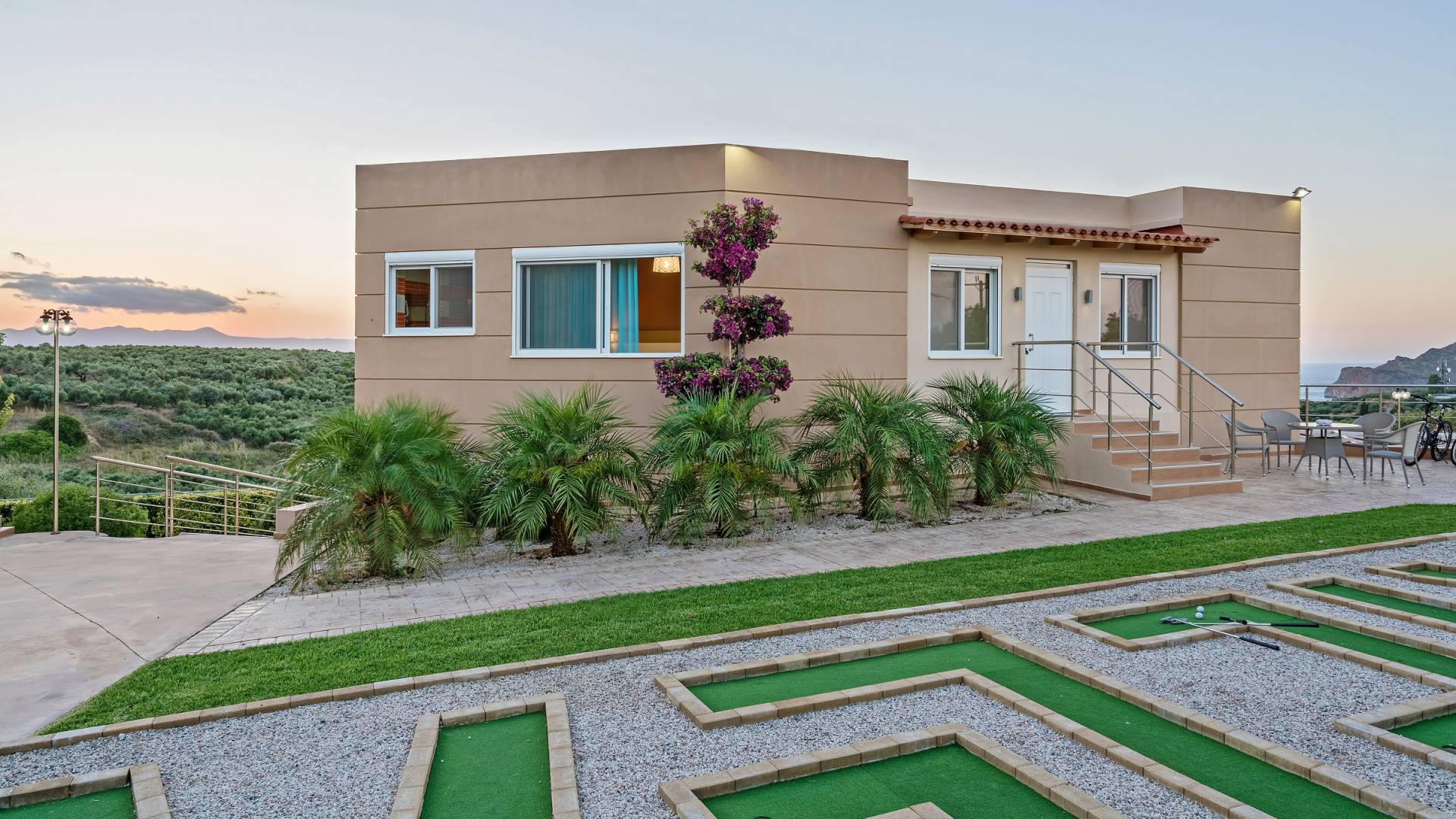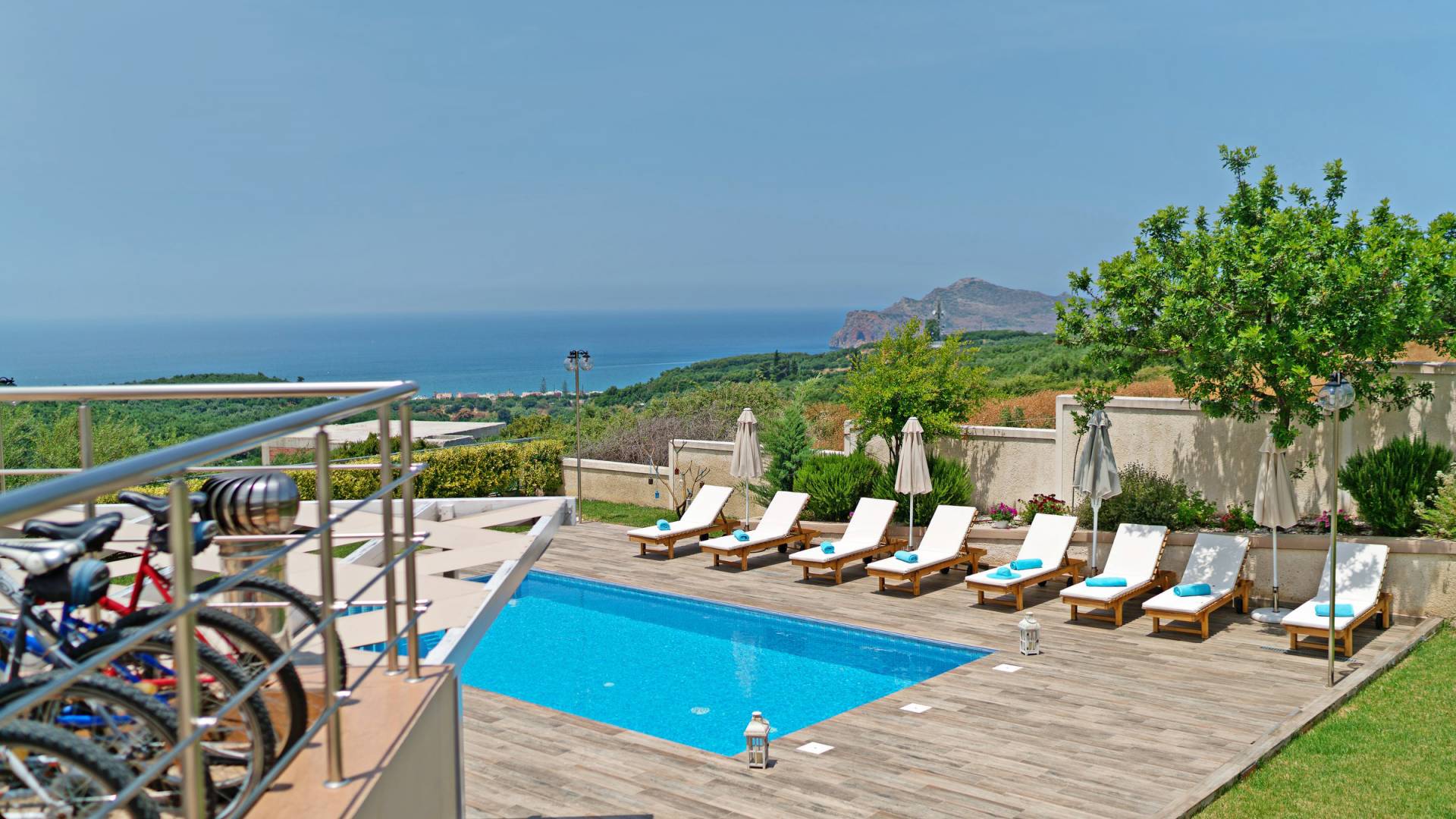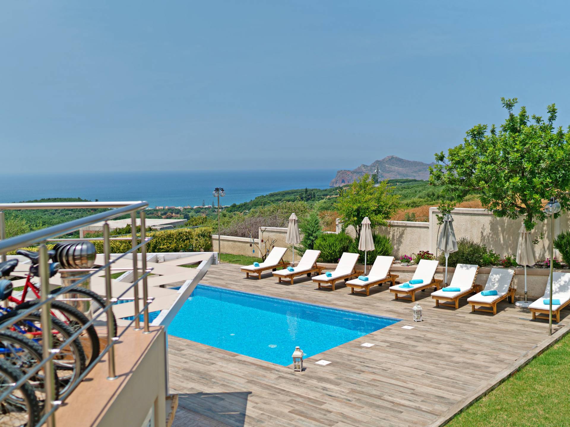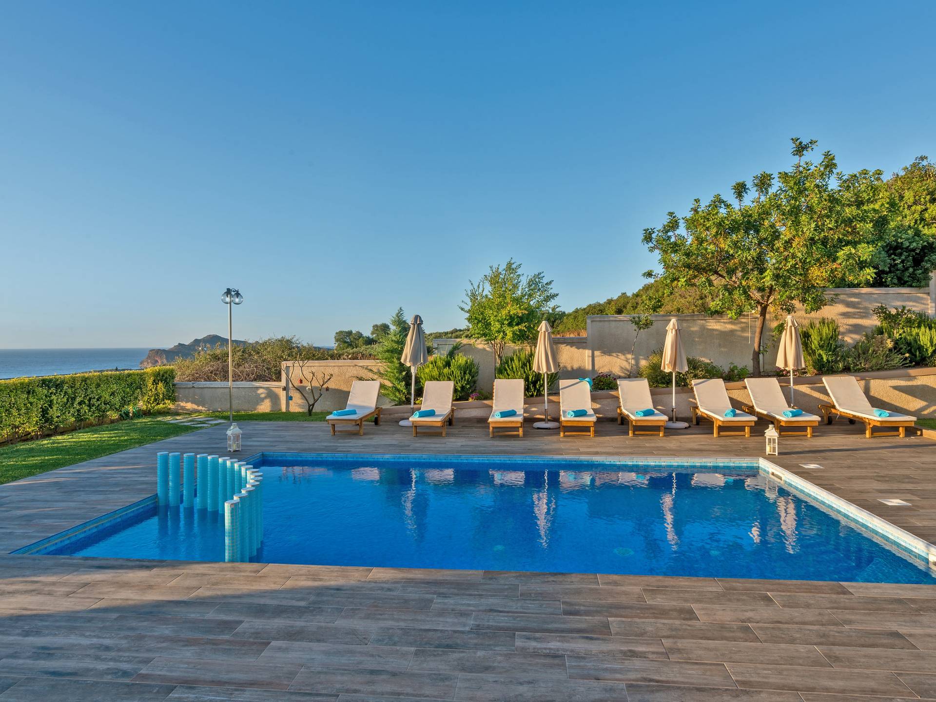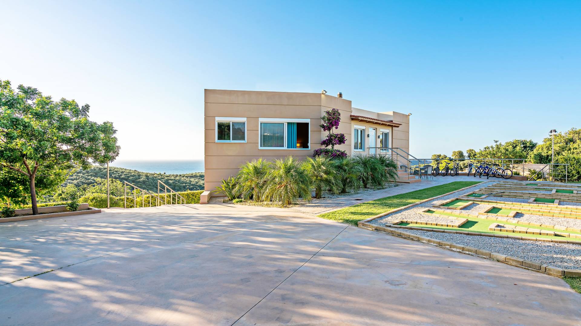 Chaque chambre dispose d'une salle de douche - WC. Toutes les chambres sont climatisées. Les abords de l'endroit où est construite la villa constituent un parking, un mini-golf, un barbecue et des pergolas en bois, un jardin fleuri et une pelouse. Il y a aussi une belle piscine de 40 m² avec des transats et des parasols en bois.