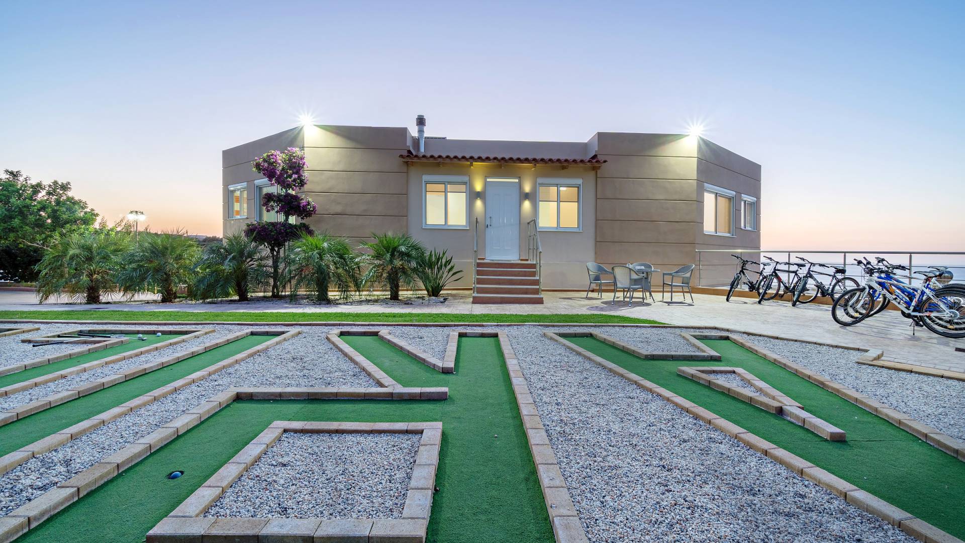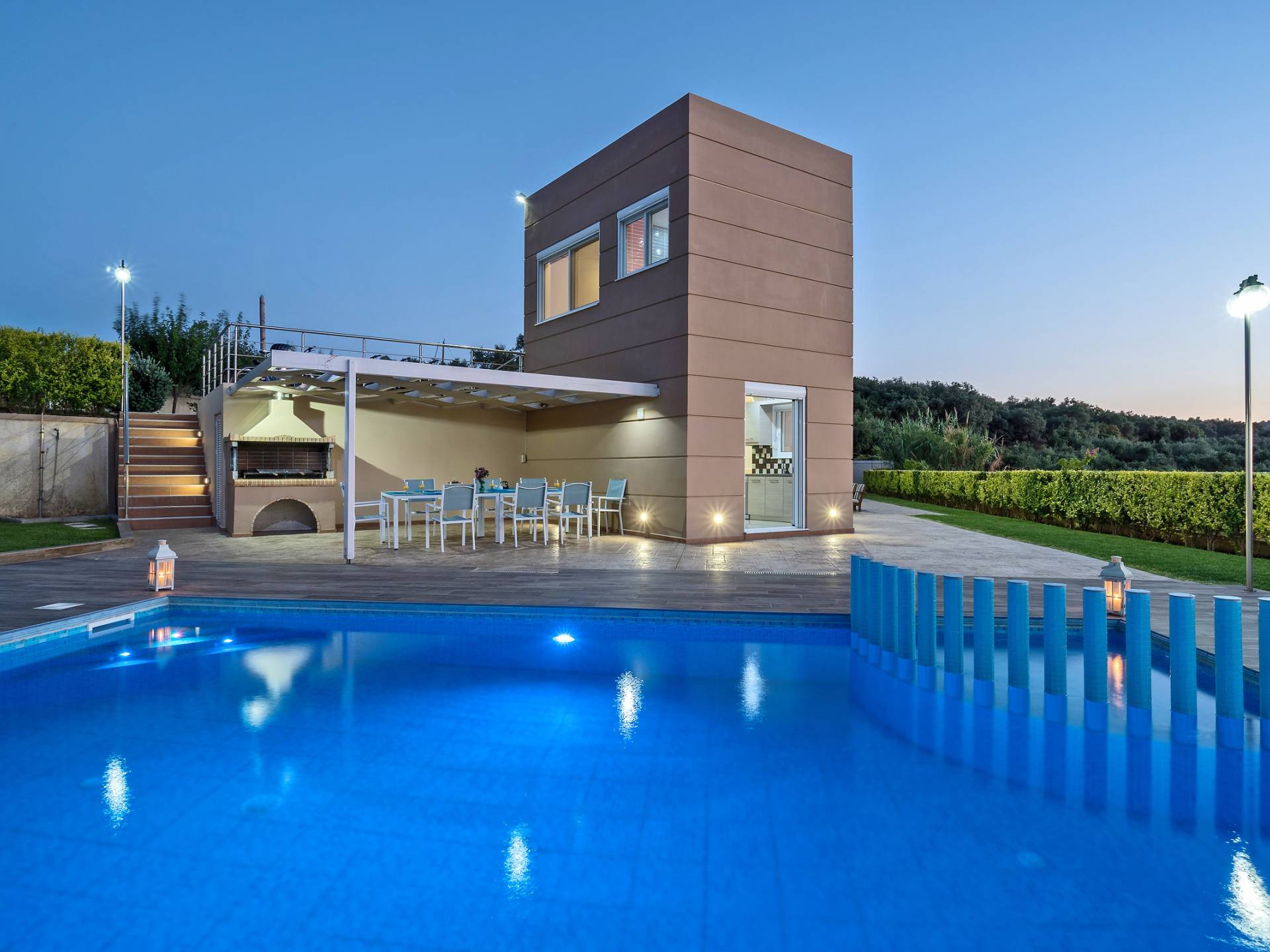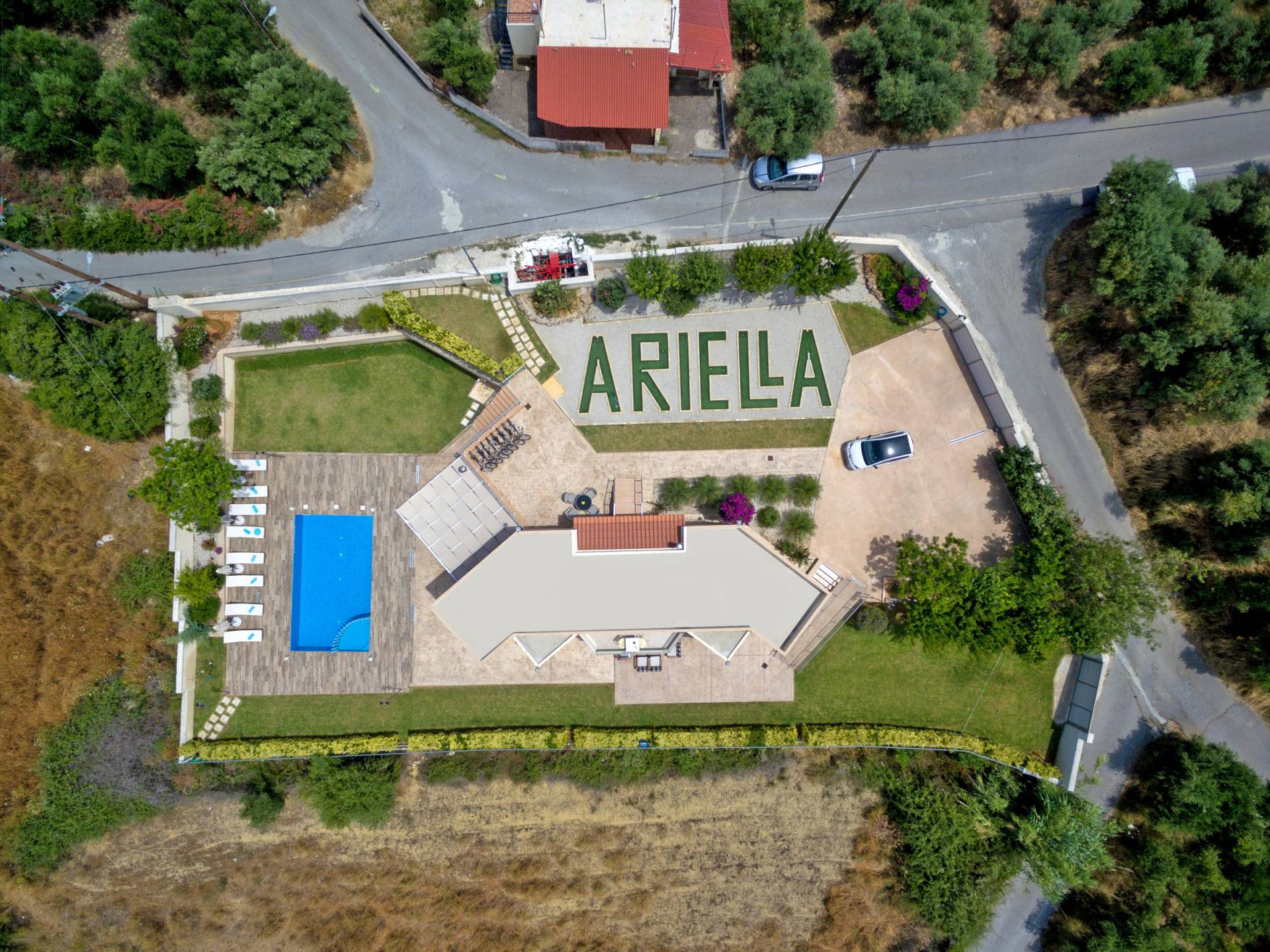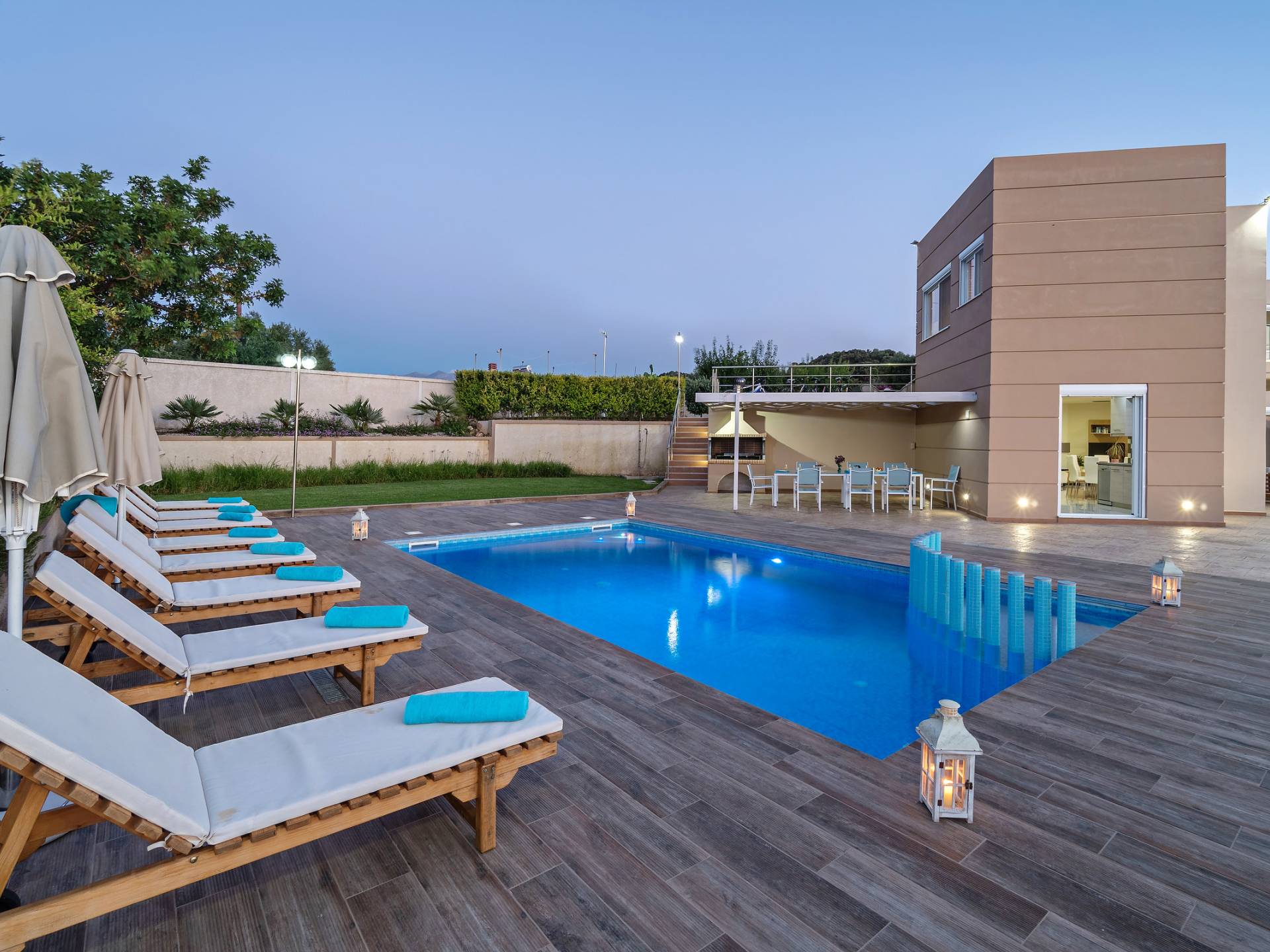 Chaque chambre dispose d'une salle de douche - WC. Toutes les chambres sont climatisées. Les abords de l'endroit où est construite la villa constituent un parking, un mini-golf, un barbecue et des pergolas en bois, un jardin fleuri et une pelouse. Il y a aussi une belle piscine de 40 m² avec des transats et des parasols en bois.