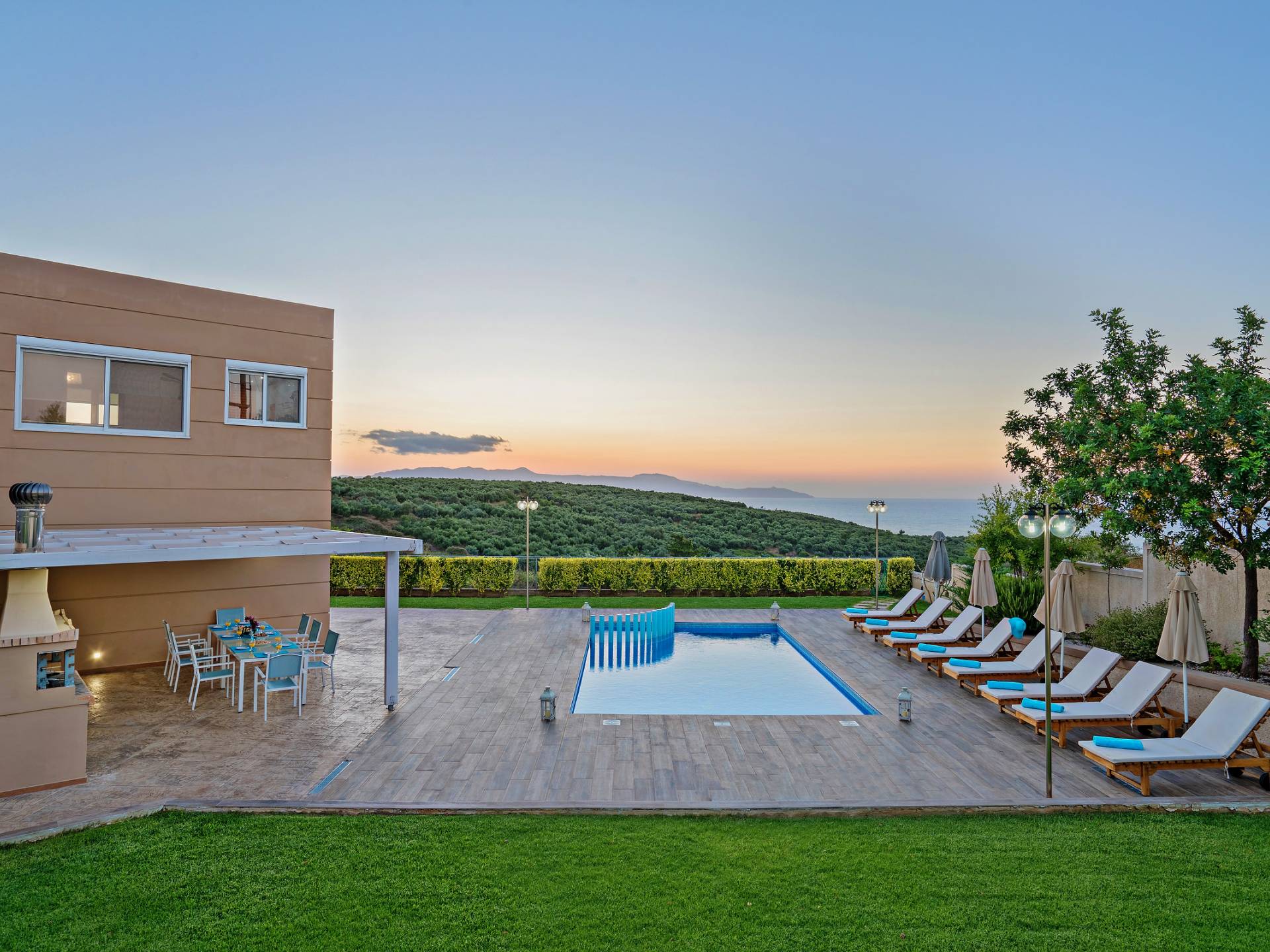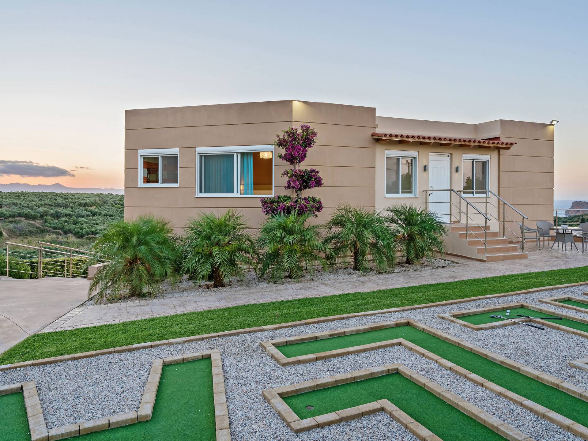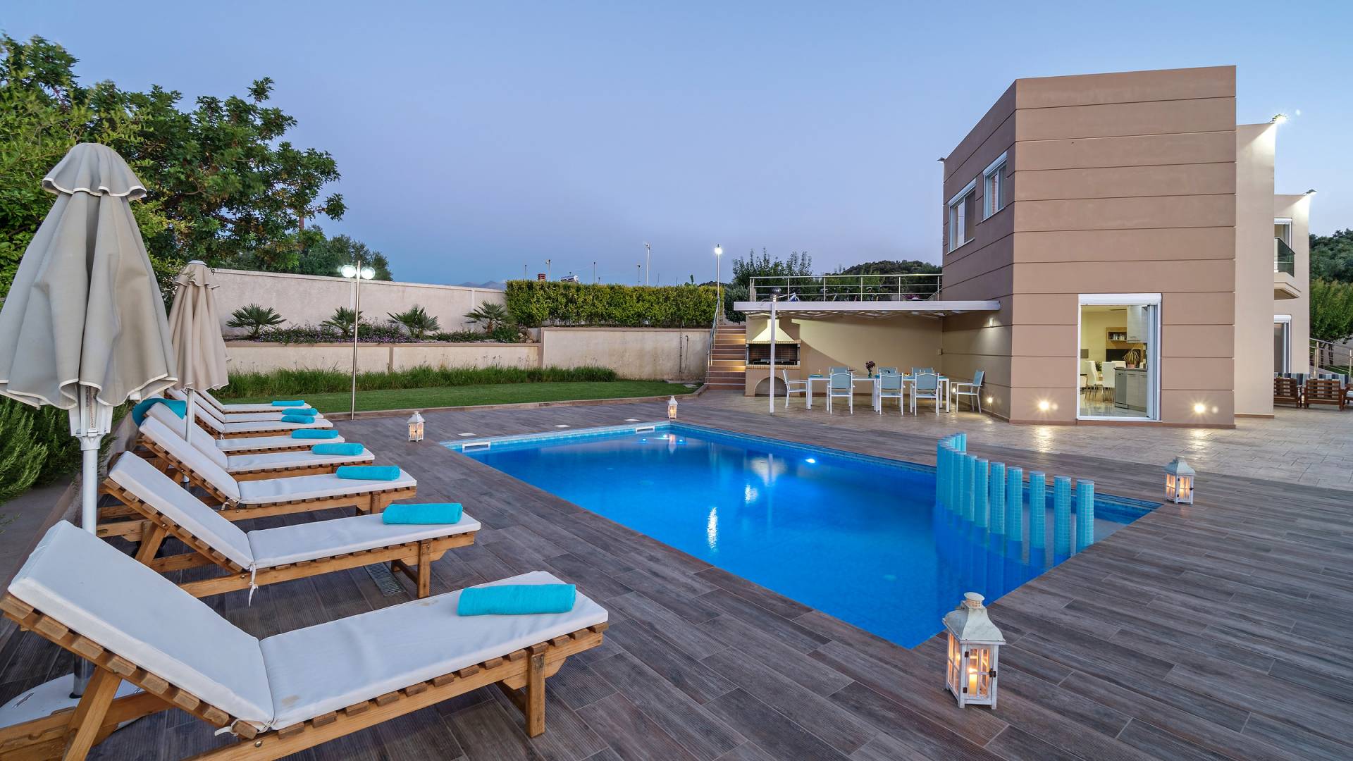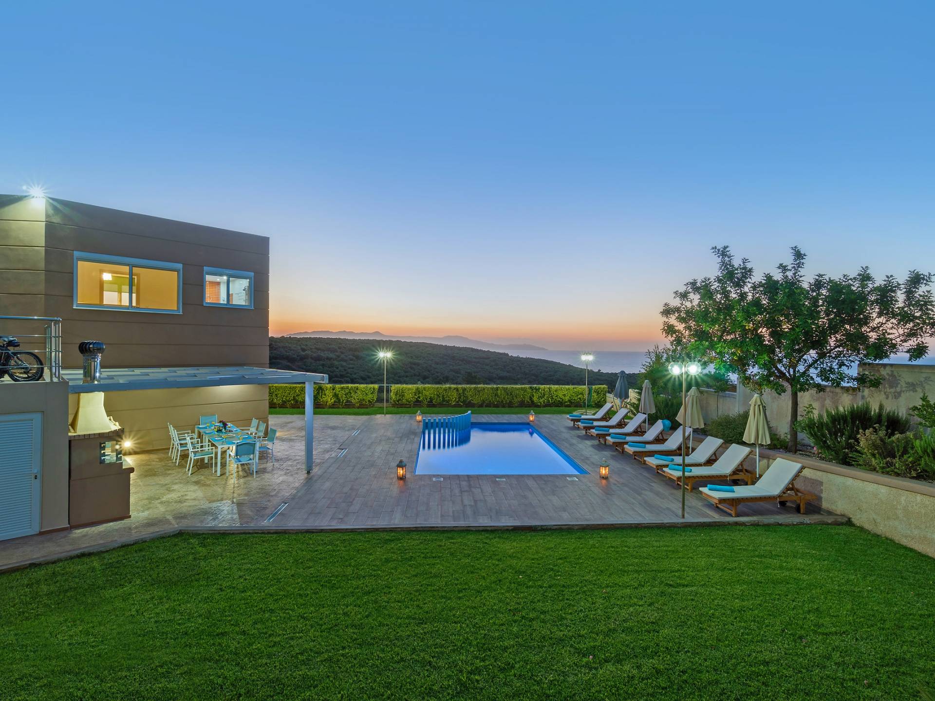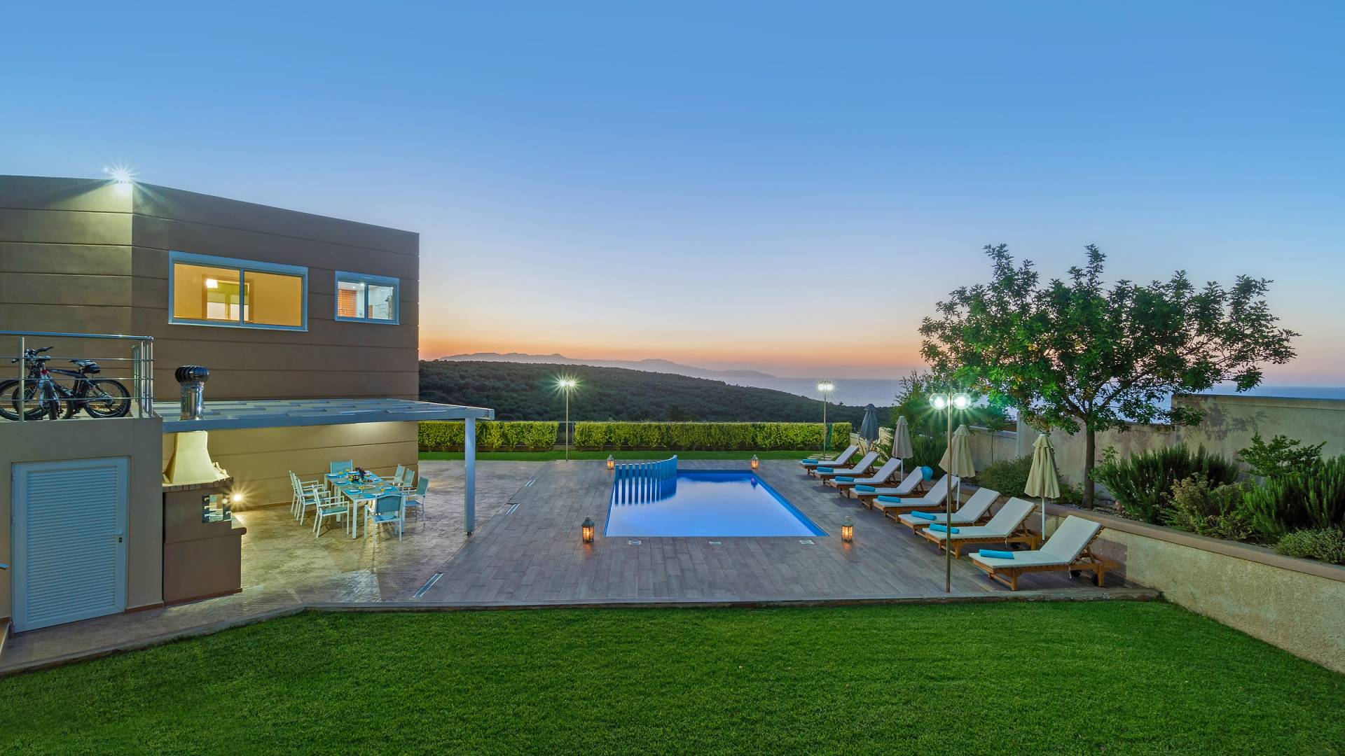 Chaque chambre dispose d'une salle de douche - WC. Toutes les chambres sont climatisées. Les abords de l'endroit où est construite la villa constituent un parking, un mini-golf, un barbecue et des pergolas en bois, un jardin fleuri et une pelouse. Il y a aussi une belle piscine de 40 m² avec des transats et des parasols en bois.