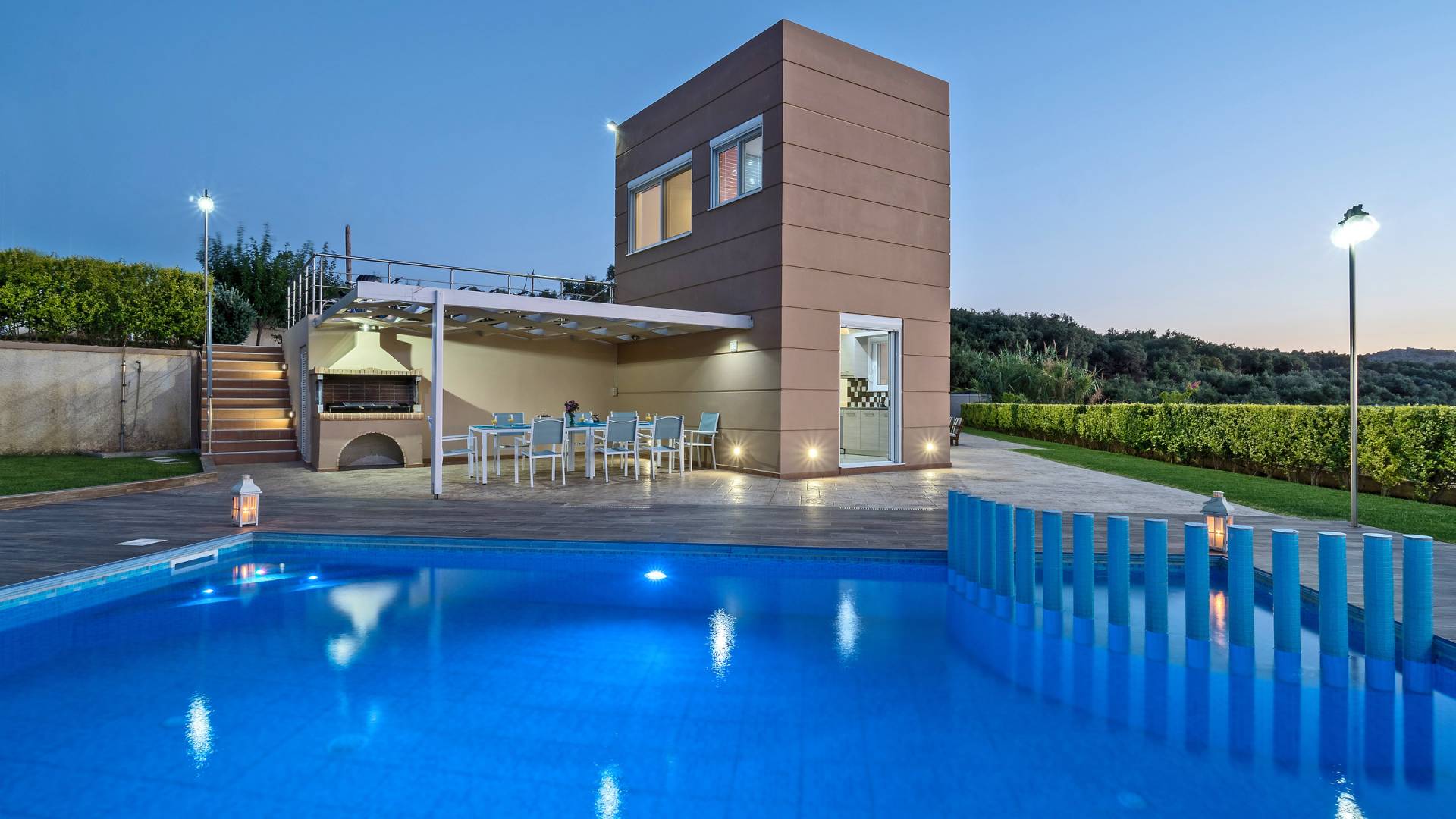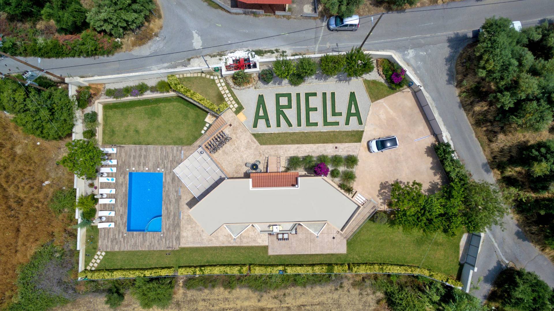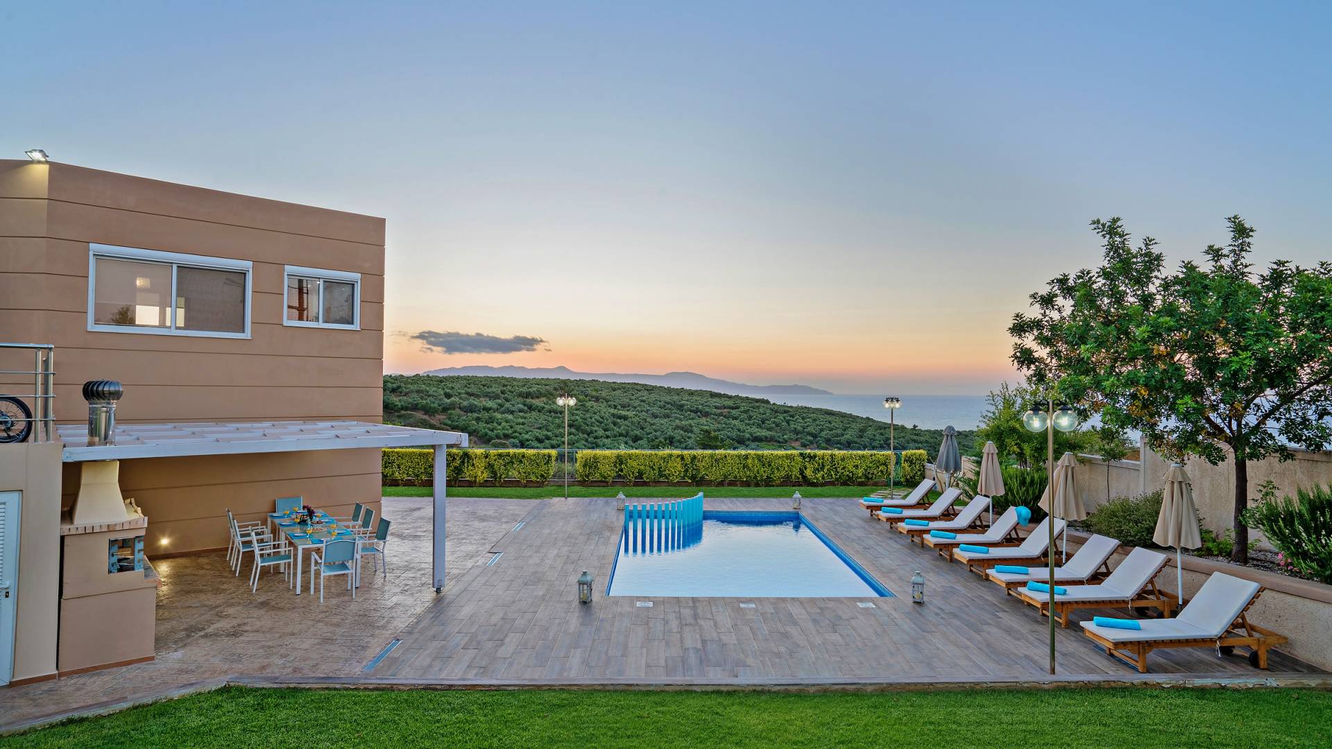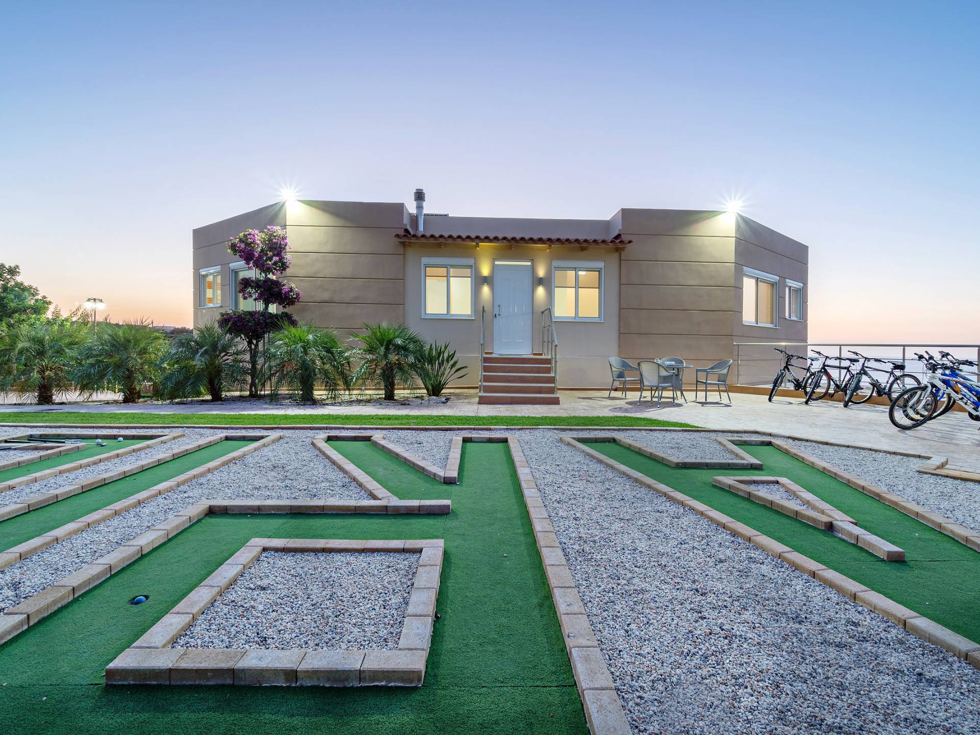 Chaque chambre dispose d'une salle de douche - WC. Toutes les chambres sont climatisées. Les abords de l'endroit où est construite la villa constituent un parking, un mini-golf, un barbecue et des pergolas en bois, un jardin fleuri et une pelouse. Il y a aussi une belle piscine de 40 m² avec des transats et des parasols en bois.