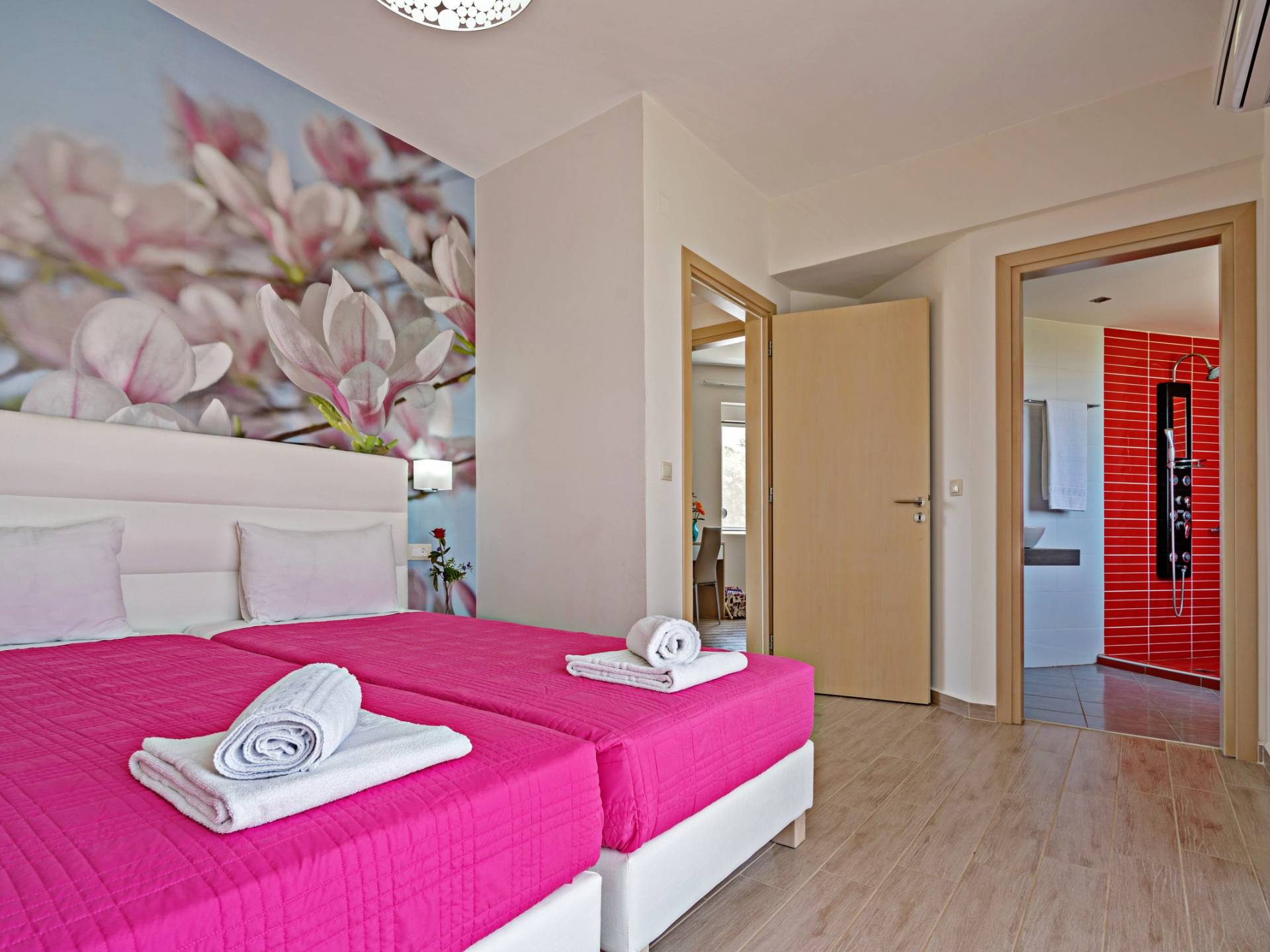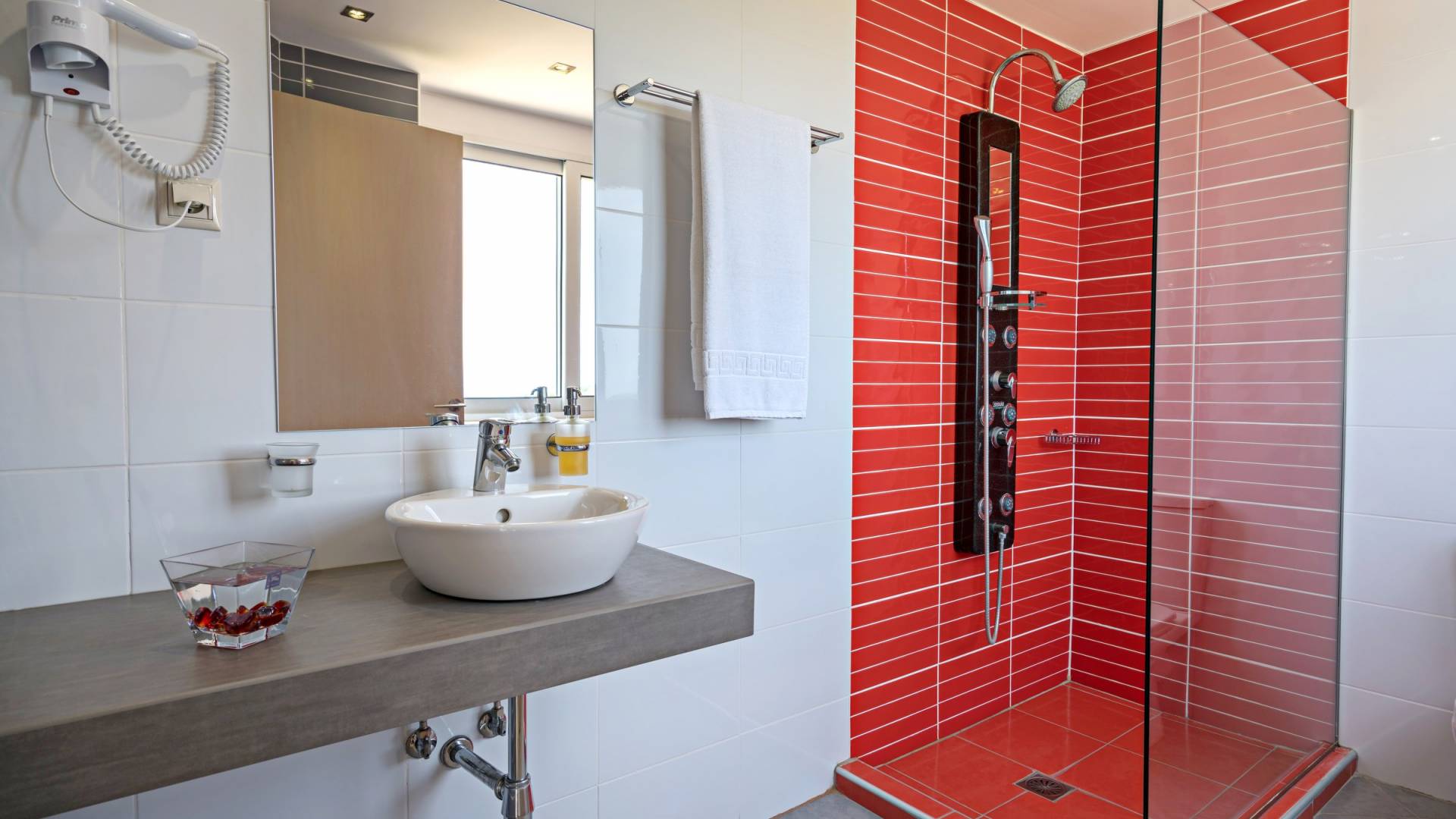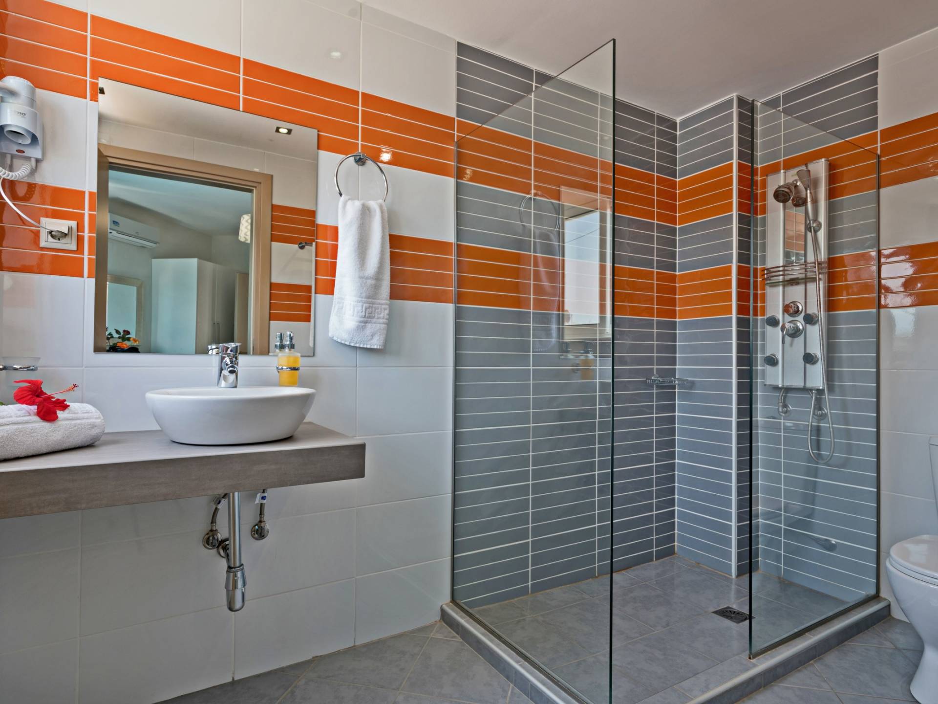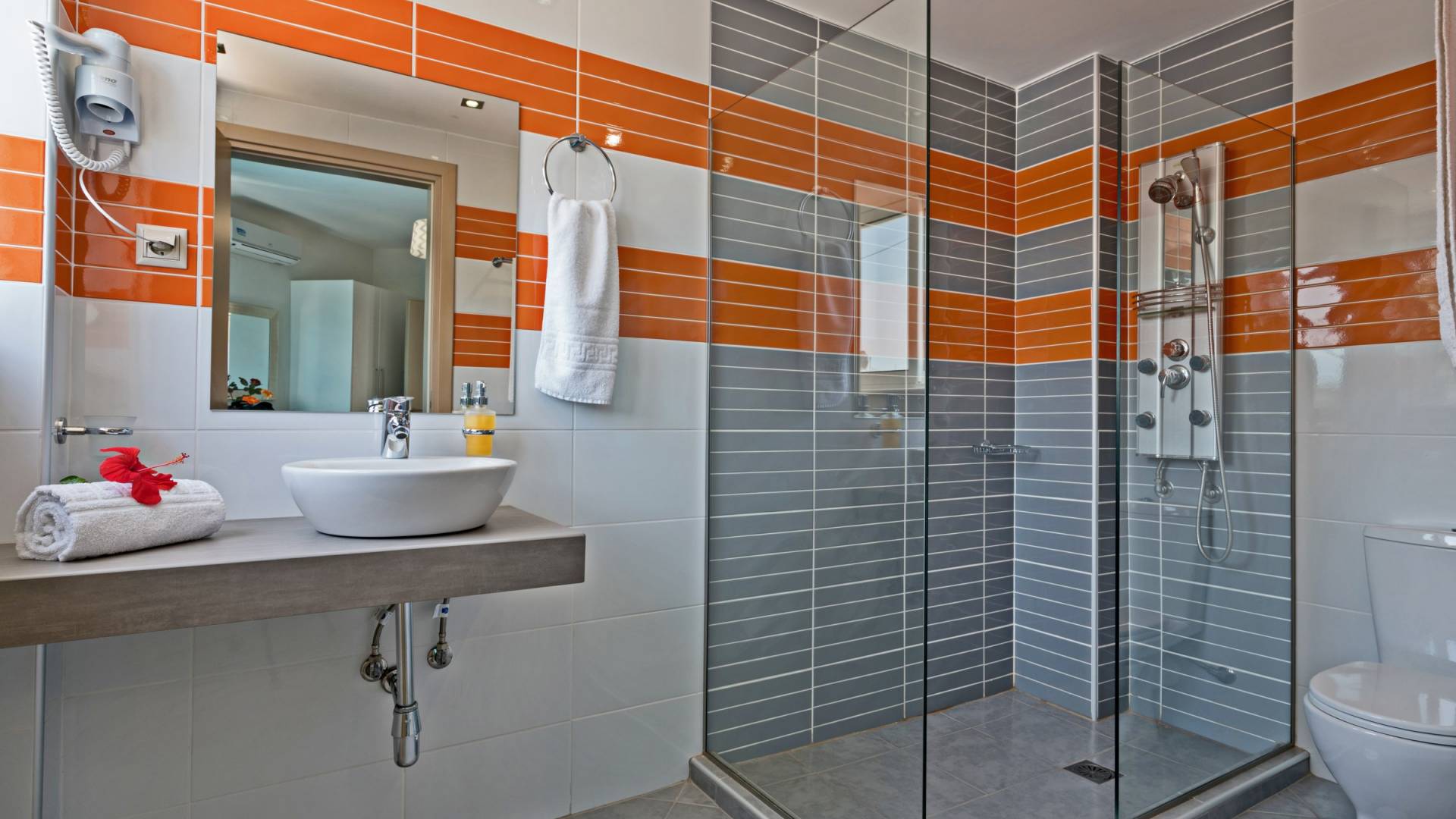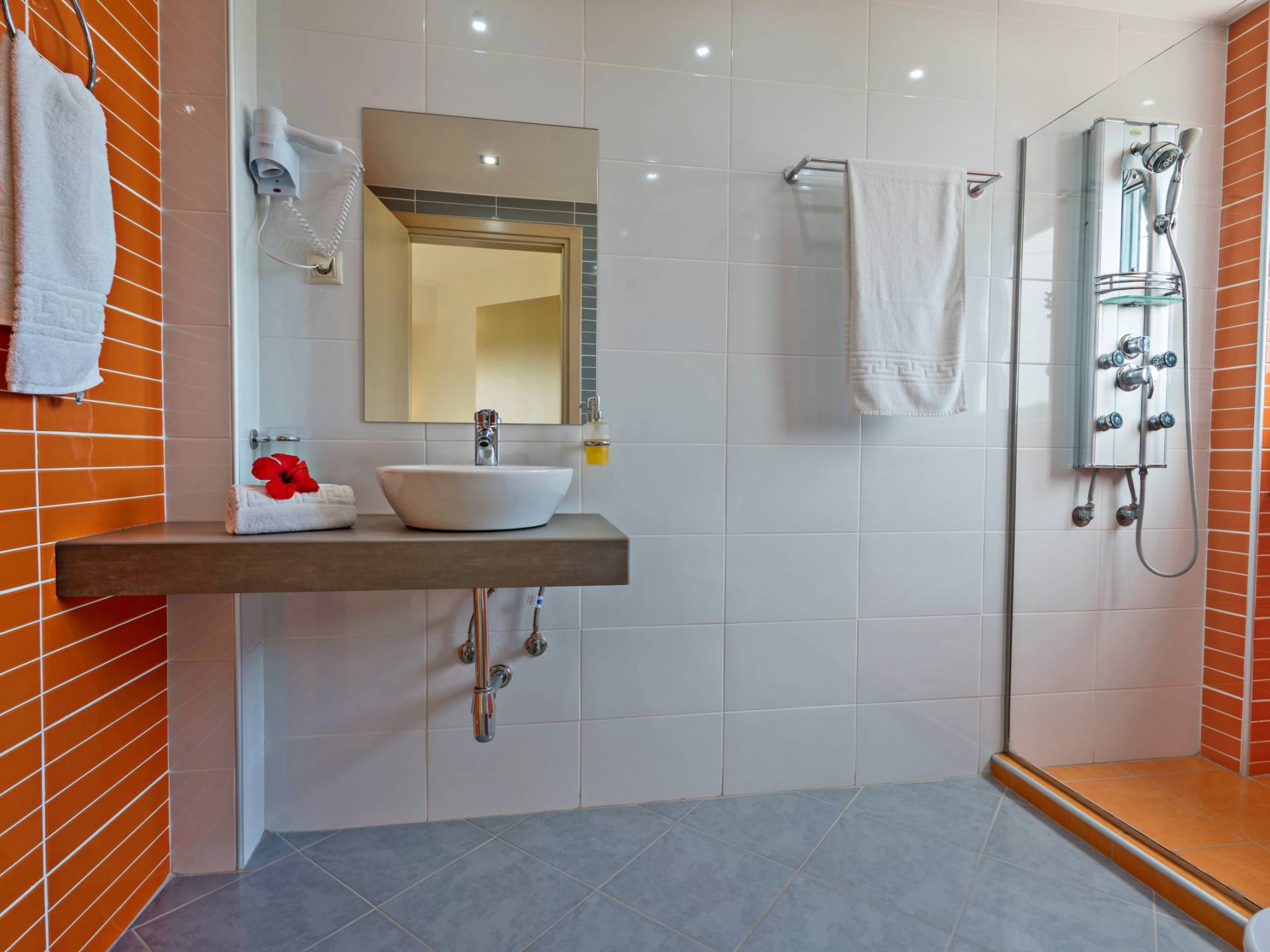 Chaque chambre dispose d'une salle de douche - WC. Toutes les chambres sont climatisées. Les abords de l'endroit où est construite la villa constituent un parking, un mini-golf, un barbecue et des pergolas en bois, un jardin fleuri et une pelouse. Il y a aussi une belle piscine de 40 m² avec des transats et des parasols en bois.