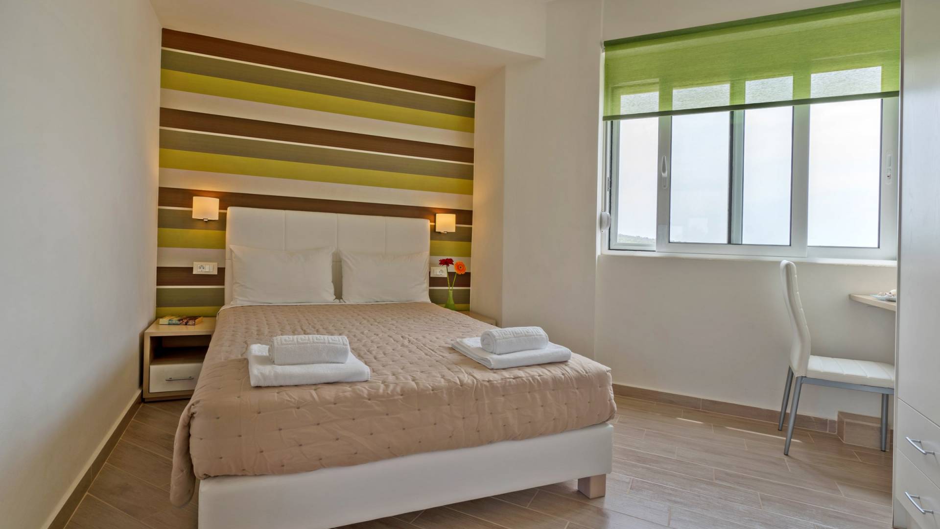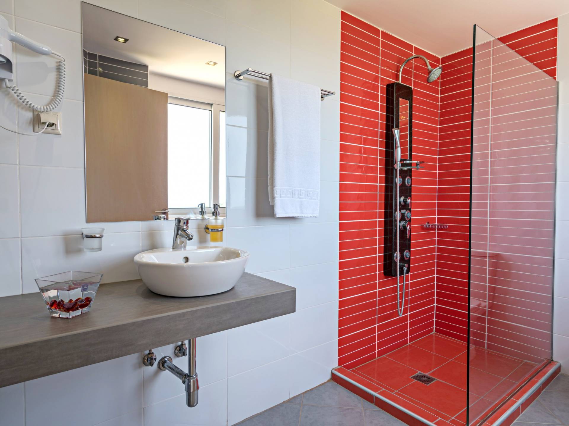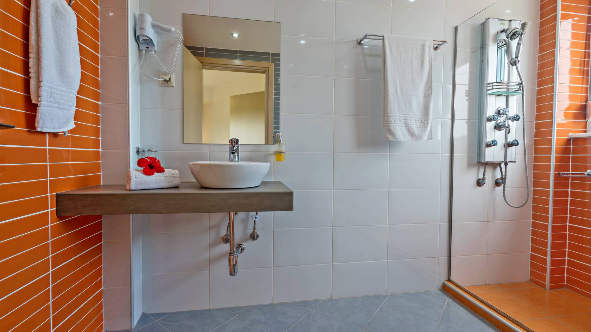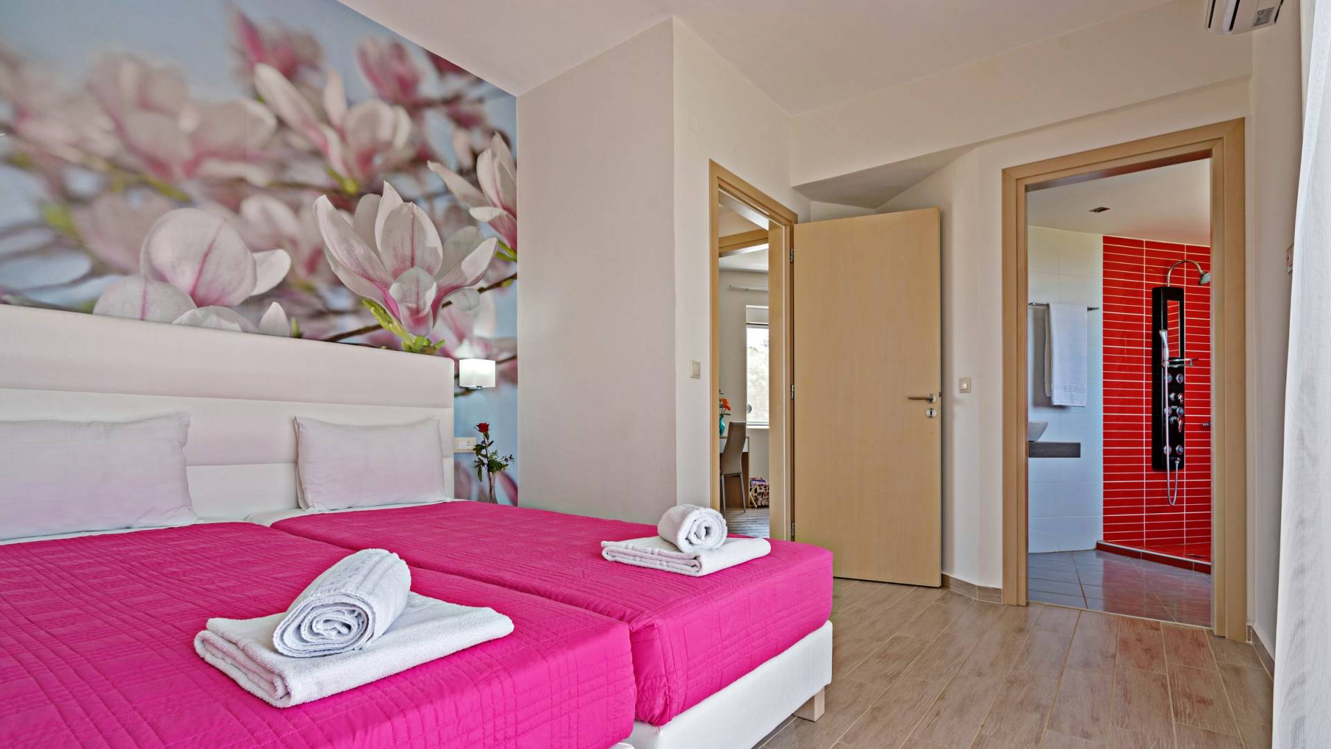 Chaque chambre dispose d'une salle de douche - WC. Toutes les chambres sont climatisées. Les abords de l'endroit où est construite la villa constituent un parking, un mini-golf, un barbecue et des pergolas en bois, un jardin fleuri et une pelouse. Il y a aussi une belle piscine de 40 m² avec des transats et des parasols en bois.