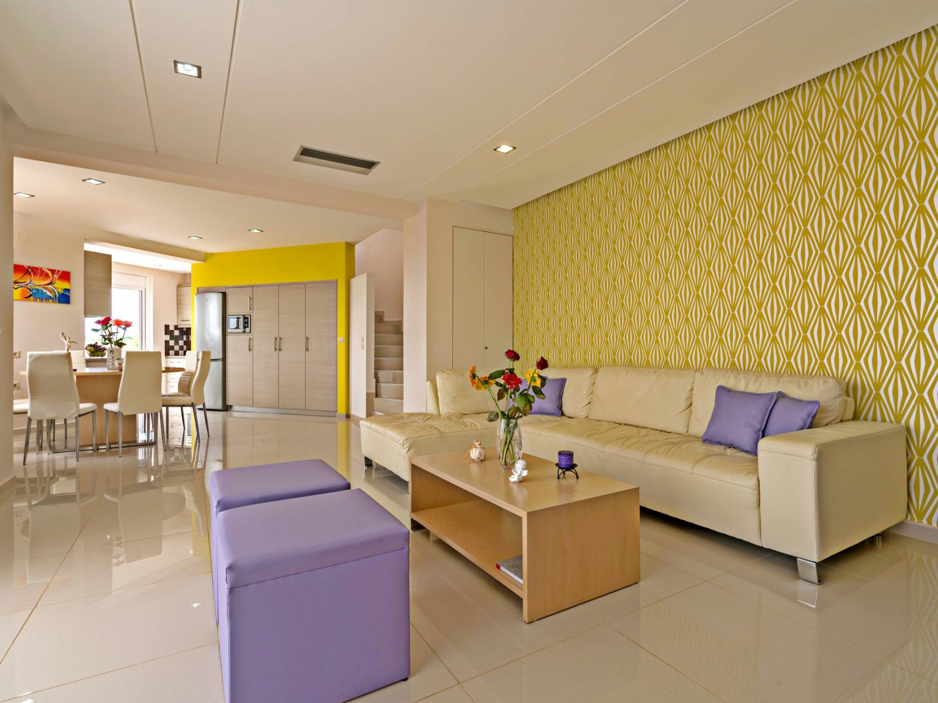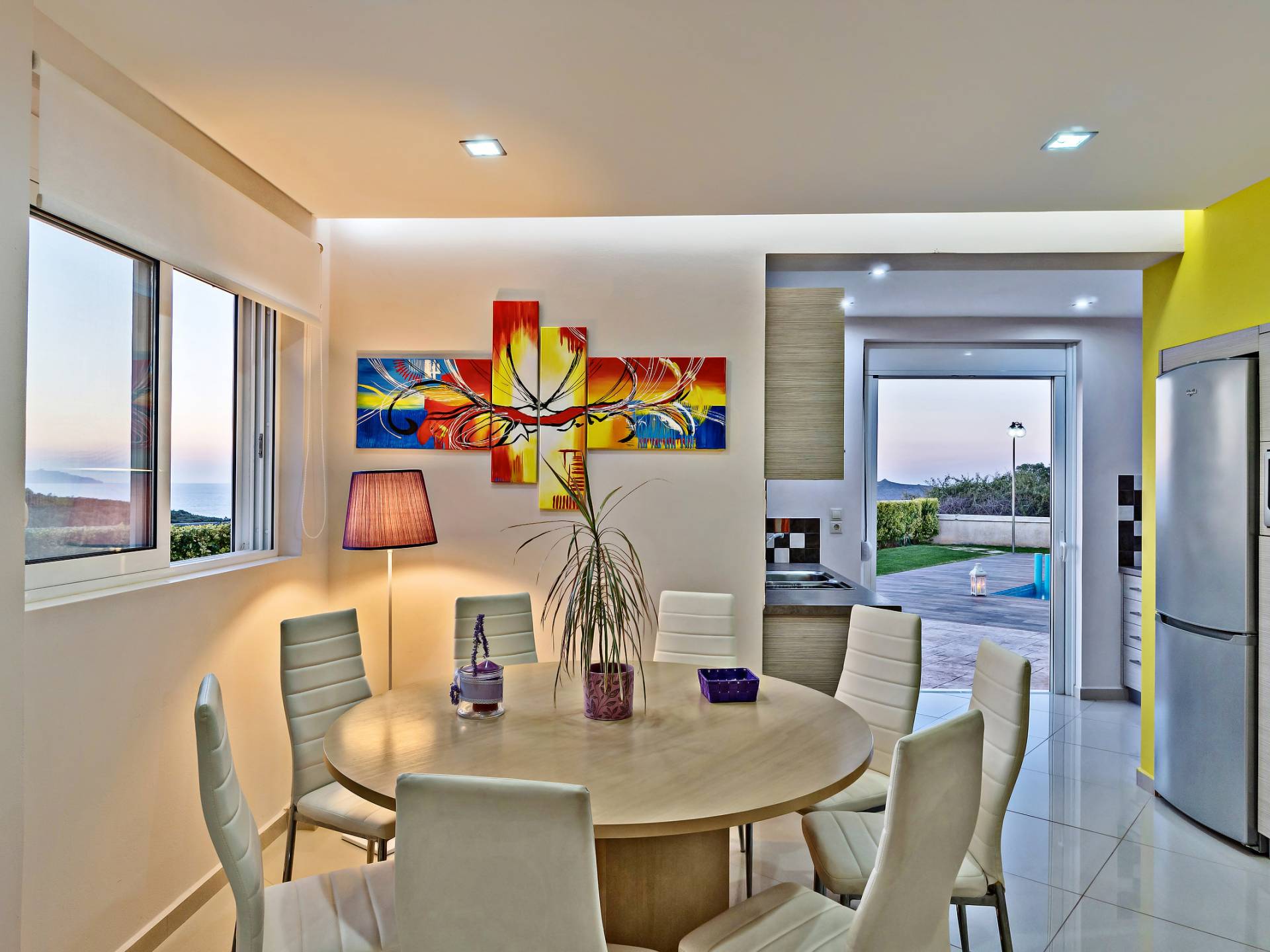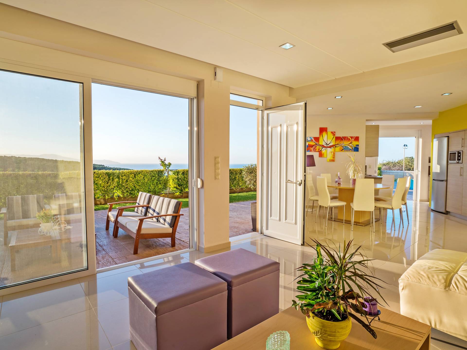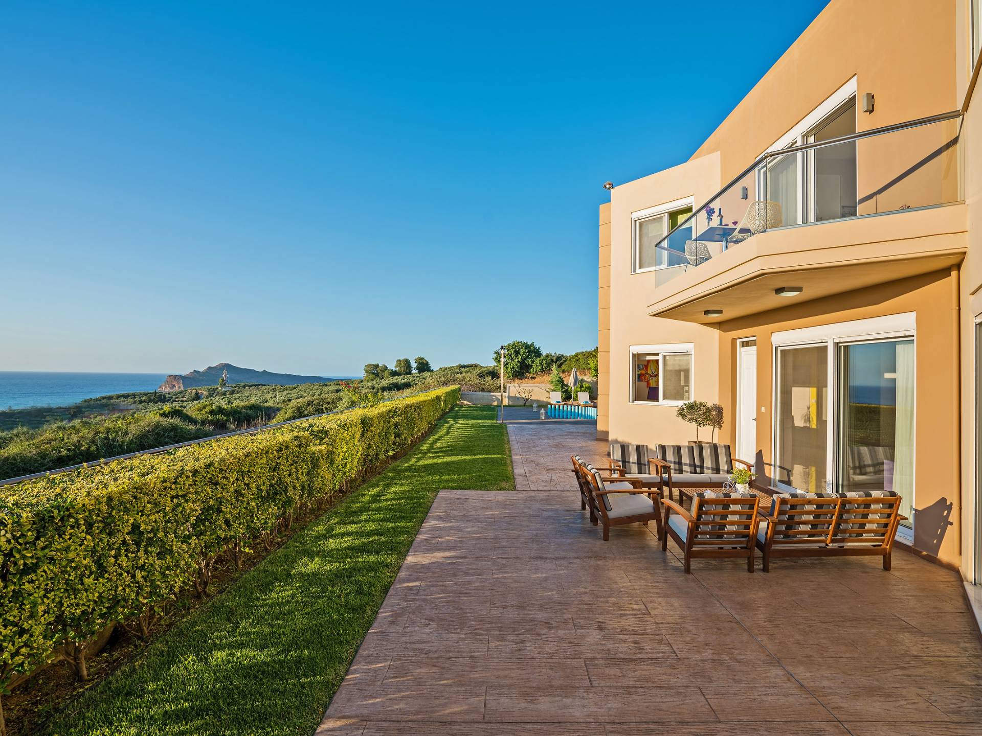 Mistral Villa Chania est une propriété de deux étages et a une superficie de 180 m², quatre chambres, une cuisine, une salle à manger, un salon et quatre salles de bains et peut accueillir jusqu'à huit personnes. Au rez-de-chaussée, il y a une cuisine entièrement équipée avec une cuisinière électrique, un four micro-ondes, un four, un grille-pain, un grill, un gril, un lave-vaisselle et tout ce qui est nécessaire pour un séjour confortable et agréable. De plus, il y a un spacieux salon-salle à manger avec accès direct à l'extérieur et à la piscine. Au même niveau, il y a une chambre spacieuse avec un lit double et une salle de bain avec baignoire oxygénothérapie. Un escalier intérieur mène à l'étage supérieur où se trouvent trois autres chambres, deux avec lit double et une avec lits jumeaux simples.