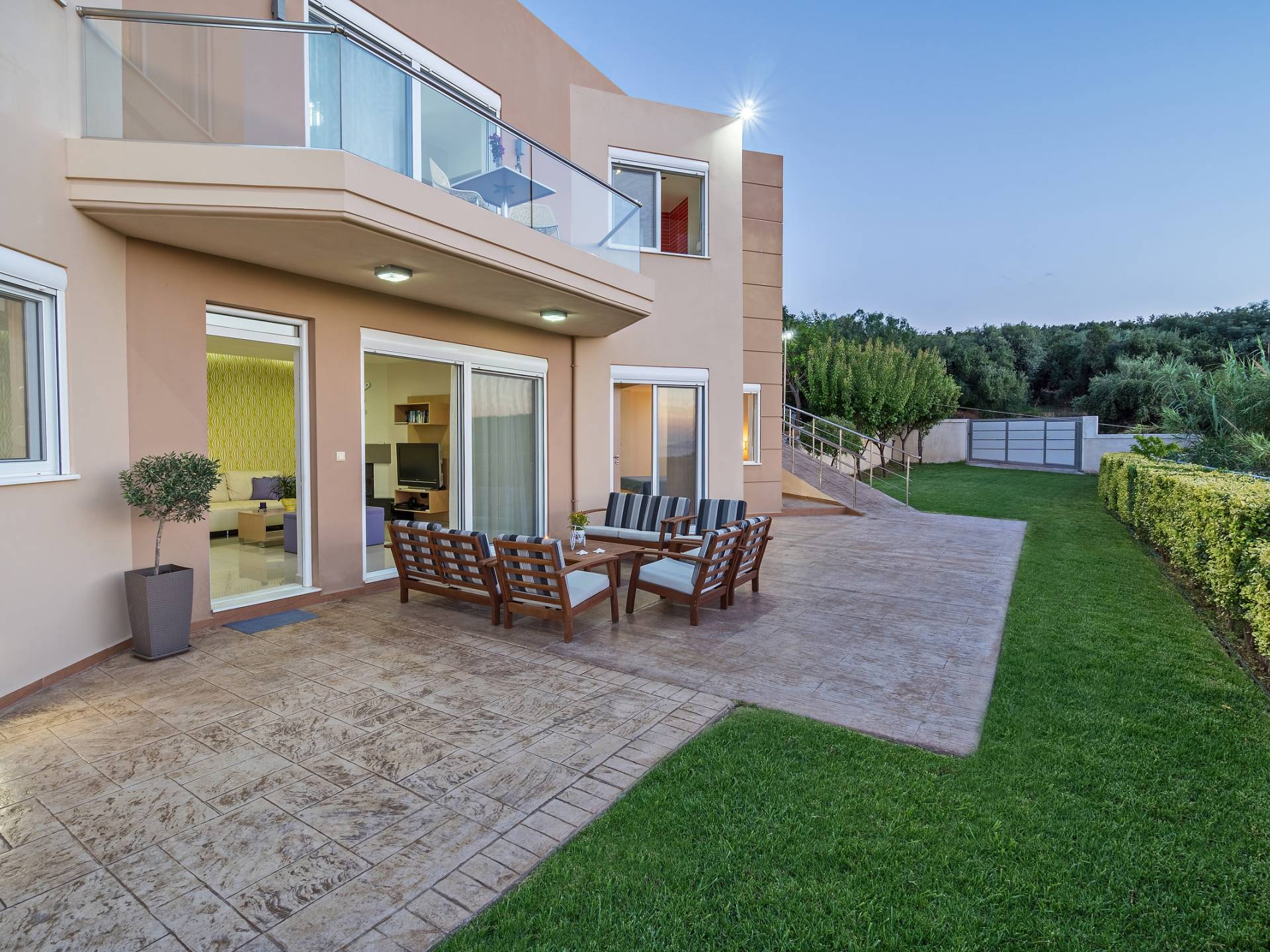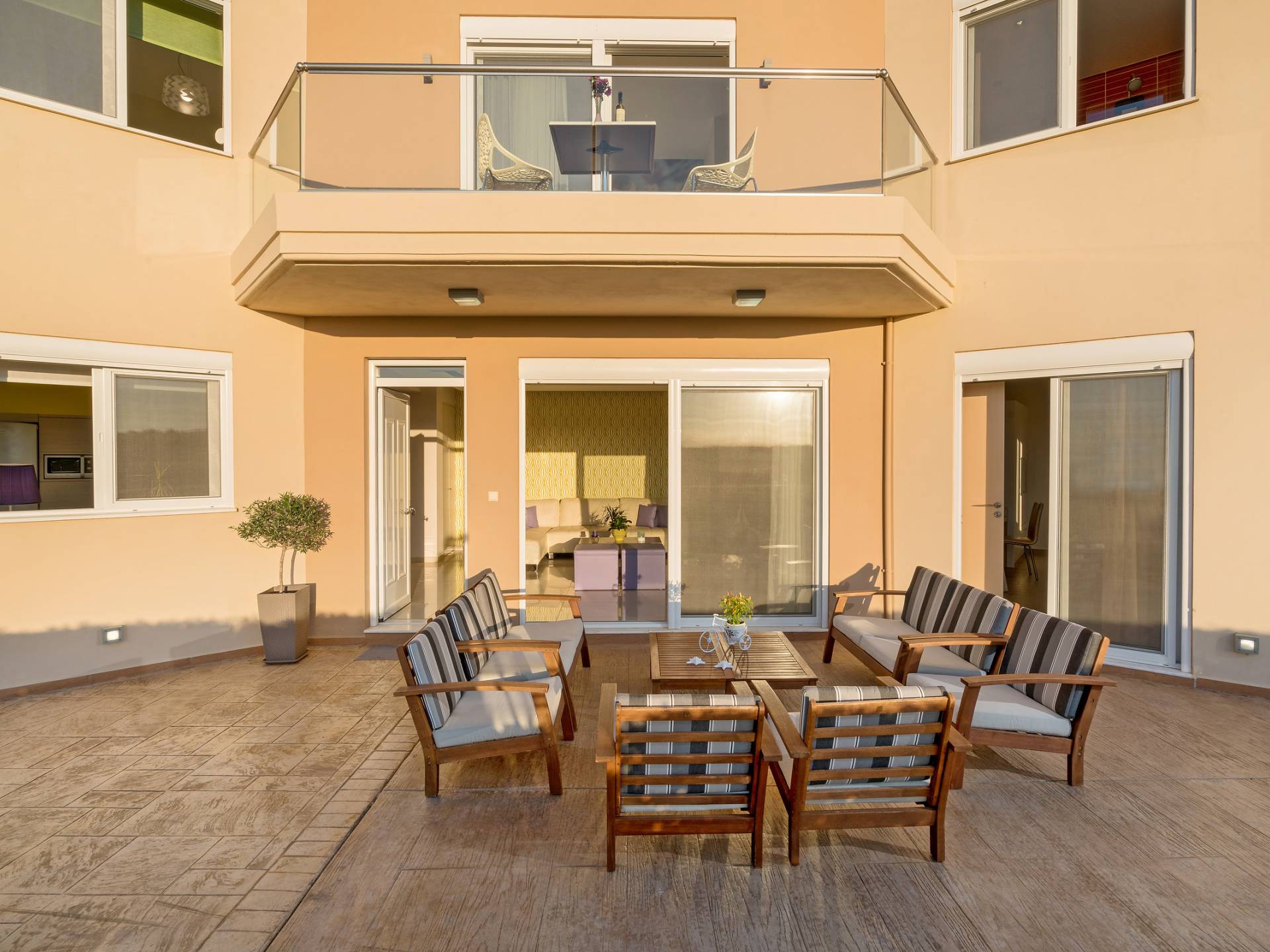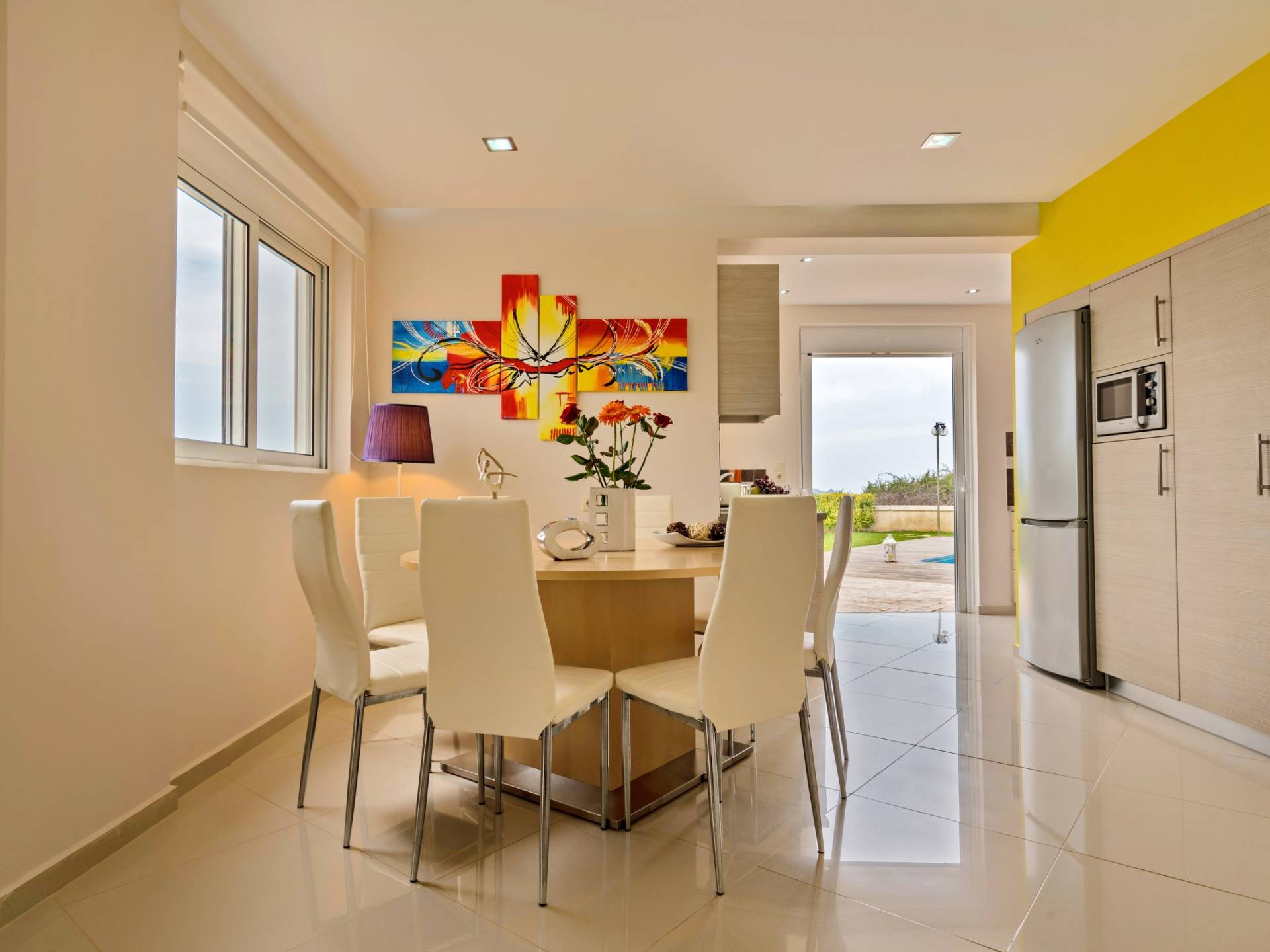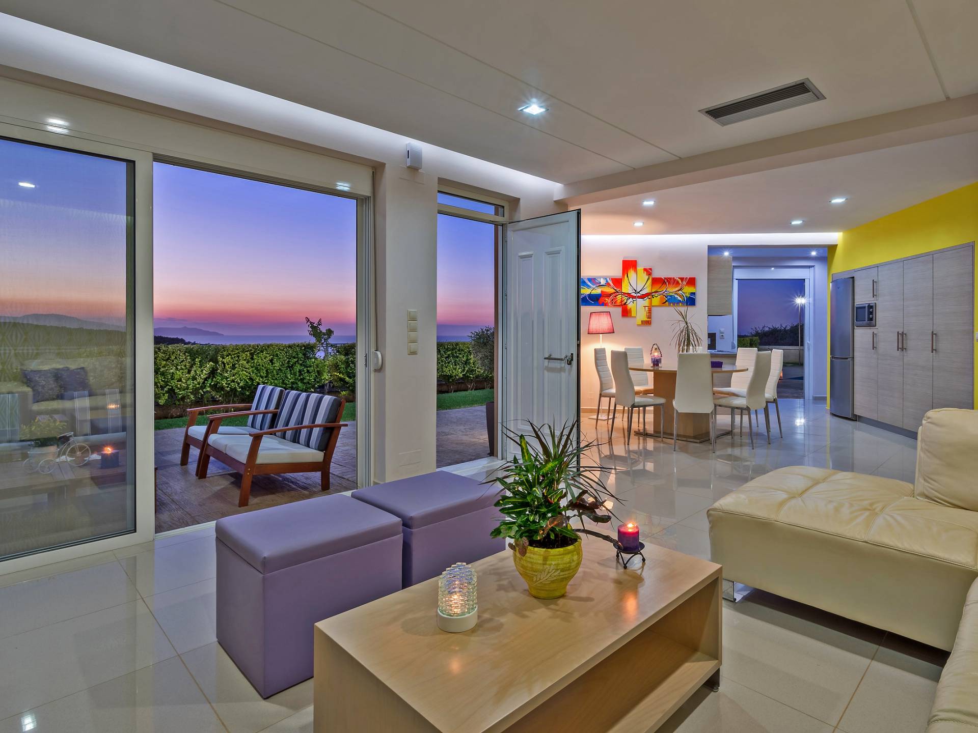 Mistral Villa Chania est une propriété de deux étages et a une superficie de 180 m², quatre chambres, une cuisine, une salle à manger, un salon et quatre salles de bains et peut accueillir jusqu'à huit personnes. Au rez-de-chaussée, il y a une cuisine entièrement équipée avec une cuisinière électrique, un four micro-ondes, un four, un grille-pain, un grill, un gril, un lave-vaisselle et tout ce qui est nécessaire pour un séjour confortable et agréable. De plus, il y a un spacieux salon-salle à manger avec accès direct à l'extérieur et à la piscine. Au même niveau, il y a une chambre spacieuse avec un lit double et une salle de bain avec baignoire oxygénothérapie. Un escalier intérieur mène à l'étage supérieur où se trouvent trois autres chambres, deux avec lit double et une avec lits jumeaux simples.