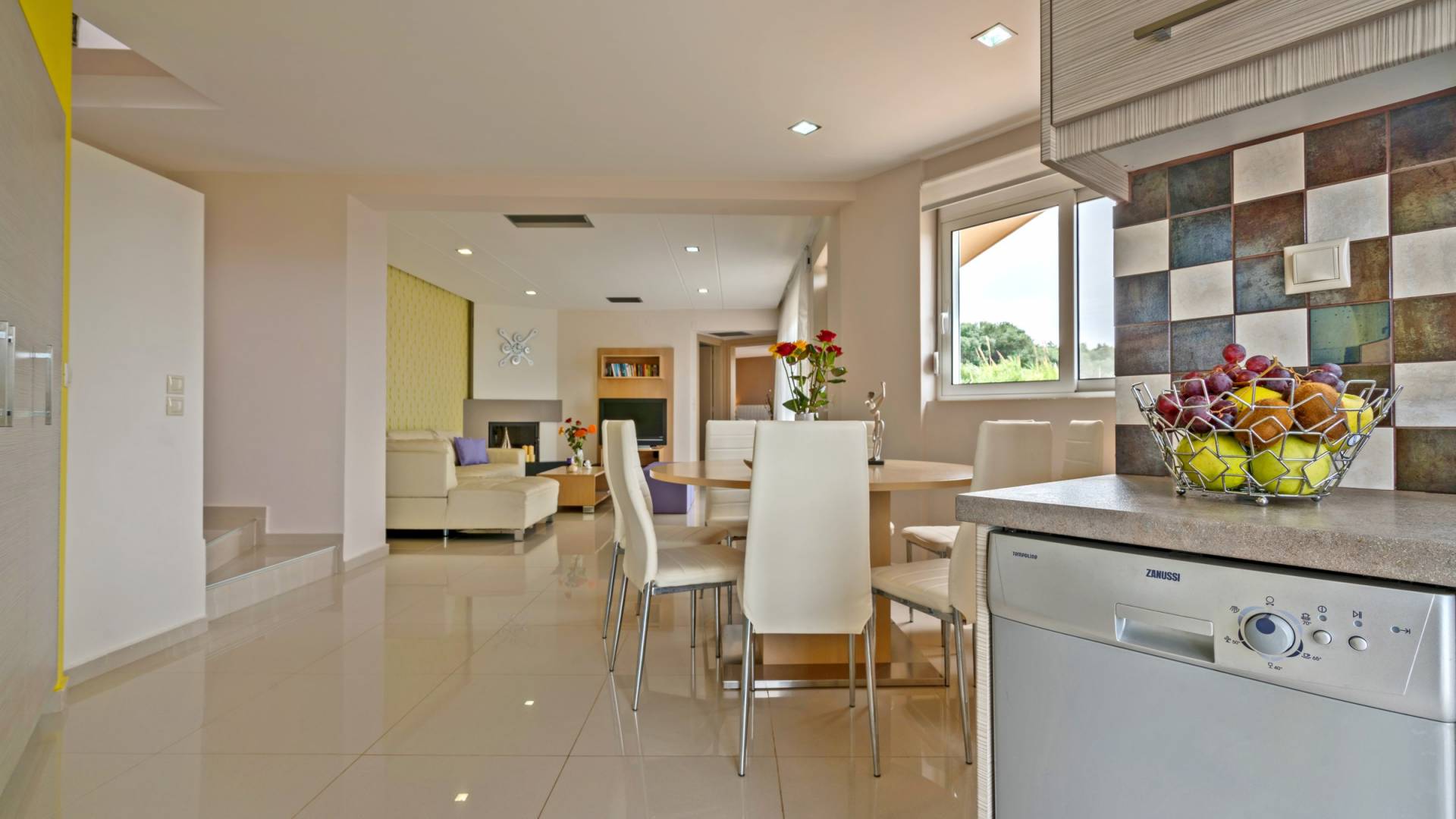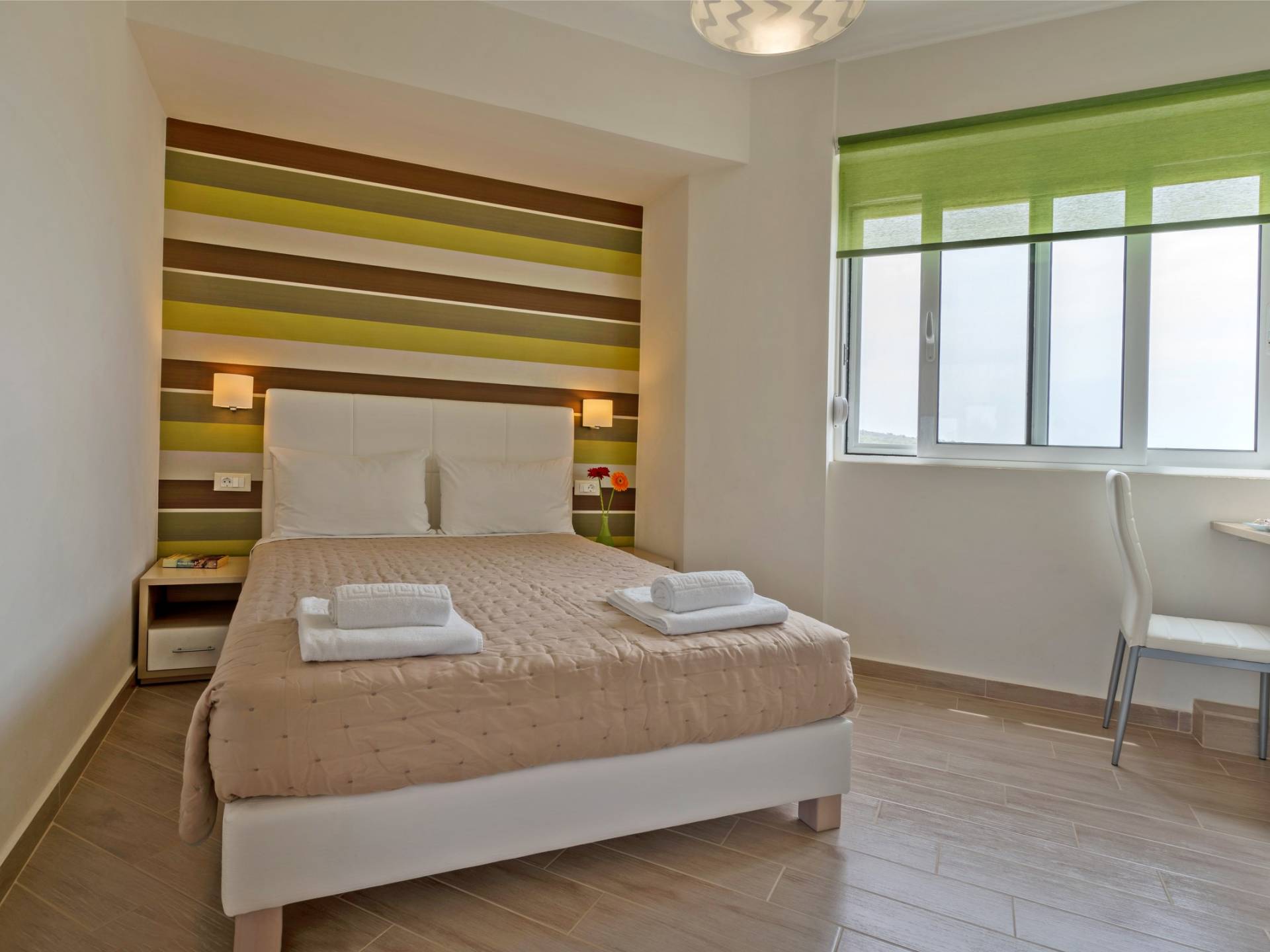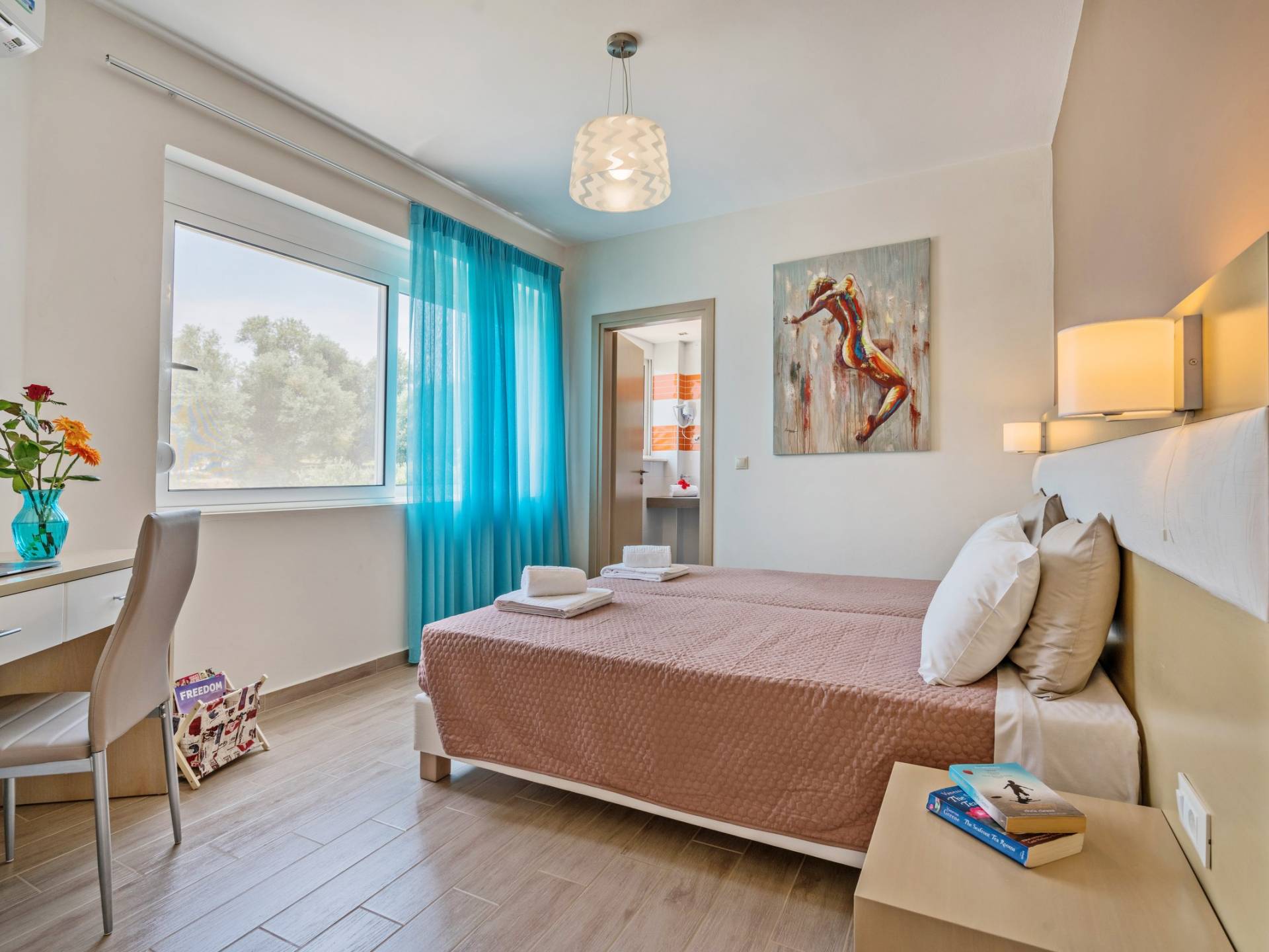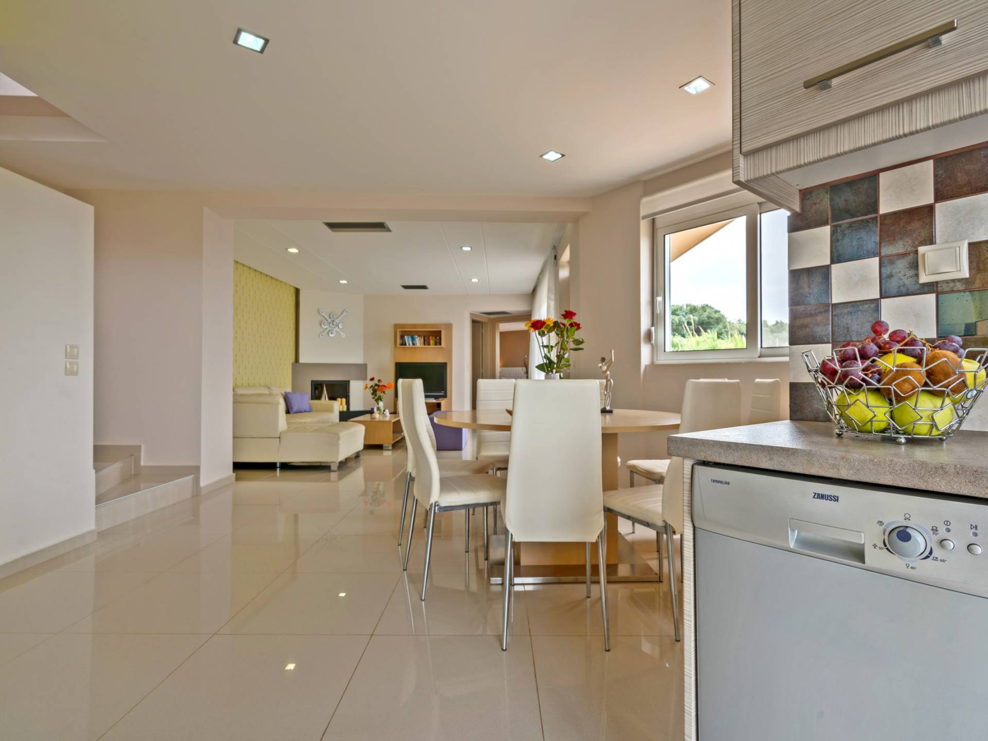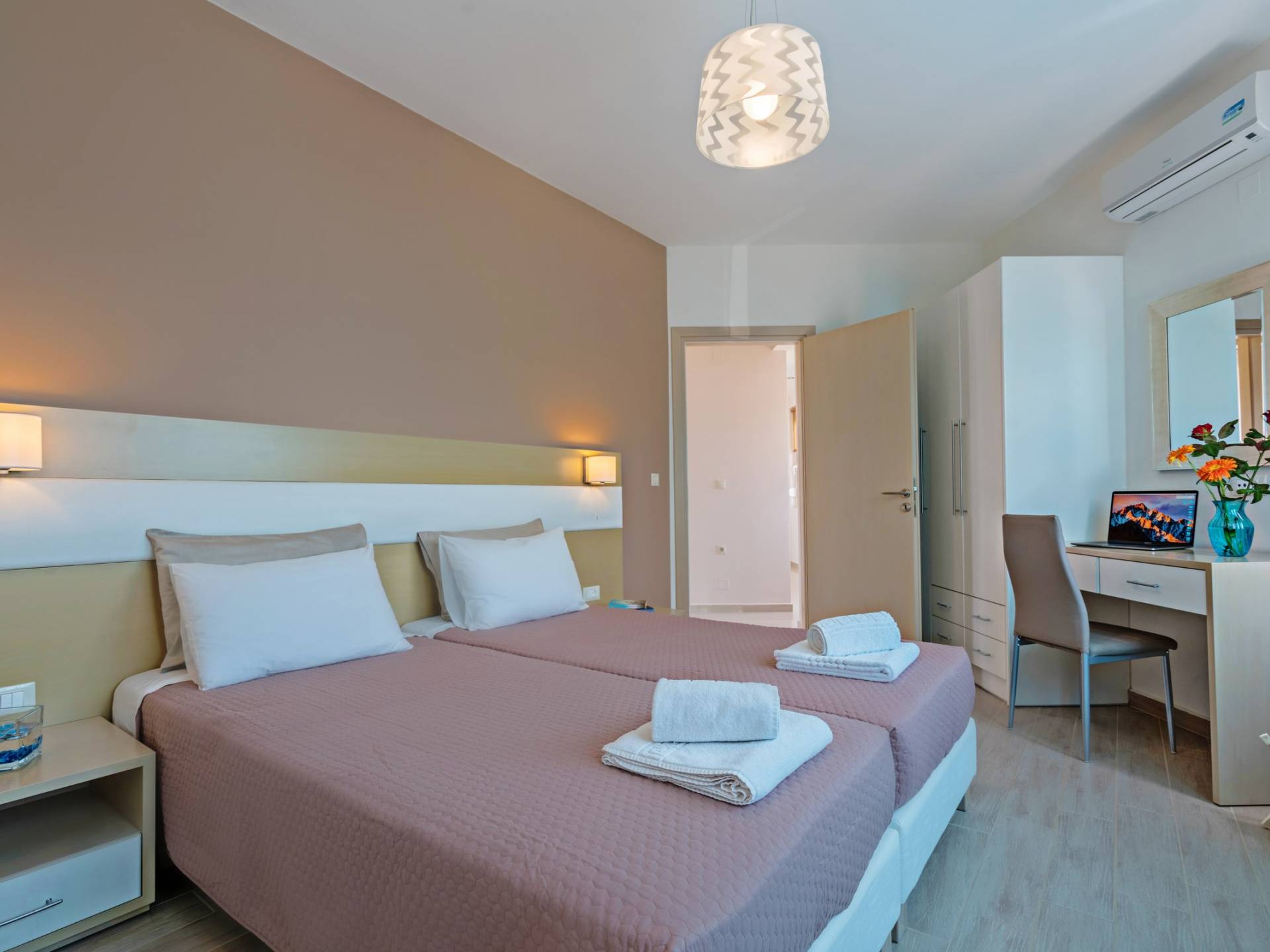 Mistral Villa Chania est une propriété de deux étages et a une superficie de 180 m², quatre chambres, une cuisine, une salle à manger, un salon et quatre salles de bains et peut accueillir jusqu'à huit personnes. Au rez-de-chaussée, il y a une cuisine entièrement équipée avec une cuisinière électrique, un four micro-ondes, un four, un grille-pain, un grill, un gril, un lave-vaisselle et tout ce qui est nécessaire pour un séjour confortable et agréable. De plus, il y a un spacieux salon-salle à manger avec accès direct à l'extérieur et à la piscine. Au même niveau, il y a une chambre spacieuse avec un lit double et une salle de bain avec baignoire oxygénothérapie. Un escalier intérieur mène à l'étage supérieur où se trouvent trois autres chambres, deux avec lit double et une avec lits jumeaux simples.