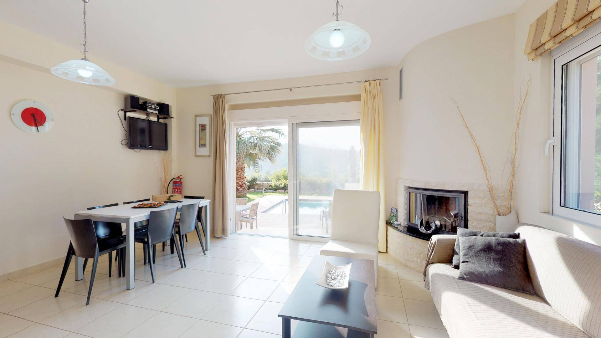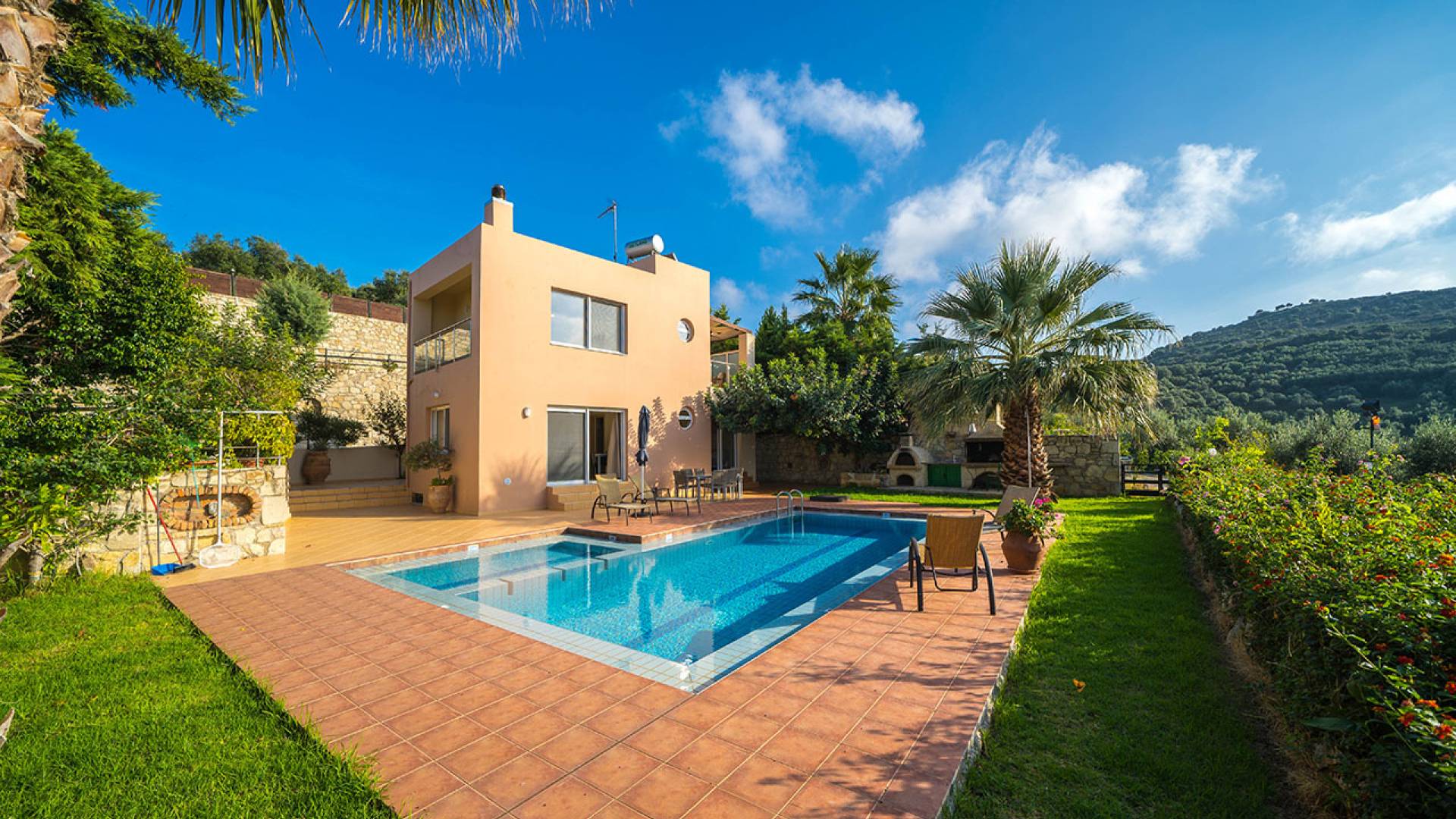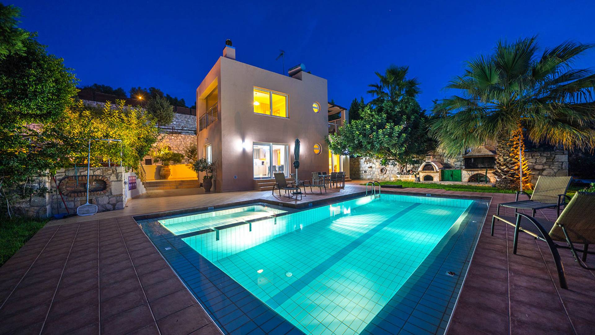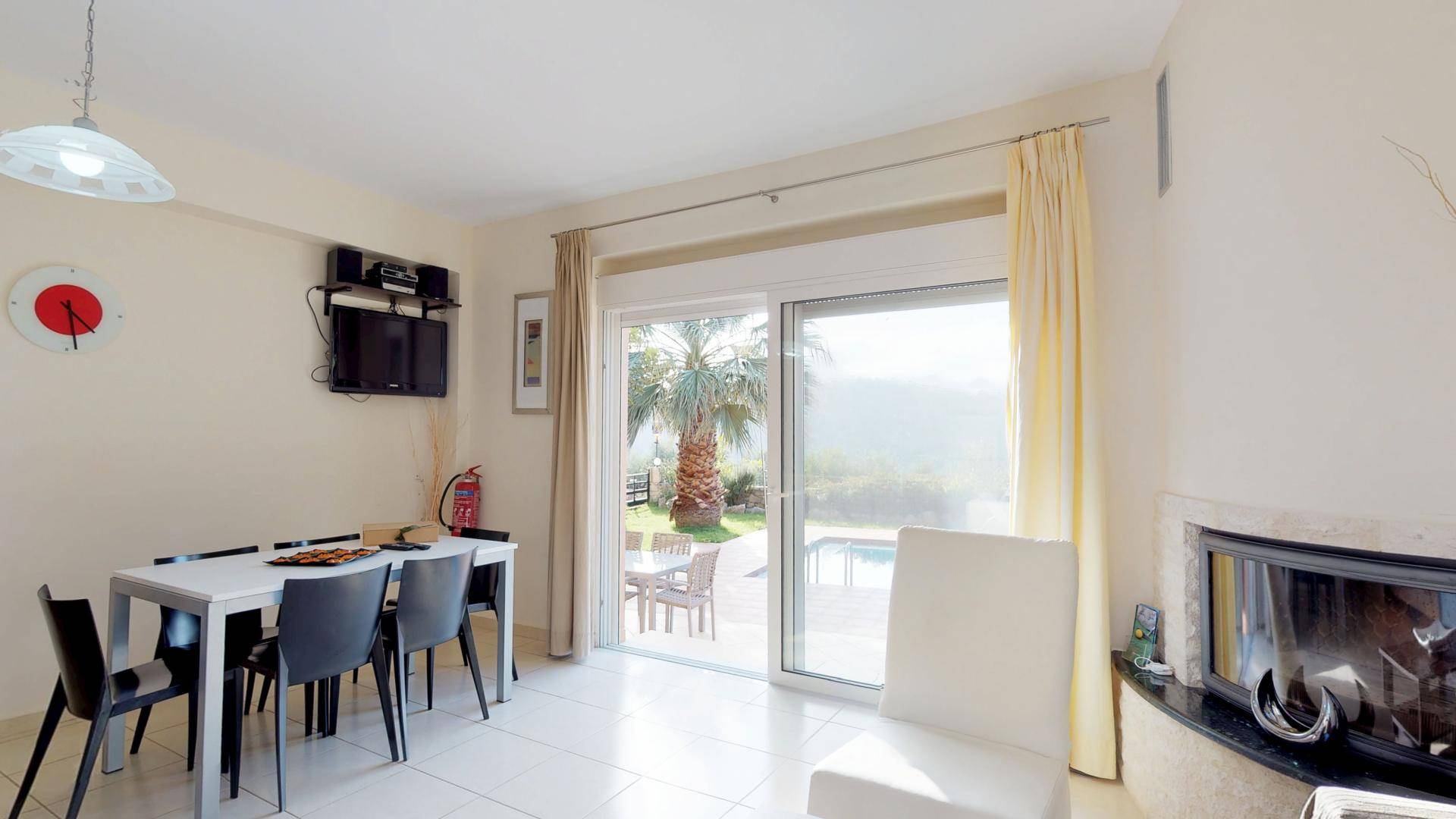 Pour la réalisation de cet objectif et malgré l'esthétique distincte de la villa, ont été conçues à l'envers de manière à offrir un maximum de plaisir aux visiteurs qui peuvent passer des moments de détente au salon tout en profitant de l'accès direct à la piscine et au jardin privés, asseyez-vous confortablement à la salle à manger, facilitez leur séjour en utilisant la cuisine entièrement équipée, reposez-vous dans les chambres spacieuses et bien sûr profitez de la vue imprenable sur la nature environnante, la mer, les collines verdoyantes, la beau coucher de soleil, le jardin et la piscine depuis les vérandas du 1er étage.