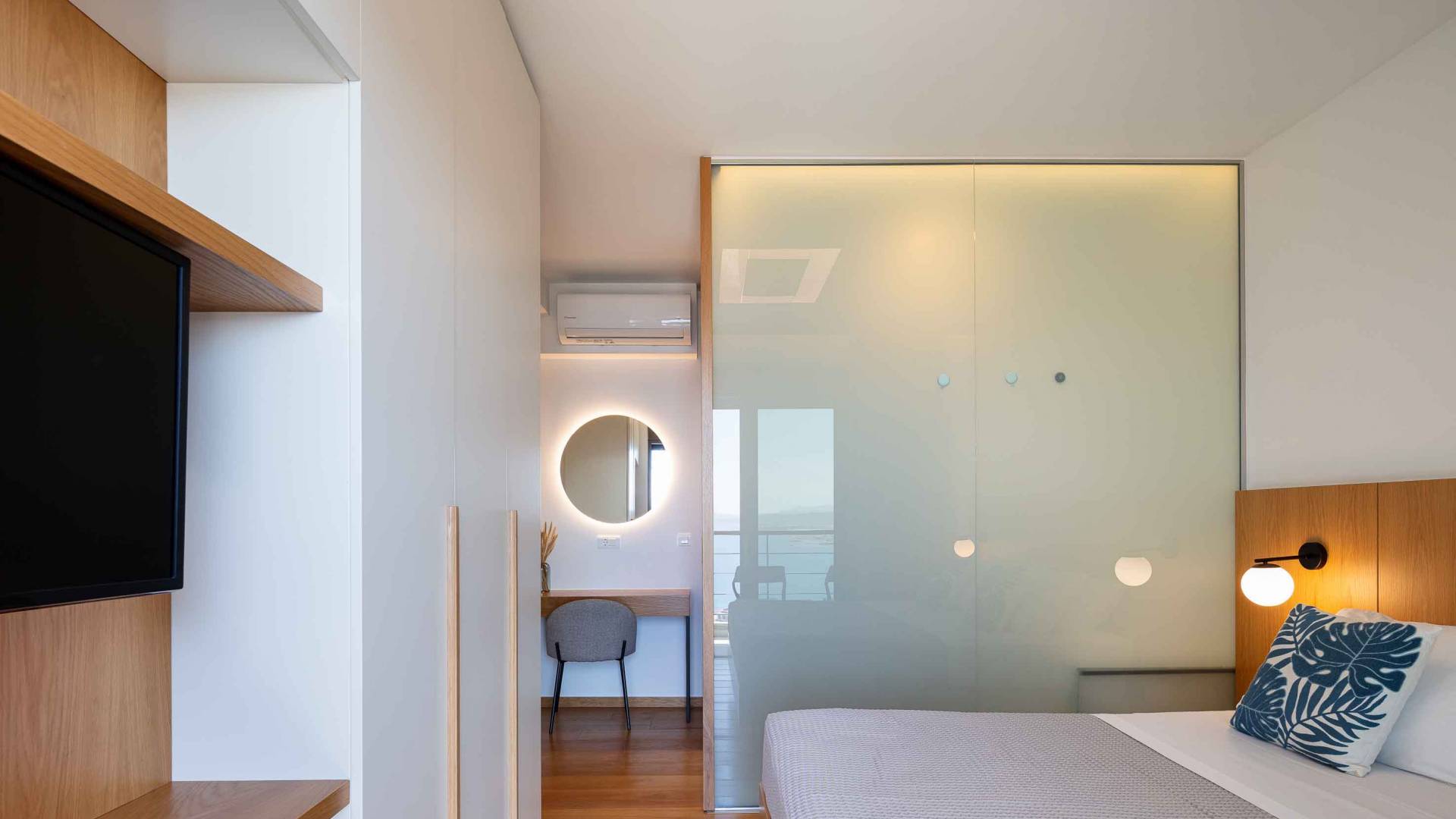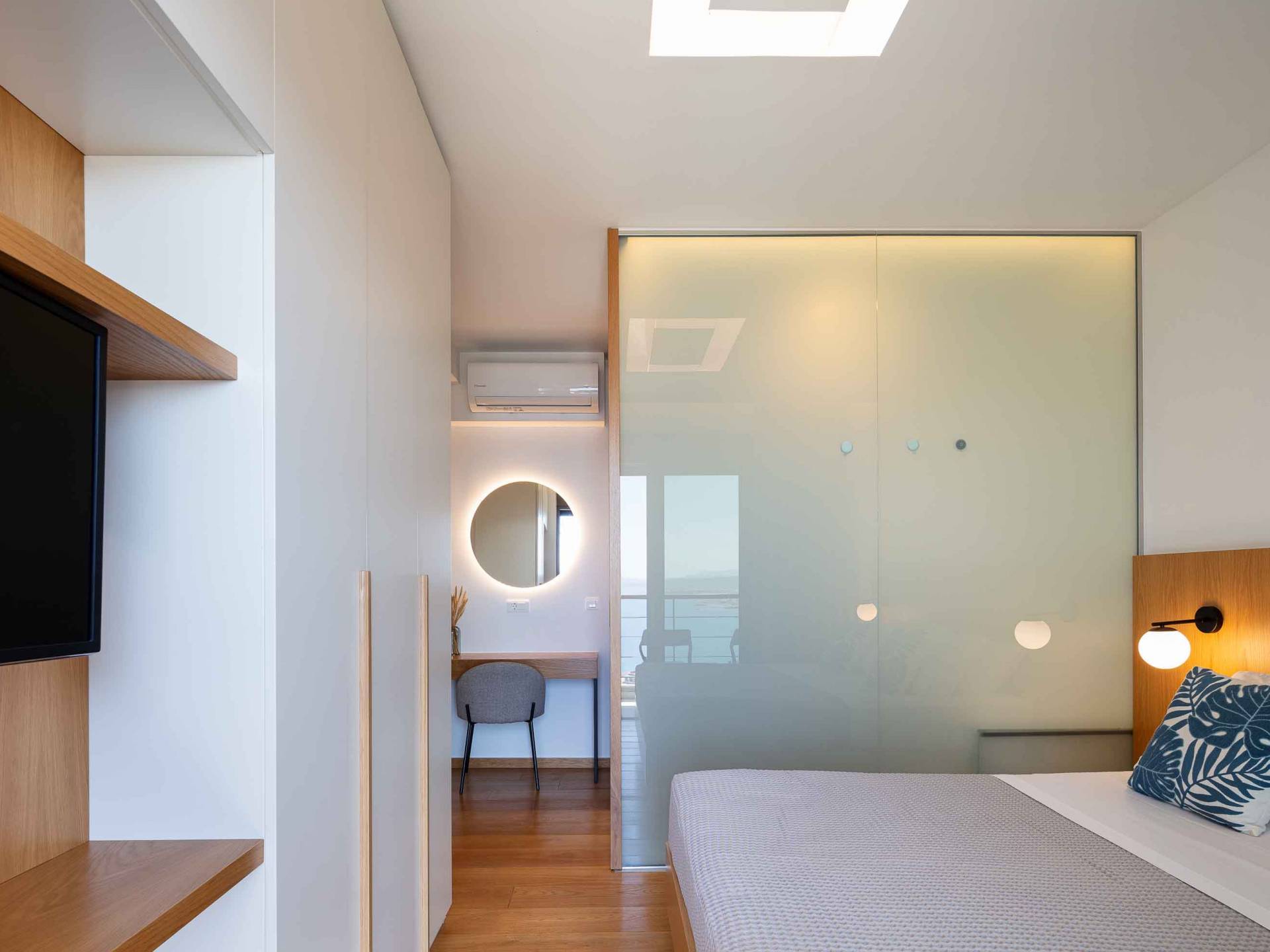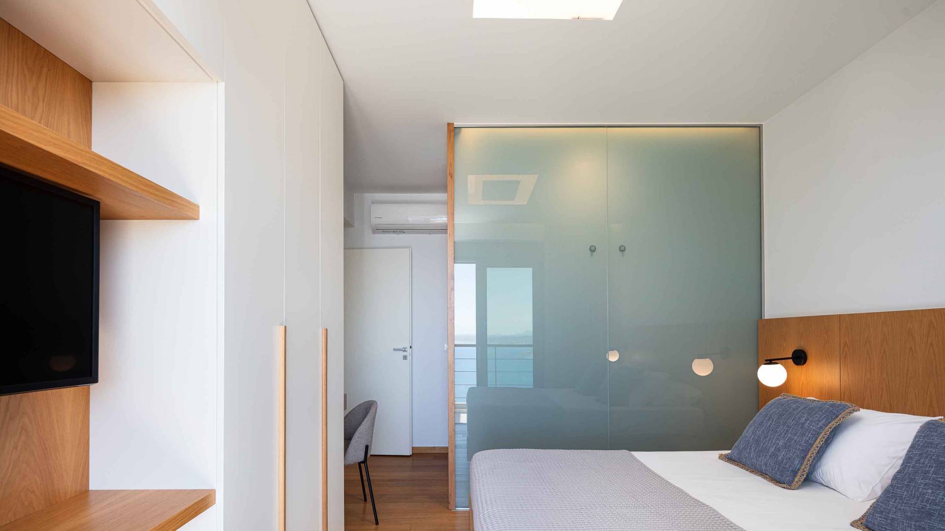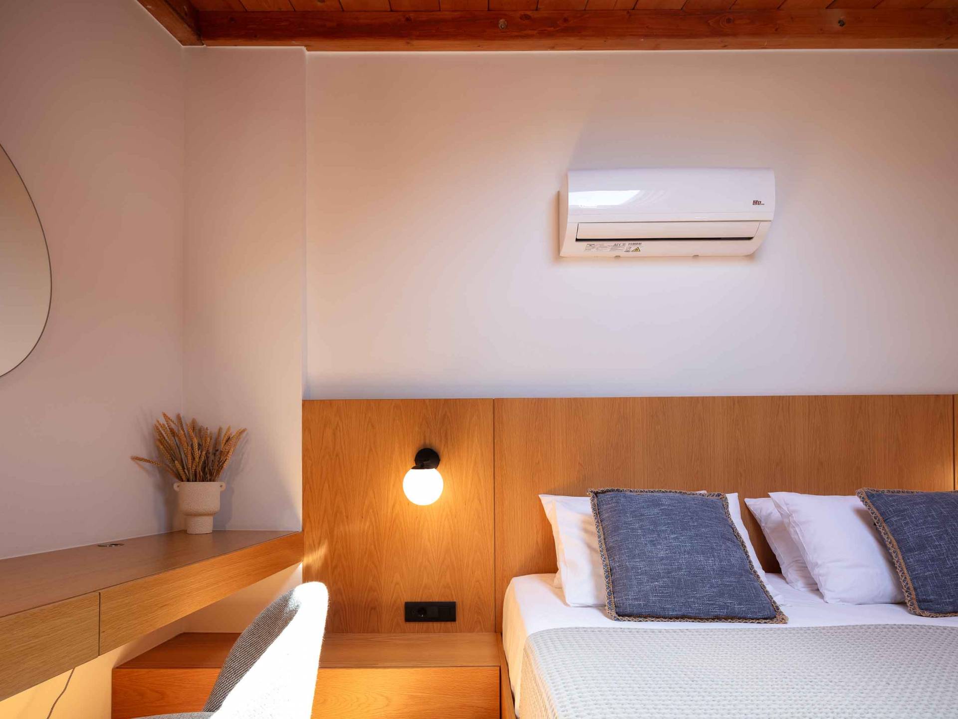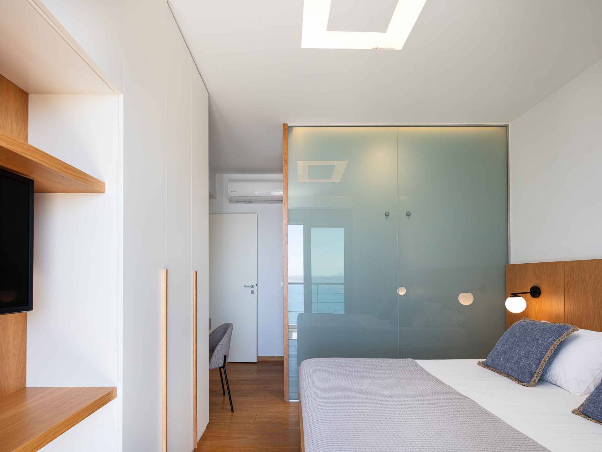 Les trois chambres de la villa sont situées au premier et au deuxième étage. La première chambre est située au premier étage avec un lit double et une salle de bain attenante avec baignoire. Au deuxième étage, il y a une chambre avec un lit double et une salle de bain attenante avec douche tandis que la dernière chambre a un lit king-size, un canapé-lit qui peut être converti en deux lits simples avec un matelas de haute qualité , et une salle de bain attenante avec douche. Chaque chambre dispose d'un accès direct aux balcons, d'une télévision connectée avec chaînes satellite, d'une connexion Wi-Fi gratuite, d'articles de toilette, de draps et de serviettes pour tous les invités, d'un sèche-cheveux et de matelas de haute qualité.