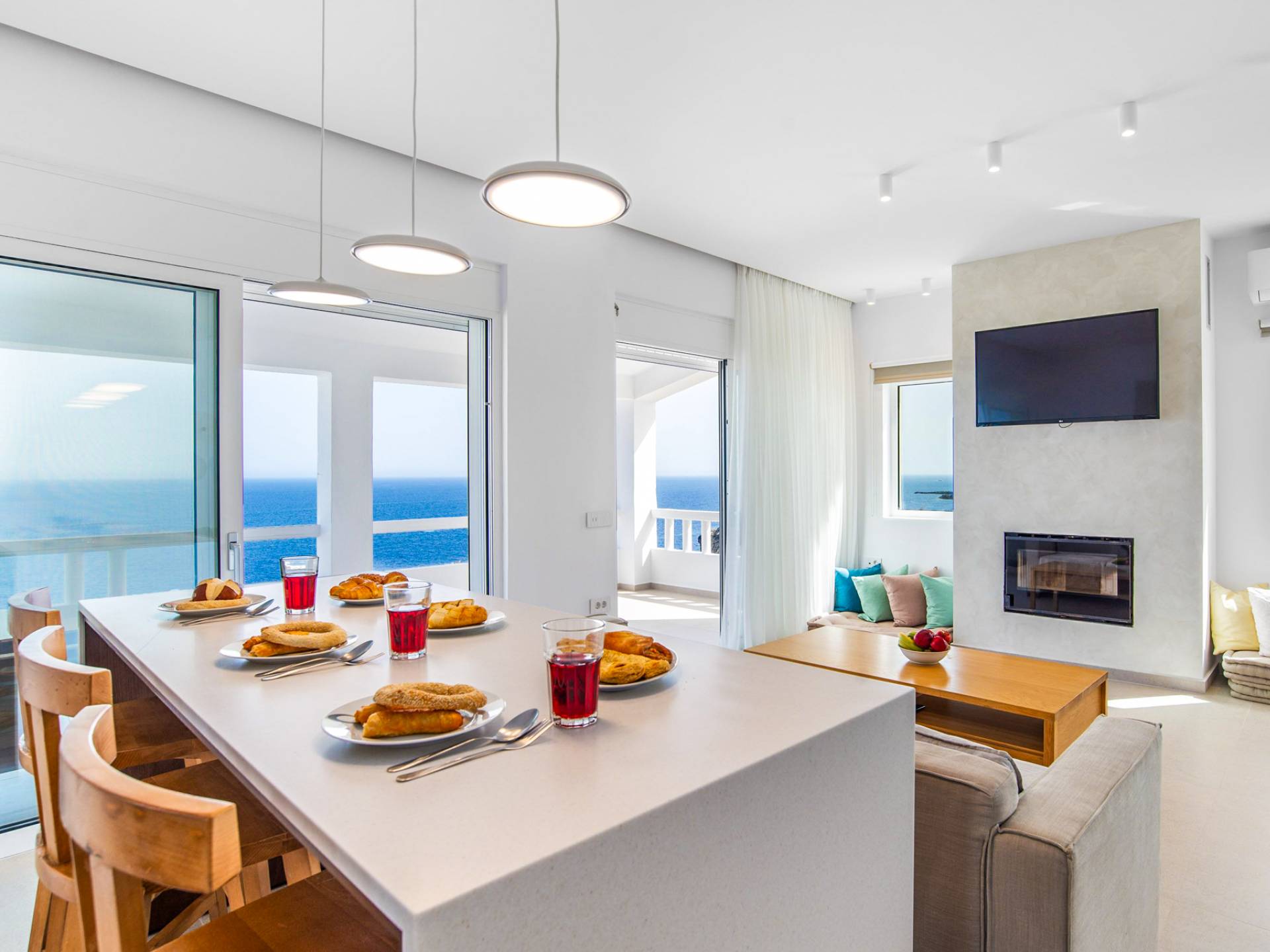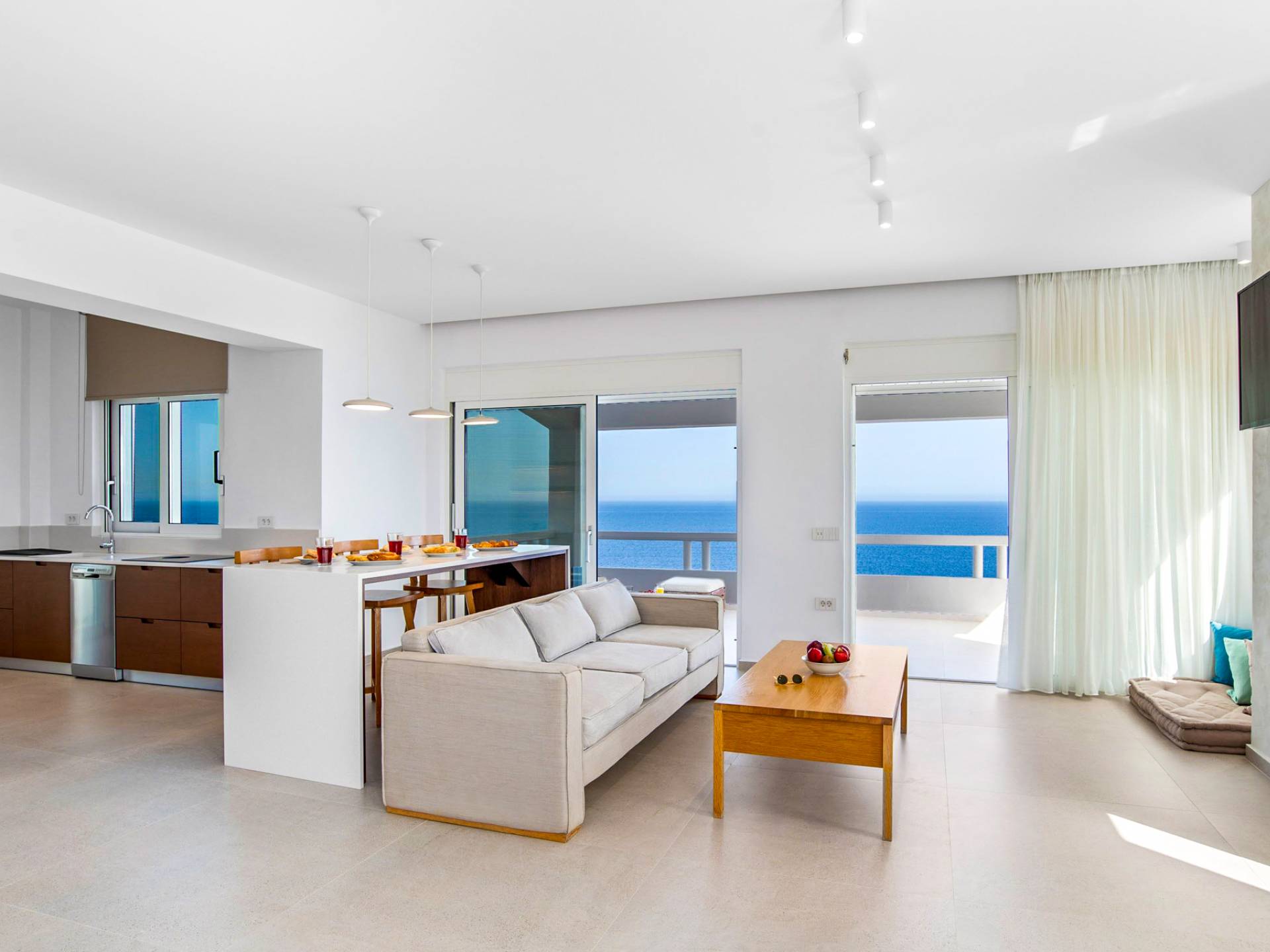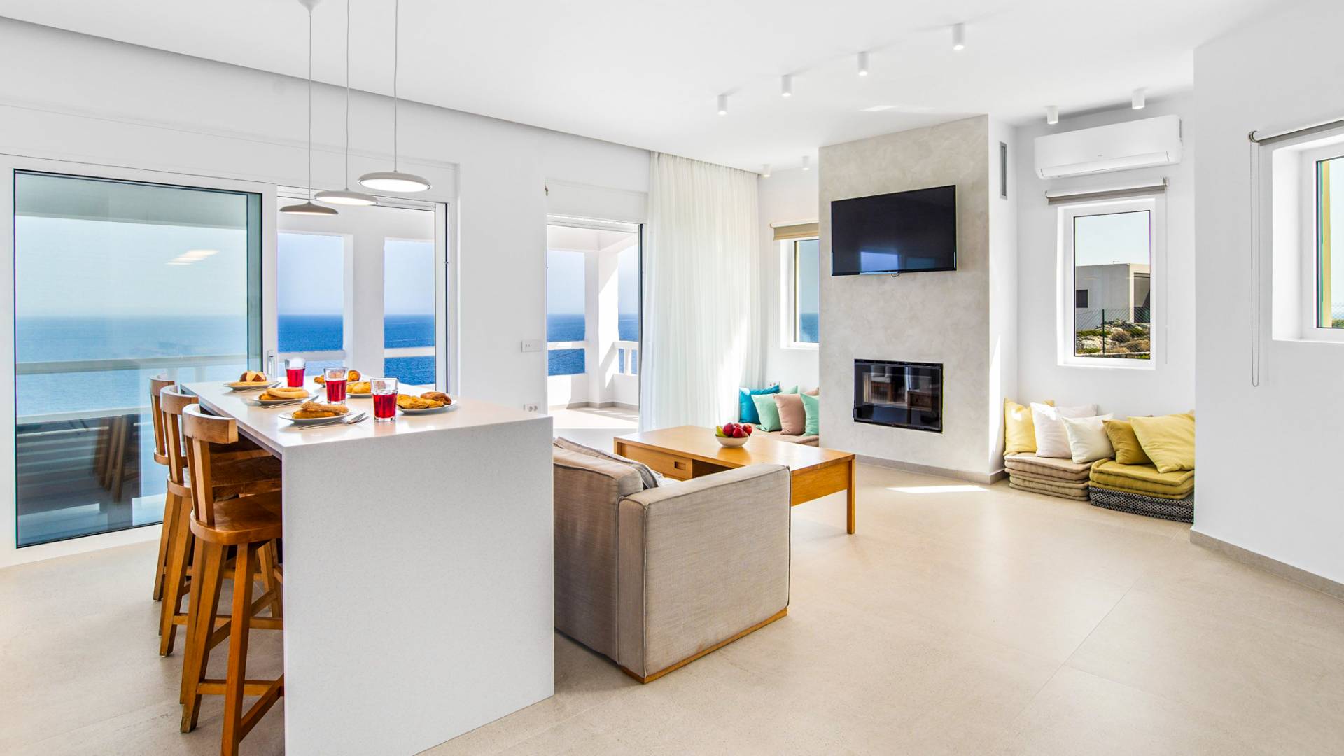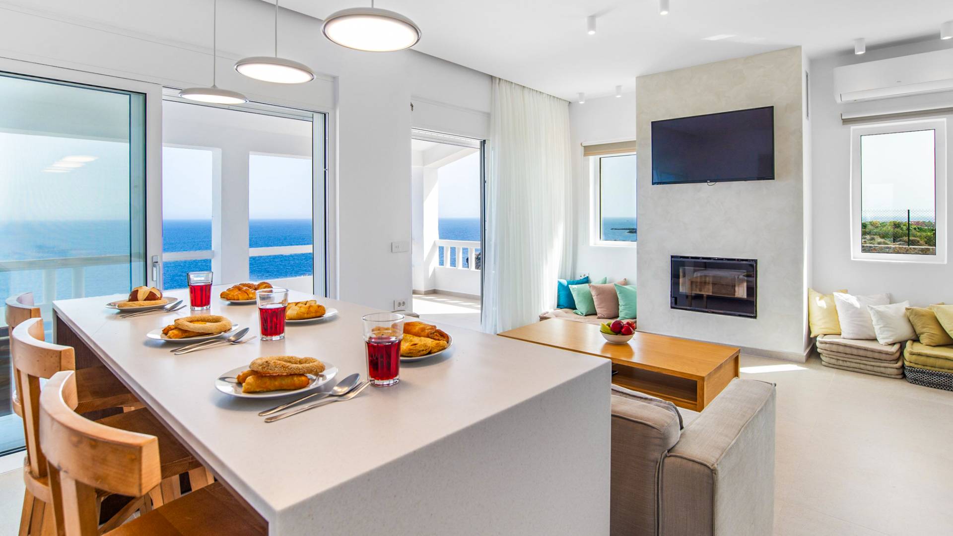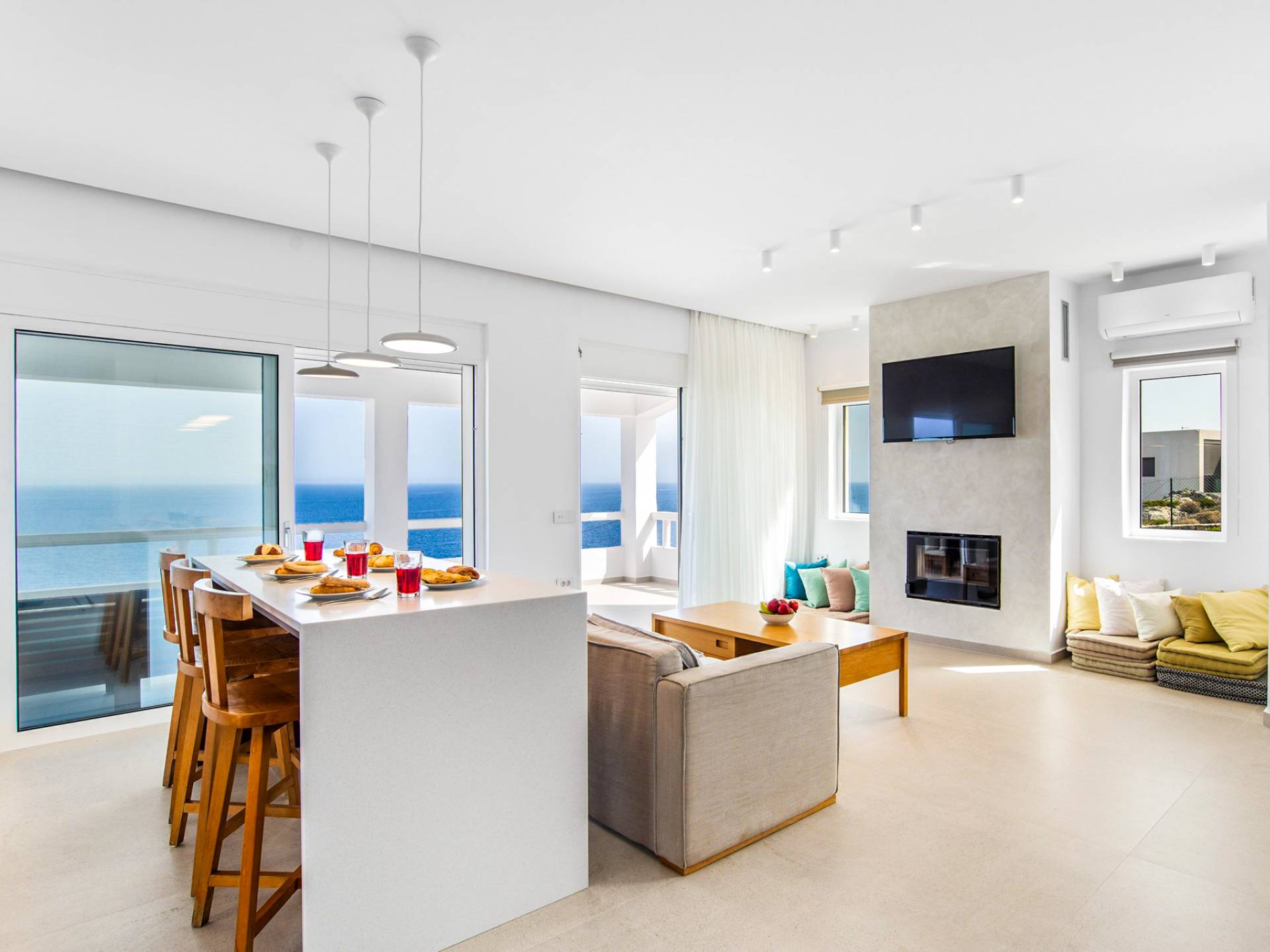 Le salon doté d'une cheminée est meublé avec goût avec des canapés et des fauteuils confortables, une large fenêtre vitrée avec deux portes mène à un immense balcon avec une vue à couper le souffle. Chaque appartement dispose en outre d'un lave-vaisselle et d'un lave-linge dans la plus grande des deux salles de bains. Avec une brise constante pour laquelle la Crète est bien connue, Passion Villa Chania ne se sent jamais étouffante et pourtant la climatisation est fournie dans chaque pièce.