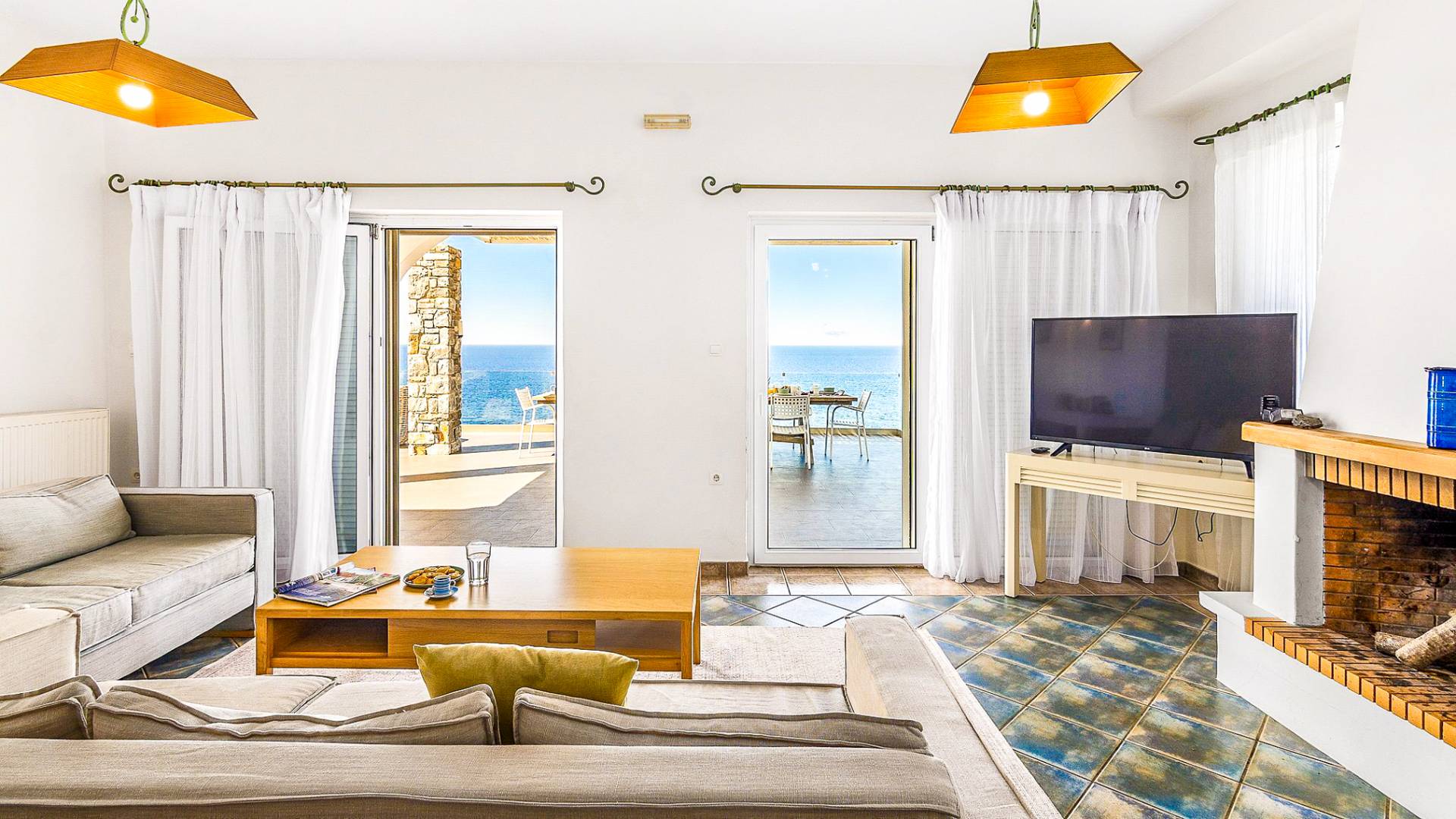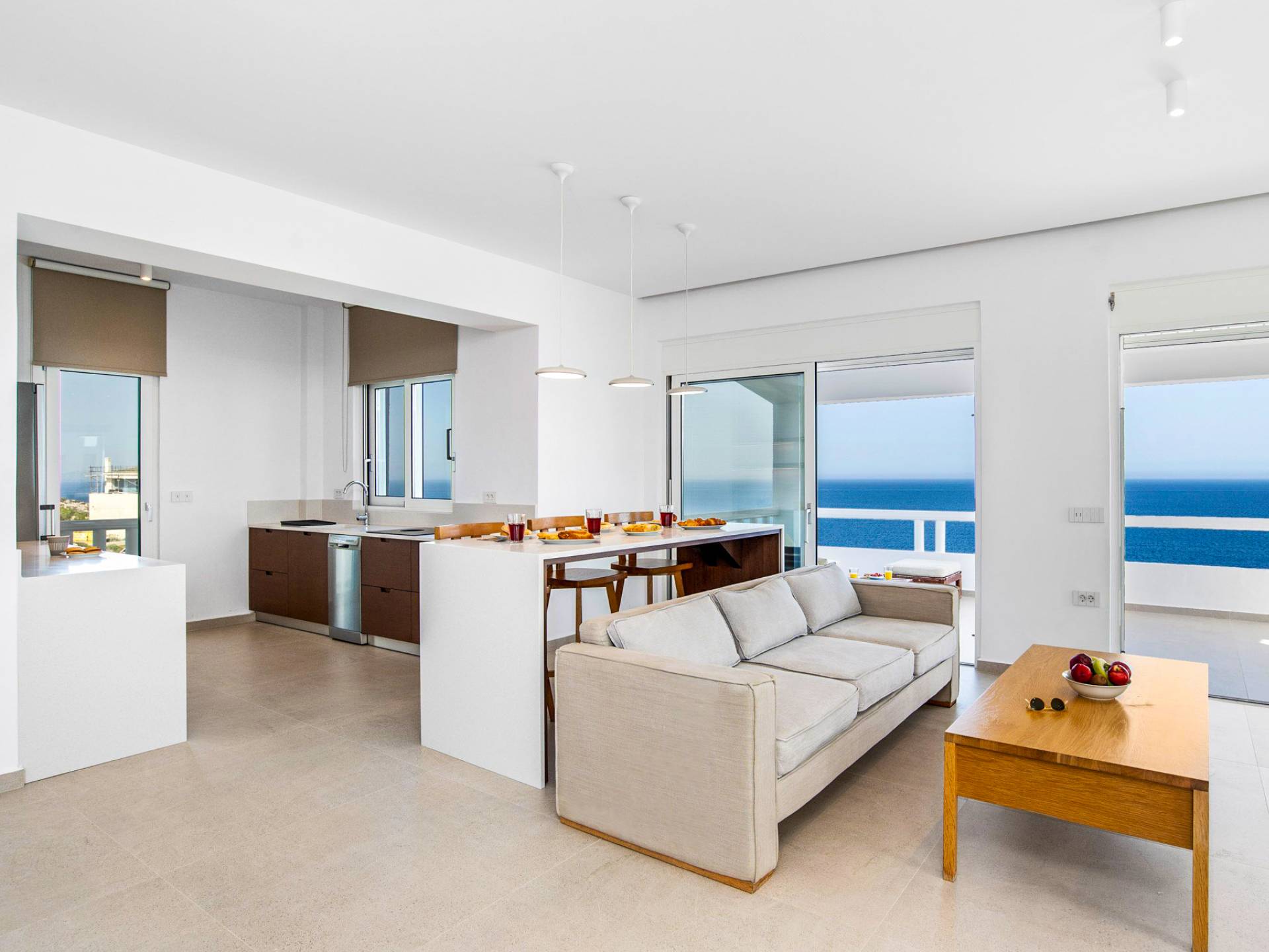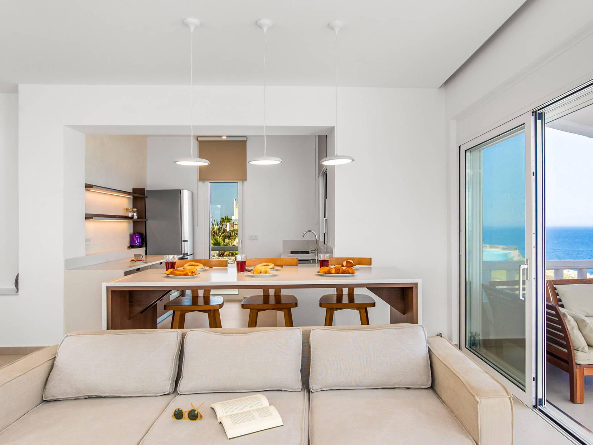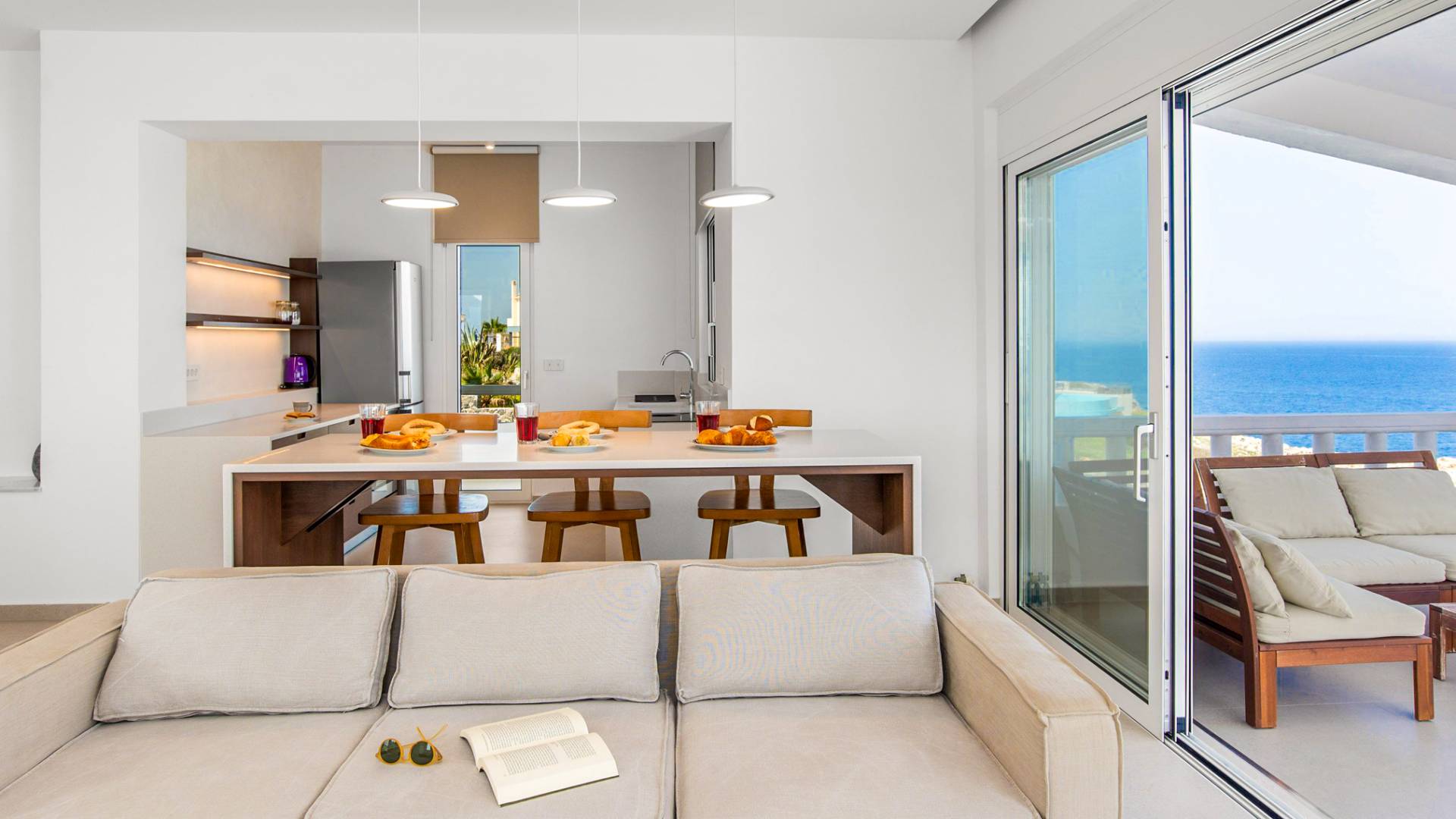 Le salon doté d'une cheminée est meublé avec goût avec des canapés et des fauteuils confortables, une large fenêtre vitrée avec deux portes mène à un immense balcon avec une vue à couper le souffle. Chaque appartement dispose en outre d'un lave-vaisselle et d'un lave-linge dans la plus grande des deux salles de bains. Avec une brise constante pour laquelle la Crète est bien connue, Passion Villa Chania ne se sent jamais étouffante et pourtant la climatisation est fournie dans chaque pièce.