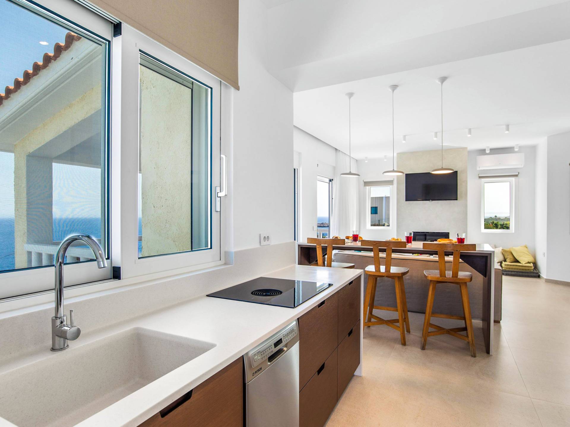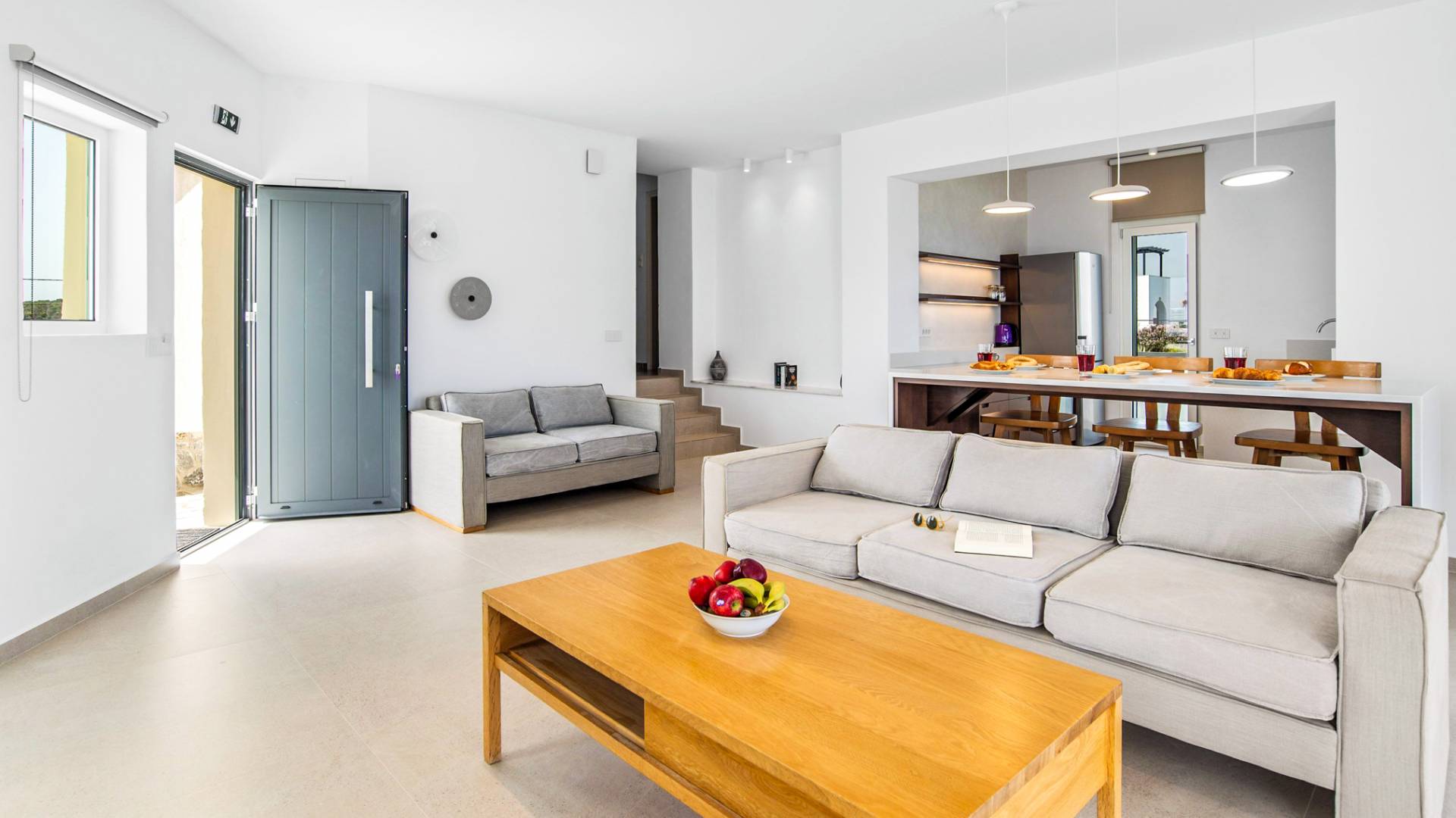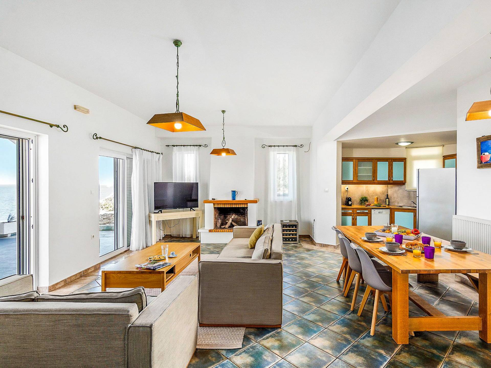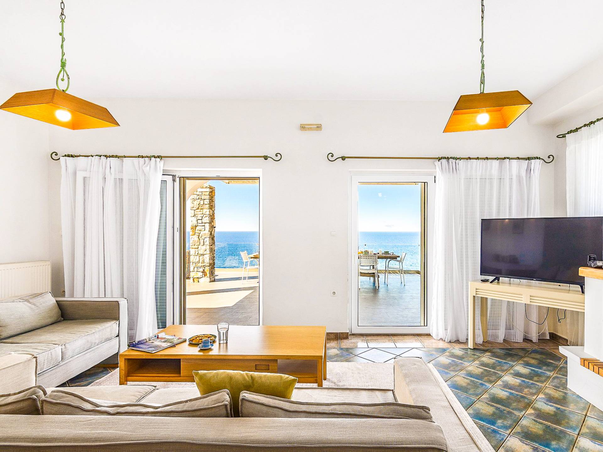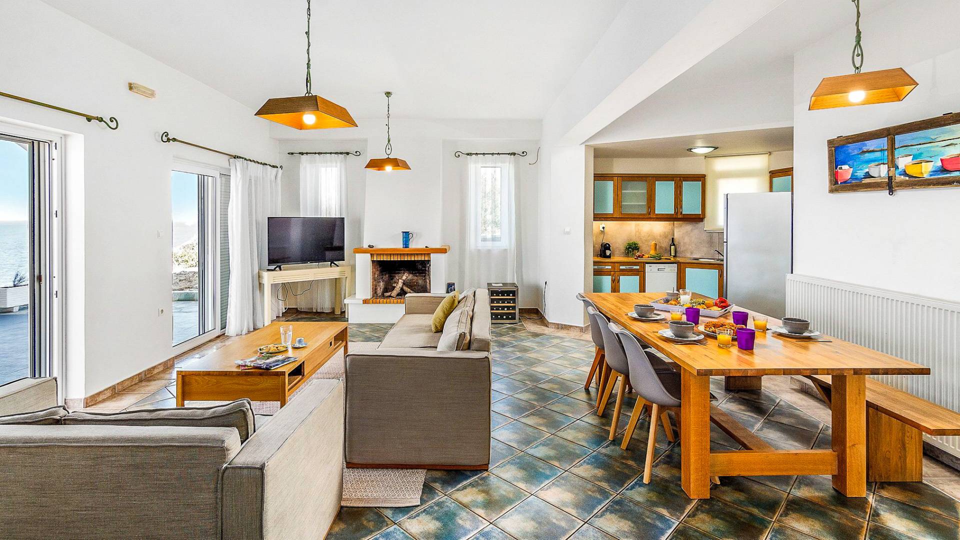 Le salon doté d'une cheminée est meublé avec goût avec des canapés et des fauteuils confortables, une large fenêtre vitrée avec deux portes mène à un immense balcon avec une vue à couper le souffle. Chaque appartement dispose en outre d'un lave-vaisselle et d'un lave-linge dans la plus grande des deux salles de bains. Avec une brise constante pour laquelle la Crète est bien connue, Passion Villa Chania ne se sent jamais étouffante et pourtant la climatisation est fournie dans chaque pièce.