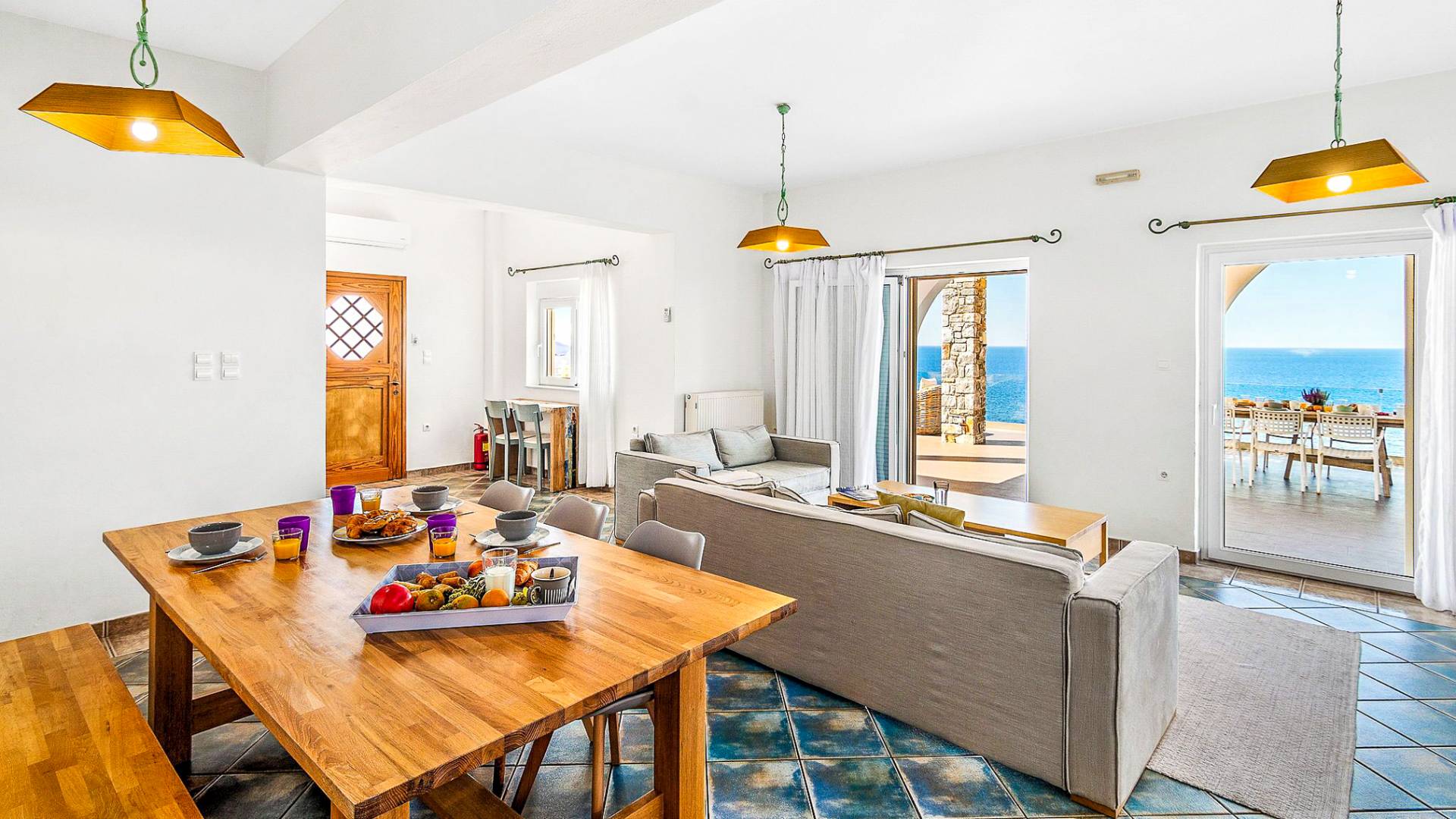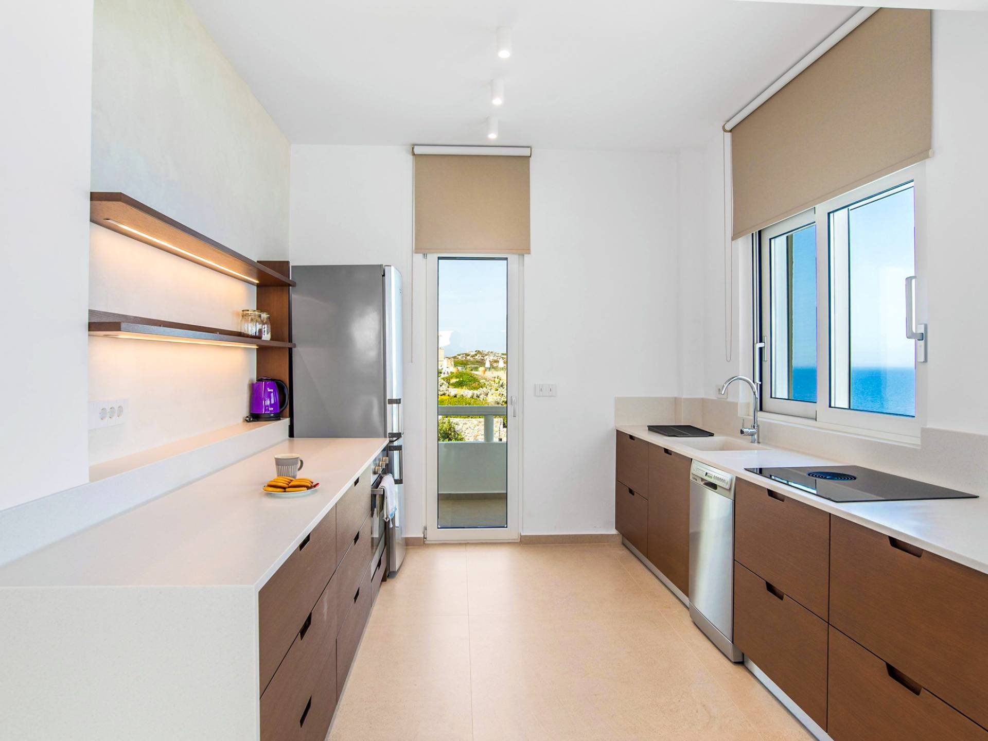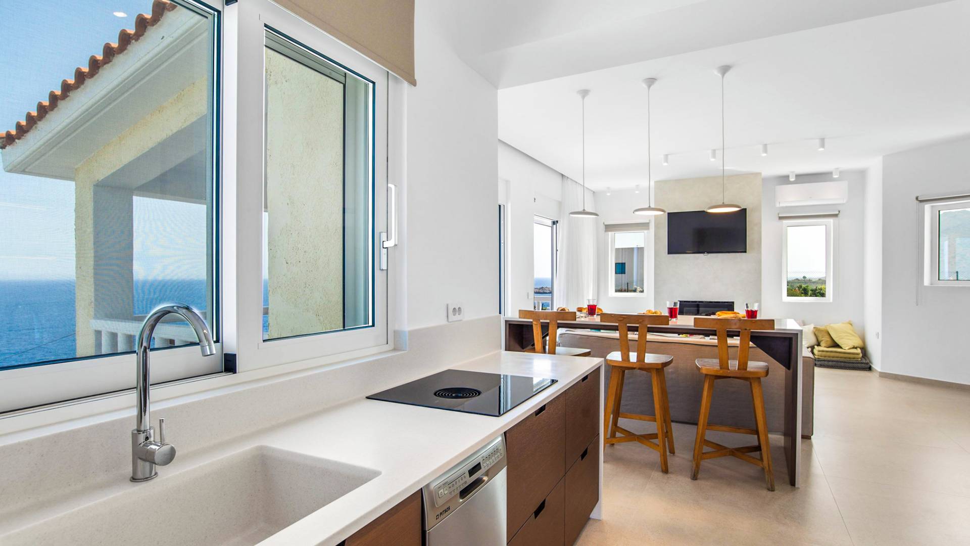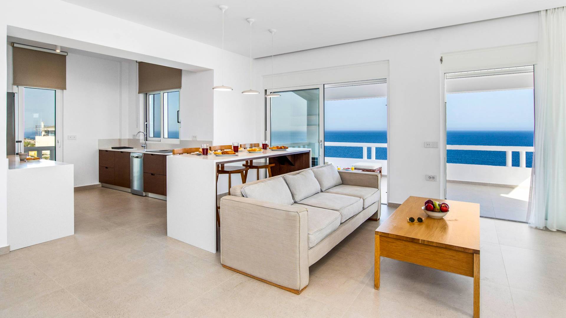 Le salon doté d'une cheminée est meublé avec goût avec des canapés et des fauteuils confortables, une large fenêtre vitrée avec deux portes mène à un immense balcon avec une vue à couper le souffle. Chaque appartement dispose en outre d'un lave-vaisselle et d'un lave-linge dans la plus grande des deux salles de bains. Avec une brise constante pour laquelle la Crète est bien connue, Passion Villa Chania ne se sent jamais étouffante et pourtant la climatisation est fournie dans chaque pièce.