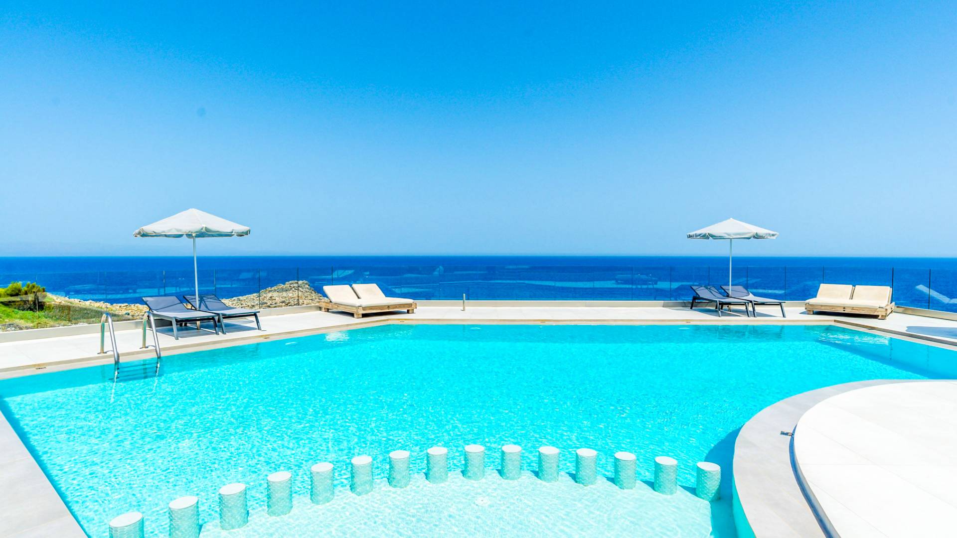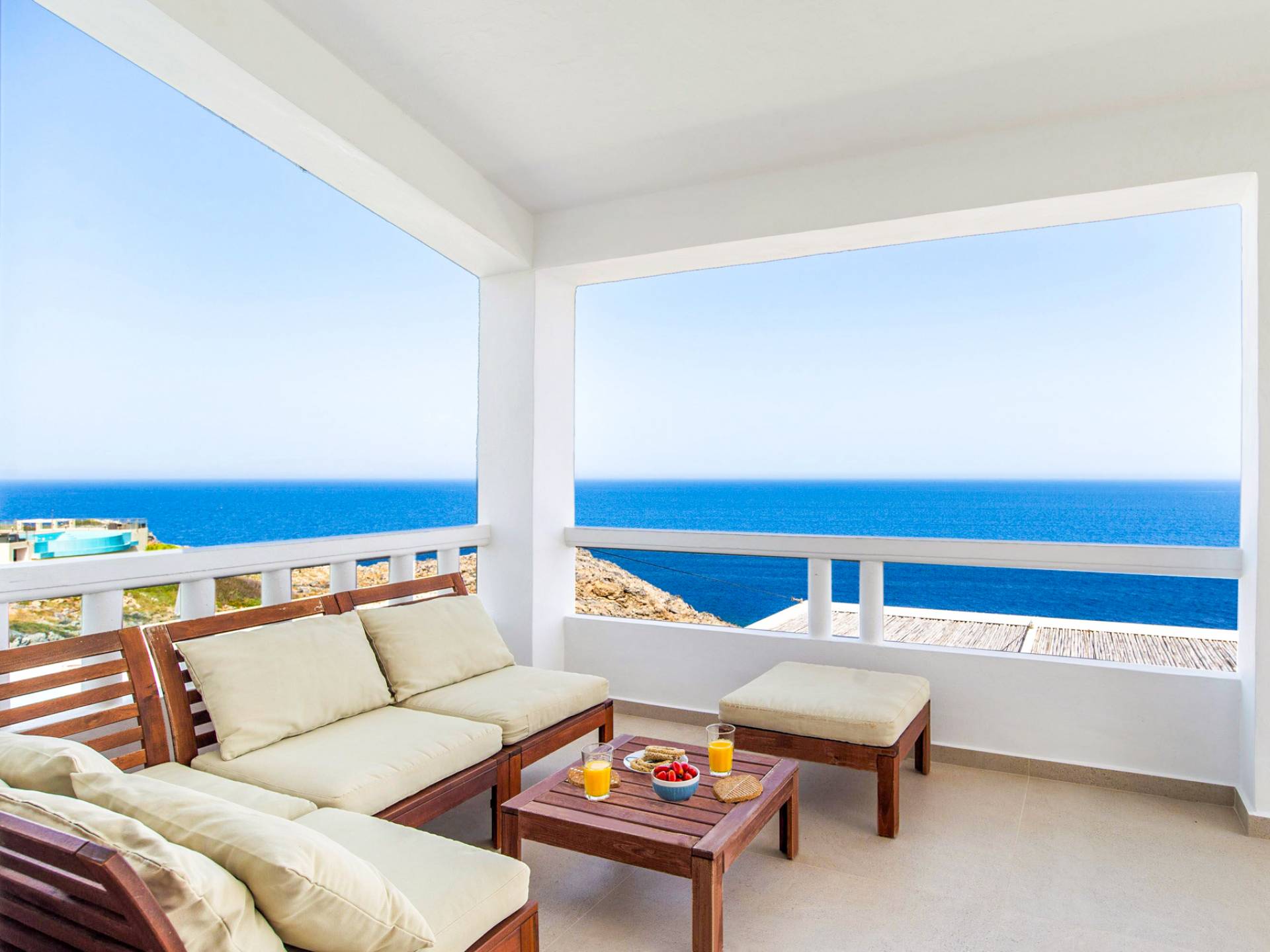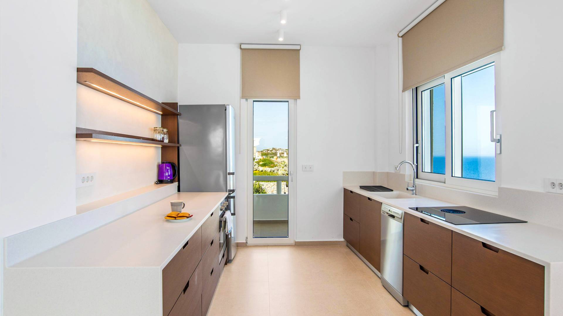 La piscine est située dans les rochers d'un côté et est accessible par un chemin commun depuis la maison. Que vous vous prélassiez sur les terrasses autour de la piscine ou que vous vous détendiez sur les spacieux balcons privés, les vues sont fabuleuses et le silence n'est rompu que par les vagues contre le rivage rocheux en contrebas. Le niveau des intérieurs est élevé, chaque appartement se compose de deux salles de bains, une avec douche et une avec baignoire, trois chambres de bonne taille, deux doubles et une twin, certaines chambres ont un balcon, un spacieux salon/salle à manger avec un cuisine dans une partie à côté du salon.