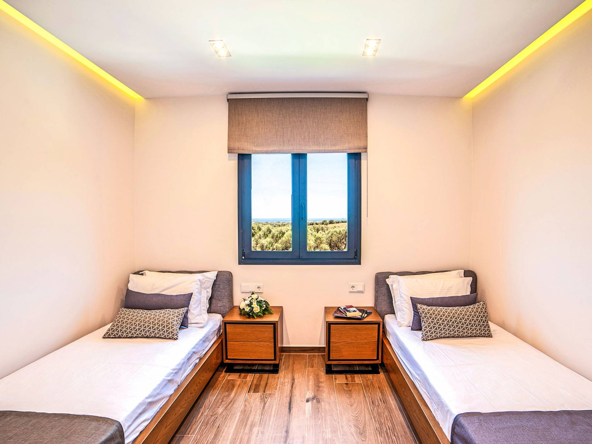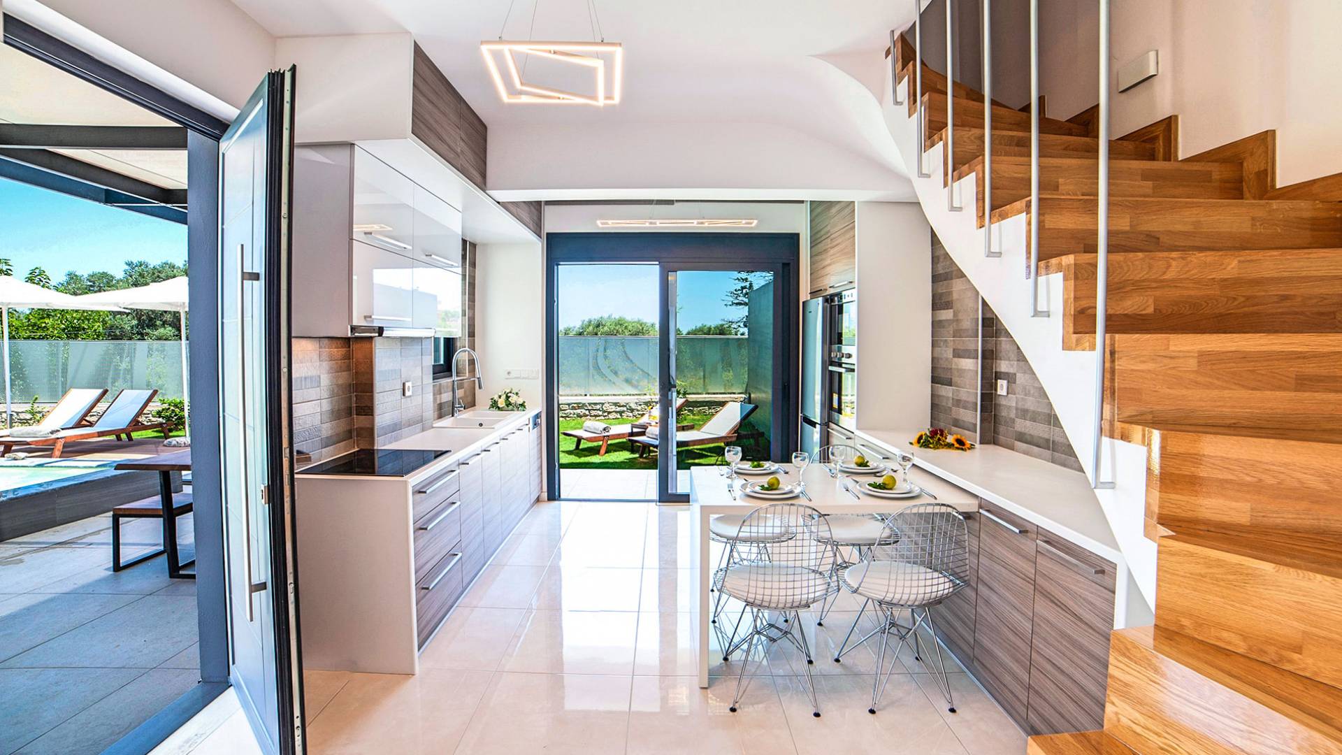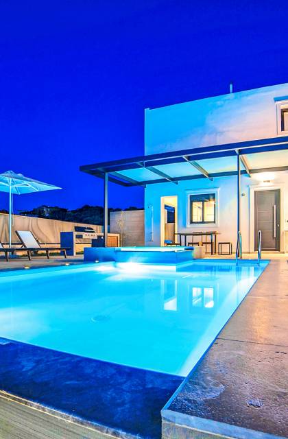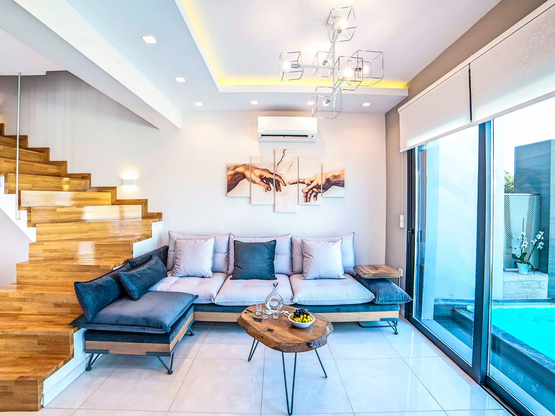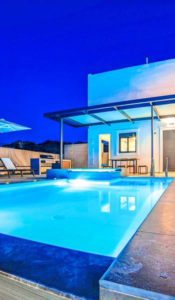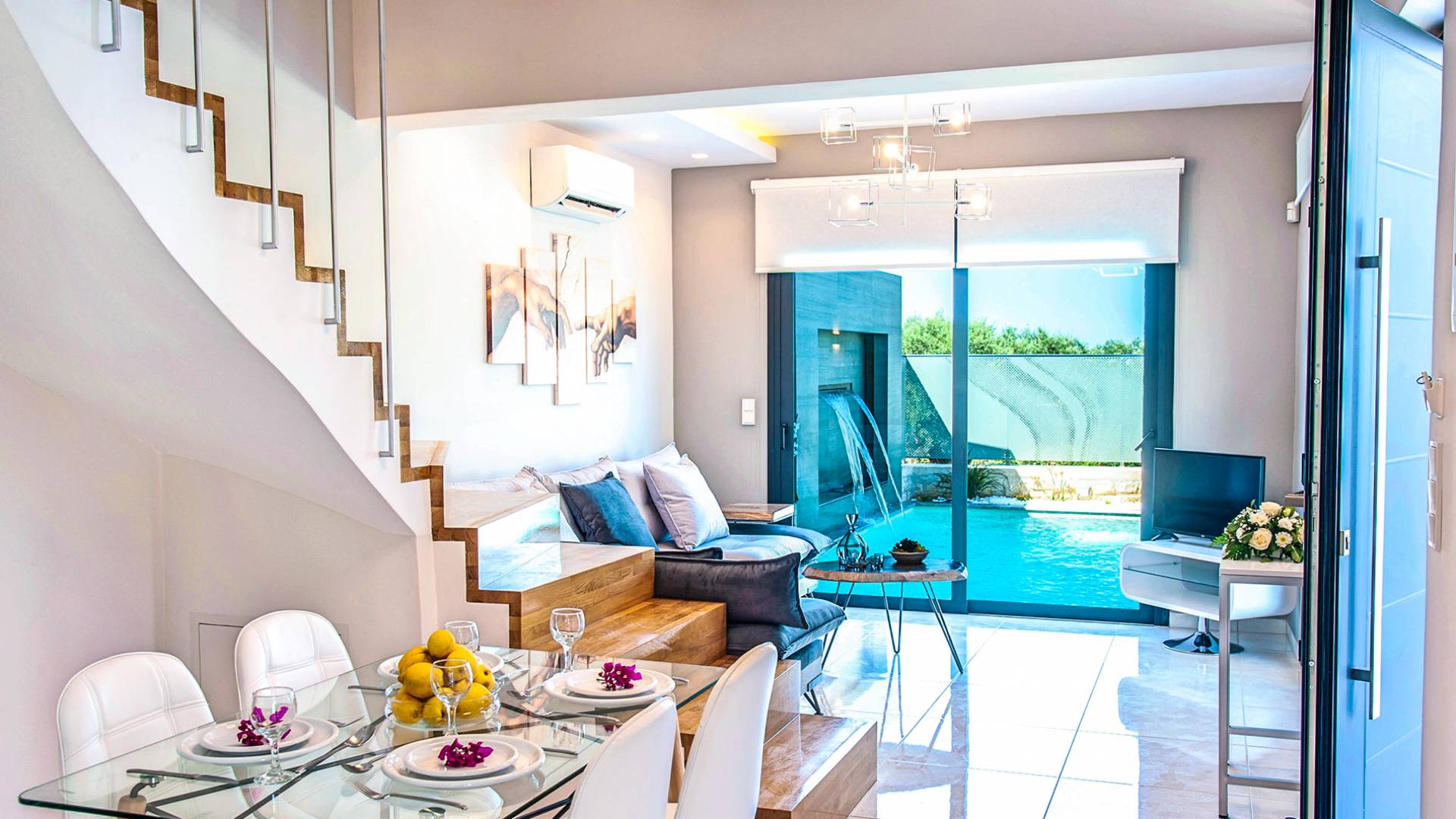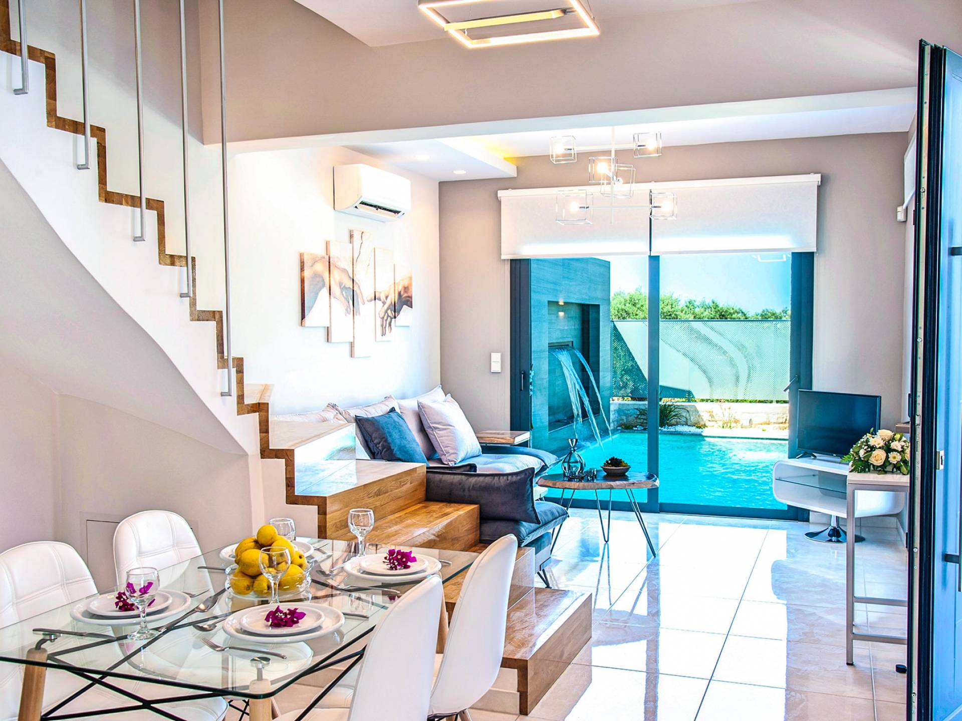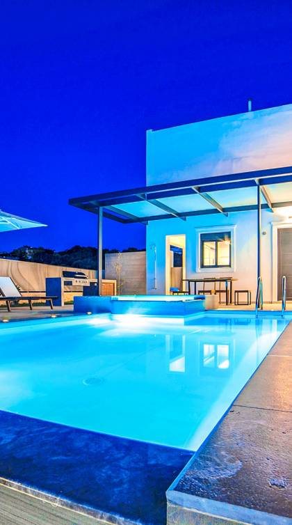 Une intimité maximale, des installations enrichies et une piscine privée en cascade avec jacuzzi complètent l'escapade la plus inoubliable et offrent un espace de vie décloisonné avec des chaises longues flottantes, un barbecue et un coin repas. À l'intérieur de chaque villa, l'étage supérieur comprend deux chambres spacieuses, une avec des lits queen-size, une deuxième chambre avec des lits jumeaux rapprochés et une salle de bains élégante avec douche. Une cuisine moderne entièrement équipée avec un coin repas se trouve au niveau inférieur de chaque villa, combinée à une salle de bain luxueuse et un coin salon attenant avec un canapé d'angle et tout cela avec un accès direct à la piscine. Perla Estate est idéal pour les familles, un groupe de familles ou un groupe d'amis. Profitez de vos vacances avec vos parents ou avec le reste de votre famille tout en préservant votre intimité comme chez vous.