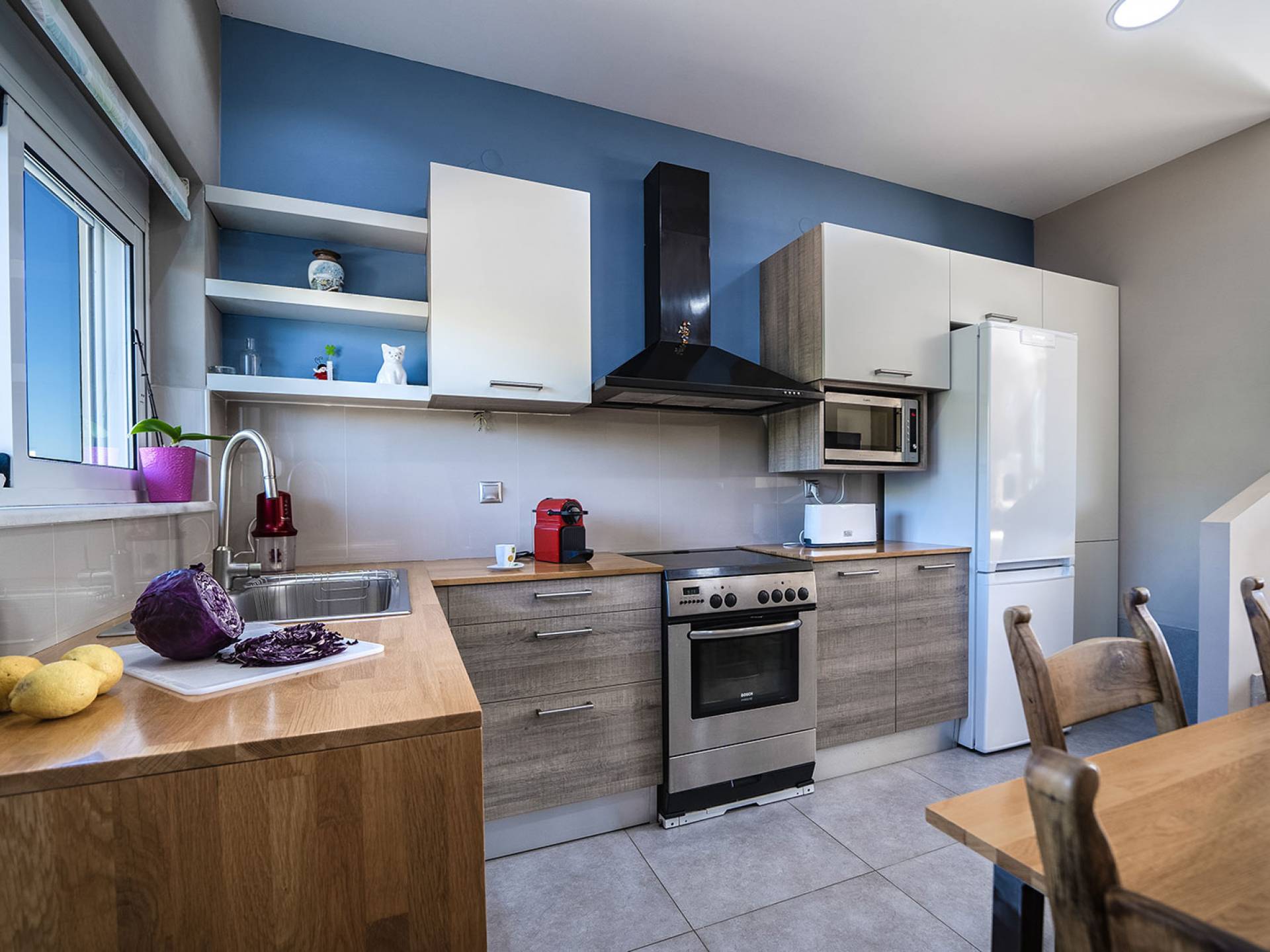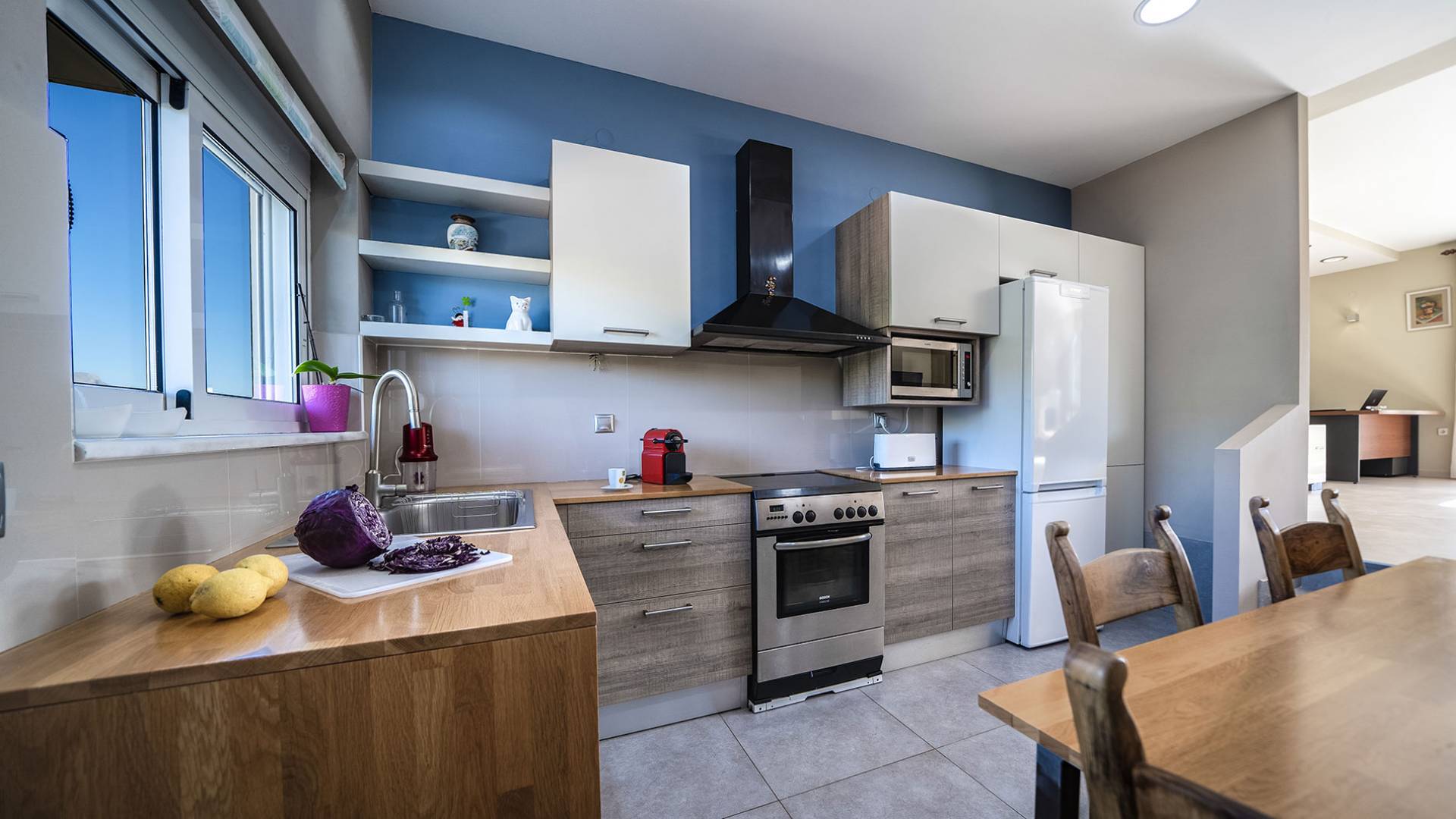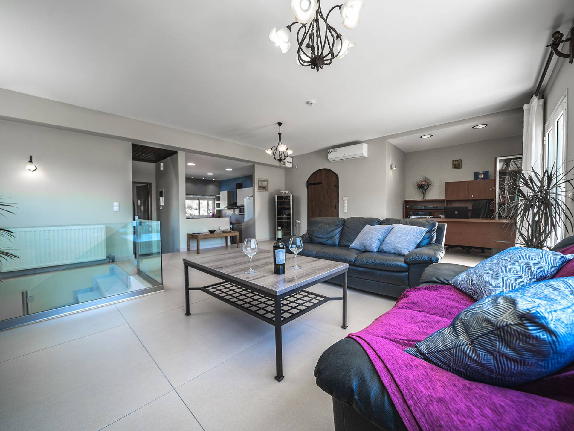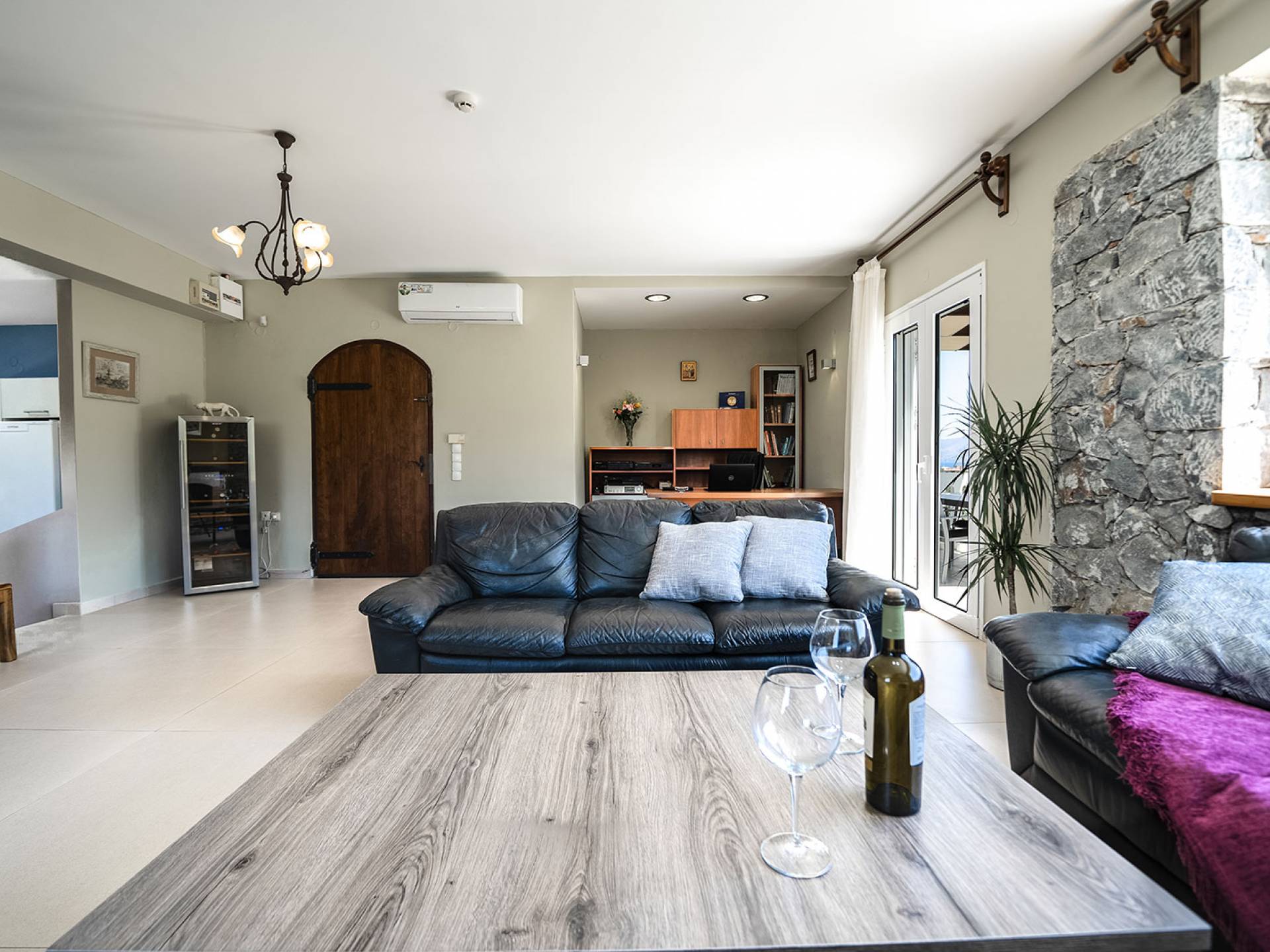 Au premier étage, il y a un salon spacieux, une cuisine entièrement équipée avec un micro-ondes et un lave-vaisselle, une chambre et des toilettes. Il y a aussi un espace de travail spécialement conçu avec un équipement de bureau complet avec wi-fi et une imprimante. Dans le salon, il y a une cave à vin au sol où vous aurez à votre disposition 15 étiquettes de vins gratuites. Au rez-de-chaussée de la maison, il y a 3 chambres, un WC confortable et un autre WC dans la 3ème chambre.