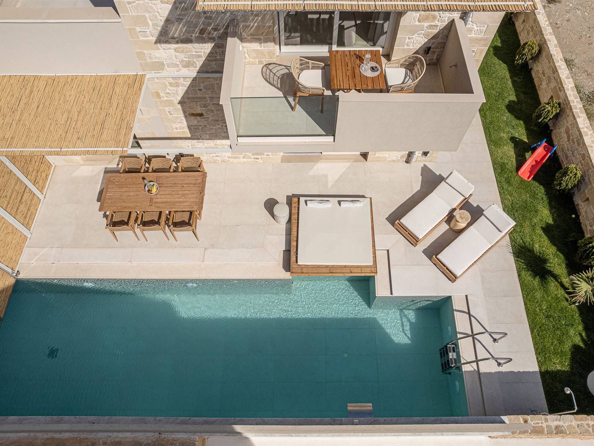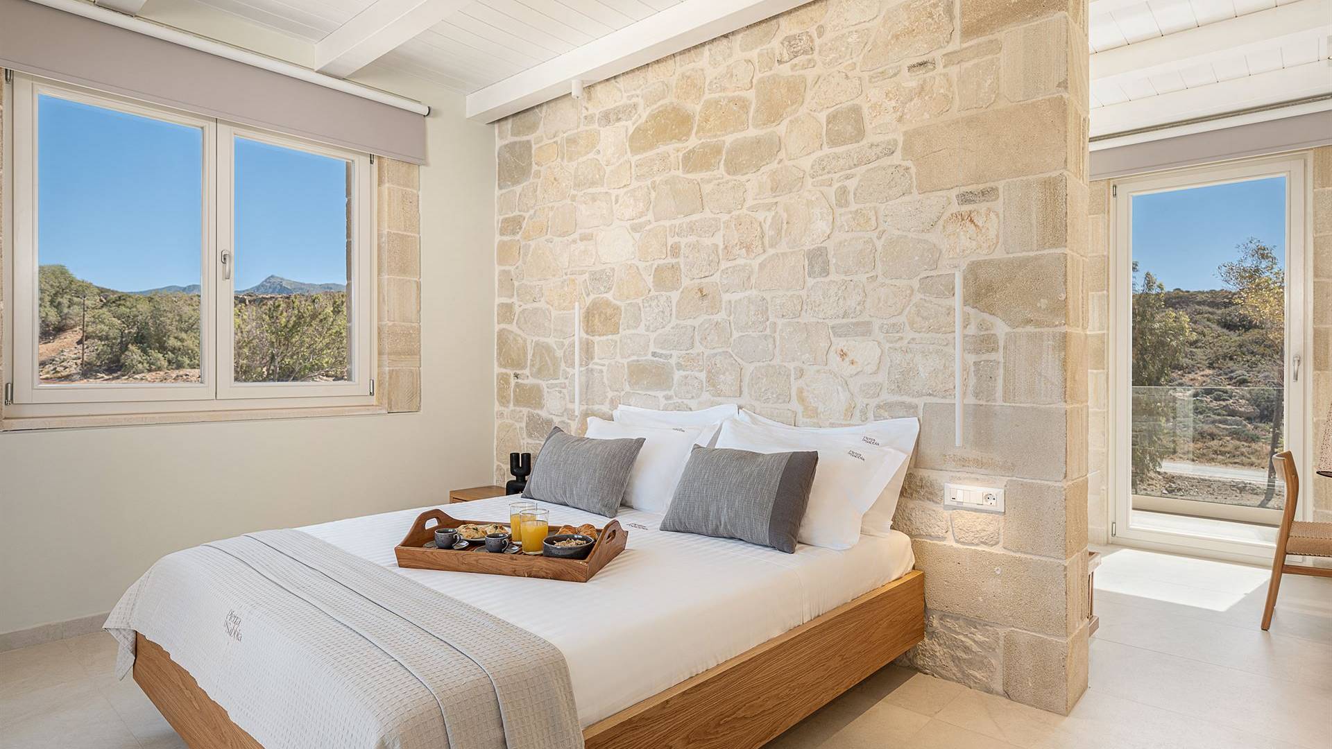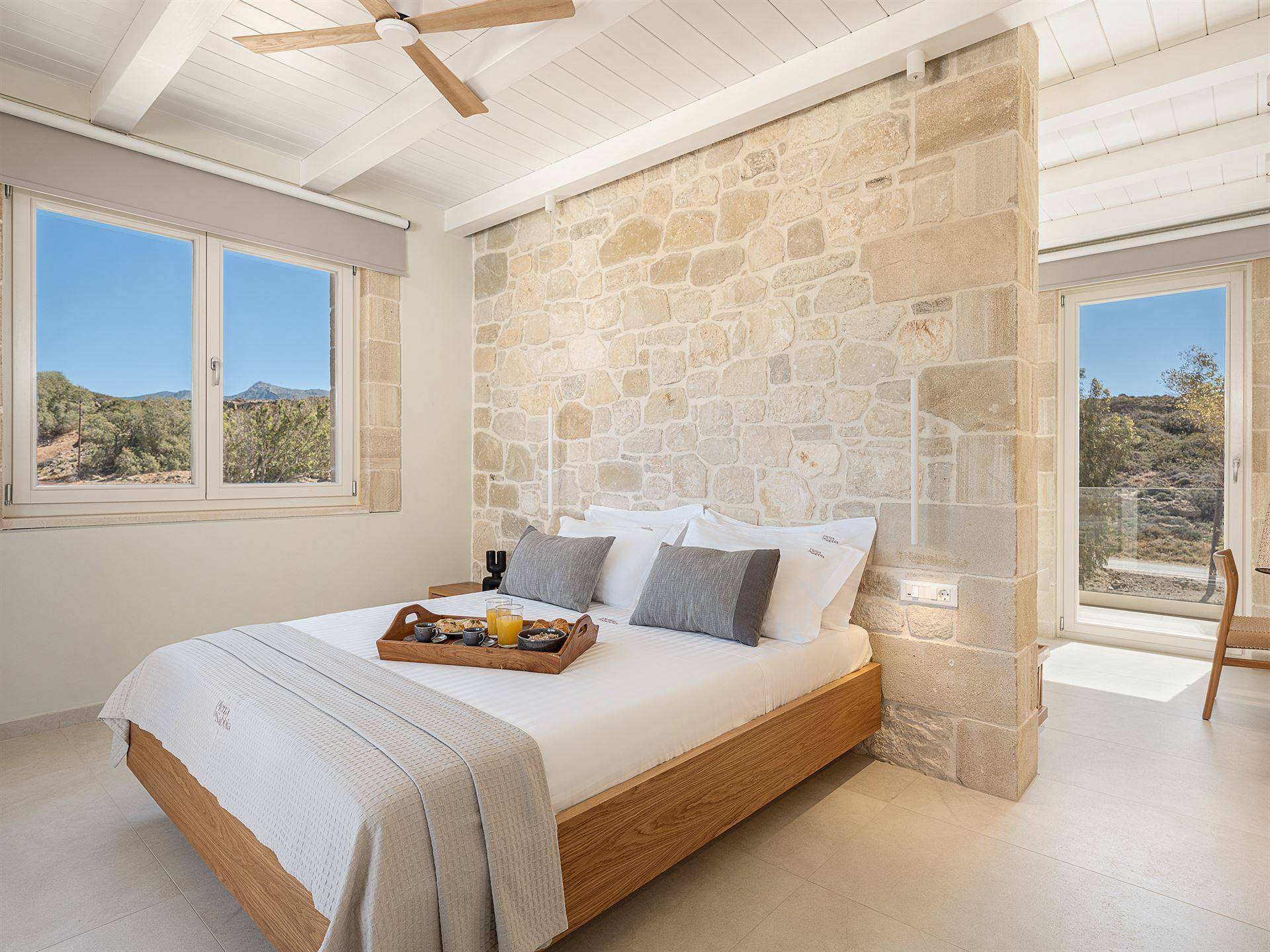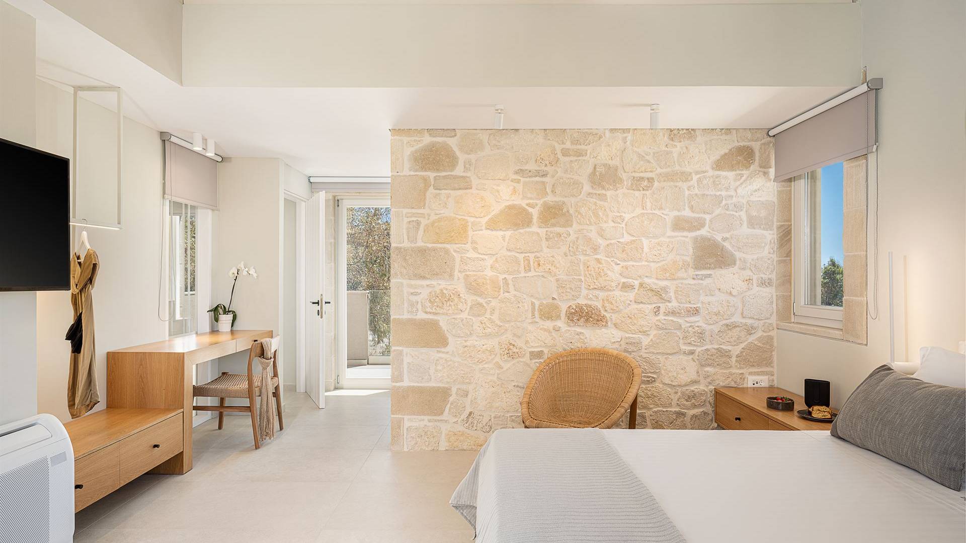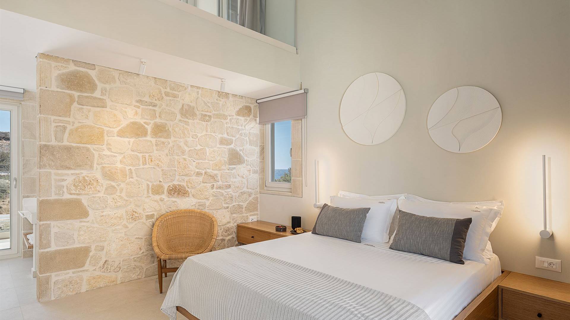 À l'intérieur, l'artisanat crétois traditionnel s'entremêle harmonieusement au design moderne, offrant un mélange harmonieux de confort et d'élégance qui honore la splendeur naturelle qui nous entoure. De vastes espaces de vie ornés de grandes fenêtres fusionnent harmonieusement le magnifique paysage marin avec votre retraite, favorisant une atmosphère sereine propice au rajeunissement du corps et de l'esprit.