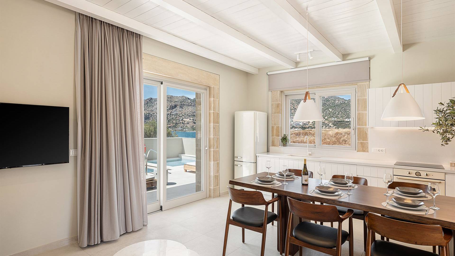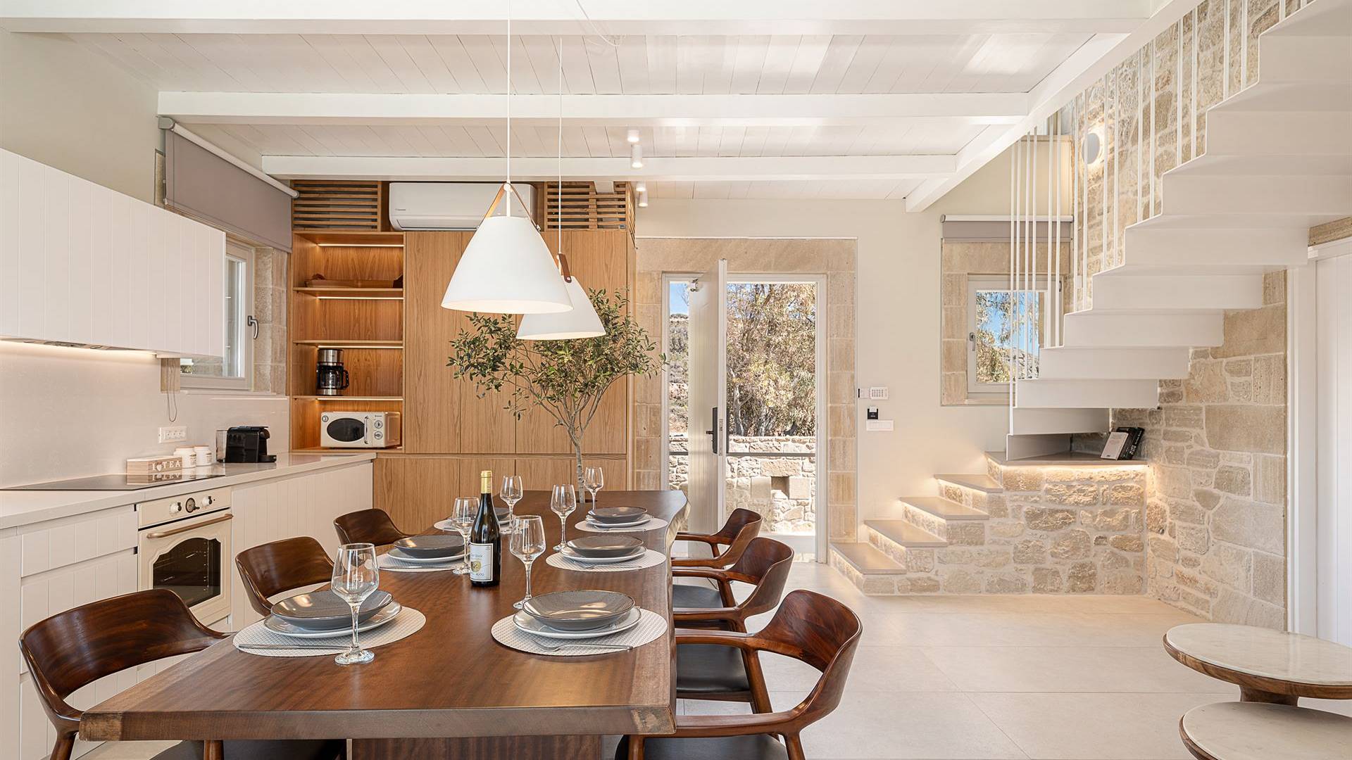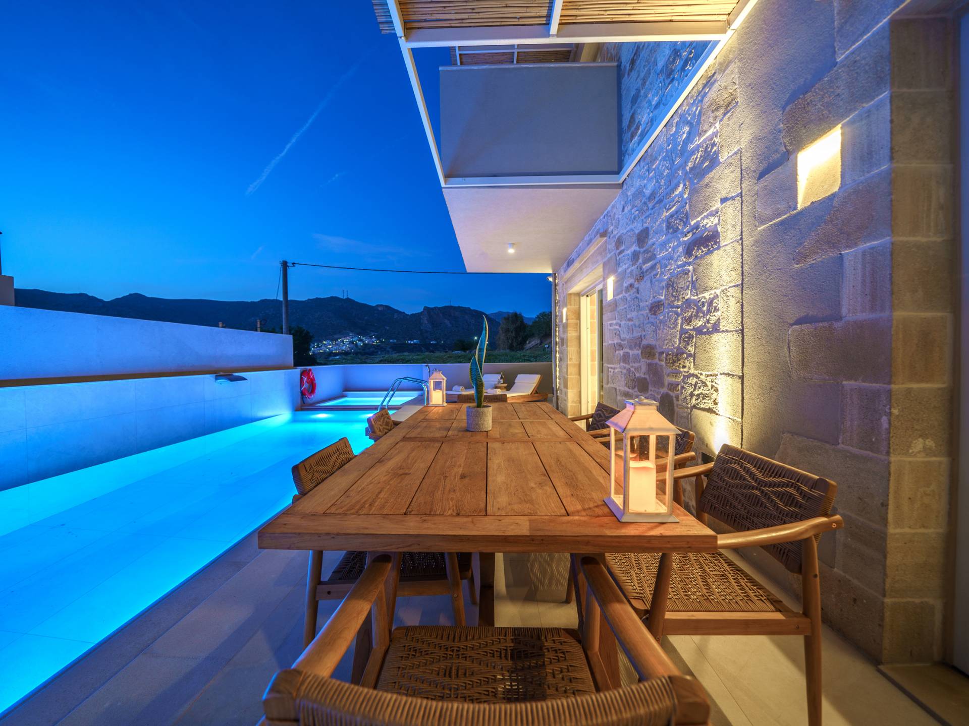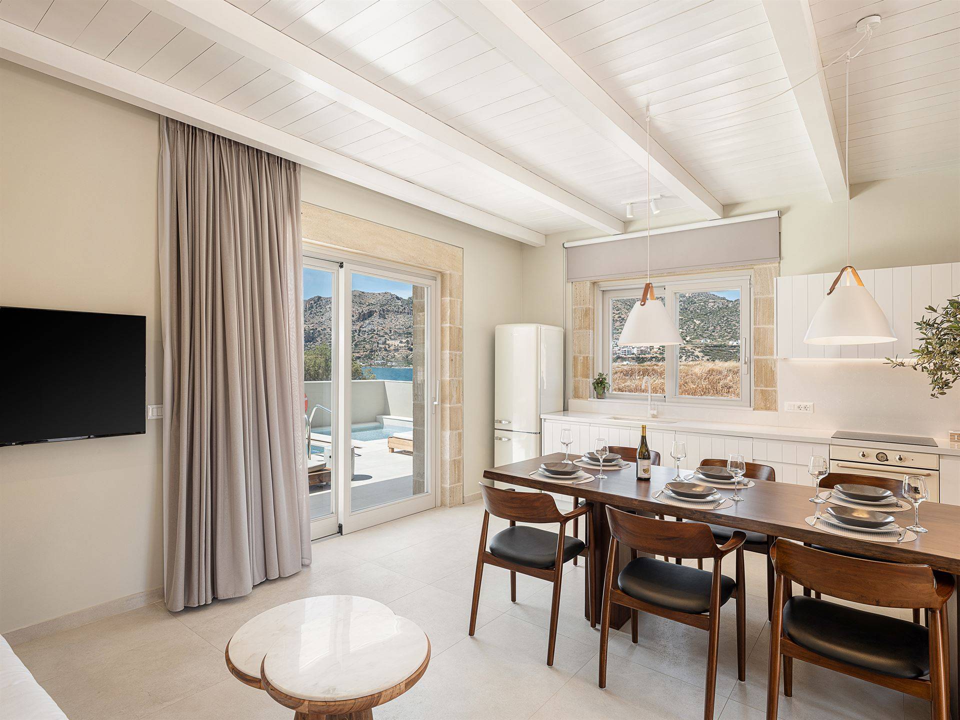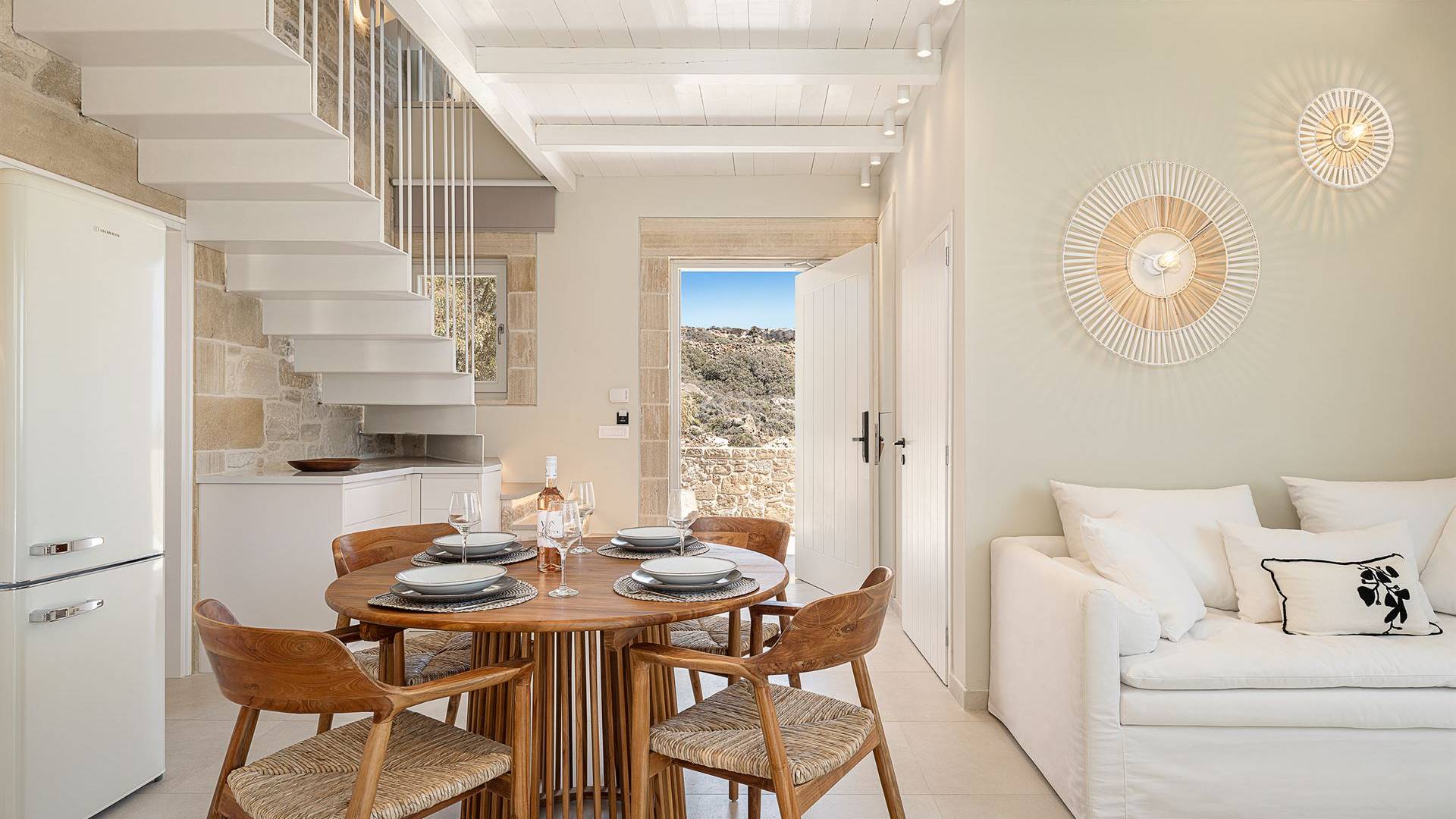 À l'intérieur, l'artisanat crétois traditionnel s'entremêle harmonieusement au design moderne, offrant un mélange harmonieux de confort et d'élégance qui honore la splendeur naturelle qui nous entoure. De vastes espaces de vie ornés de grandes fenêtres fusionnent harmonieusement le magnifique paysage marin avec votre retraite, favorisant une atmosphère sereine propice au rajeunissement du corps et de l'esprit.