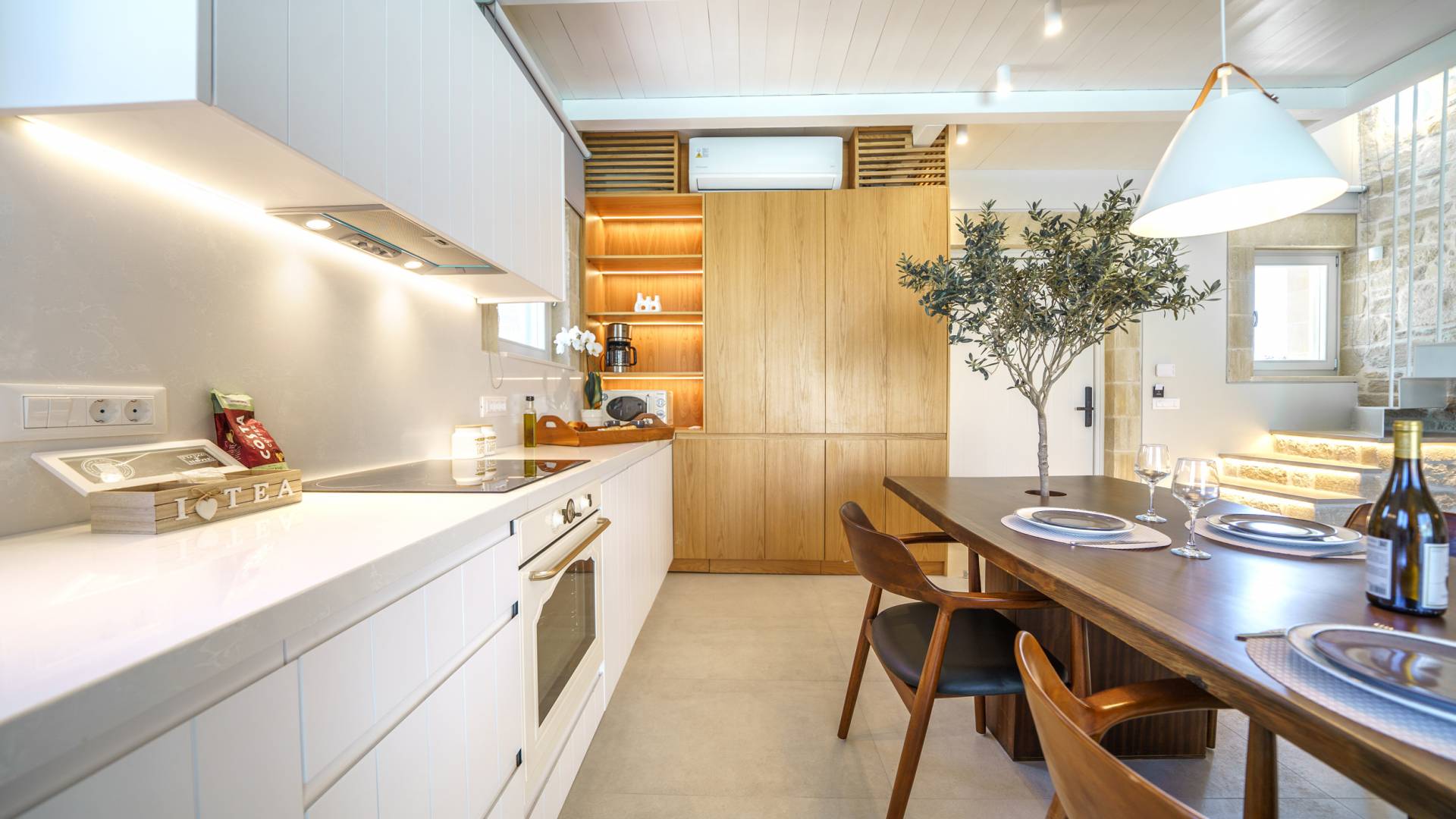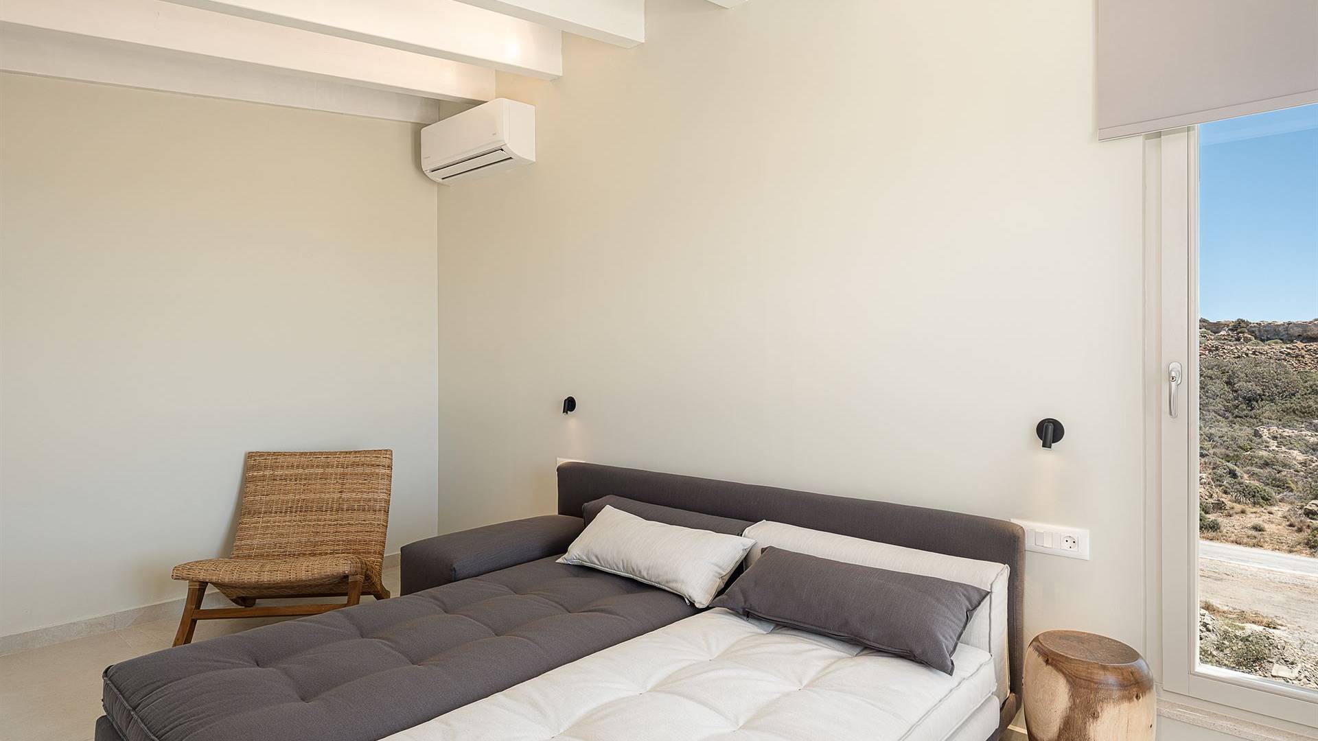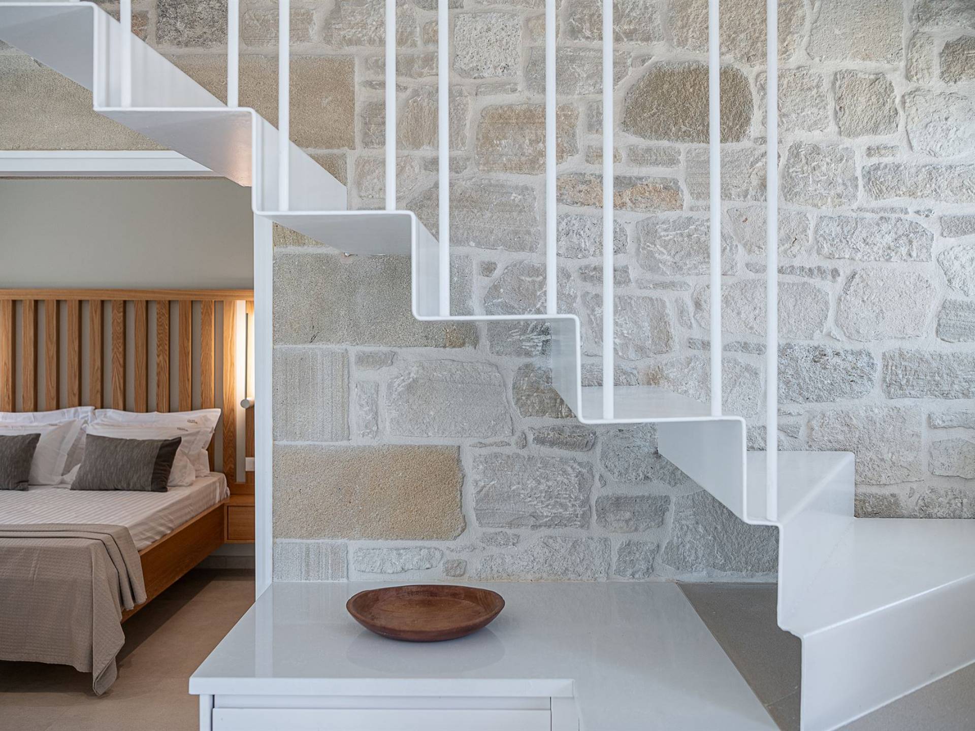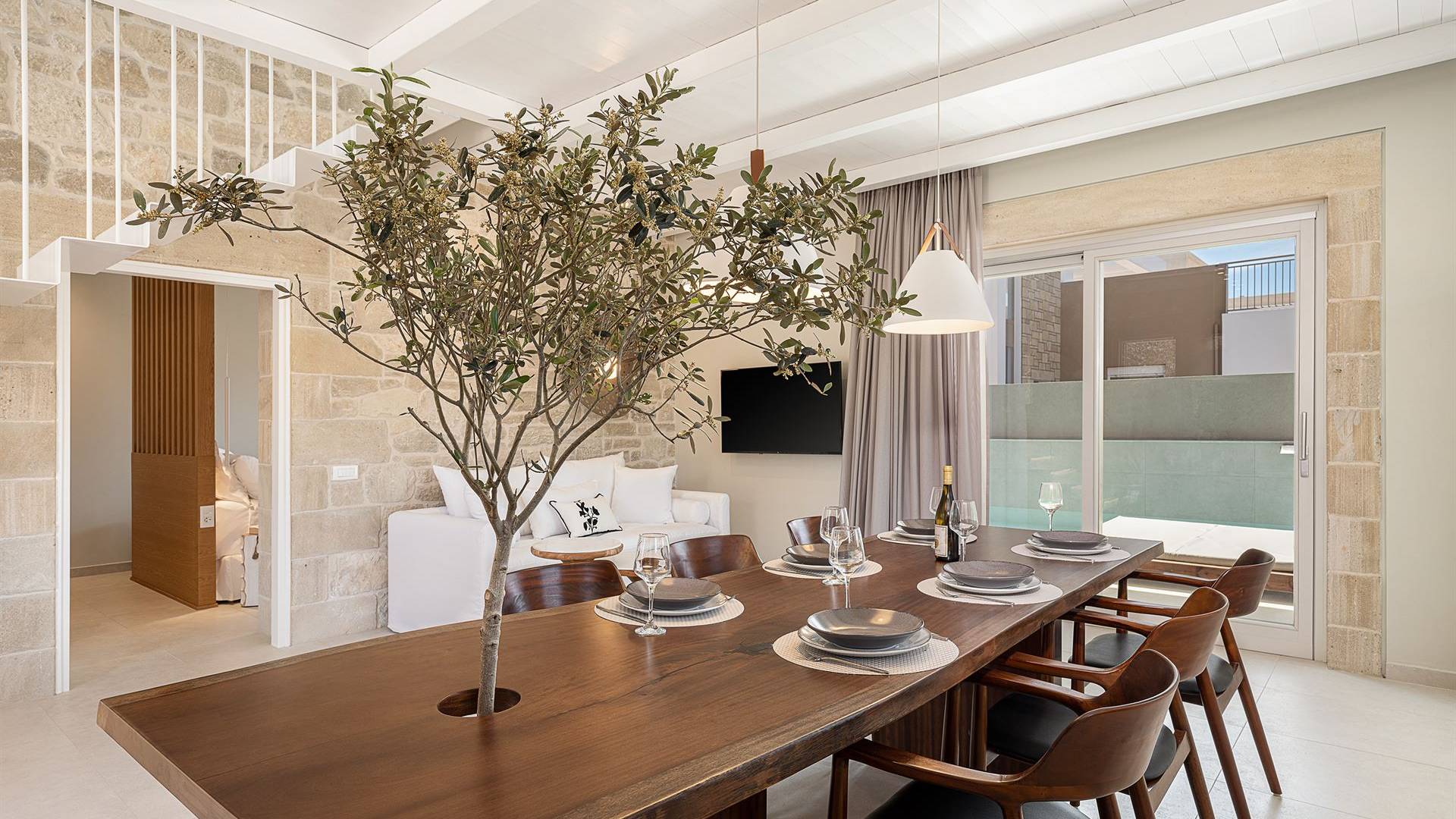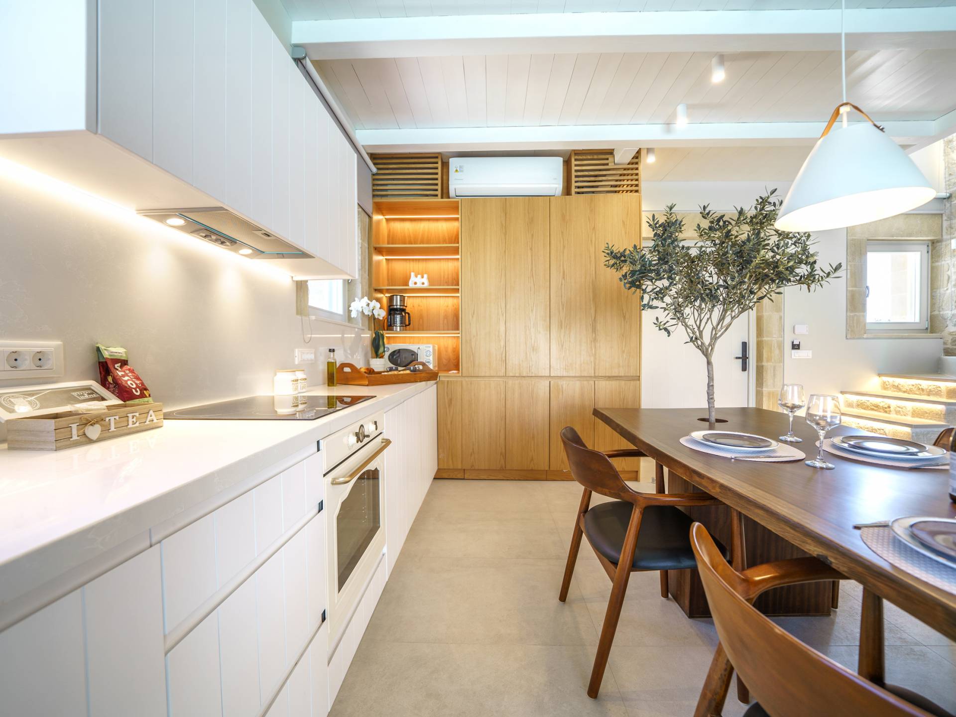 À l'intérieur, l'artisanat crétois traditionnel s'entremêle harmonieusement au design moderne, offrant un mélange harmonieux de confort et d'élégance qui honore la splendeur naturelle qui nous entoure. De vastes espaces de vie ornés de grandes fenêtres fusionnent harmonieusement le magnifique paysage marin avec votre retraite, favorisant une atmosphère sereine propice au rajeunissement du corps et de l'esprit.