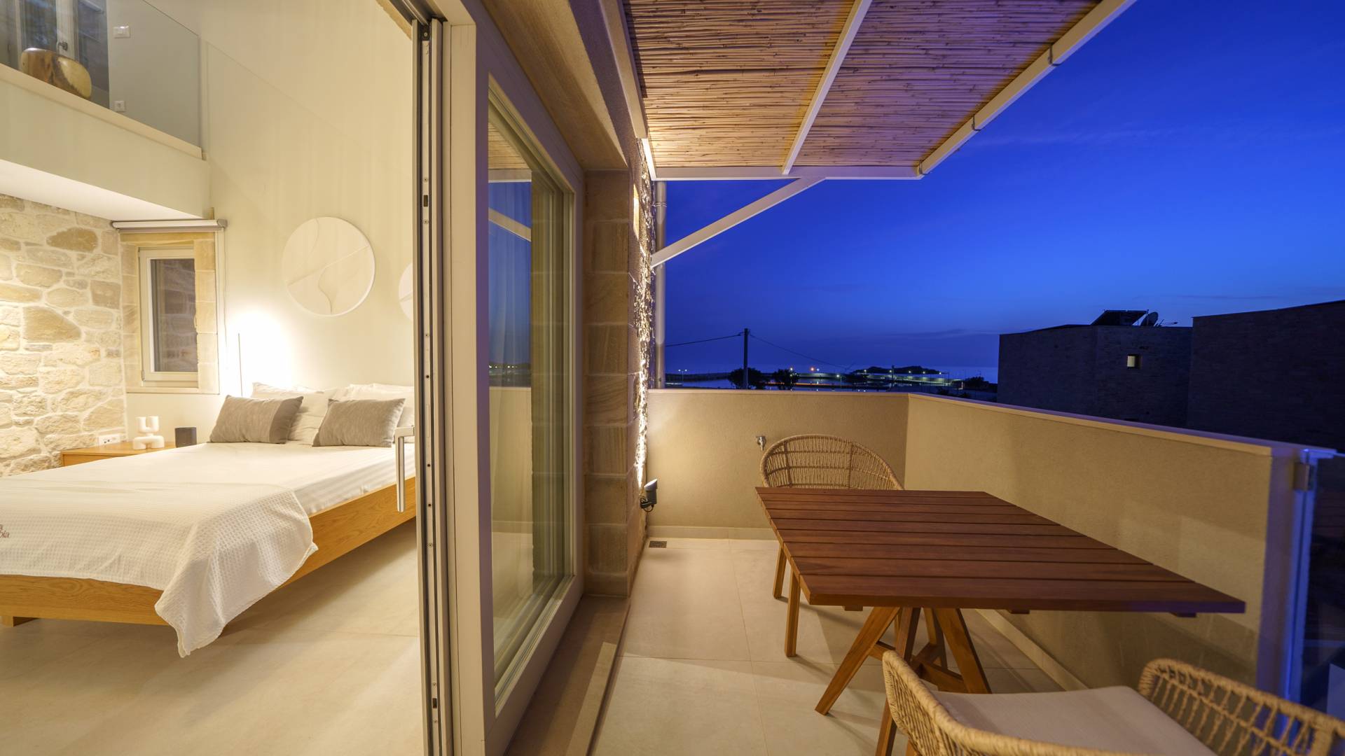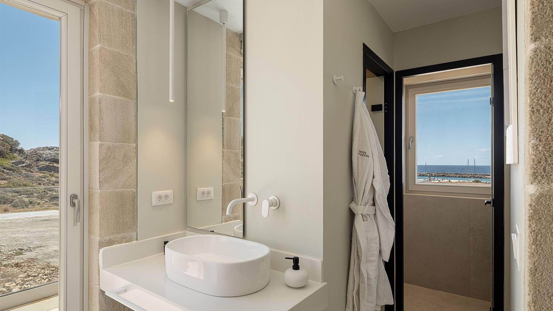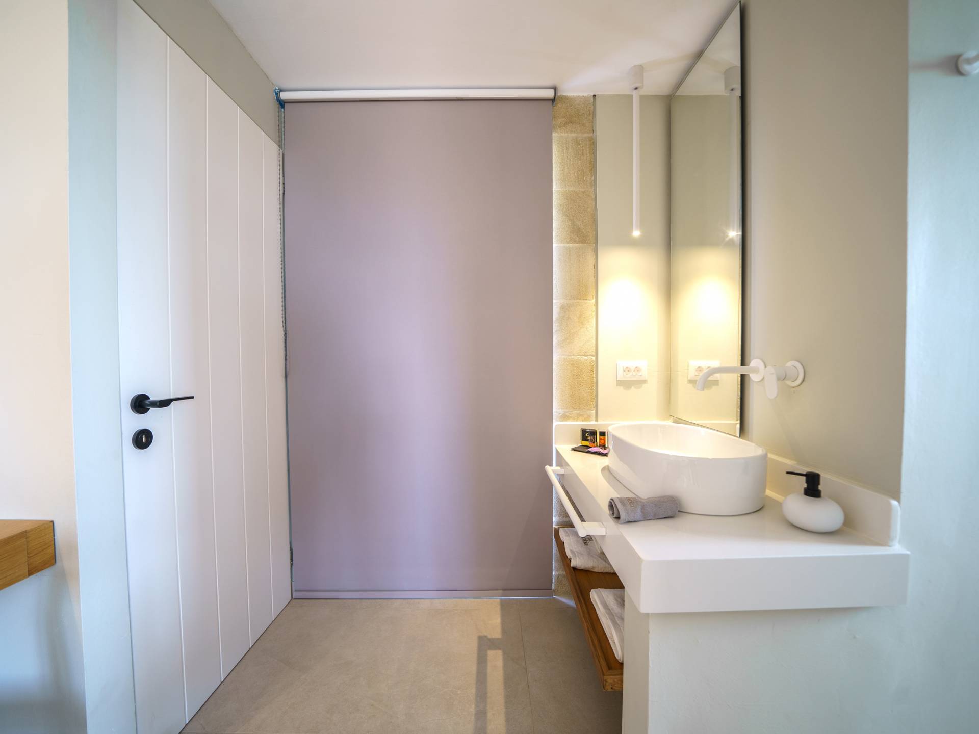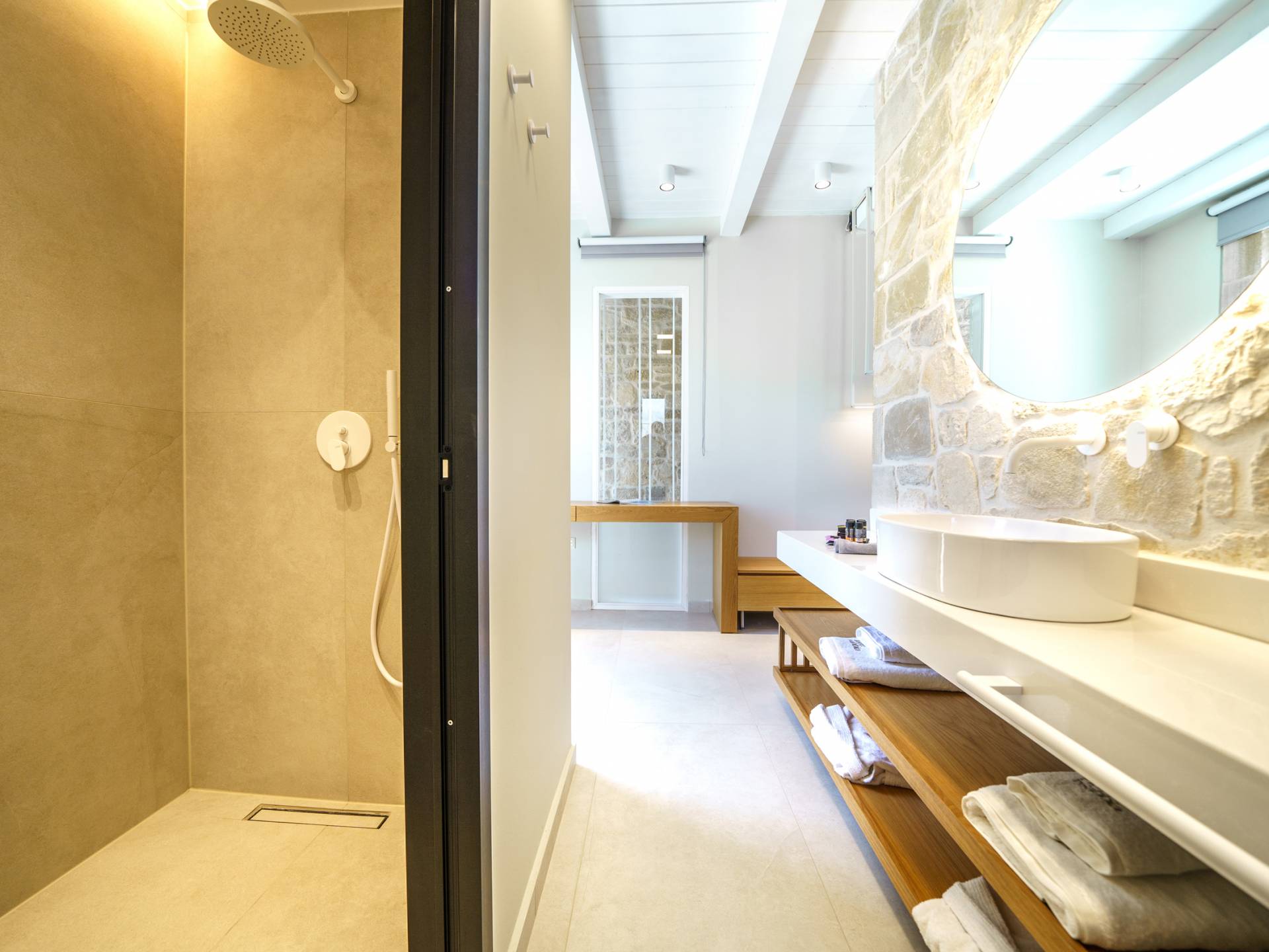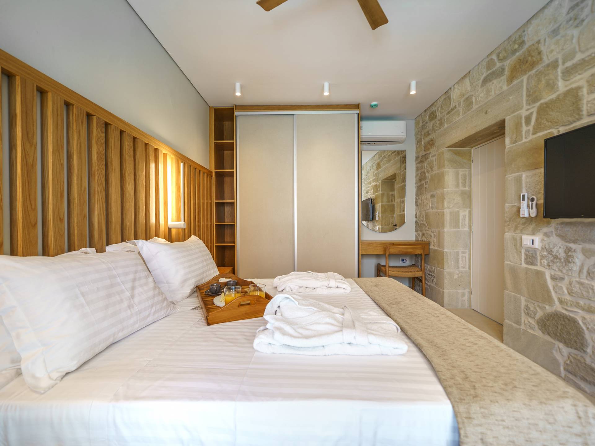 À l'intérieur, l'artisanat crétois traditionnel s'entremêle harmonieusement au design moderne, offrant un mélange harmonieux de confort et d'élégance qui honore la splendeur naturelle qui nous entoure. De vastes espaces de vie ornés de grandes fenêtres fusionnent harmonieusement le magnifique paysage marin avec votre retraite, favorisant une atmosphère sereine propice au rajeunissement du corps et de l'esprit.