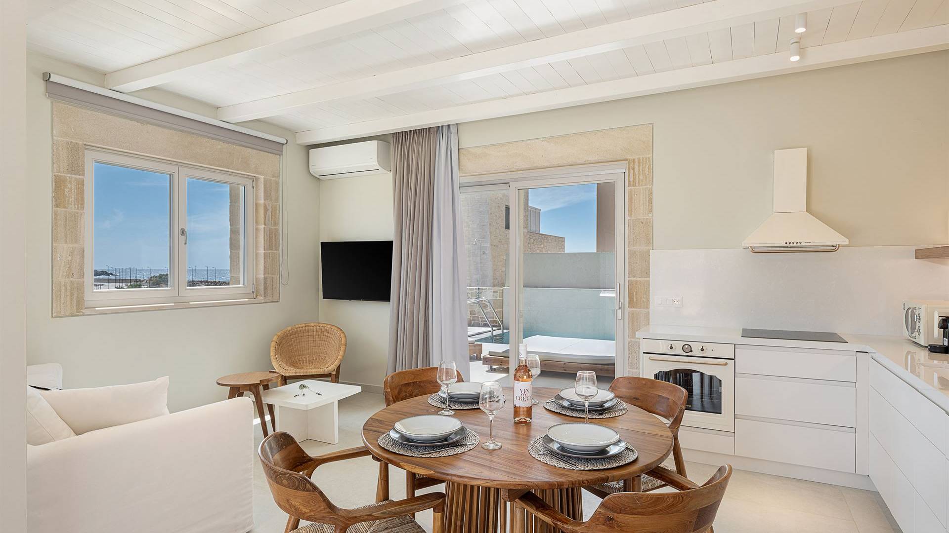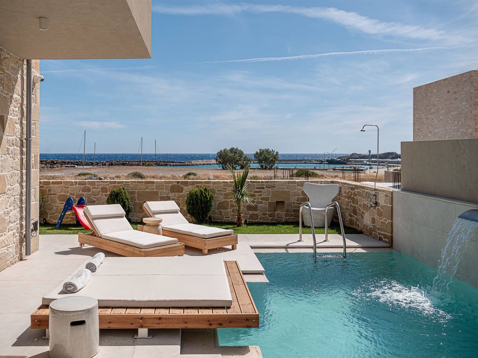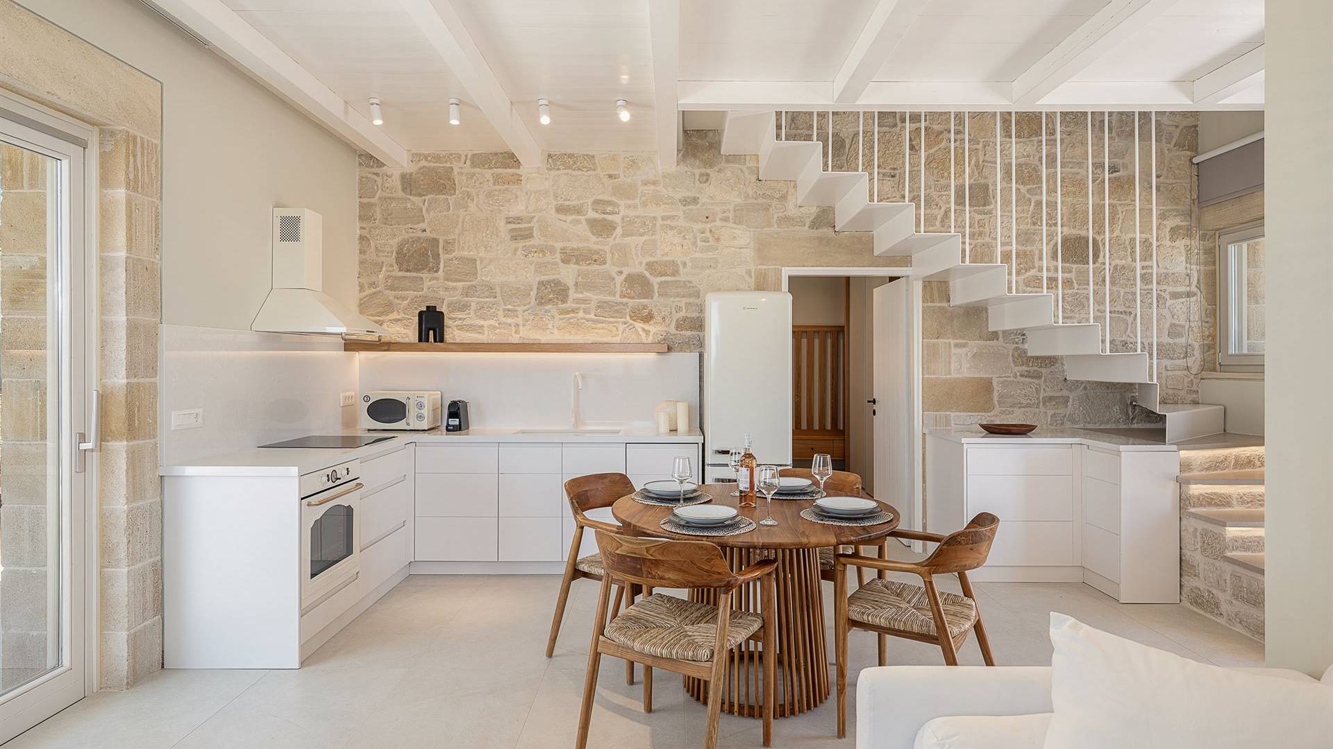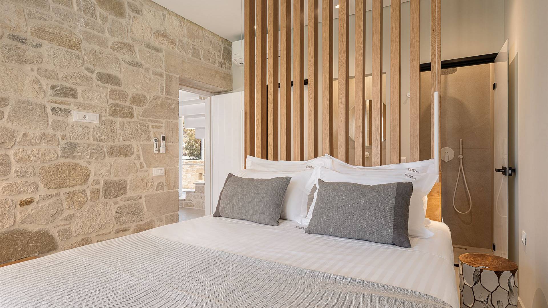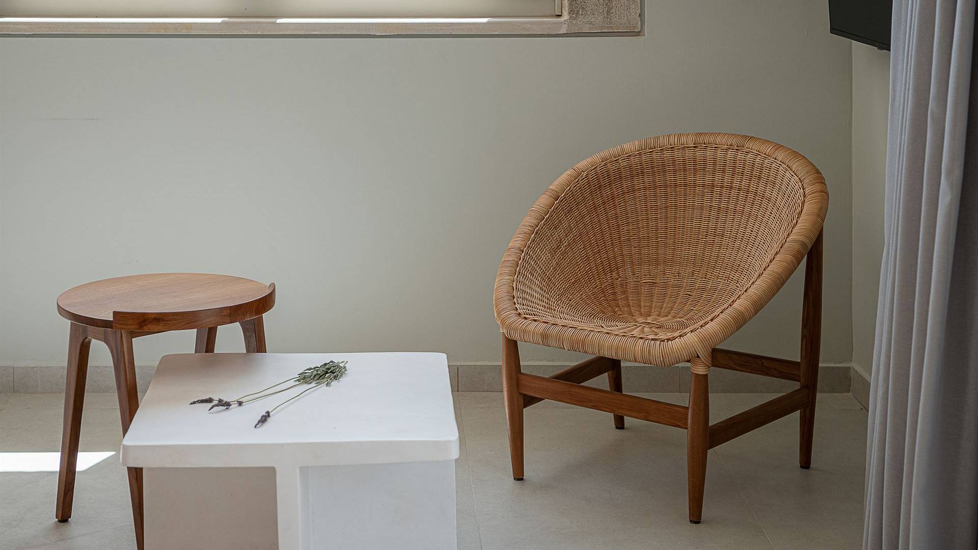 À l'intérieur, l'artisanat crétois traditionnel s'entremêle harmonieusement au design moderne, offrant un mélange harmonieux de confort et d'élégance qui honore la splendeur naturelle qui nous entoure. De vastes espaces de vie ornés de grandes fenêtres fusionnent harmonieusement le magnifique paysage marin avec votre retraite, favorisant une atmosphère sereine propice au rajeunissement du corps et de l'esprit.