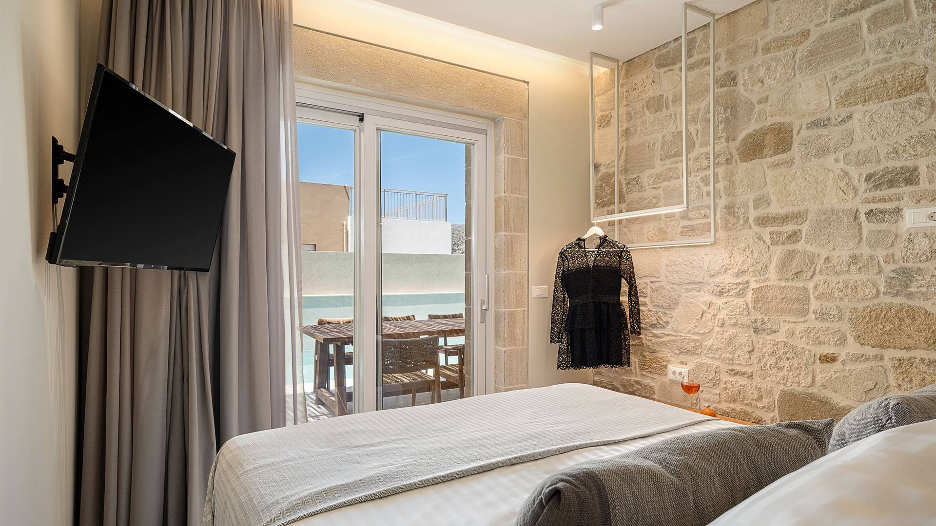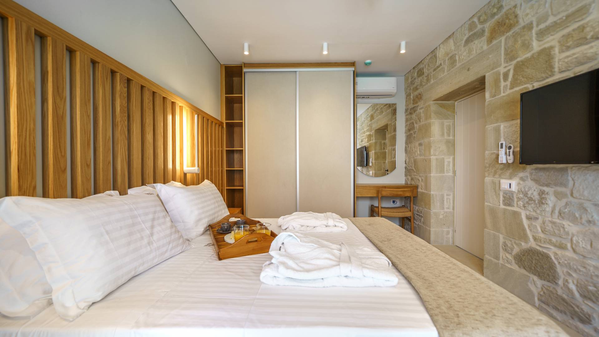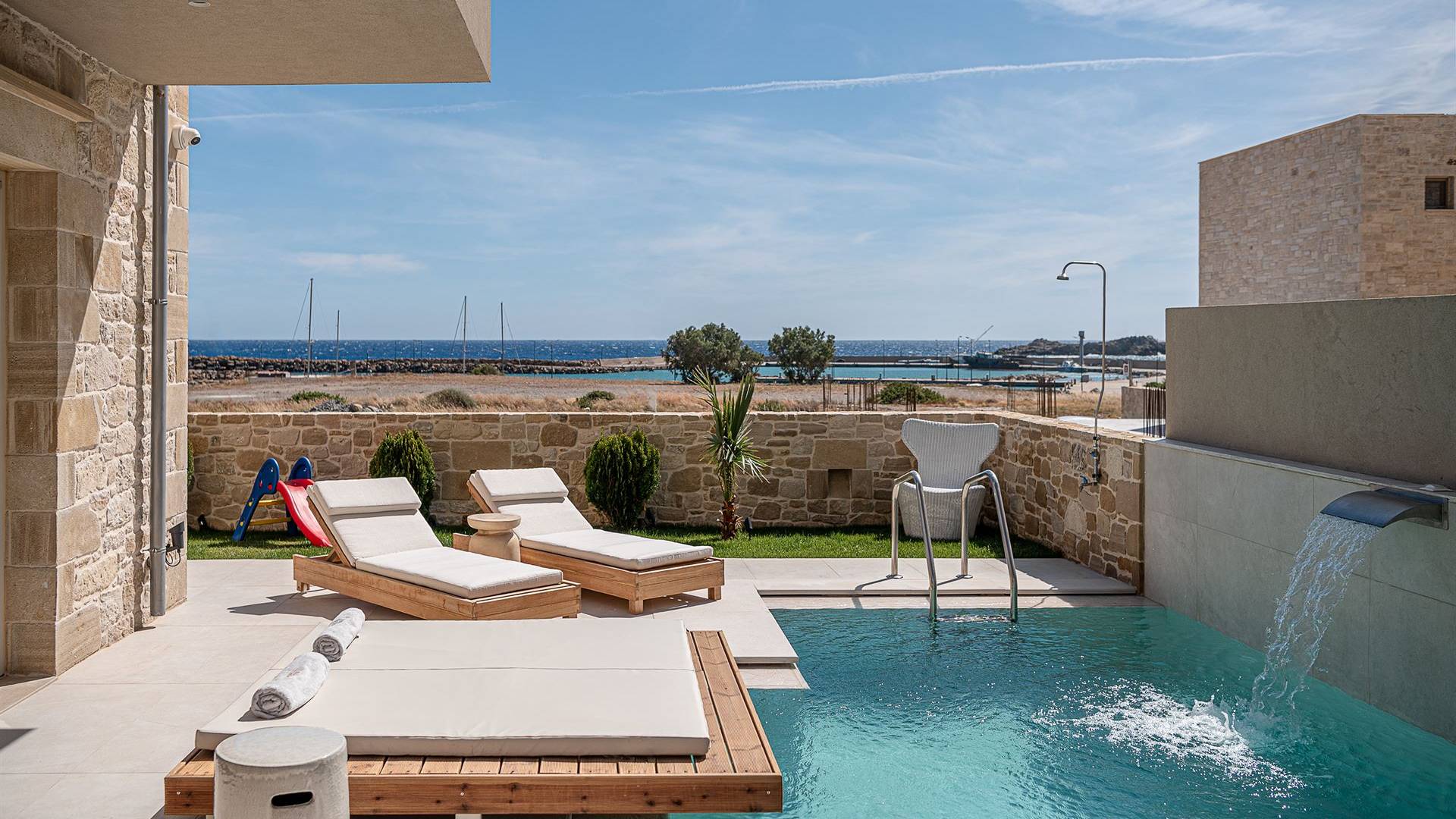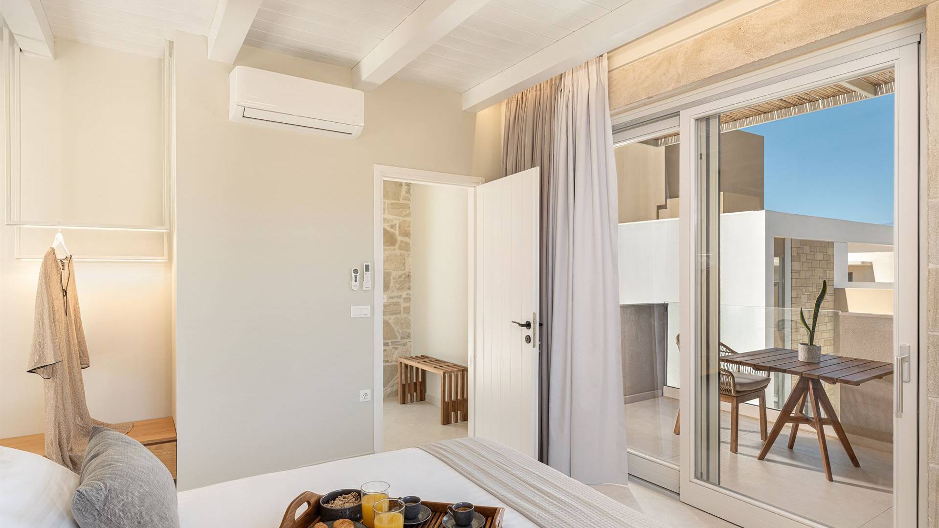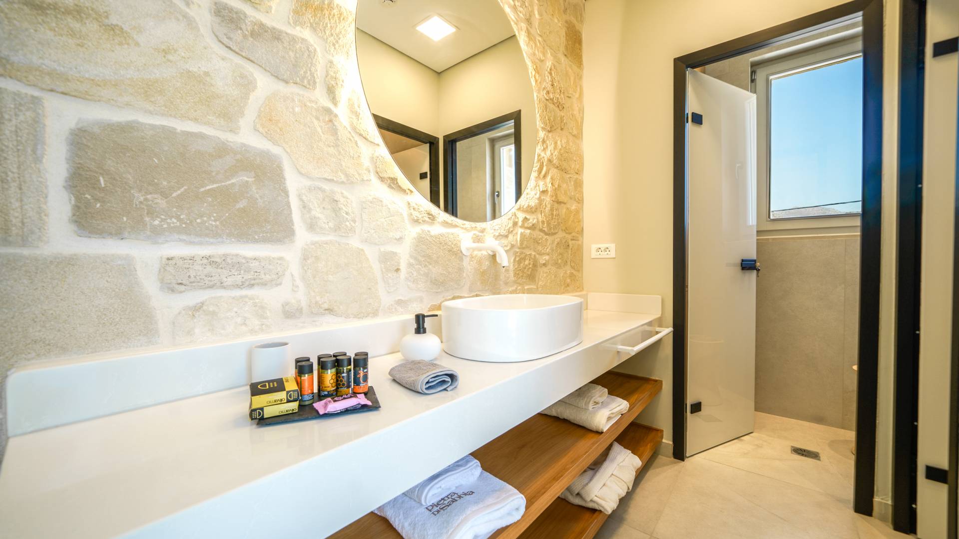 À l'intérieur, l'artisanat crétois traditionnel s'entremêle harmonieusement au design moderne, offrant un mélange harmonieux de confort et d'élégance qui honore la splendeur naturelle qui nous entoure. De vastes espaces de vie ornés de grandes fenêtres fusionnent harmonieusement le magnifique paysage marin avec votre retraite, favorisant une atmosphère sereine propice au rajeunissement du corps et de l'esprit.