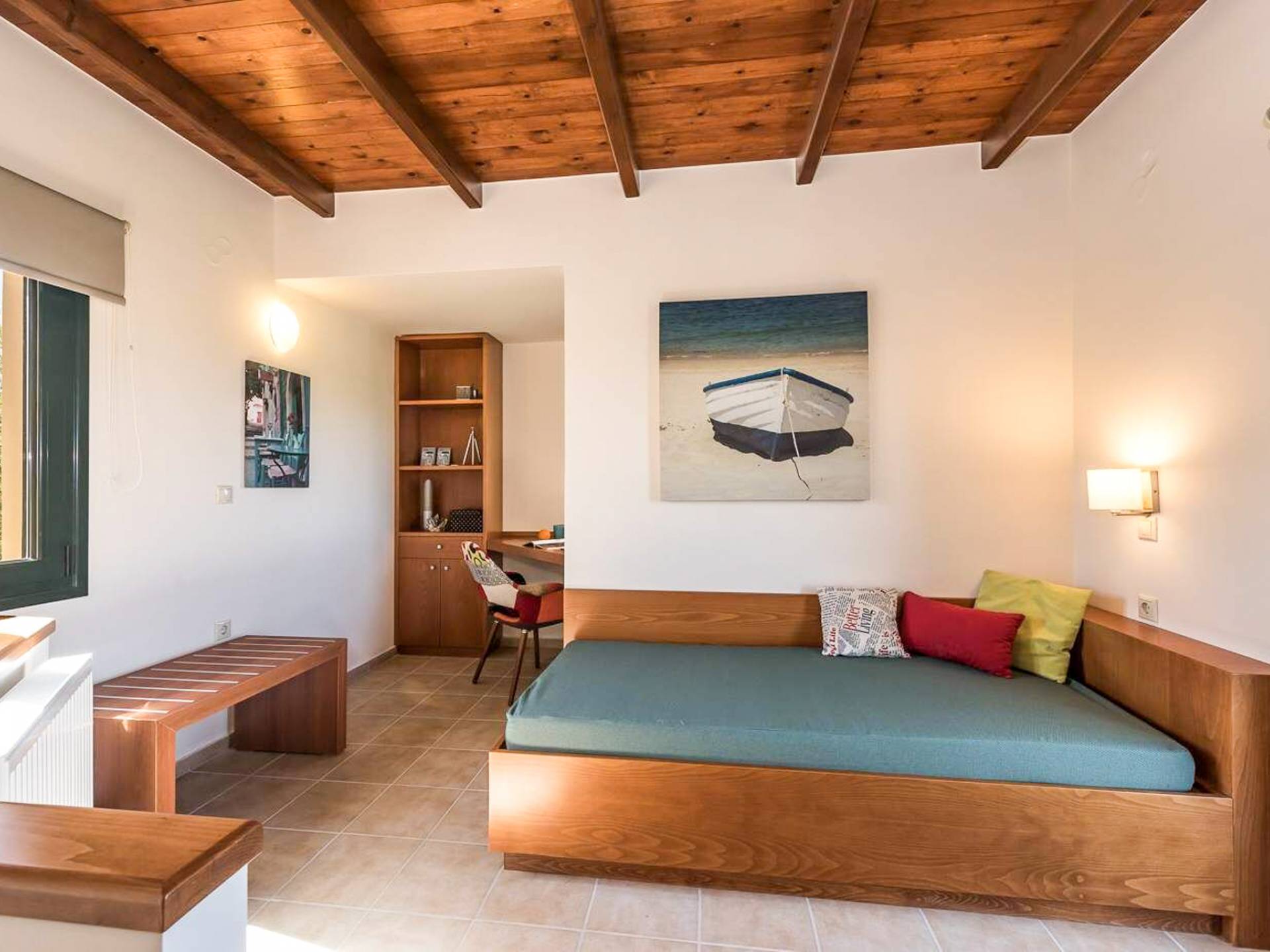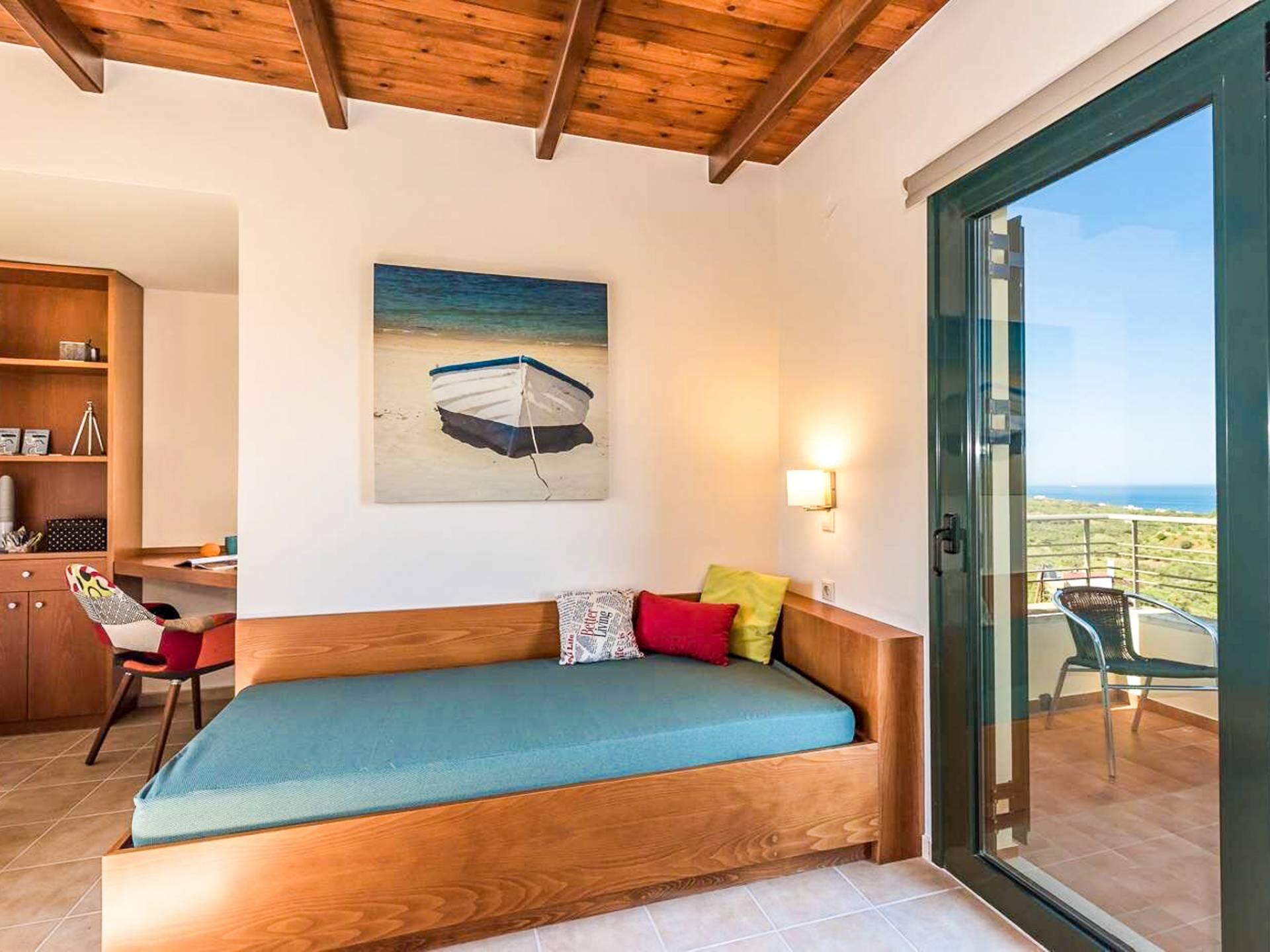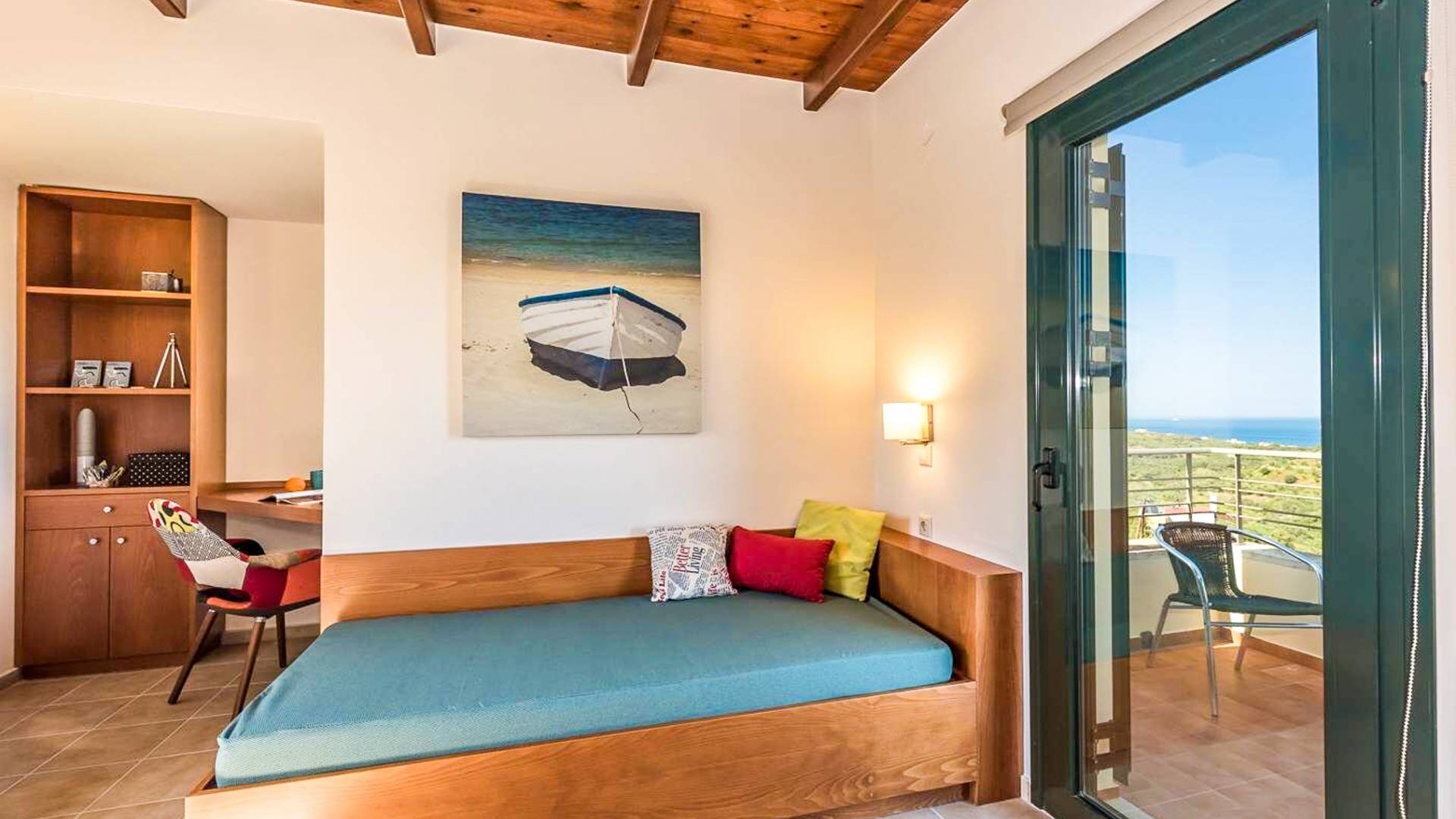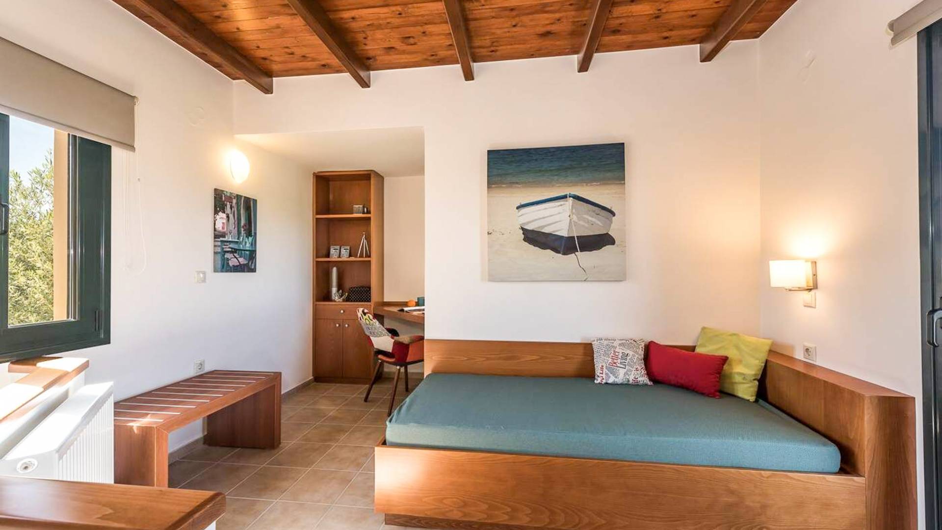 Scenery 4 Villa est la villa la plus récente du complexe. Idéal pour les petits groupes, il peut accueillir jusqu'à cinq personnes et dispose de deux chambres et d'un coin bureau avec un lit simple. Paysage 4 La Villa Chania est divisée en deux étages et a une superficie totale de 115 m². Au rez-de-chaussée, nous avons le coin salon et cuisine, une chambre et une salle de bain avec douche. Au premier étage se trouve la chambre principale avec salle de bain en suite avec baignoire et le coin bureau avec le canapé-lit.