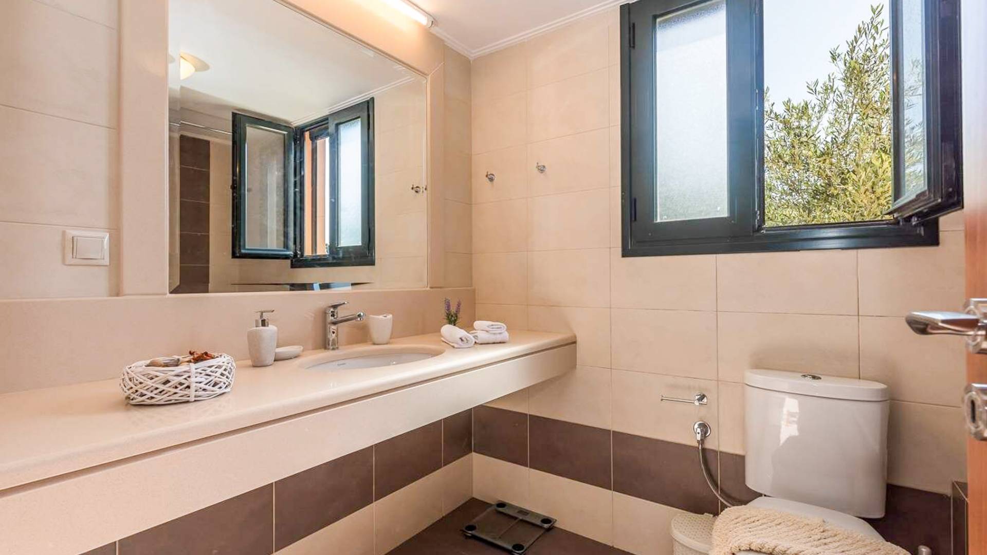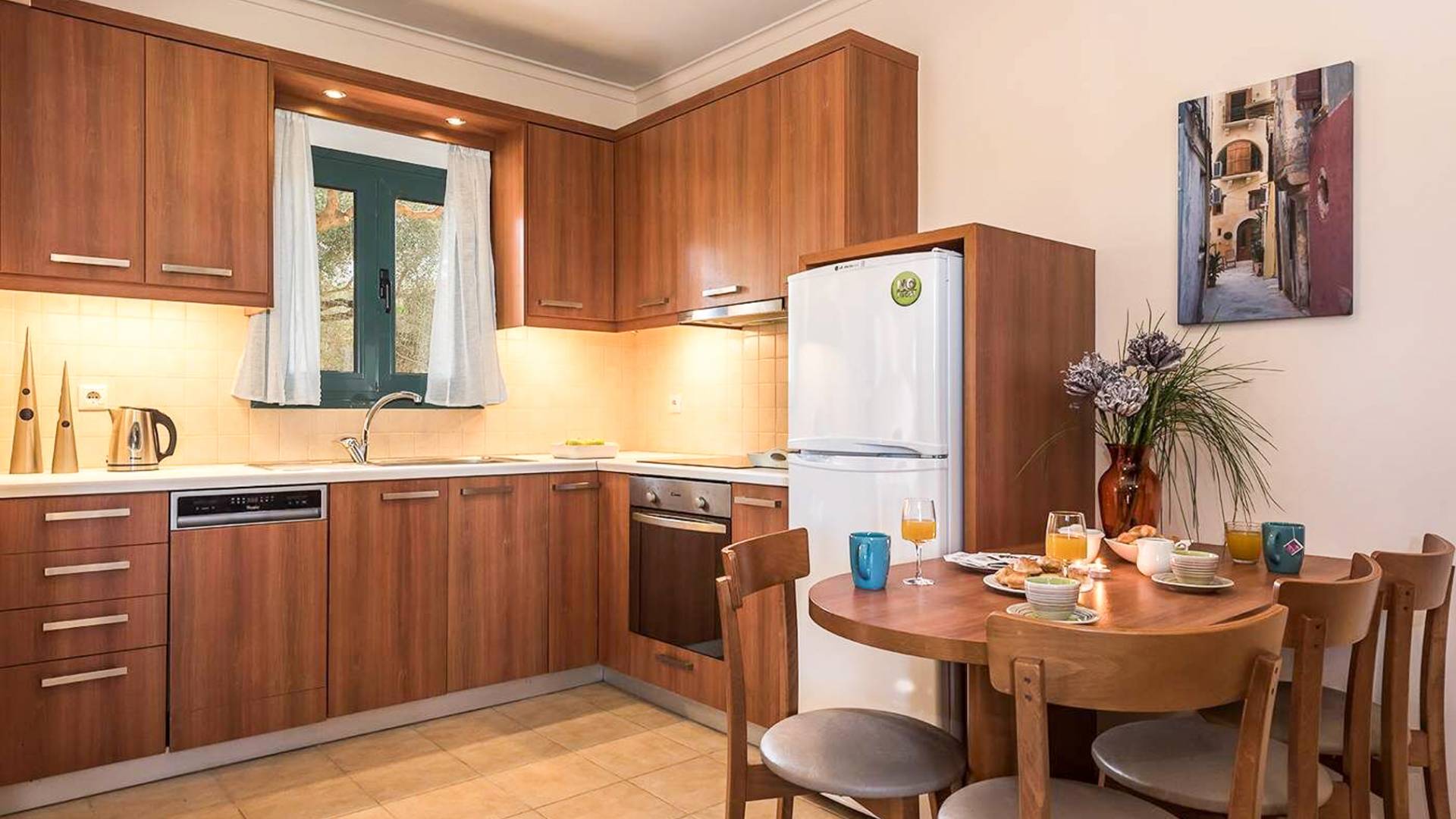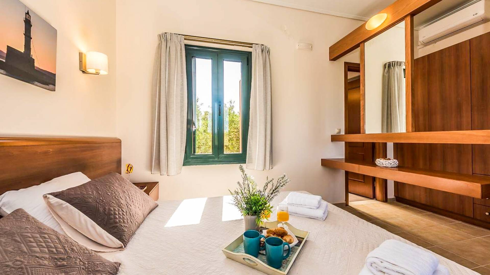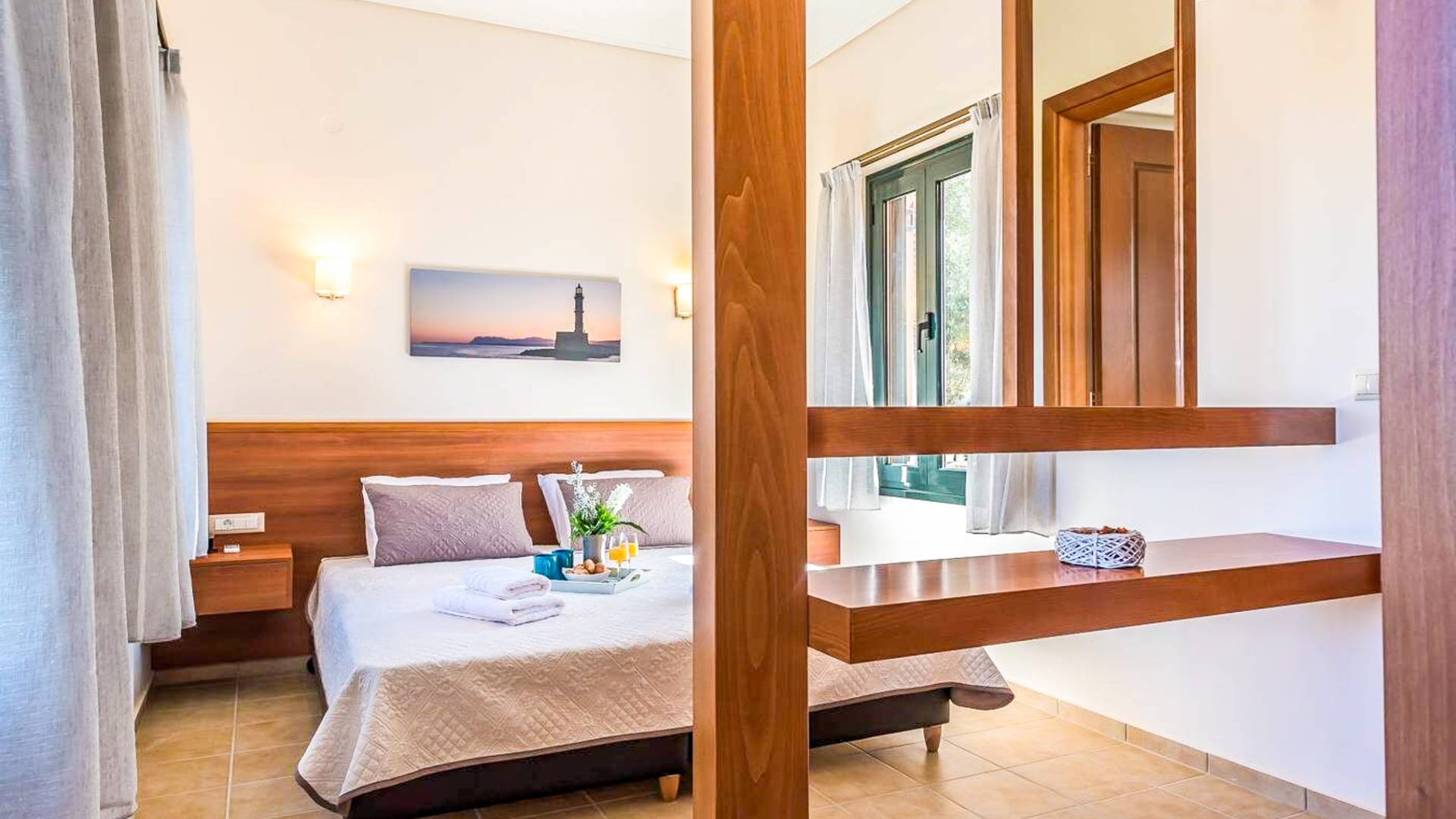 Scenery 4 Villa est la villa la plus récente du complexe. Idéal pour les petits groupes, il peut accueillir jusqu'à cinq personnes et dispose de deux chambres et d'un coin bureau avec un lit simple. Paysage 4 La Villa Chania est divisée en deux étages et a une superficie totale de 115 m². Au rez-de-chaussée, nous avons le coin salon et cuisine, une chambre et une salle de bain avec douche. Au premier étage se trouve la chambre principale avec salle de bain en suite avec baignoire et le coin bureau avec le canapé-lit.