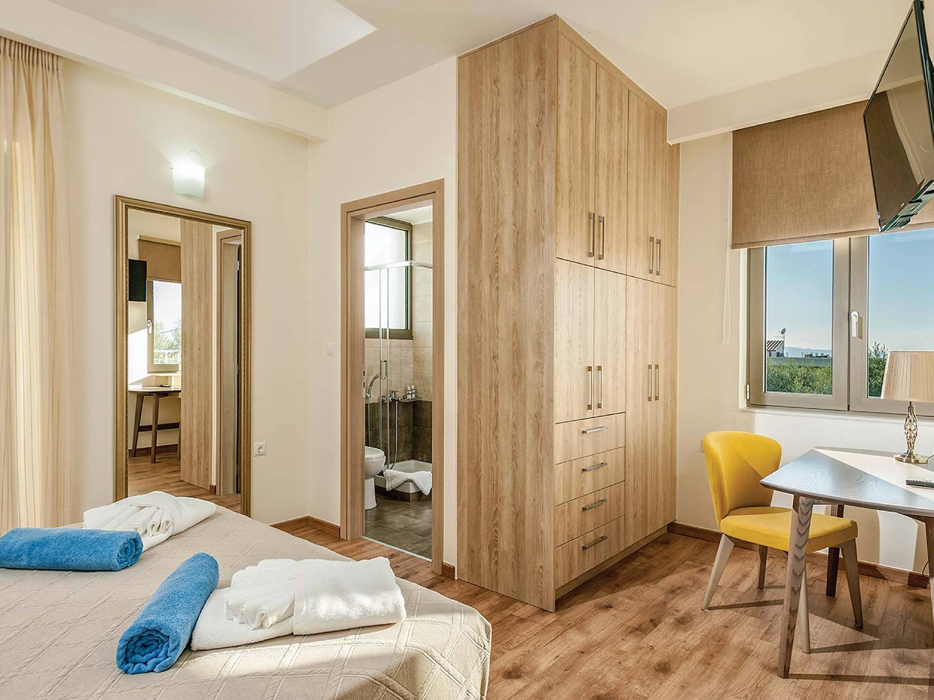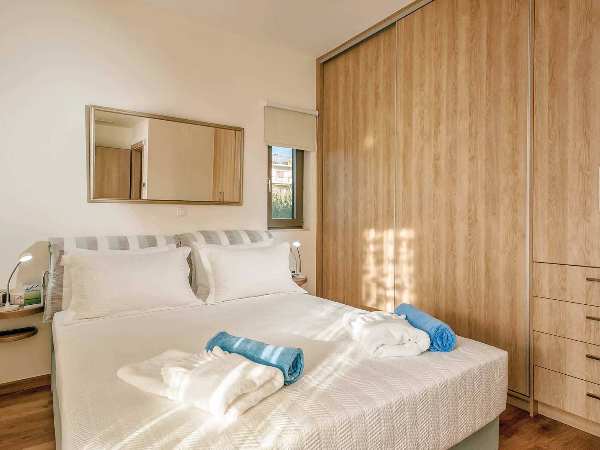 Nous vous accueillons maintenant à l'intérieur de Sunlight Breeze Villa Chania. Beaucoup d'espace et une grande luminosité! Tout est soigné. Quittez le canapé et le rez-de-chaussée et allez au premier étage. Il y a du bois partout. Tranquillité, harmonie, couleur et bon goût. Il est temps de ranger vos affaires dans les armoires élégantes des chambres spacieuses. La lumière sans entrave pénètre dans chaque pièce. Chaque chambre dispose d'un balcon unique avec une belle vue sur le jardin et la mer. Chaque matin, prévoyez un séjour de quelques minutes sur les balcons.