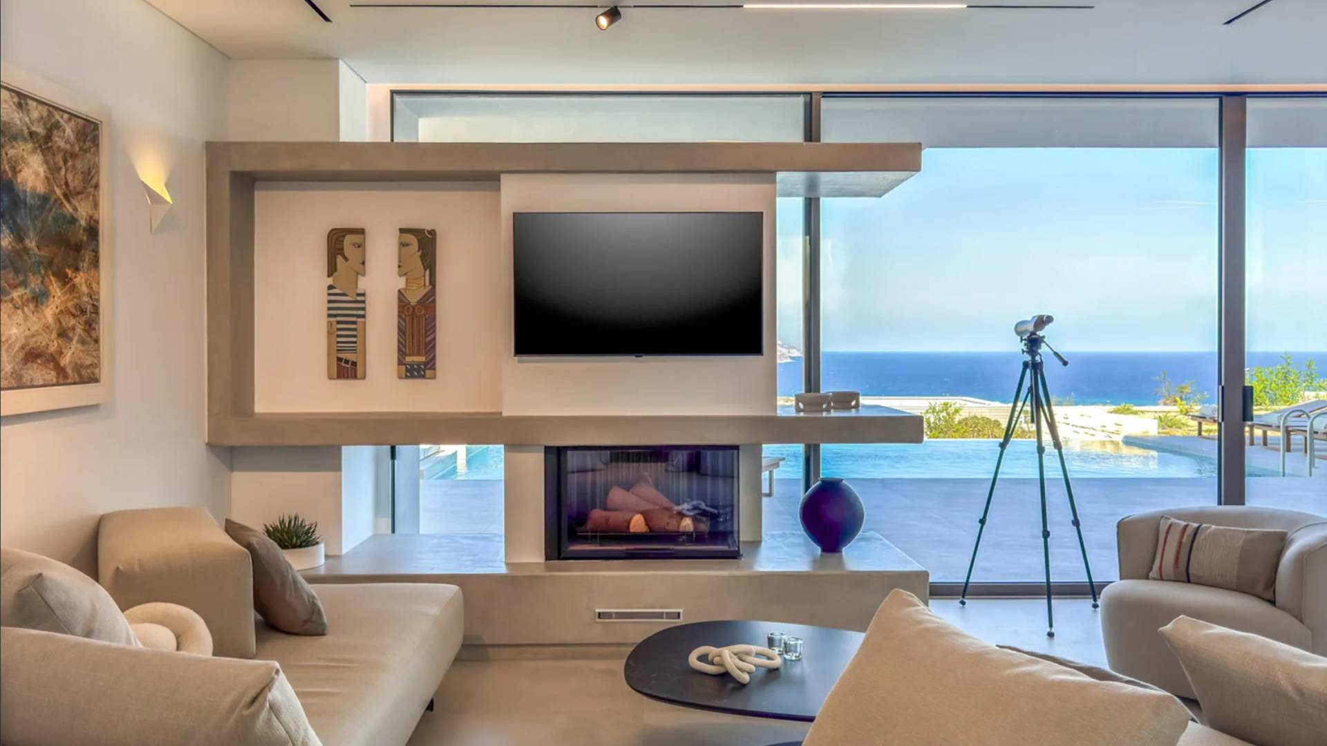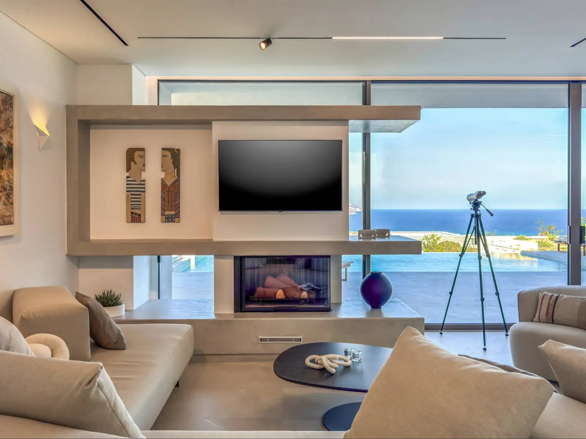 À l'intérieur, la villa dispose d'une cuisine ouverte, entièrement équipée avec des appareils électroménagers haut de gamme et d'un grand espace de comptoir pour cuisiner sans effort. Le coin repas et salon adjacent est centré autour d'une cheminée écologique, créant un espace commun confortable. Pouvant accueillir jusqu'à 10 personnes, chaque chambre est sa propre retraite privée, dotée d'une salle de bains privative et d'une vue imprenable sur la mer et la montagne.