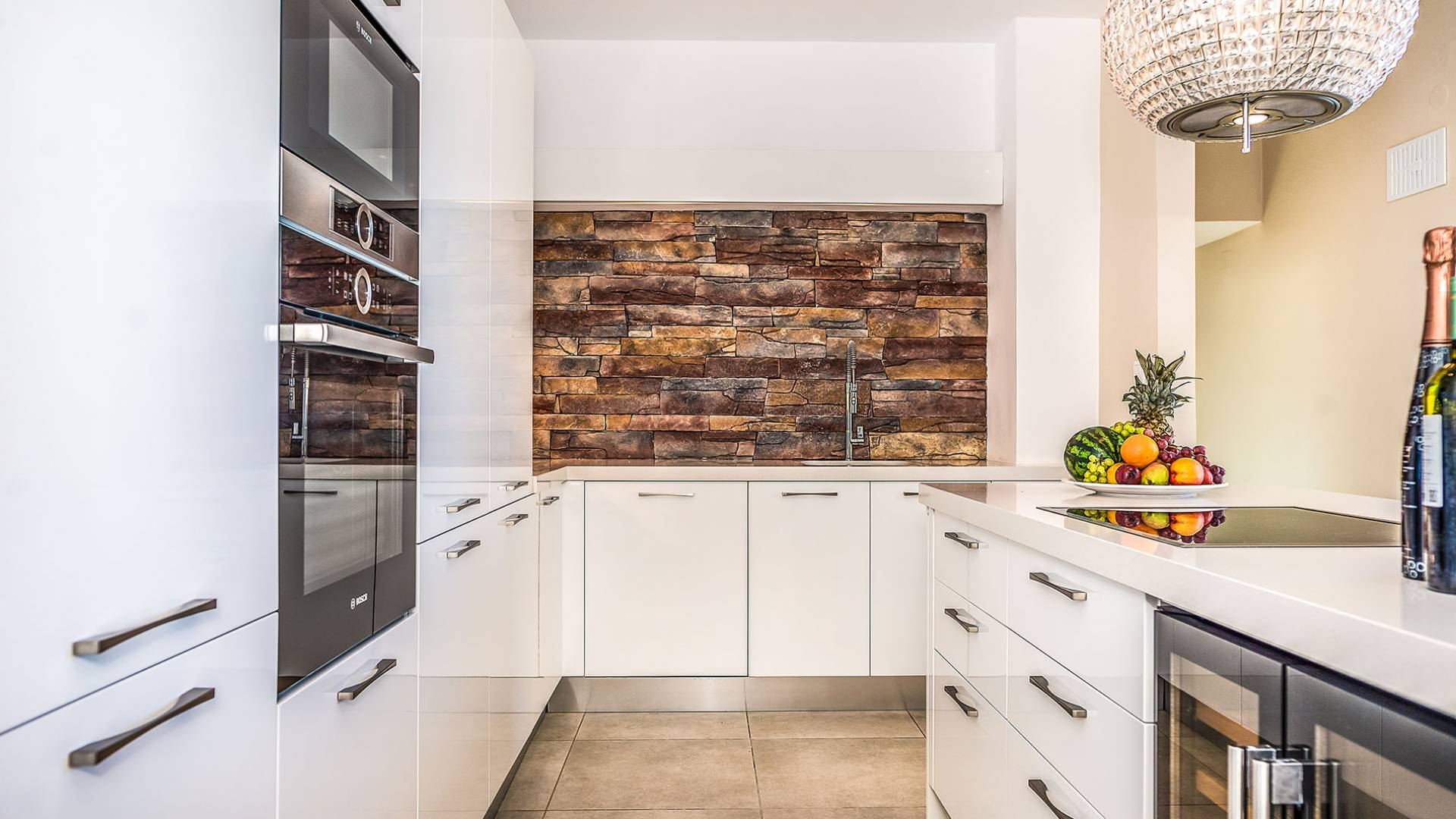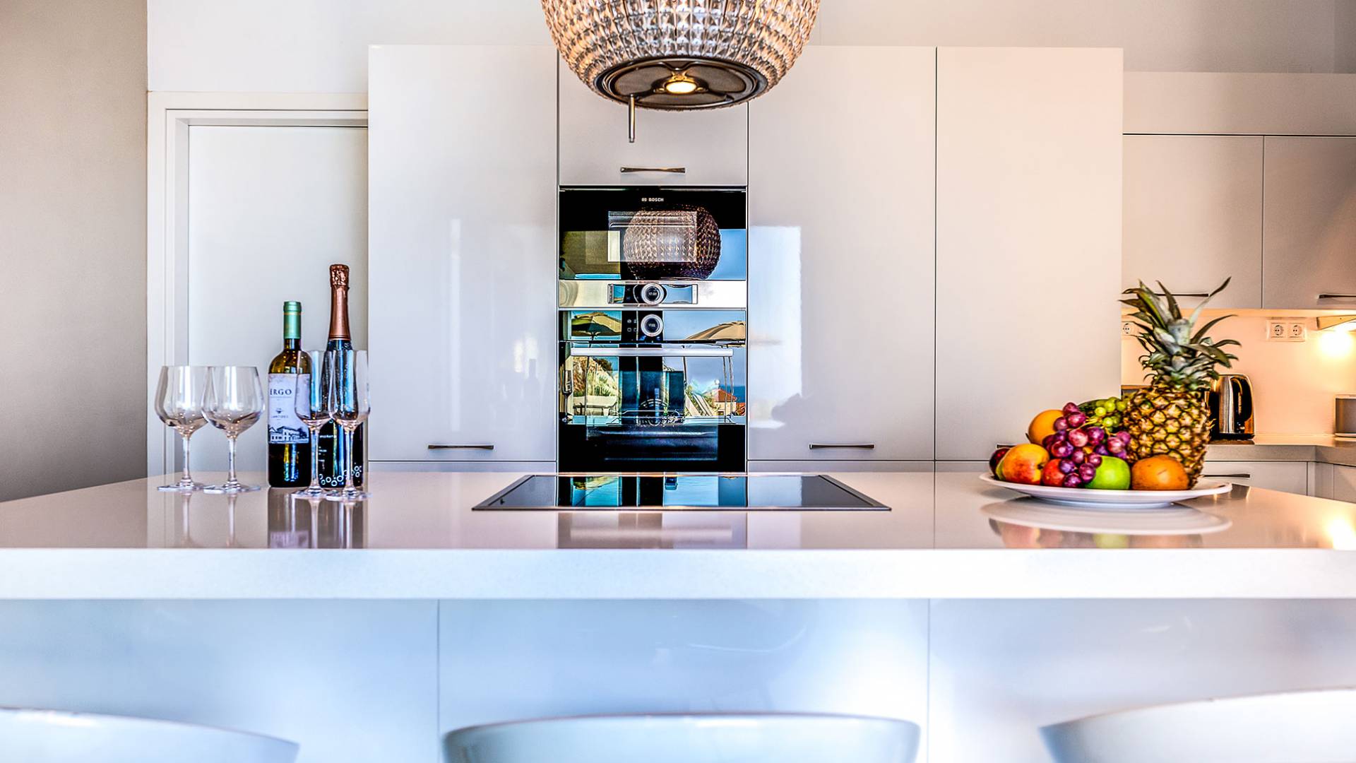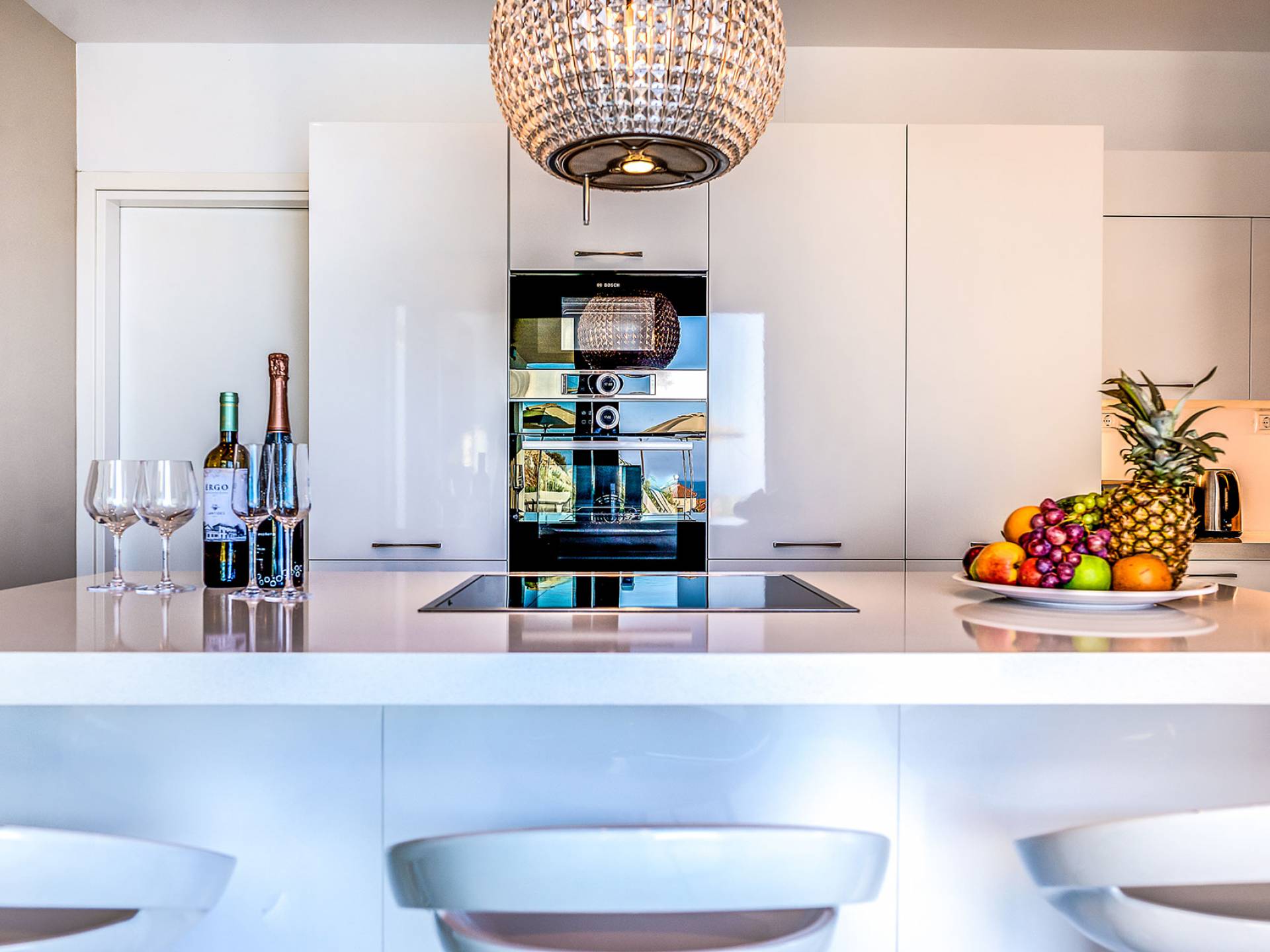 La cuisine est entièrement équipée et dispose d'un îlot central recouvert de granit avec de hauts tabourets, un four micro-ondes intégré, un four, une plaque de cuisson, un lave-vaisselle et un refroidisseur à vin. Il y a une buanderie avec un lave-linge séchant, une planche à repasser et un fer à repasser. Disponible à la location toute l'année, la villa dispose d'unités de climatisation complètes dans chaque chambre et d'un chauffage au sol et de sèche-serviettes dans les salles de bains. Toutes les fenêtres de la villa sont équipées de moustiquaires et de volets roulants électriques. Toutes les fenêtres en verre ont été traitées avec un matériau réfléchissant le soleil pour réduire les températures estivales à l'intérieur de la villa. Des chaussons et des serviettes, y compris des serviettes de piscine, sont fournis à tous les invités.