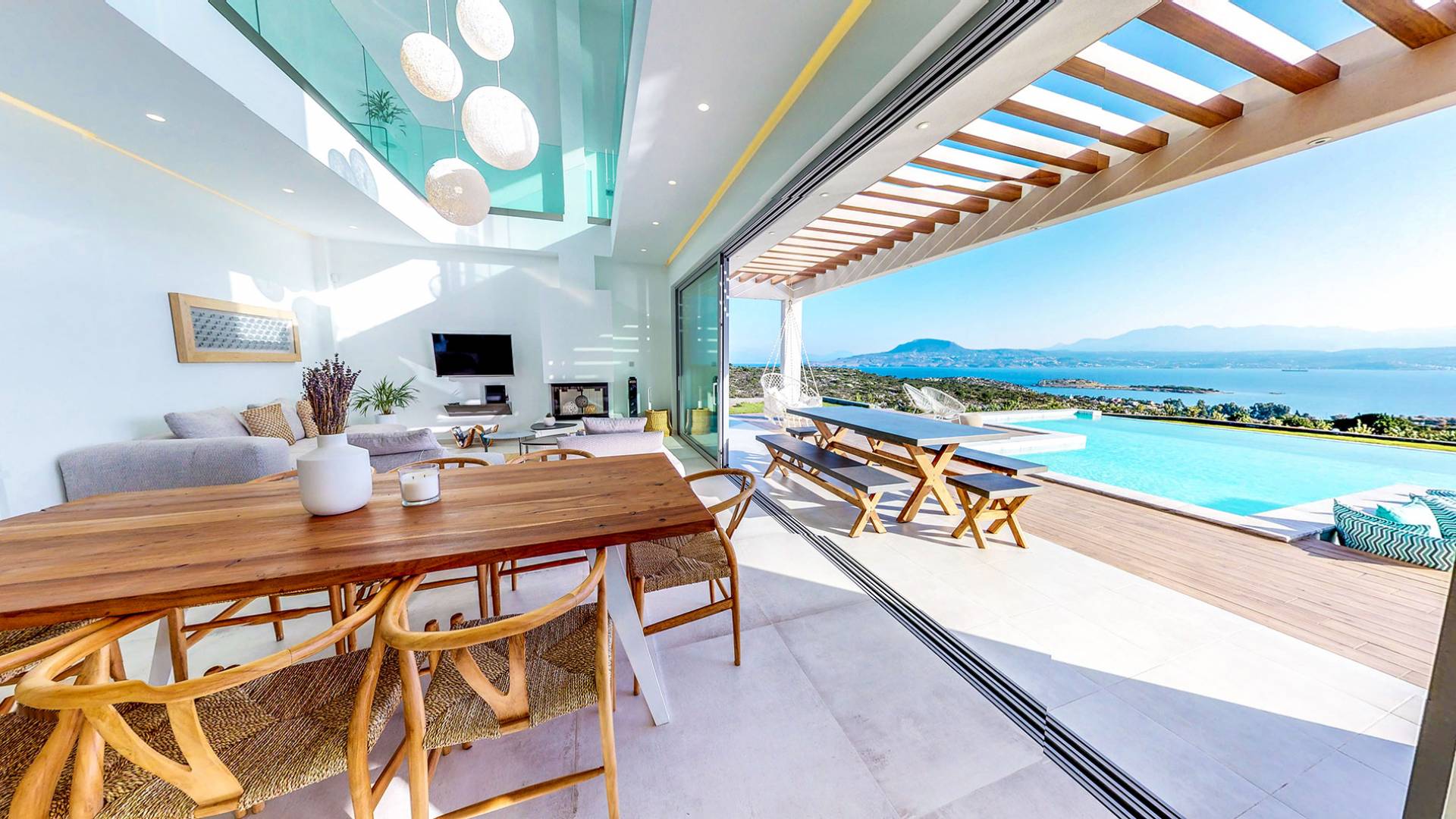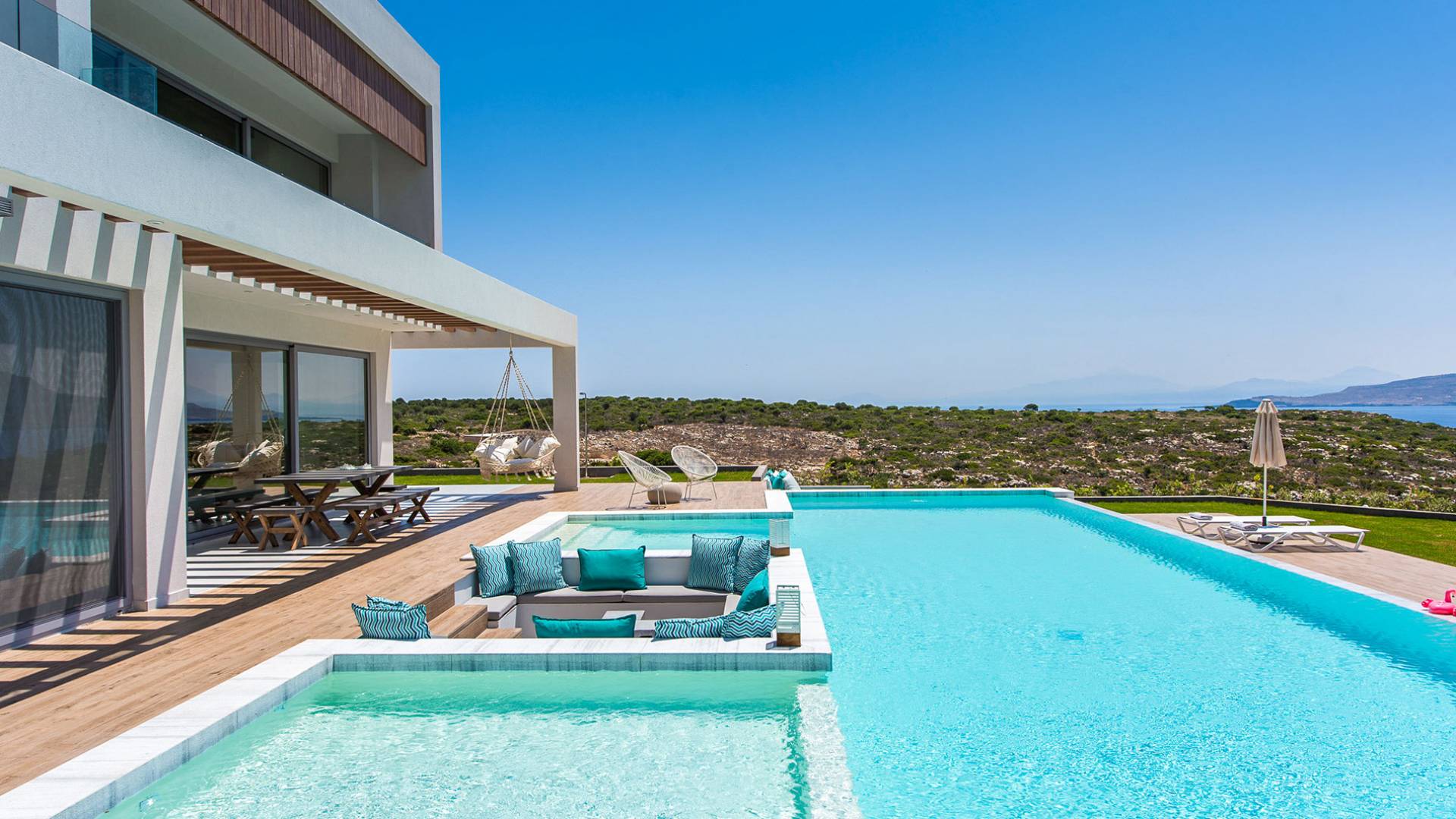 Les villas situées à Loutraki sont élégantes, spacieuses et parfaitement intégrées à la nature environnante. Nombre d’entre elles disposent de piscines privées, de terrasses ombragées avec vue sur la mer, et même d’un accès direct à la plage. Chaque instant y devient un moment de pur bien-être, que ce soit autour d’un café matinal ou d’un apéritif au coucher du soleil.